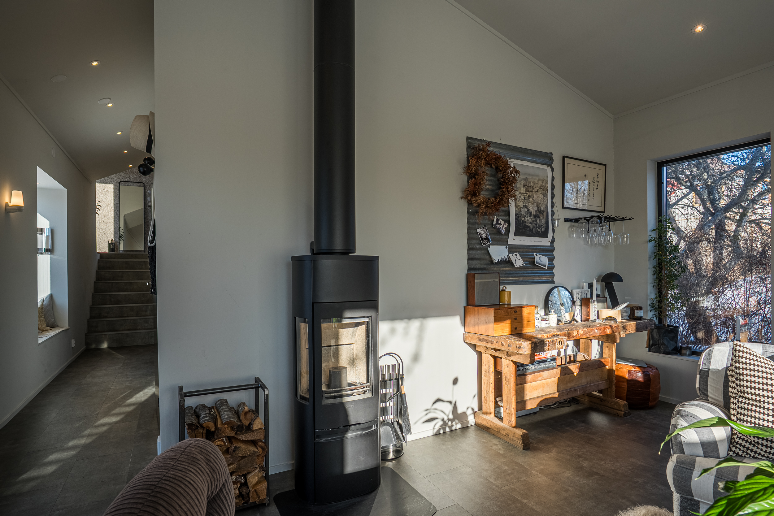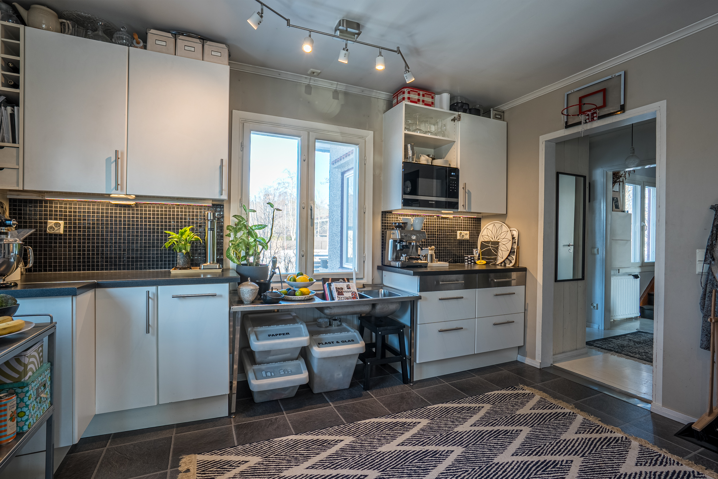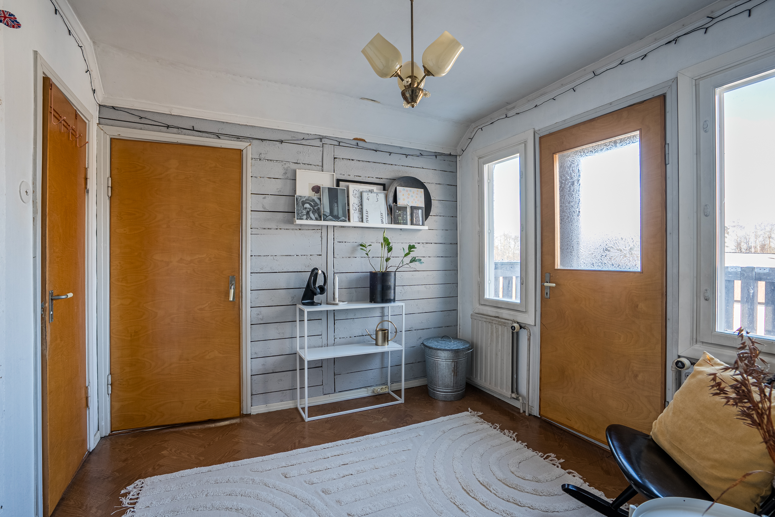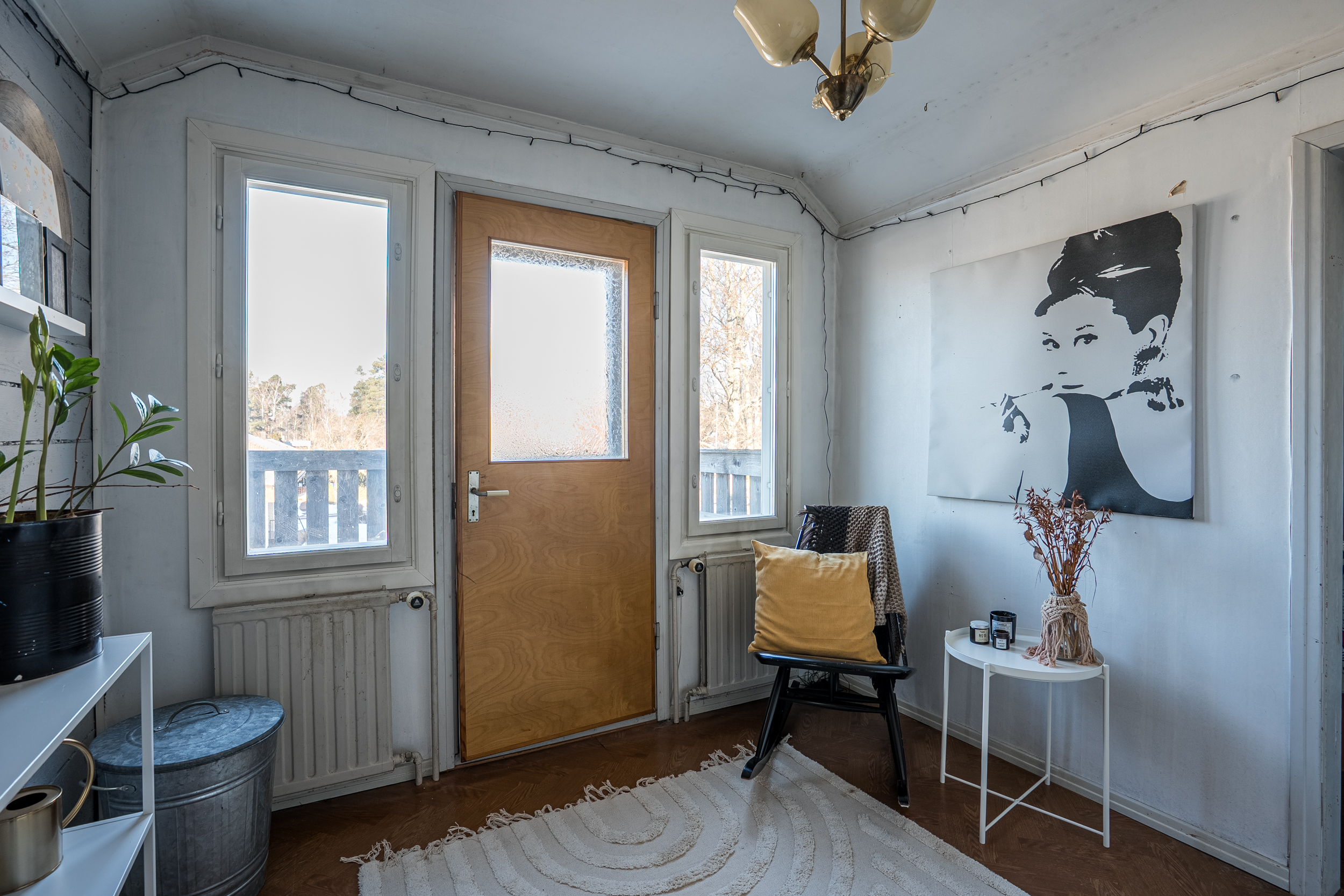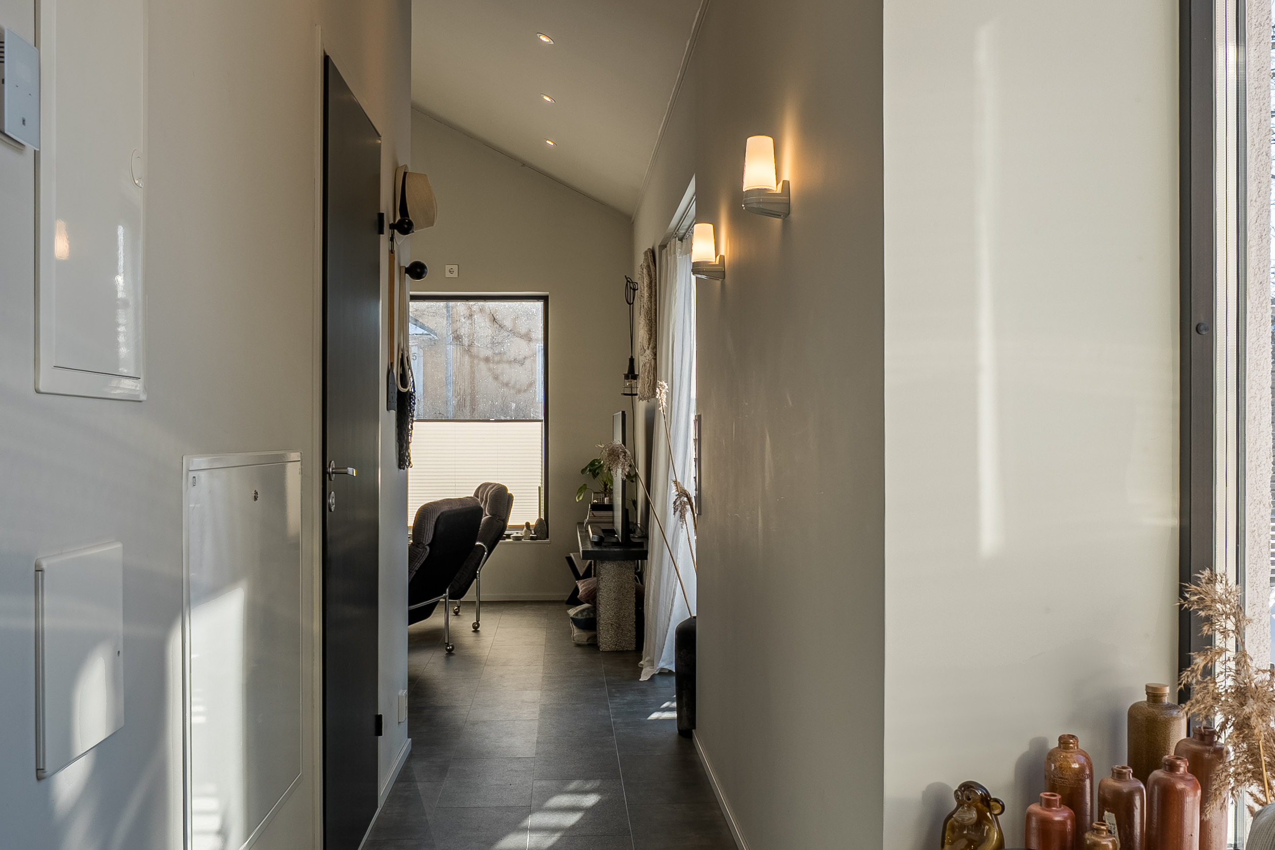 Entrén sker via ett välkomnande veranda med klädförvaring. I direkt anslutning till entrén och hallen finns modernt badrum med toalett och dusch. Köket är modernt och funktionellt planerat och öppnar naturligt upp mot matplatsen. Härifrån flödar rummen vidare in i vardagsrumsdelen, och planlösningen skapar ett behagligt och sammanhängande rörelsemönster genom hela entréplanet. Det finns en självklar cirkulation – rummen samspelar och ger både öppenhet och struktur. I anslutning till vardagsrumsdelen tar huset en arkitektonisk vändning. Några trappsteg leder ner till den tillbyggnad som uppfördes 2020, ritad av arkitekt Anna Hjerling.