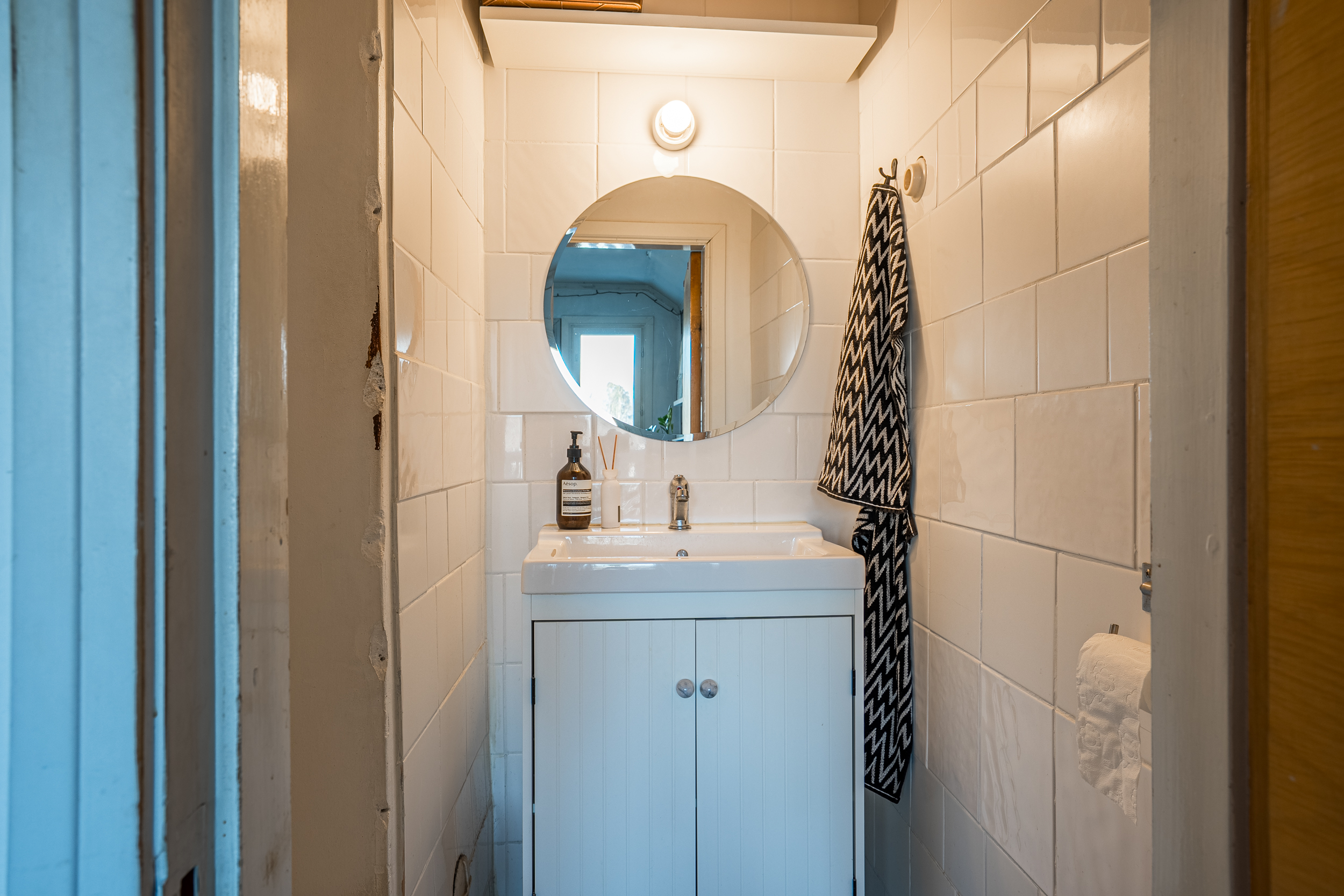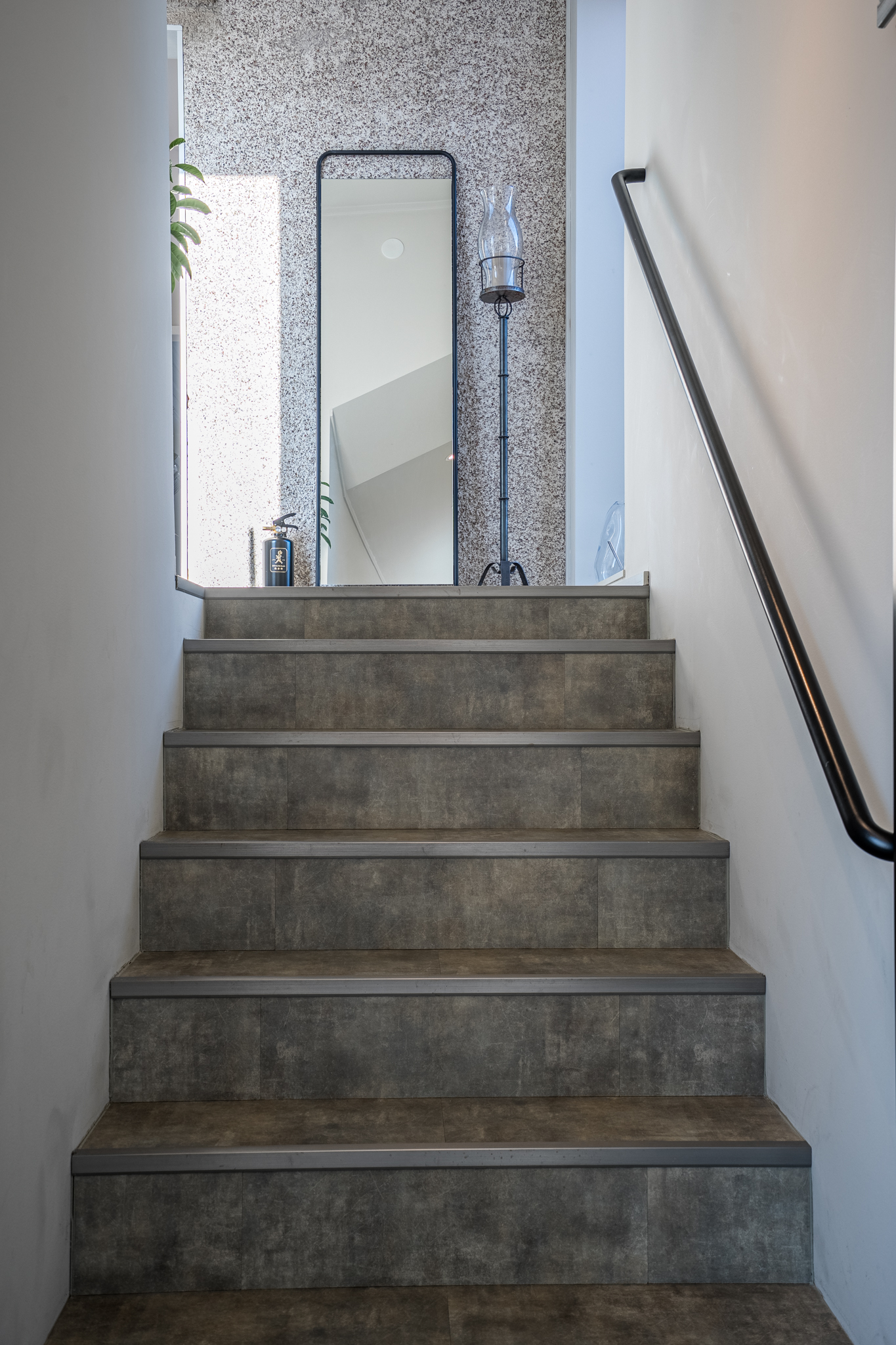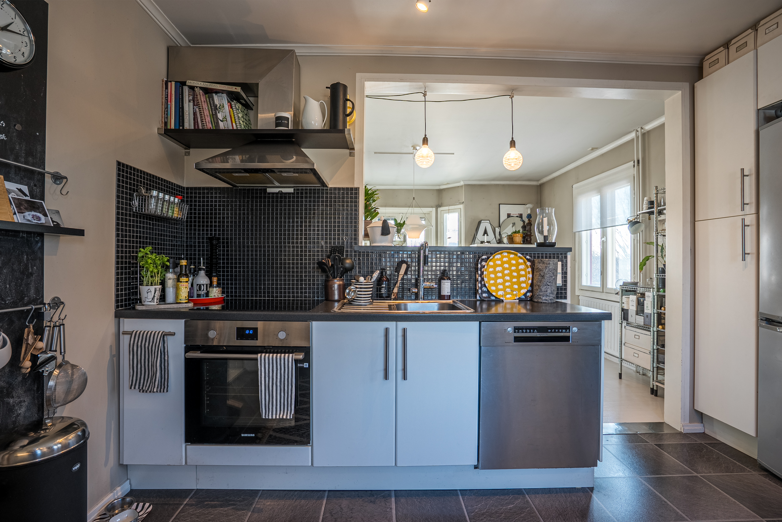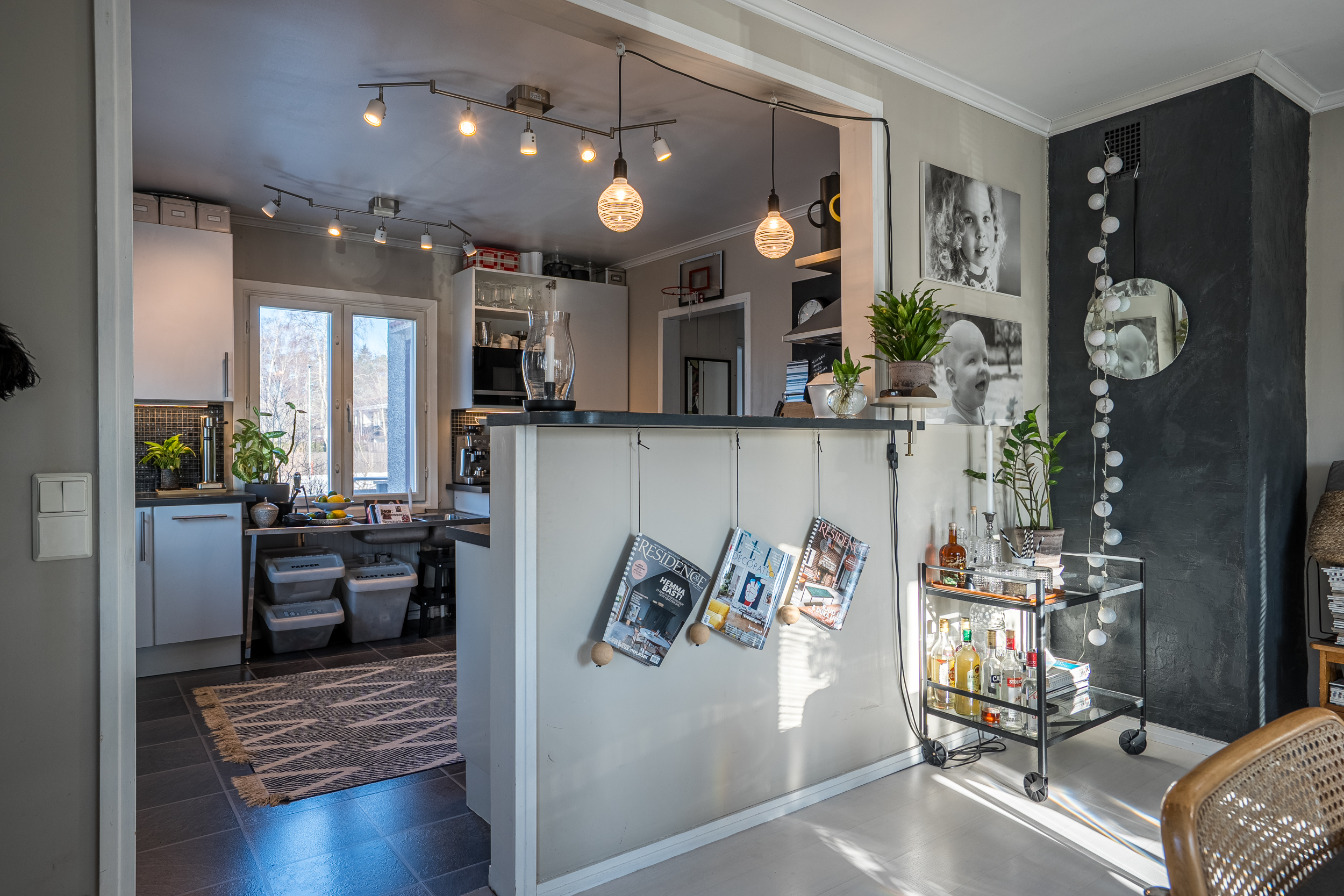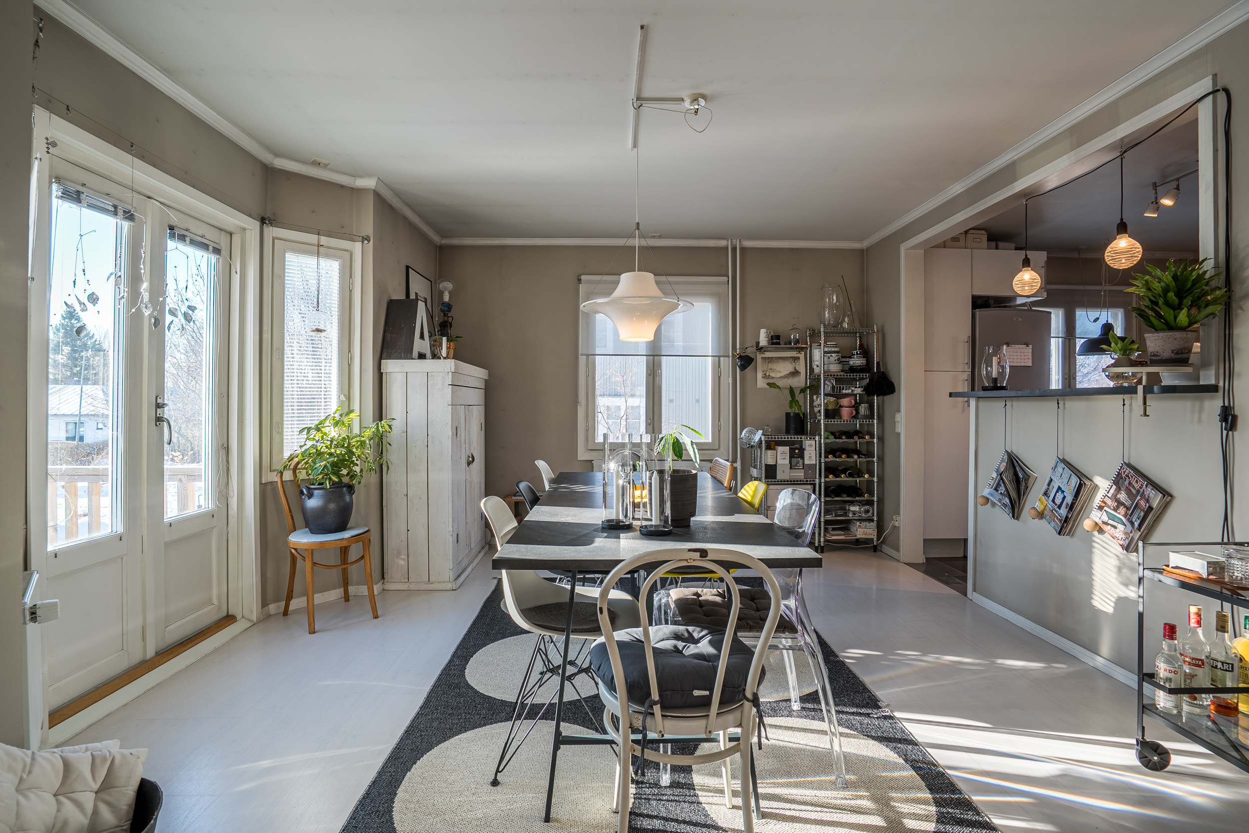 Entrén sker via ett välkomnande veranda med klädförvaring. I direkt anslutning till entrén och hallen finns modernt badrum med toalett och dusch. Köket är modernt och funktionellt planerat och öppnar naturligt upp mot matplatsen. Härifrån flödar rummen vidare in i vardagsrumsdelen, och planlösningen skapar ett behagligt och sammanhängande rörelsemönster genom hela entréplanet. Det finns en självklar cirkulation – rummen samspelar och ger både öppenhet och struktur. I anslutning till vardagsrumsdelen tar huset en arkitektonisk vändning. Några trappsteg leder ner till den tillbyggnad som uppfördes 2020, ritad av arkitekt Anna Hjerling.