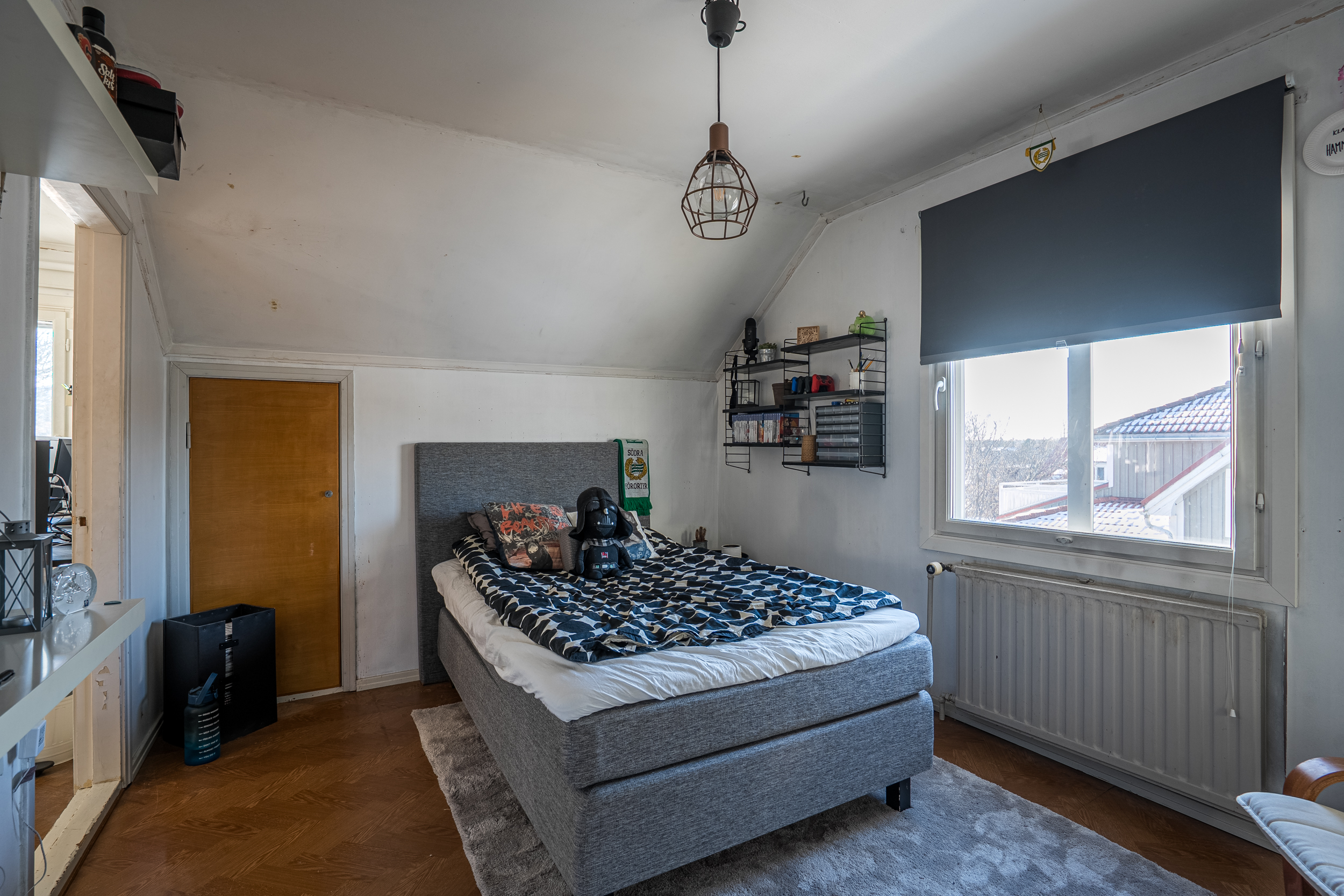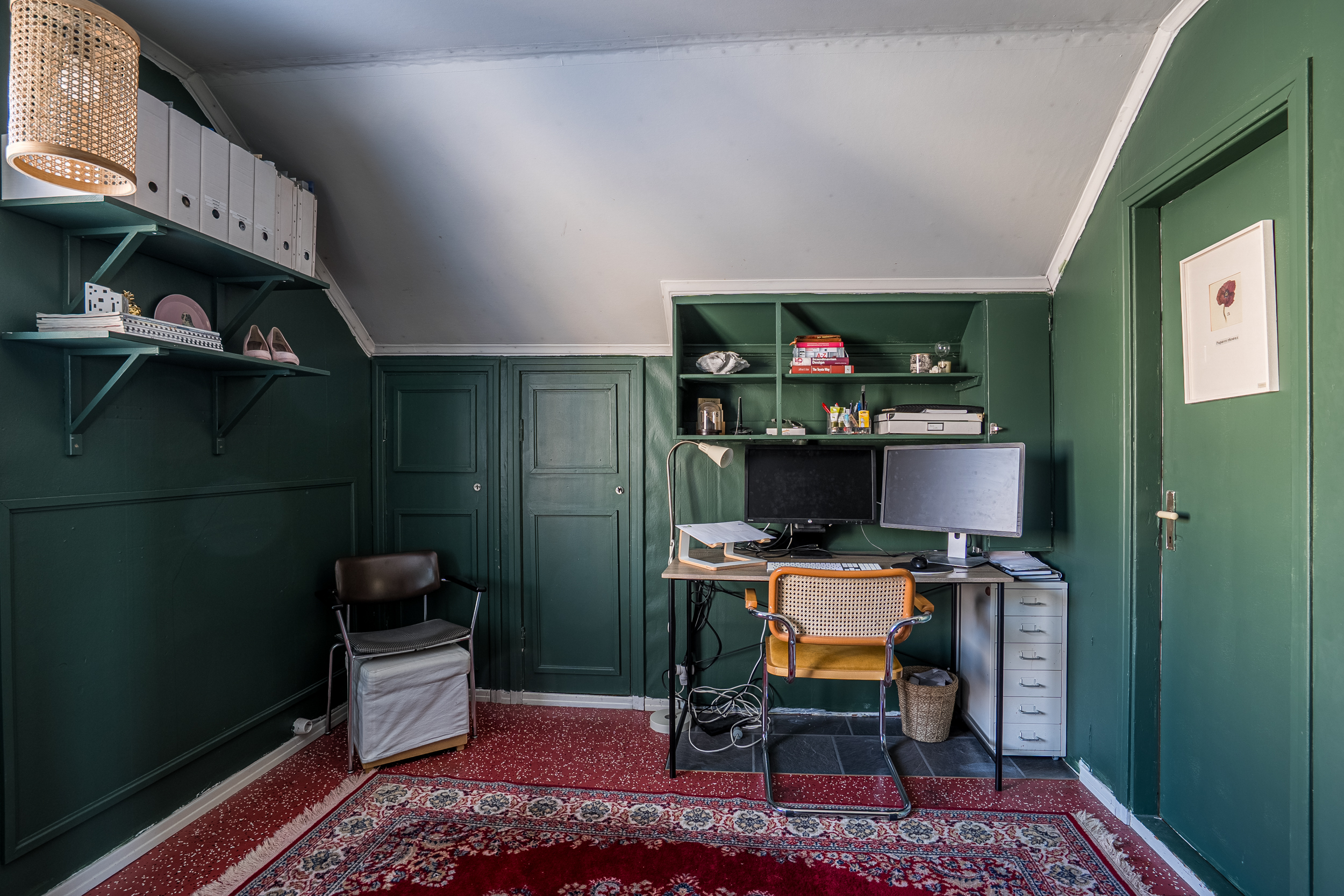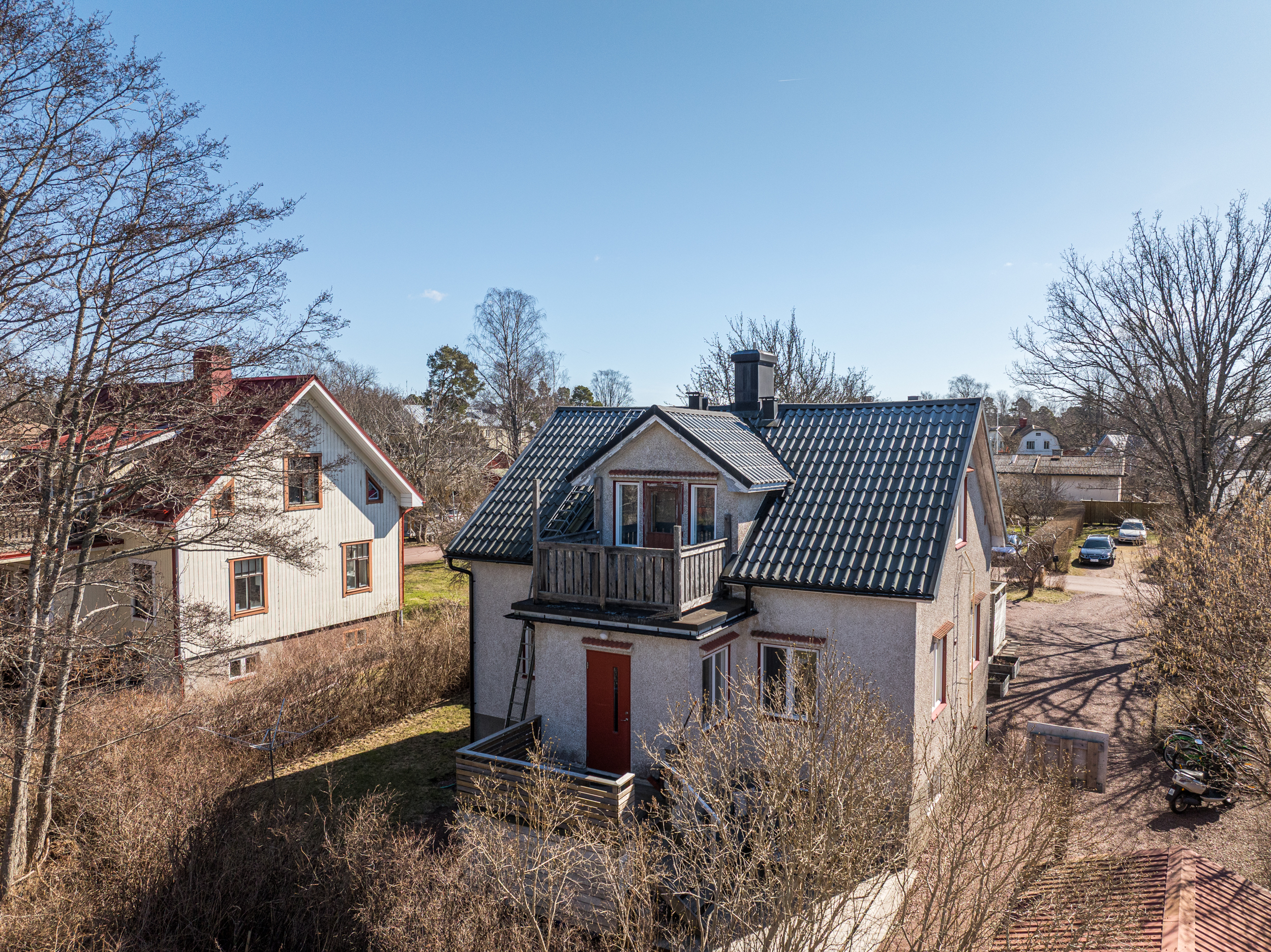 Övre plan i 50-talsdelen rymmer tre sovrum, hall och wc. Här finns även balkong. Planlösningen lämpar sig väl för barnfamilj, hemmakontor eller kombinerade behov. Övre plan har visst renoveringsbehov främst med avseende på ytskikt.