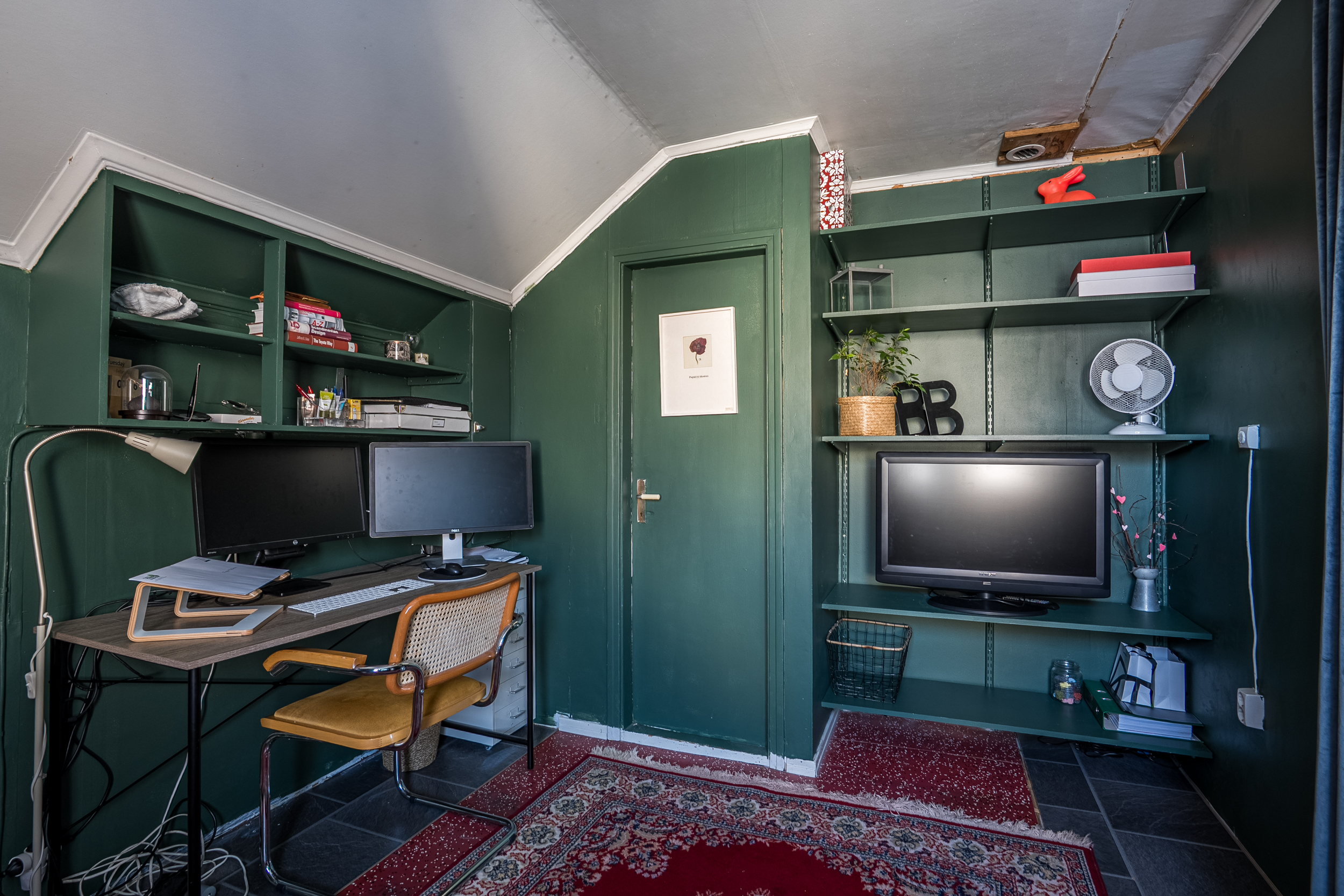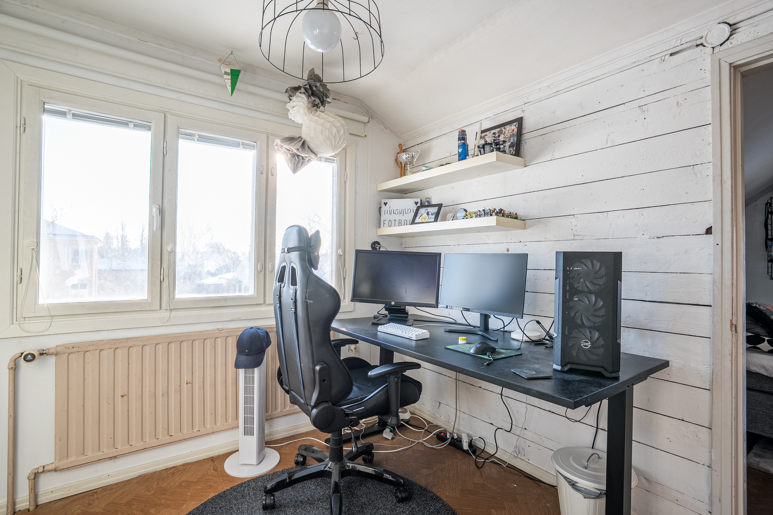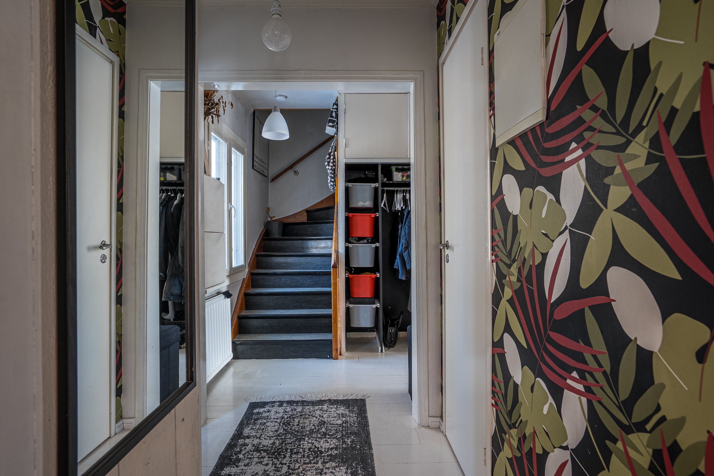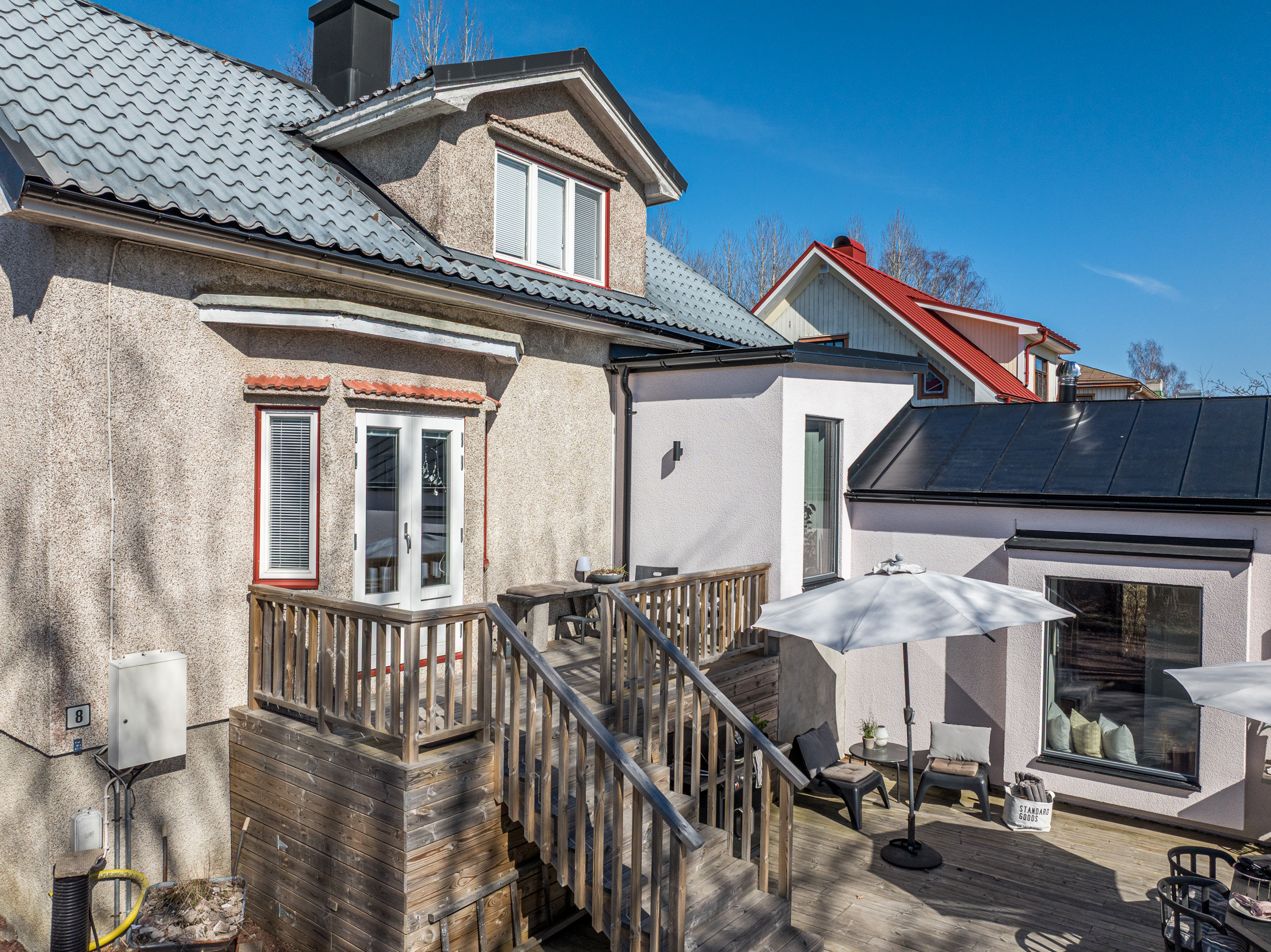 Övre plan i 50-talsdelen rymmer tre sovrum, hall och wc. Här finns även balkong. Planlösningen lämpar sig väl för barnfamilj, hemmakontor eller kombinerade behov. Övre plan har visst renoveringsbehov främst med avseende på ytskikt.