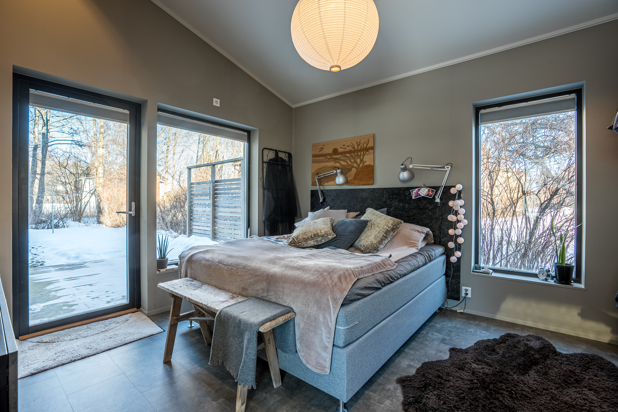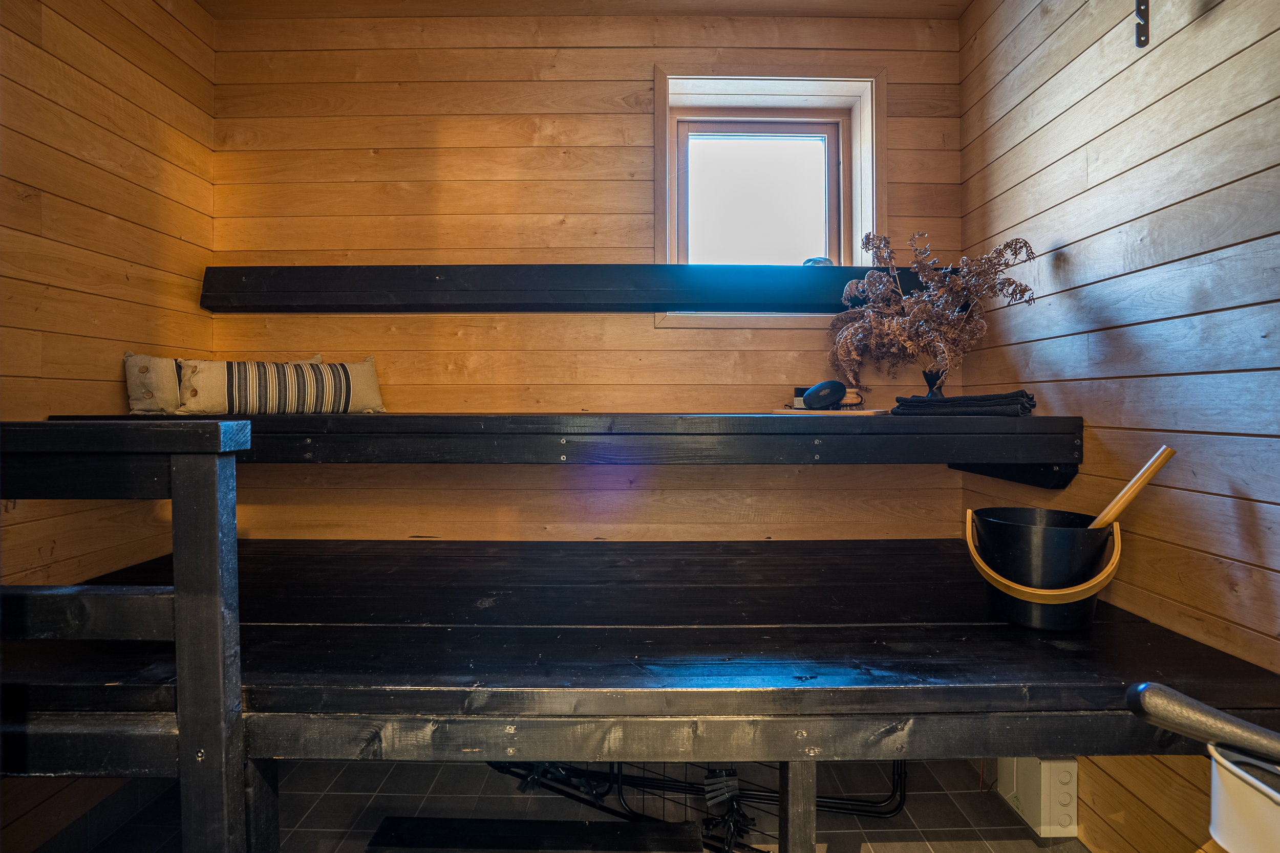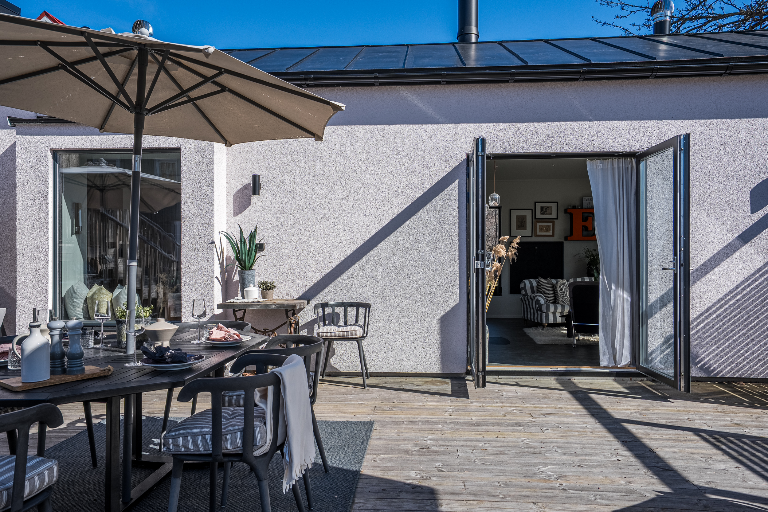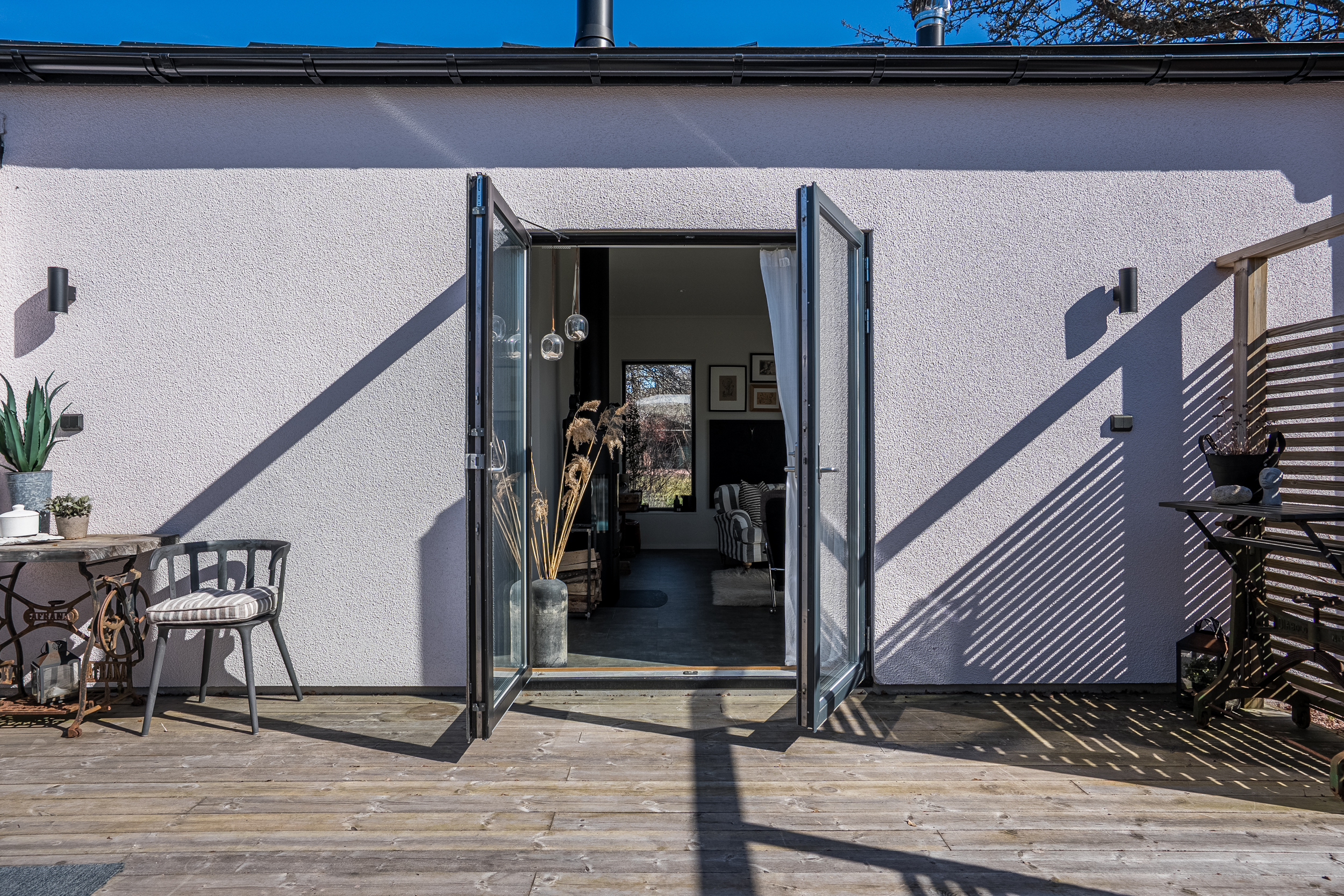 Tillbyggnaden om cirka 60 m² är fullt integrerad med ursprungshuset genom öppnad yttervägg och nivåanpassning till markplan. Arkitektoniskt bildar byggnadskropparna tillsammans ett L, vilket skapar en naturligt skyddad innergård i vinkeln mellan husdelarna. Direkt till vänster när man kliver ner möts man av ett generöst master bedroom med egen utgång till en privat uteplats. Denna plats ligger svalt och skuggat under högsommaren – en bra reträtt när temperaturen stiger. Tillbyggnaden inrymmer också generöst badrum med dusch, wc och bastu – en privat komfortzon med tydlig hotellkänsla. Längst in öppnar sig det stora sällskapsrummet med generös takhöjd, braskamin och omfattande glaspartier mot altanen. Ljuset faller in längs hela rummets längd och skapar en varm och levande atmosfär. Härifrån kliver man rakt ut på den väldisponerade altanen som löper i vinkel och knyter samman husets båda delar. I L:ets inre uppstår en ovanligt skyddad och vindstilla uteplats i västerläge – en naturlig samlingspunkt från tidig vår till sen höst.