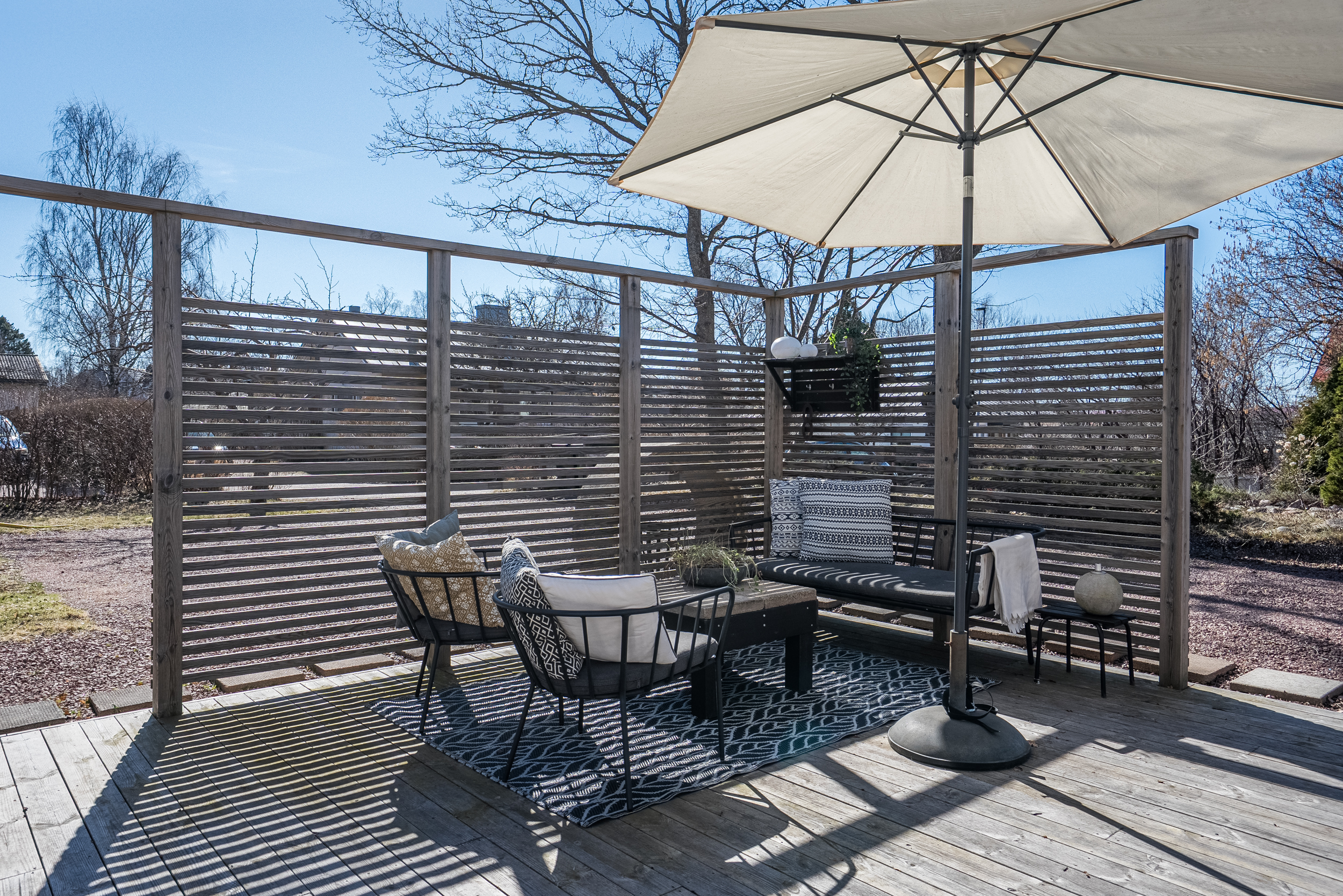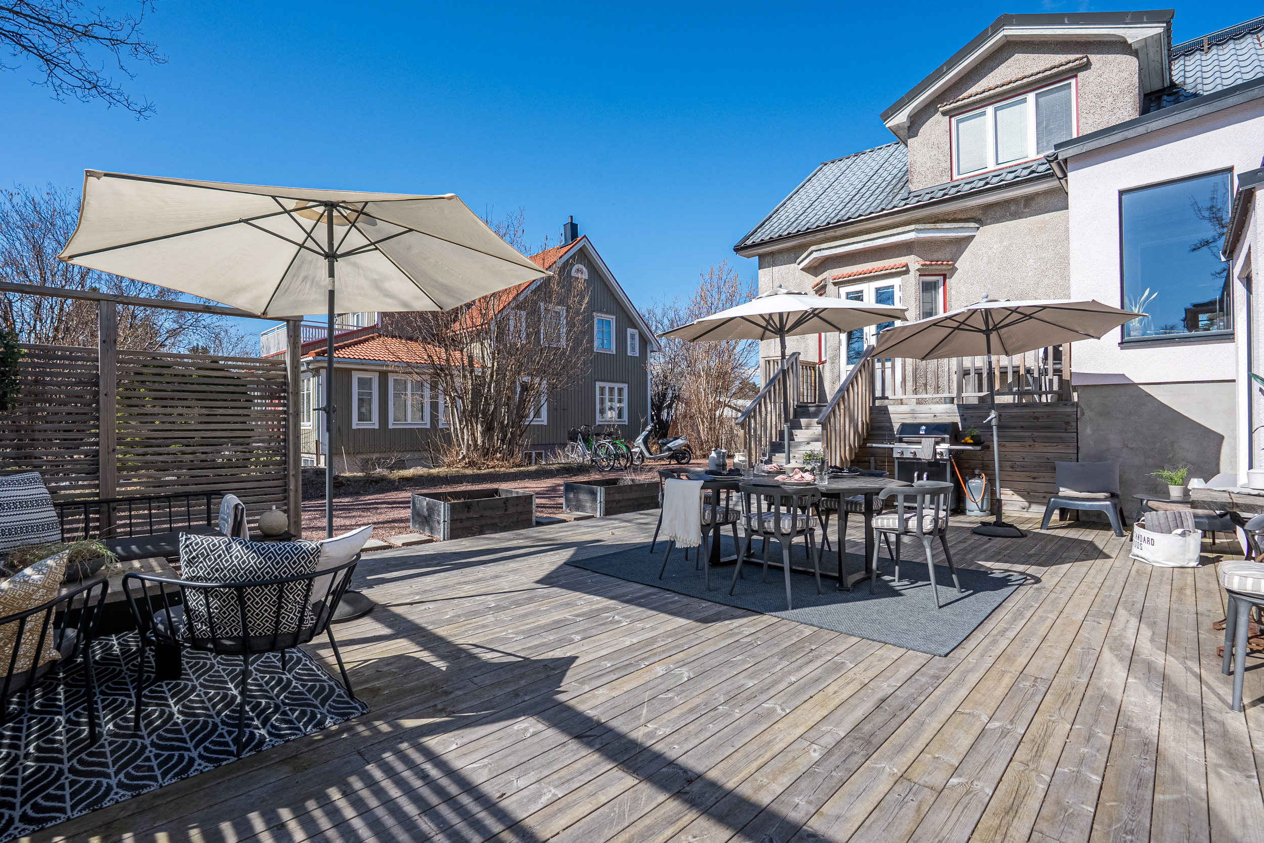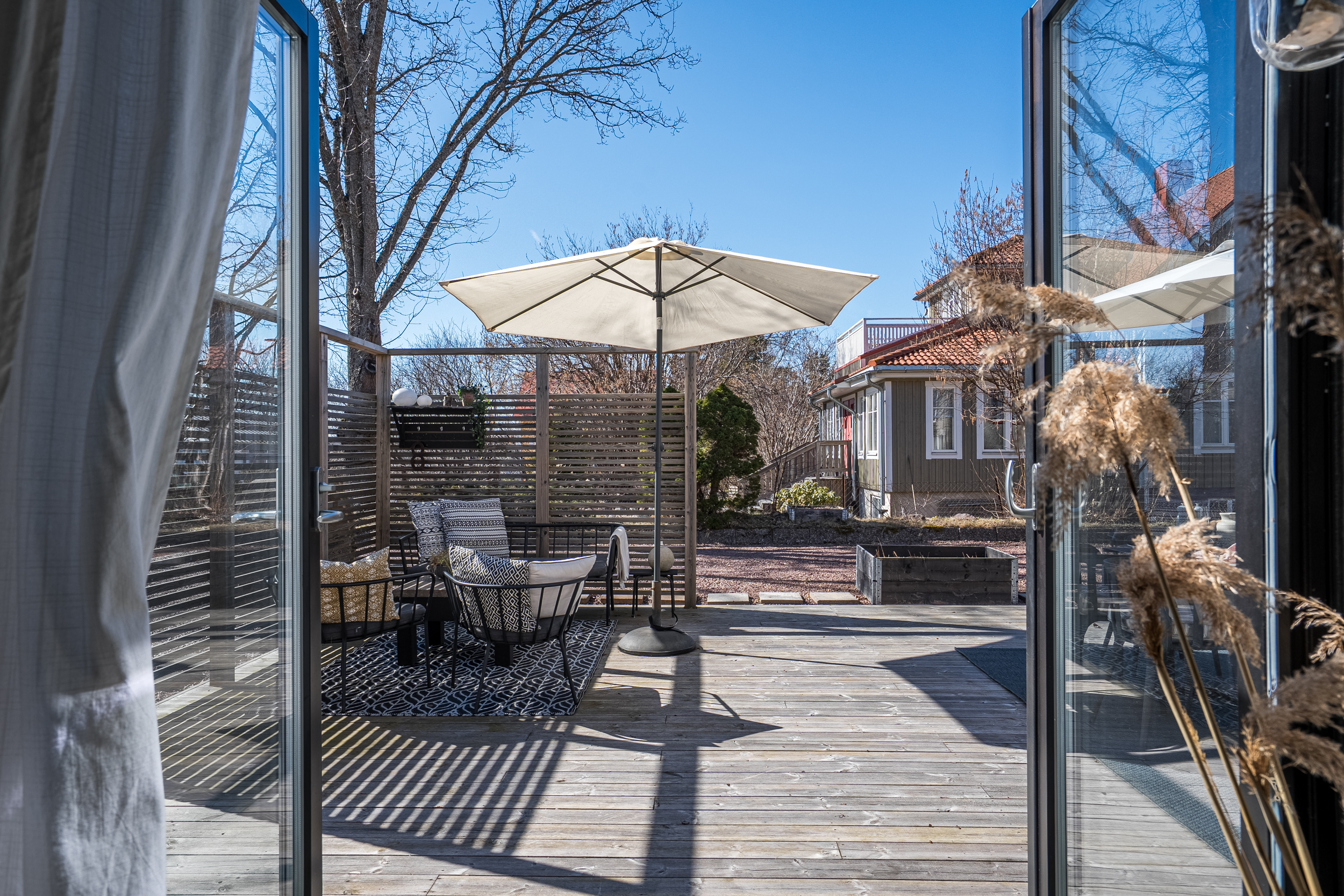 Fastigheten omfattar en tomt om 796 m² där bebyggelsen på ett genomtänkt sätt skapar en skyddad och vindstilla gårdsmiljö. Här har man lyckats skapa något mer än en uteplats – det är en inramad, privat sommarmiljö med västerläge och kvällssol, delvis skyddad från både insyn och nordanvind.