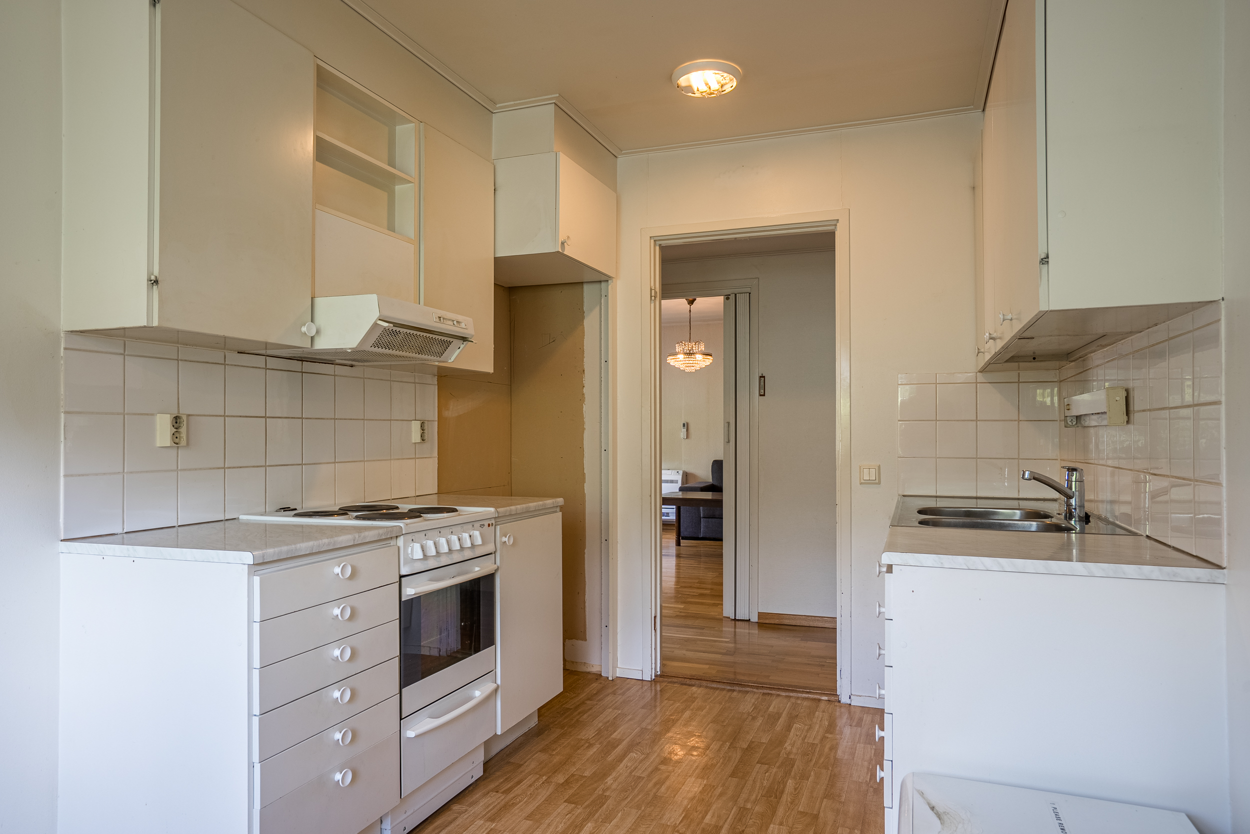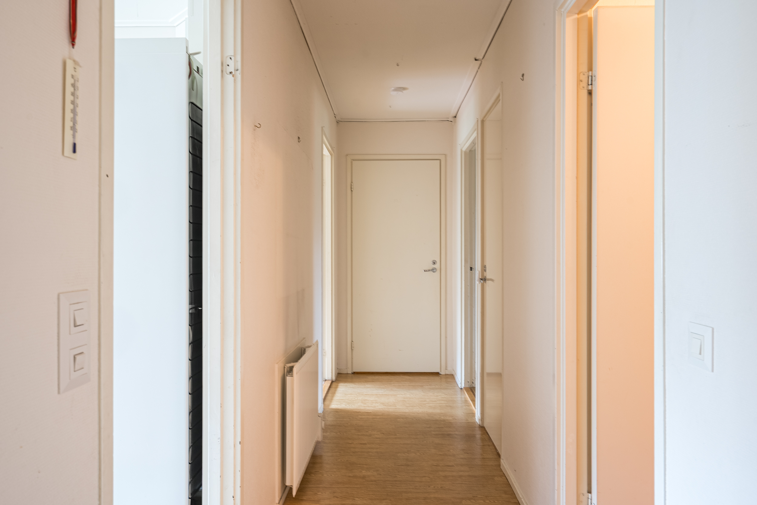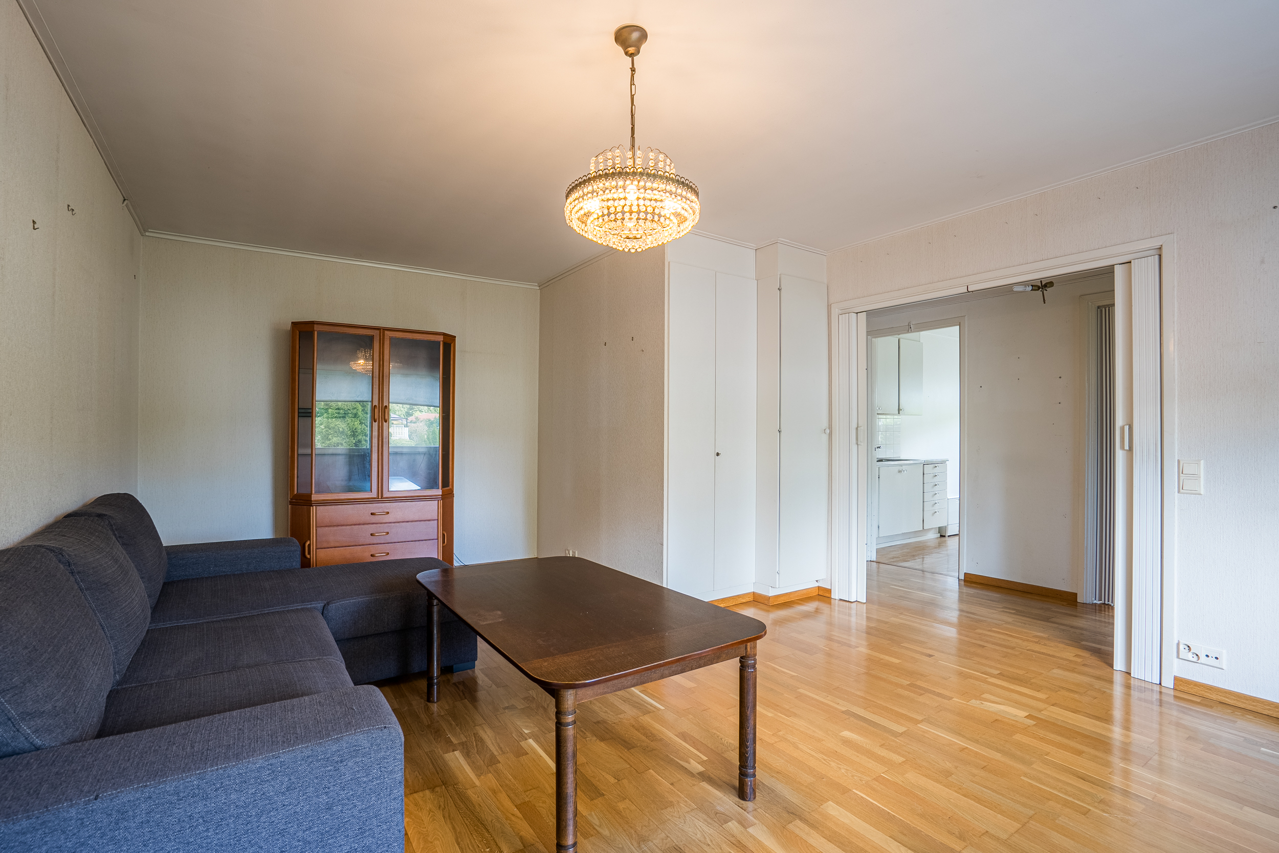 Den större lägenheten (5 rok, 116 m²) rymmer fyra sovrum varav ett av dem nås genom ett annat sovrum, vardagsrum, kök, badrum med bastu, separat gästtoalett, tvättstuga med vatten, el och avlopp samt praktiskt förrådsutrymme. Golven är huvudsakligen parkett/klickgolv och köket har spis och fläkt från 2015. Uppvärmningen sker med direktverkande el via oljefyllda radiatorer. Carport och uteförråd kompletterar boendet.
