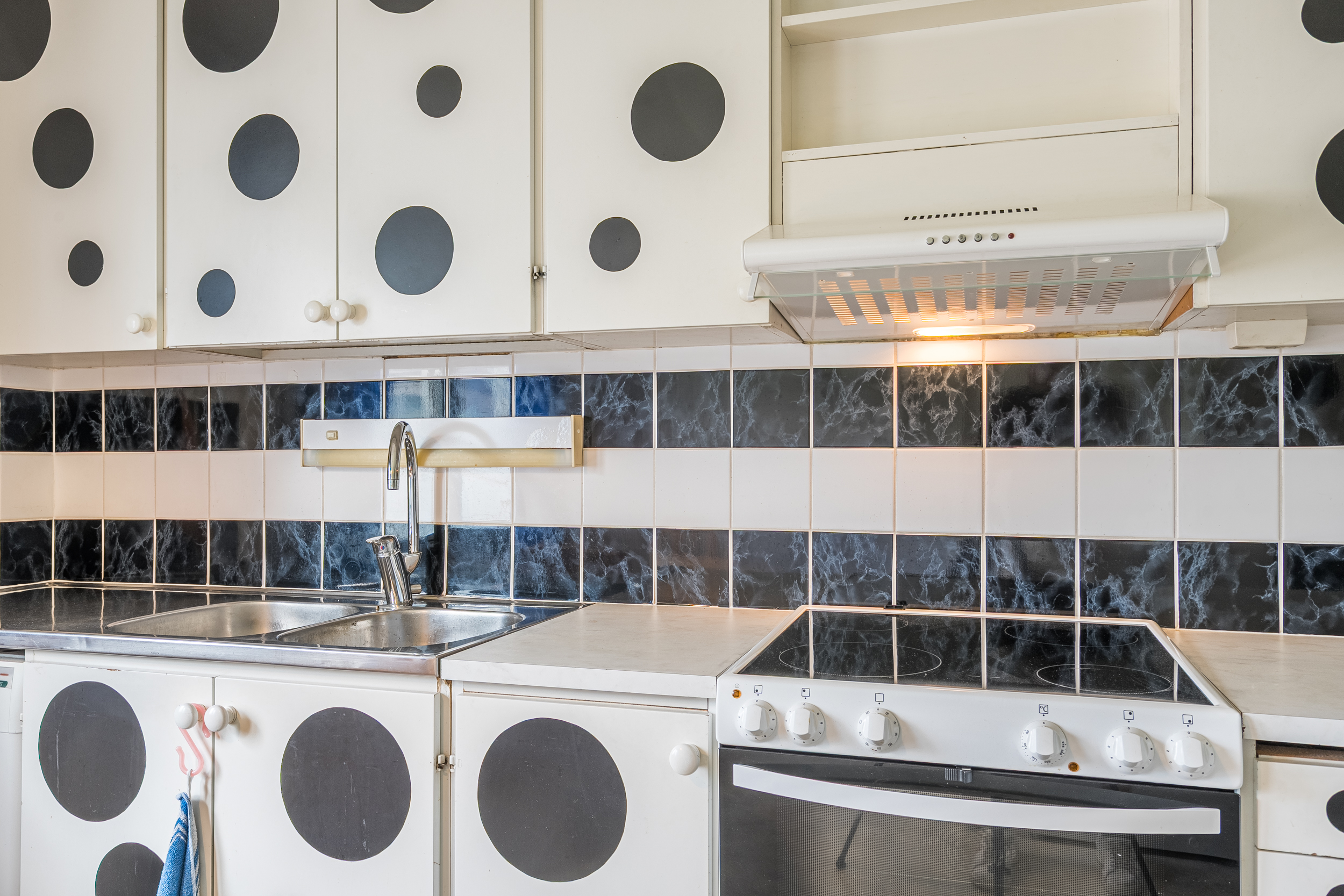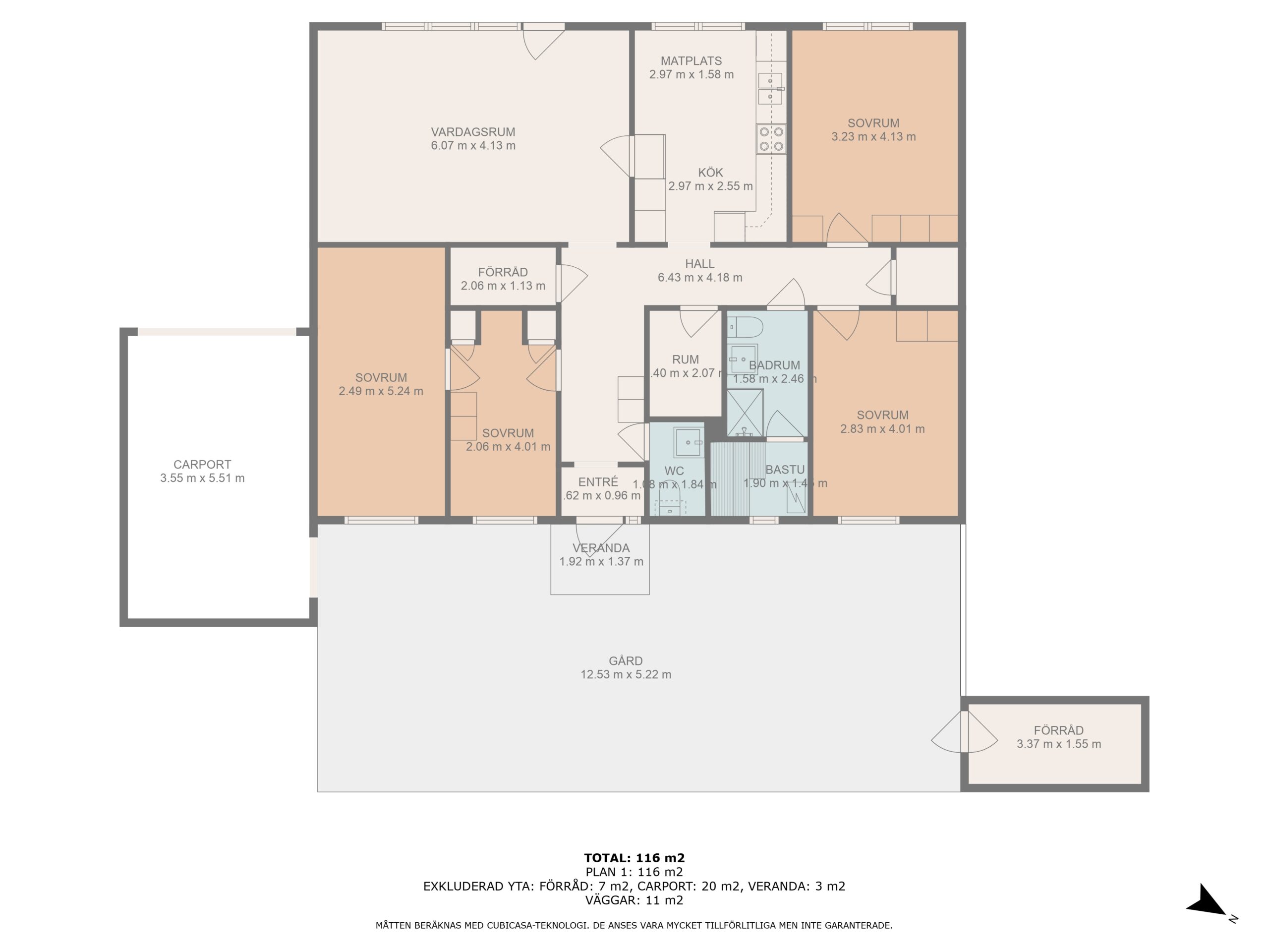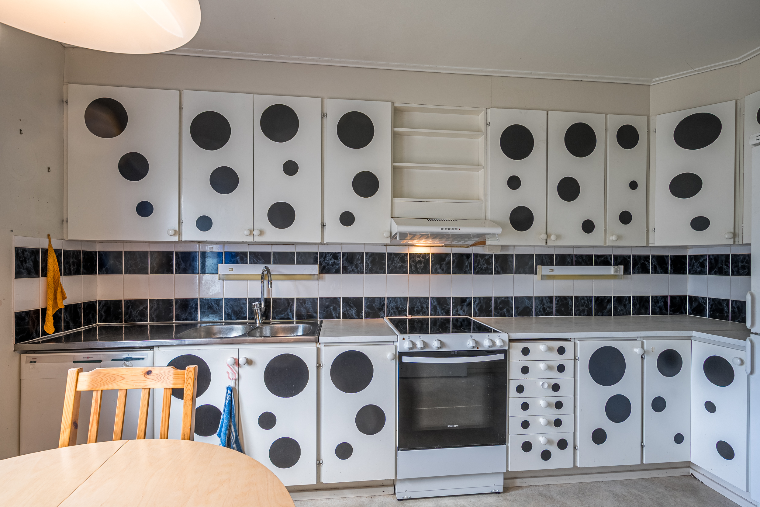 Den större lägenheten (5 rok, 116 m²) rymmer fyra sovrum varav ett av dem nås genom ett annat sovrum, vardagsrum, kök, badrum med bastu, separat gästtoalett, tvättstuga med vatten, el och avlopp samt praktiskt förrådsutrymme. Golven är huvudsakligen parkett/klickgolv och köket har spis och fläkt från 2015. Uppvärmningen sker med direktverkande el via oljefyllda radiatorer. Carport och uteförråd kompletterar boendet.