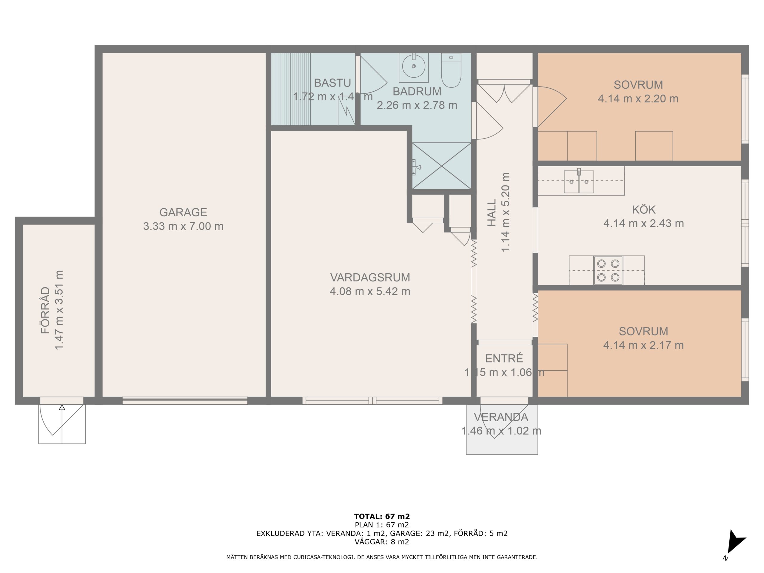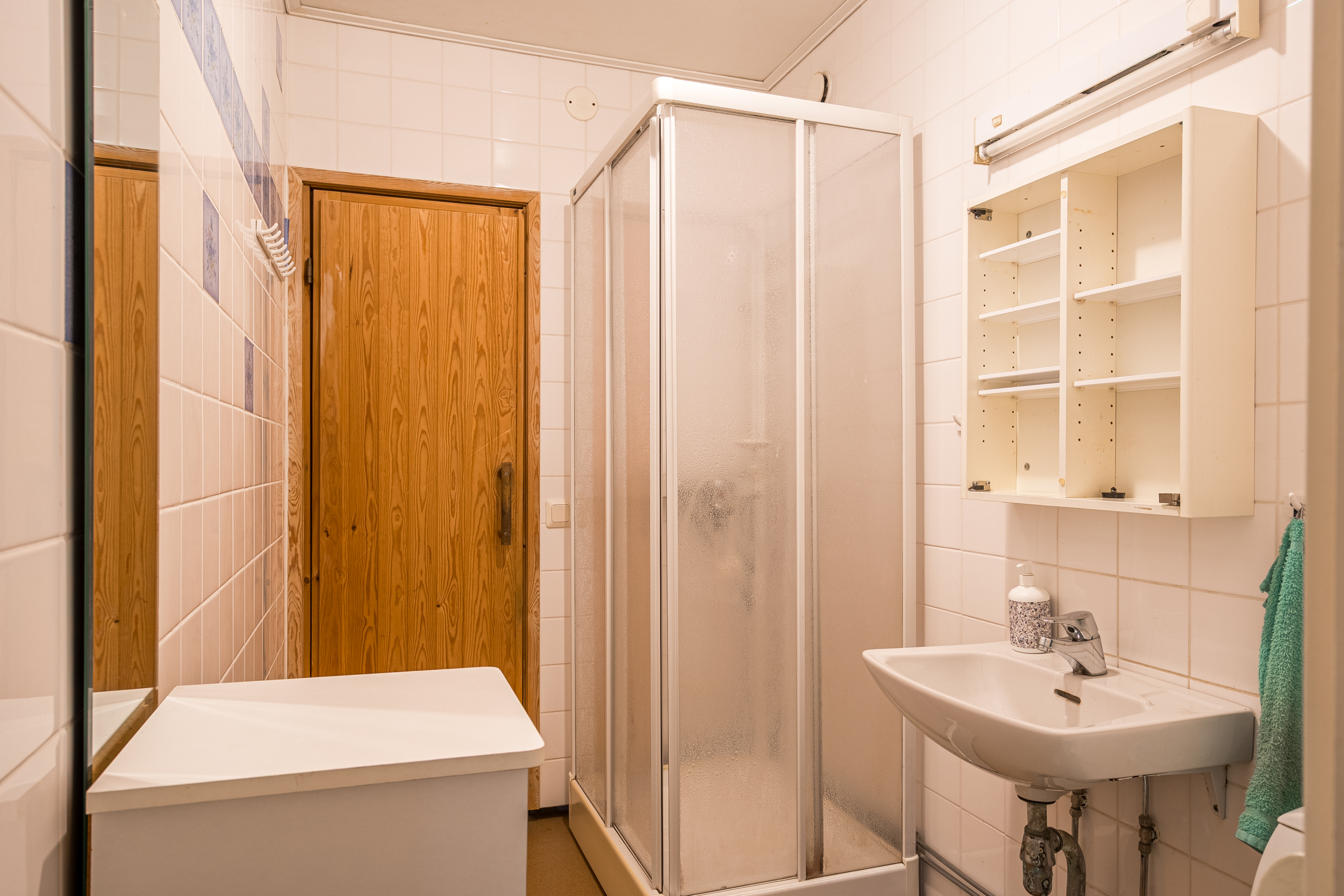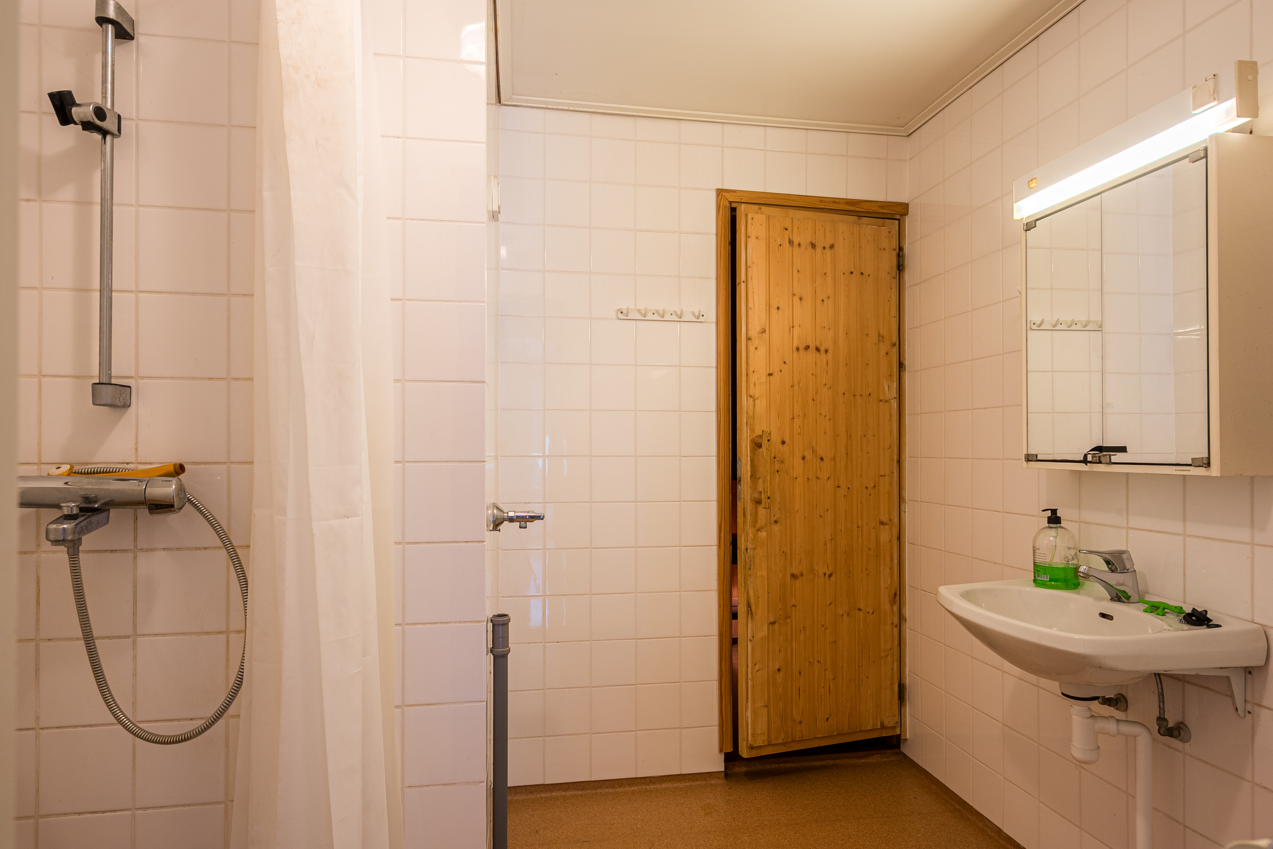 Den mindre lägenheten (3 rok, 67 m²) har tre rum och kök, badrum med dusch (nytt duschmunstycke), wc (2020), bastu samt plats för tvättmaskin. Utöver direktel finns här en modern luft–luftvärmepump som monterades under 2023 (inne-enhet tillverkningsår 2020, ute-enhet tillverkningsår 2022). Till bostaden hör garage med trefasuttag samt uteförråd.