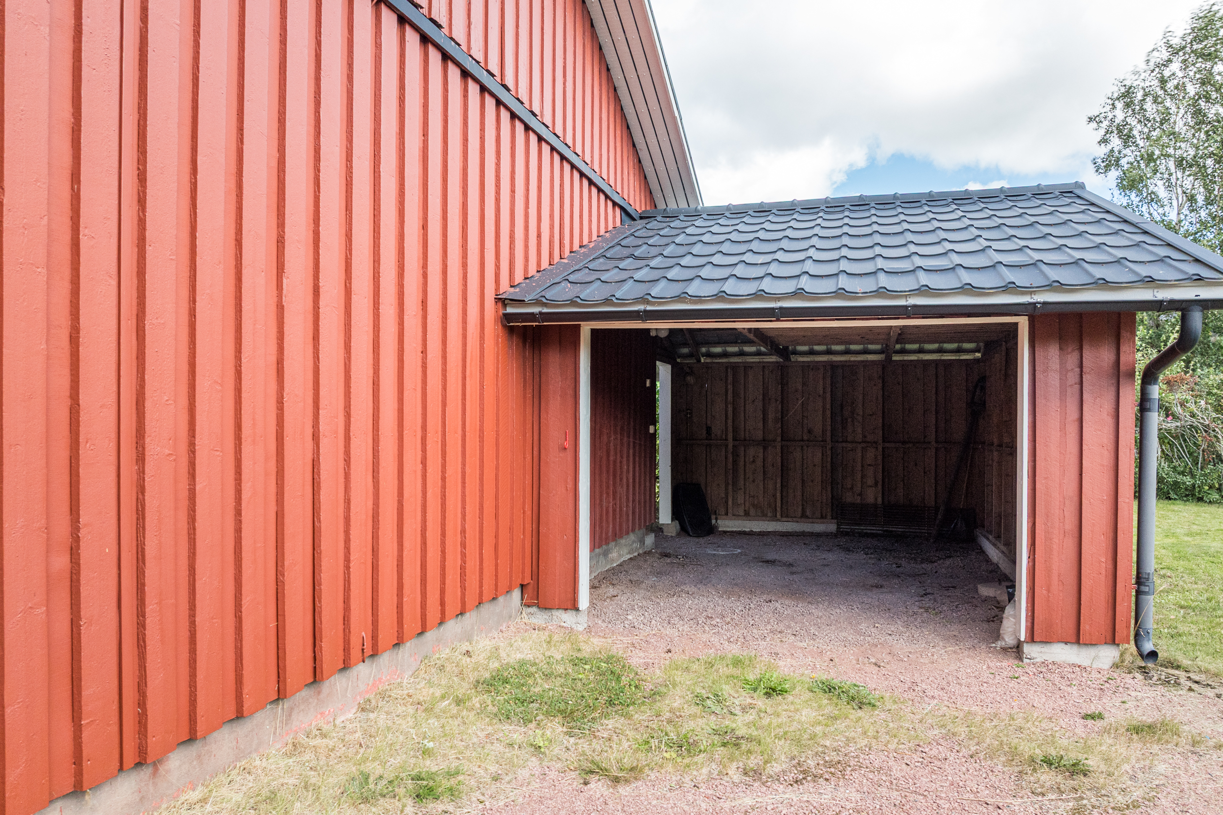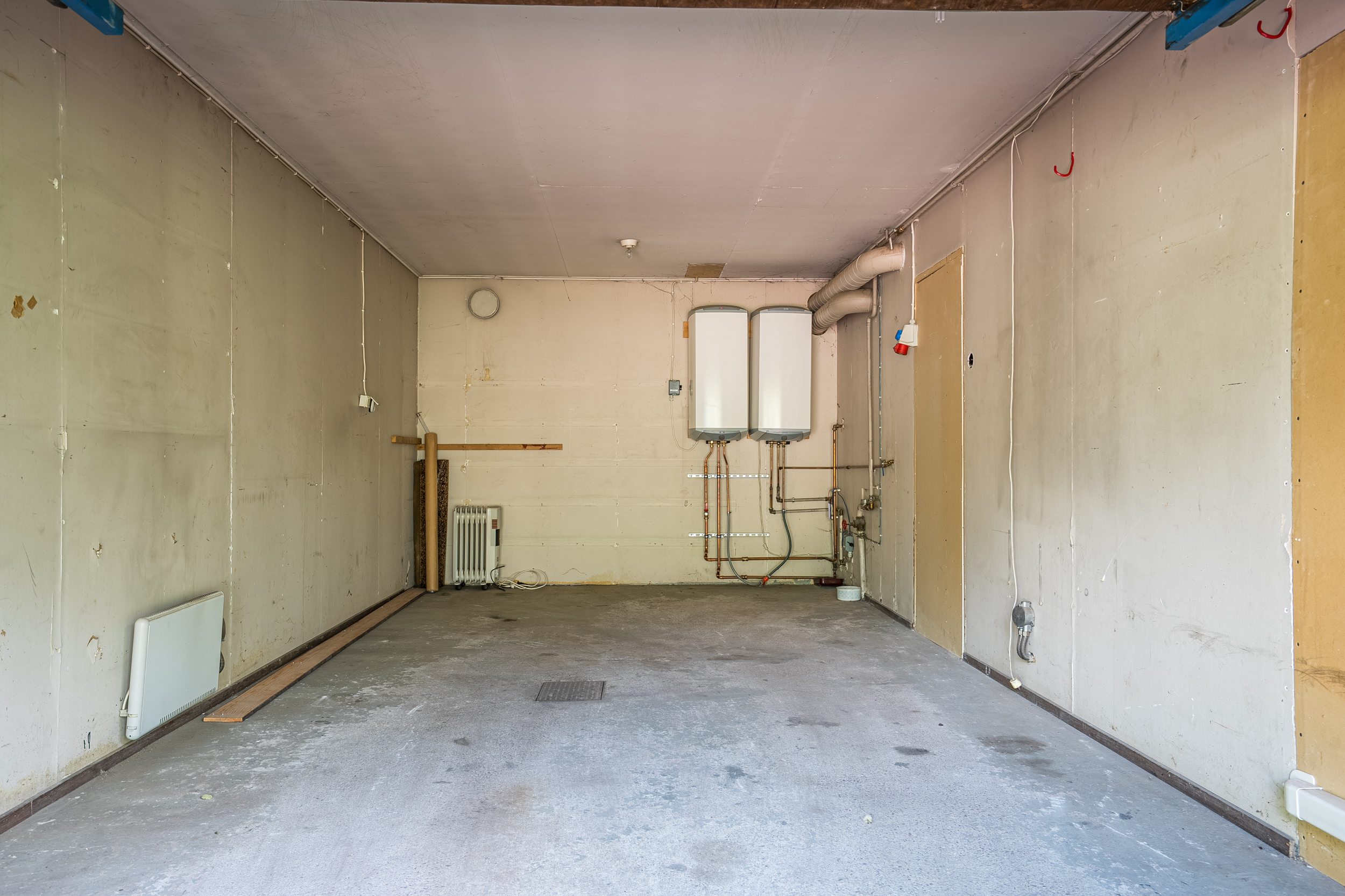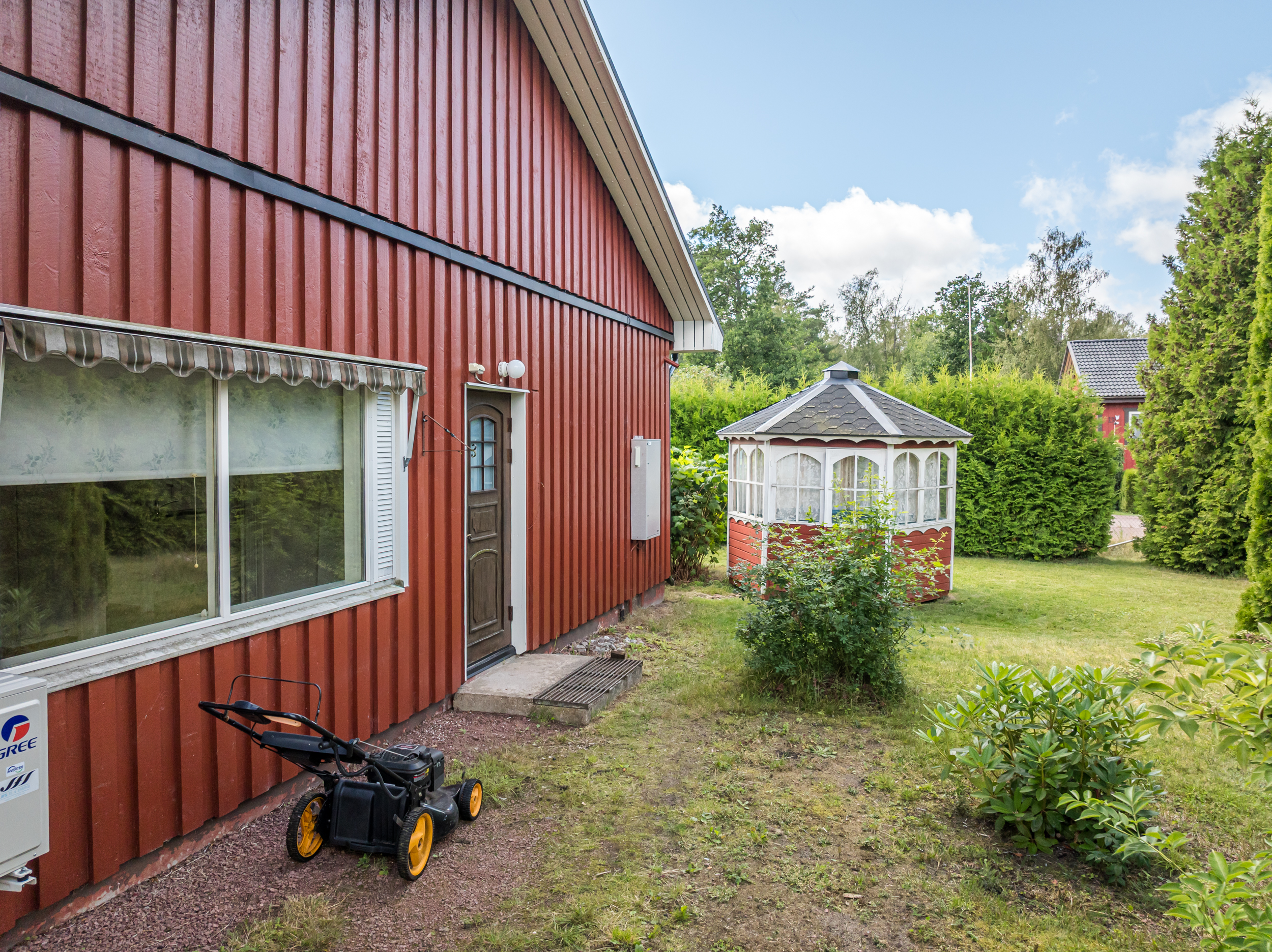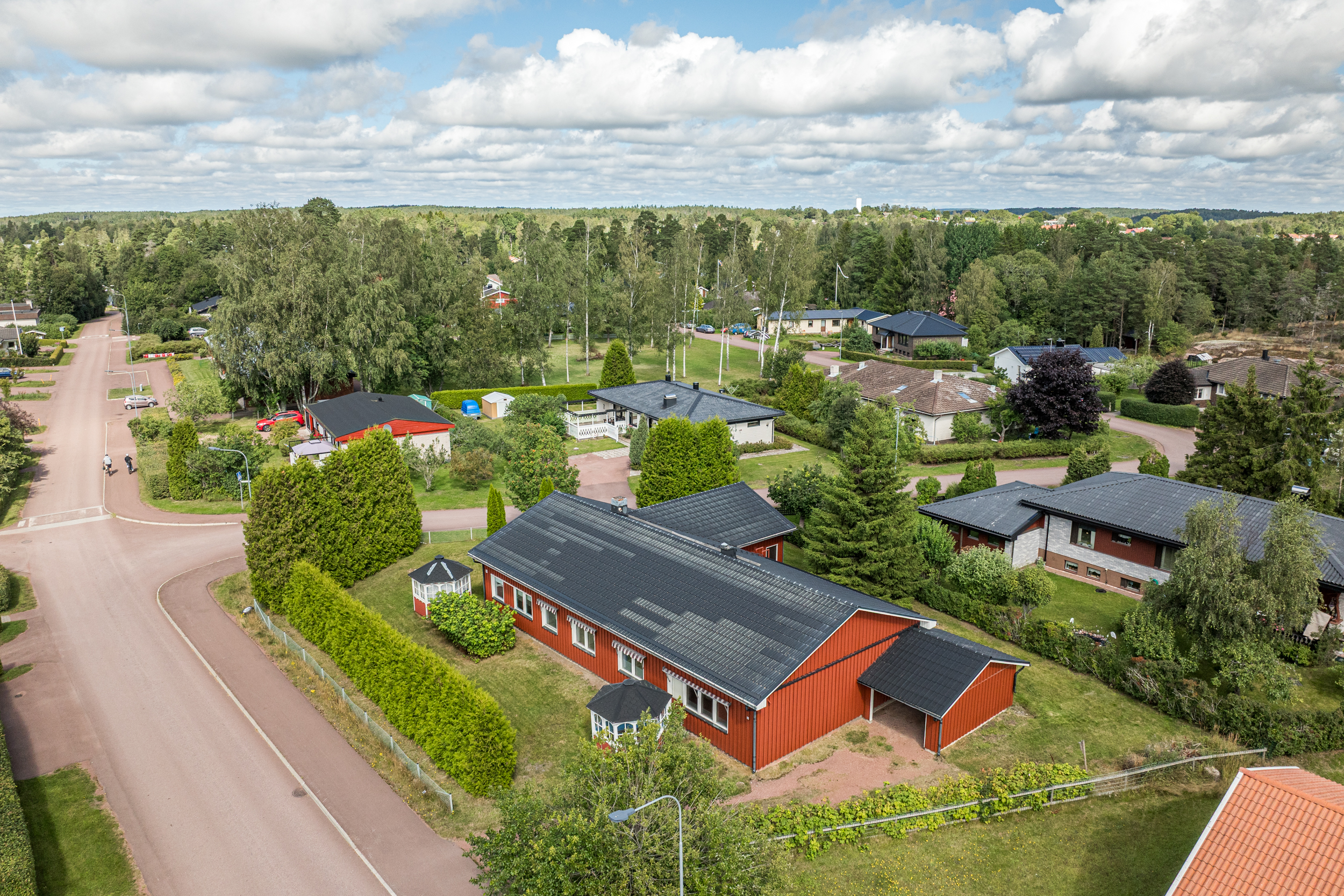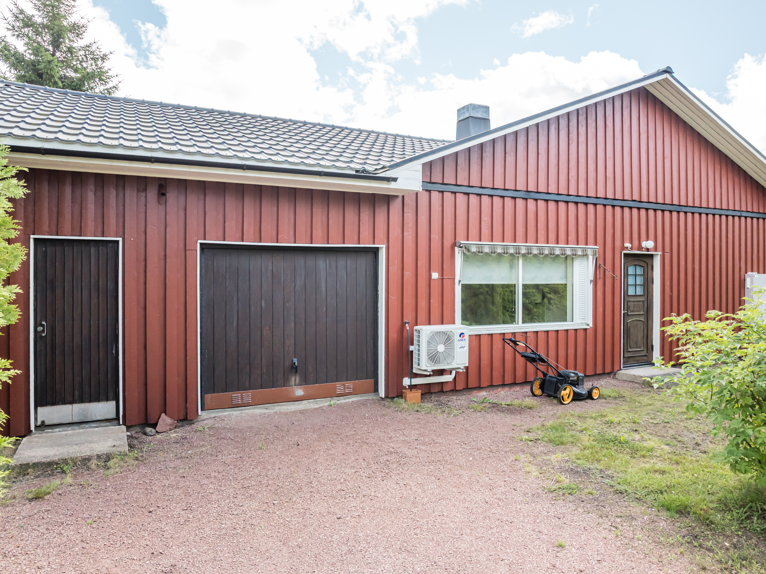 Byggnaden vilar på gjuten platta, har träpanel som målades 2018 samt ett plåttak i tegelimitation. Fastigheten är ansluten till kommunalt vatten och avlopp, och enligt säljaren finns fiber via Ålcom. Elförbrukning mäts separat för respektive lägenhet, medan vatten mäts gemensamt. Båda lägenheterna har egna varmvattenberedare placerade i garaget – till större lägenhet från ca 2020, till mindre lägenhet från ca 2009.