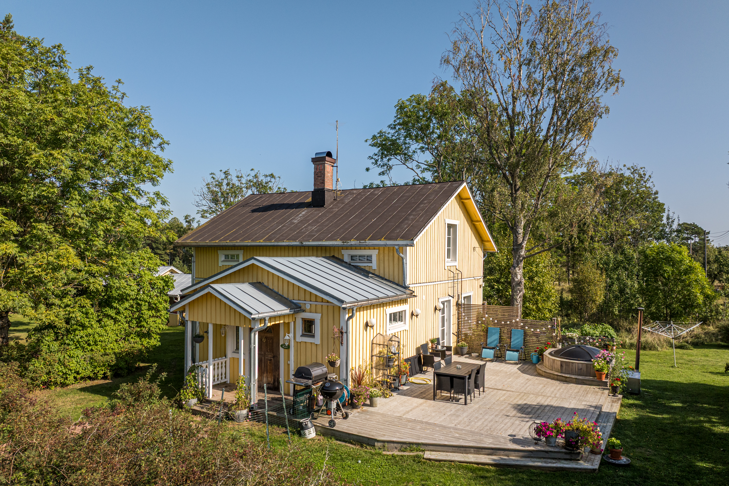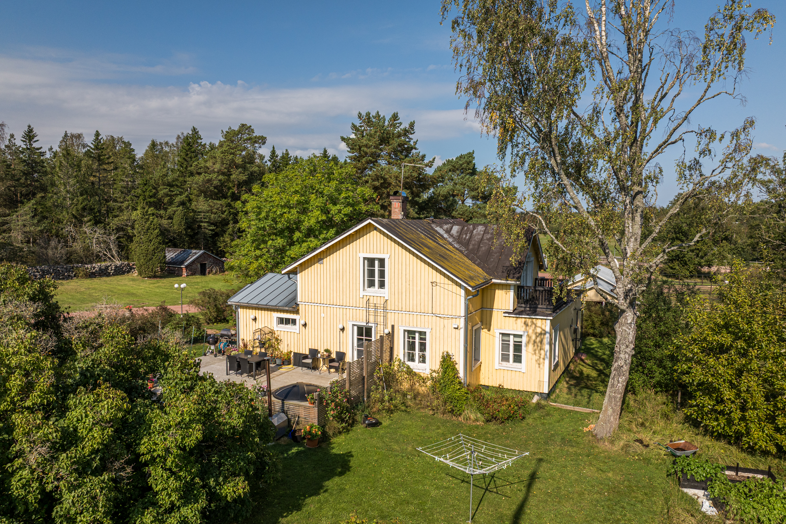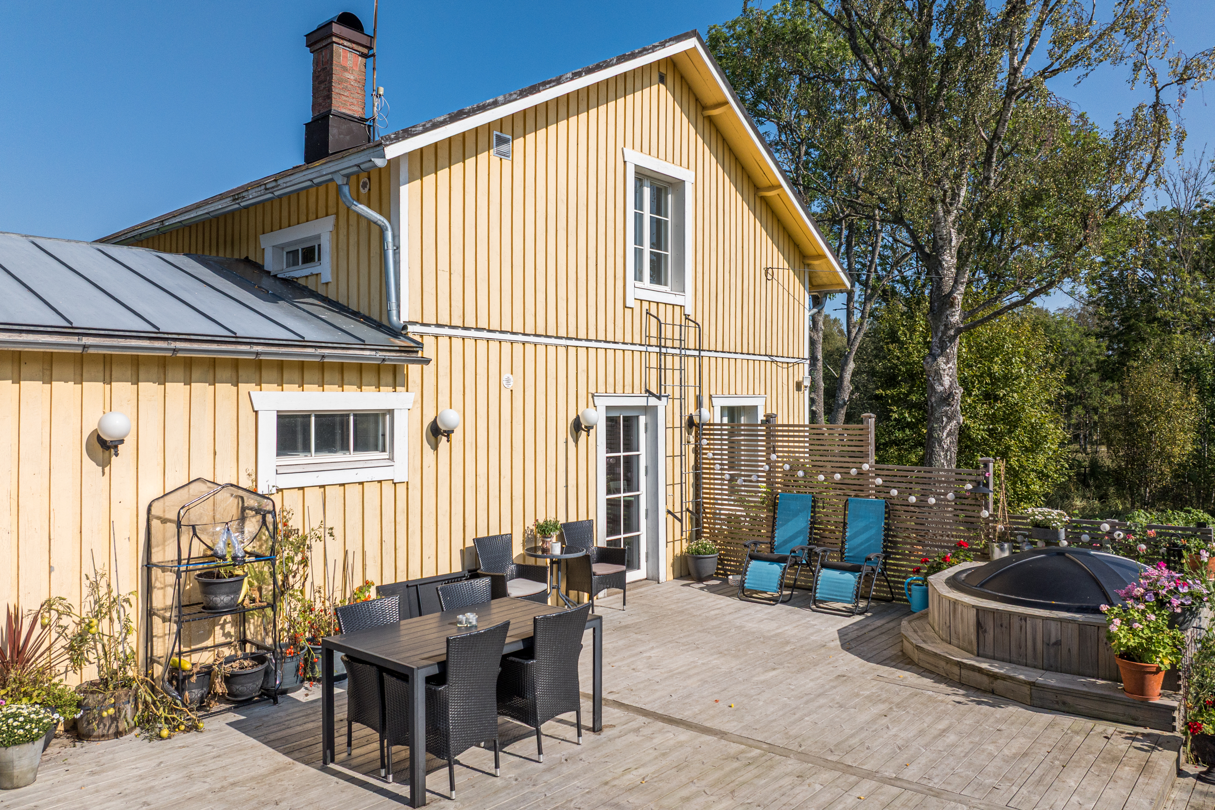 Bostadshuset med en uppvärmd yta på ca 165 m2 är fördelat på 5 rum och kök i två våningsplan. På första våningen finns en rymlig hall med bra förvaring, badrum med bastu/tvättstuga samt ett ordentligt sovrum med plats för dubbelsäng. Från det luftiga och ljusa köket har du direkt utgång till den stora altanen och den lummiga trädgården med fruktträd och buskar. På terrassen finns en vedeldad badtunna. Här har man en verkligt privat oas med sol hela dagen. Intill köket ligger de två sammanhängande vardagsrummen där det finns en öppen spis med insats samt en liten gjutjärnskamin.
