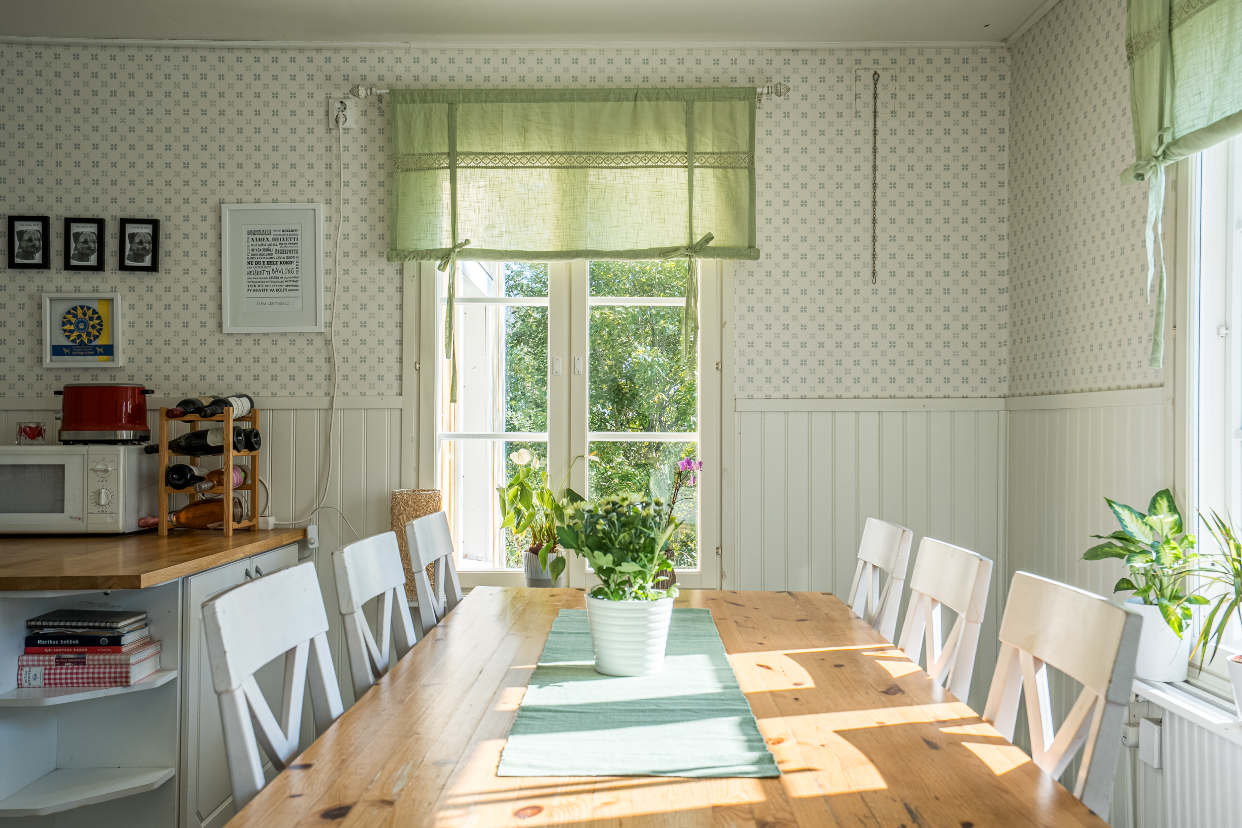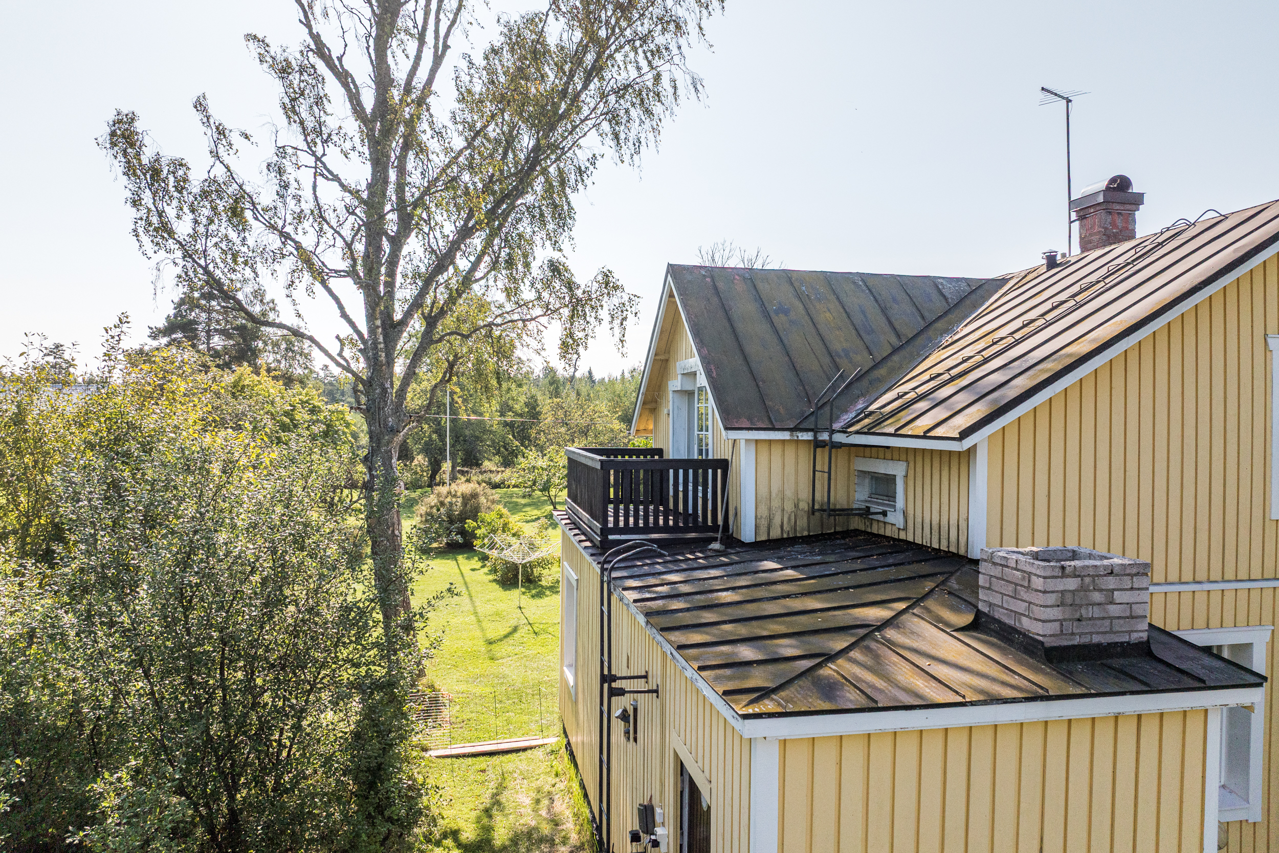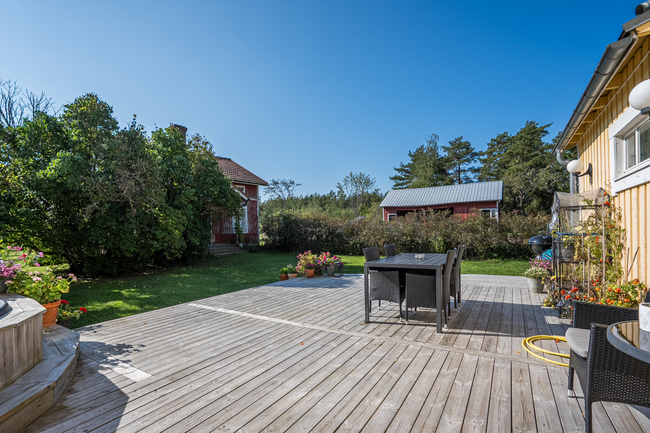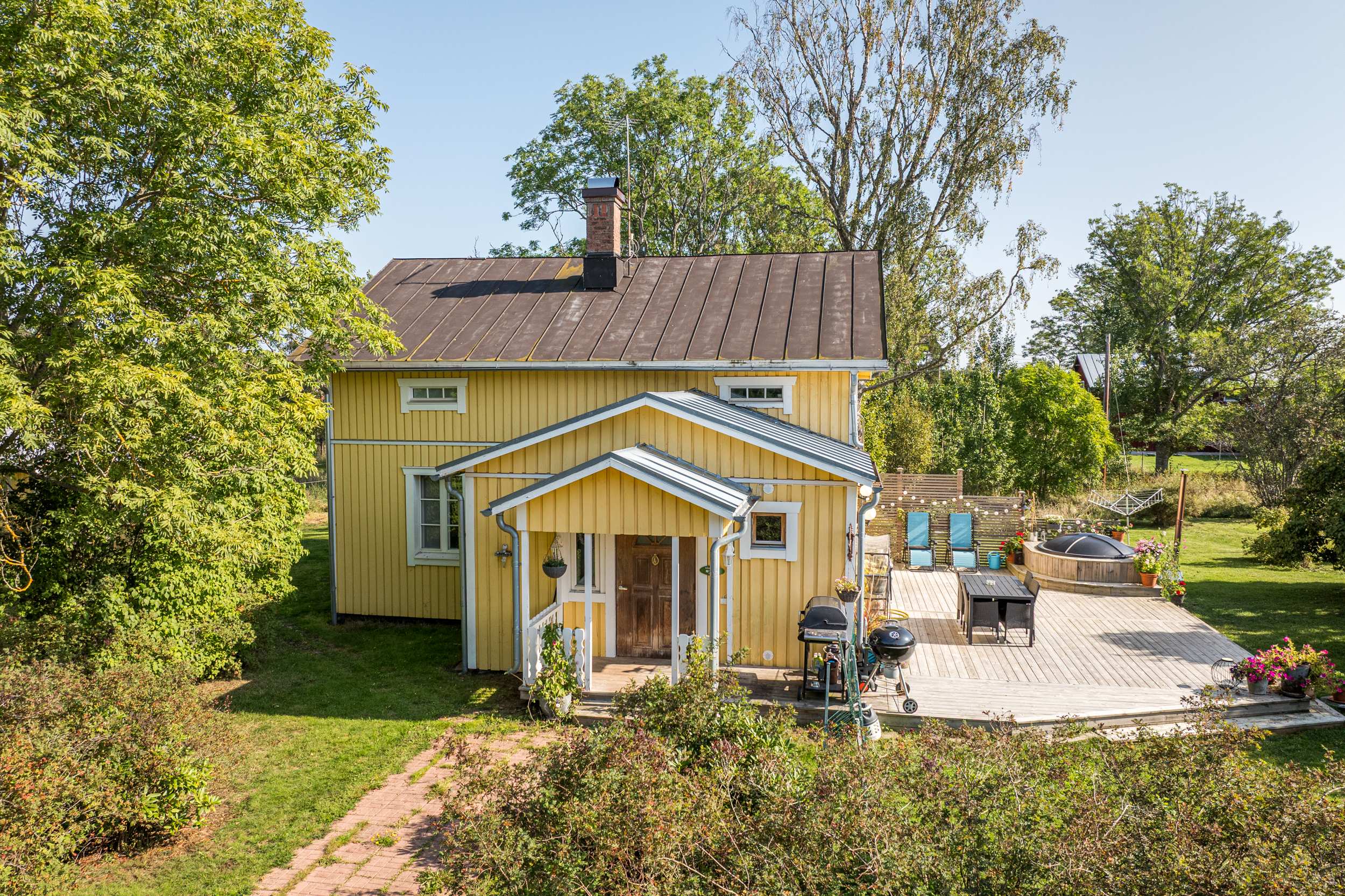 Bostadshuset med en uppvärmd yta på ca 165 m2 är fördelat på 5 rum och kök i två våningsplan. På första våningen finns en rymlig hall med bra förvaring, badrum med bastu/tvättstuga samt ett ordentligt sovrum med plats för dubbelsäng. Från det luftiga och ljusa köket har du direkt utgång till den stora altanen och den lummiga trädgården med fruktträd och buskar. På terrassen finns en vedeldad badtunna. Här har man en verkligt privat oas med sol hela dagen. Intill köket ligger de två sammanhängande vardagsrummen där det finns en öppen spis med insats samt en liten gjutjärnskamin.