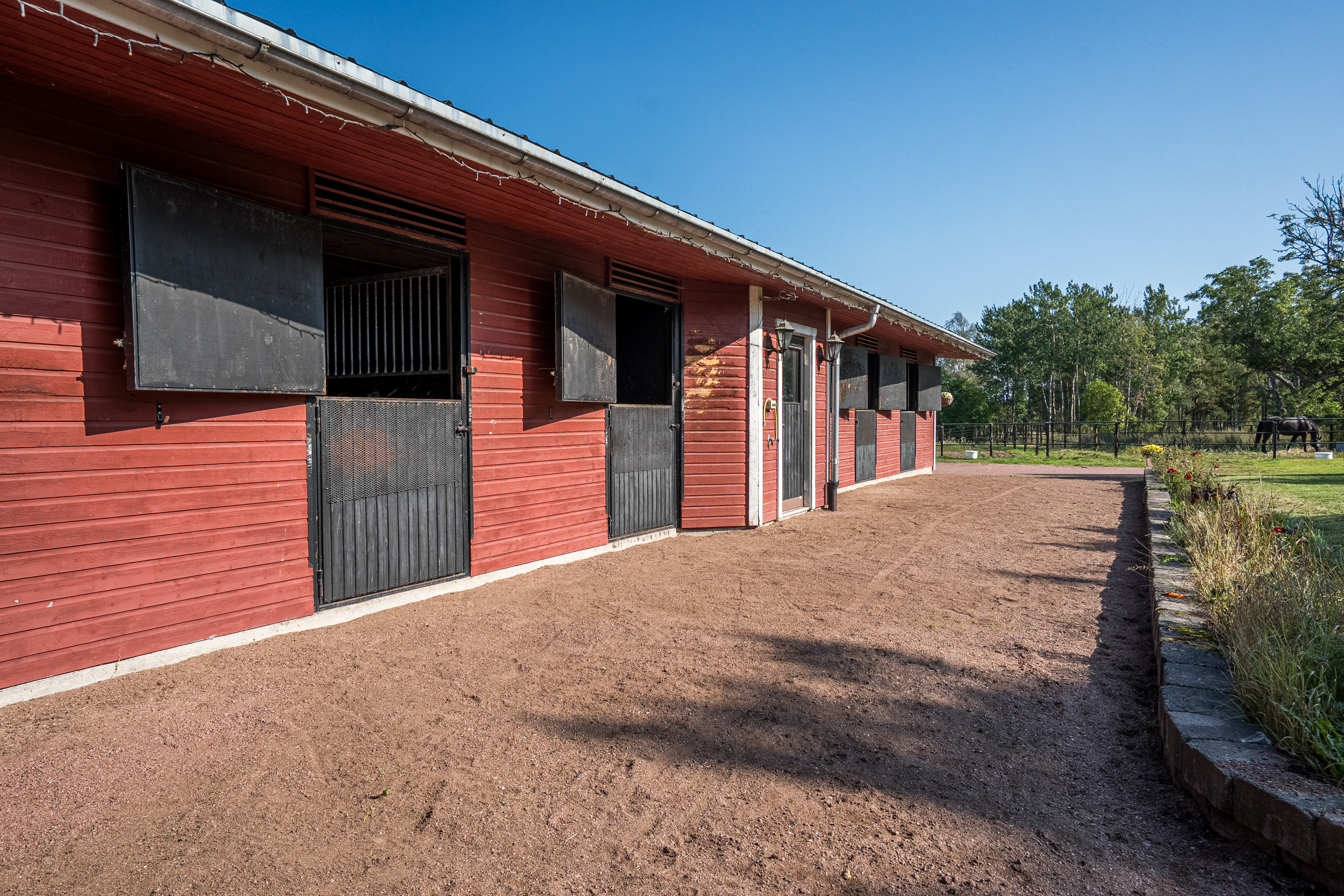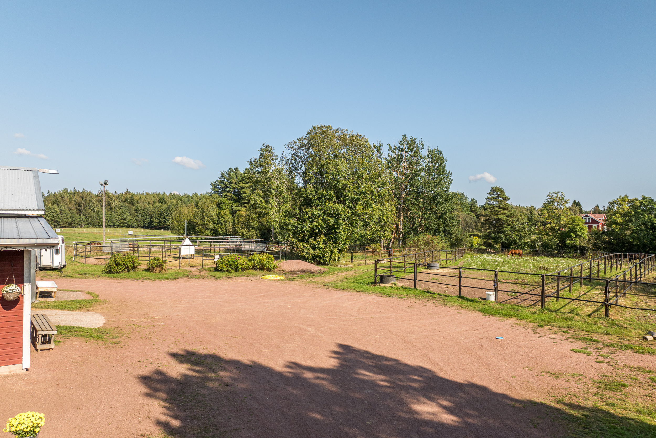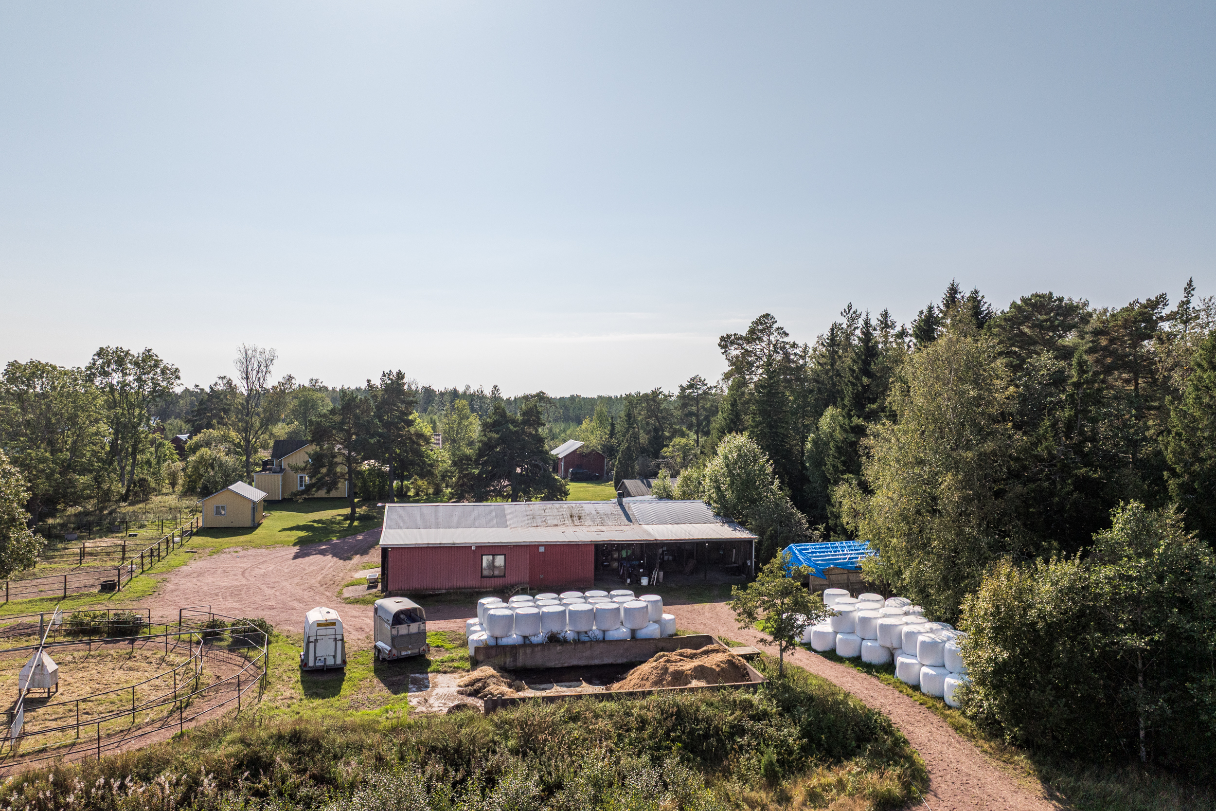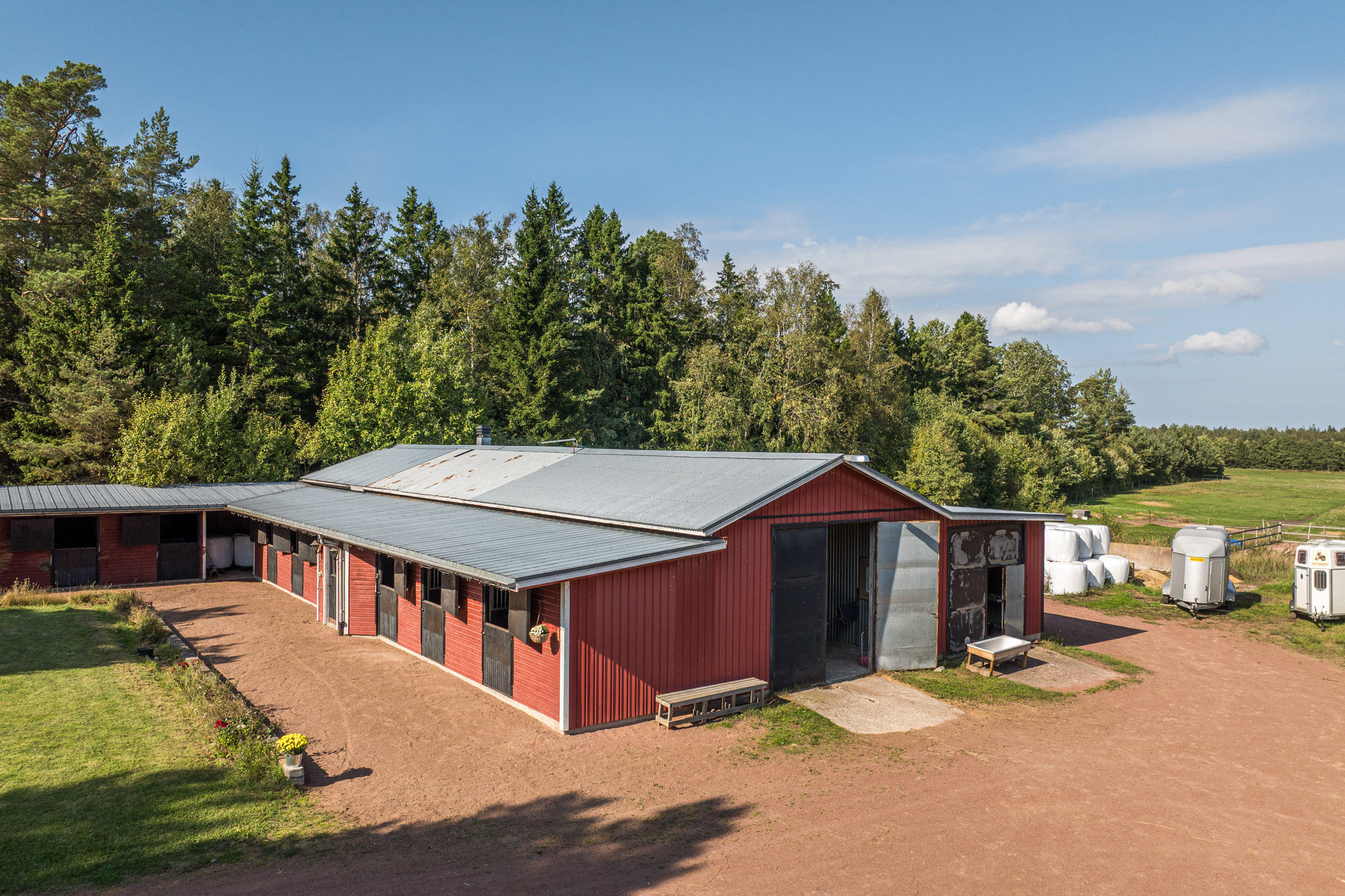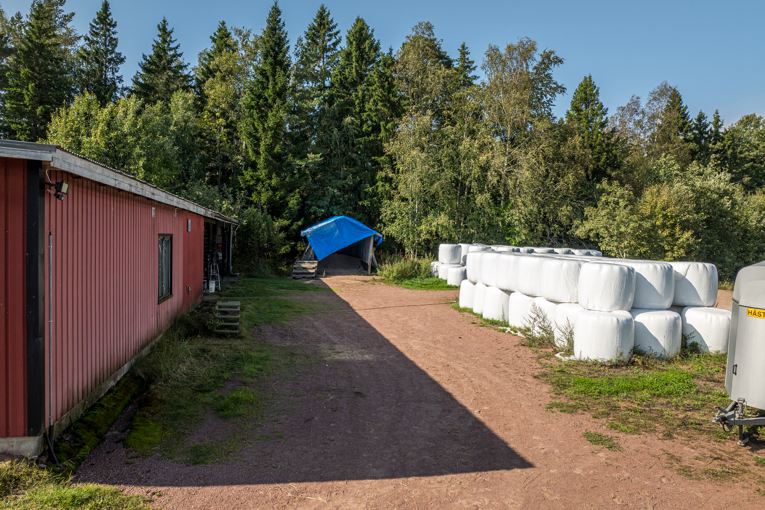 Stallbyggnaden innehåller även ett stort torkrum, två påselningsplatser under tak, ett rymligt foderförråd för smidig hantering samt en verkstad/garagedel som har en egen port in från stallplan. Utanför stallet finns en gjuten gödselplatta och ett spånförråd som rymmer ca 40 kubik. Vidare finns även en högklassig ridbana (25m x 60m) med belysning samt en skrittmaskin för fyra hästar.