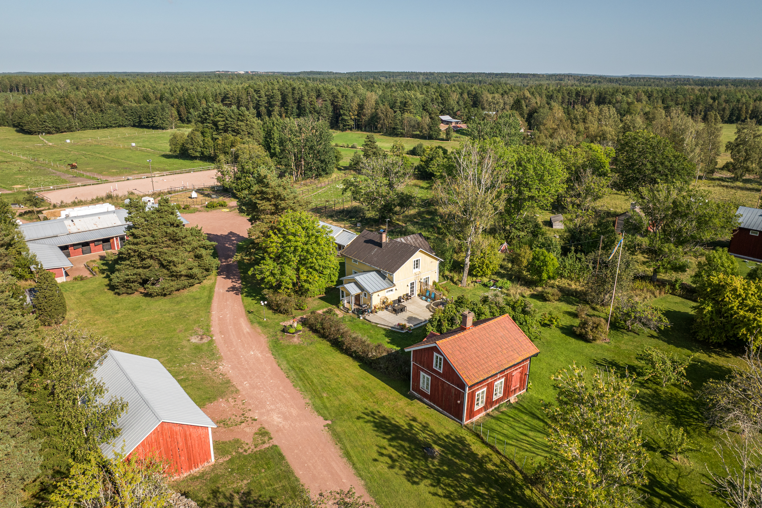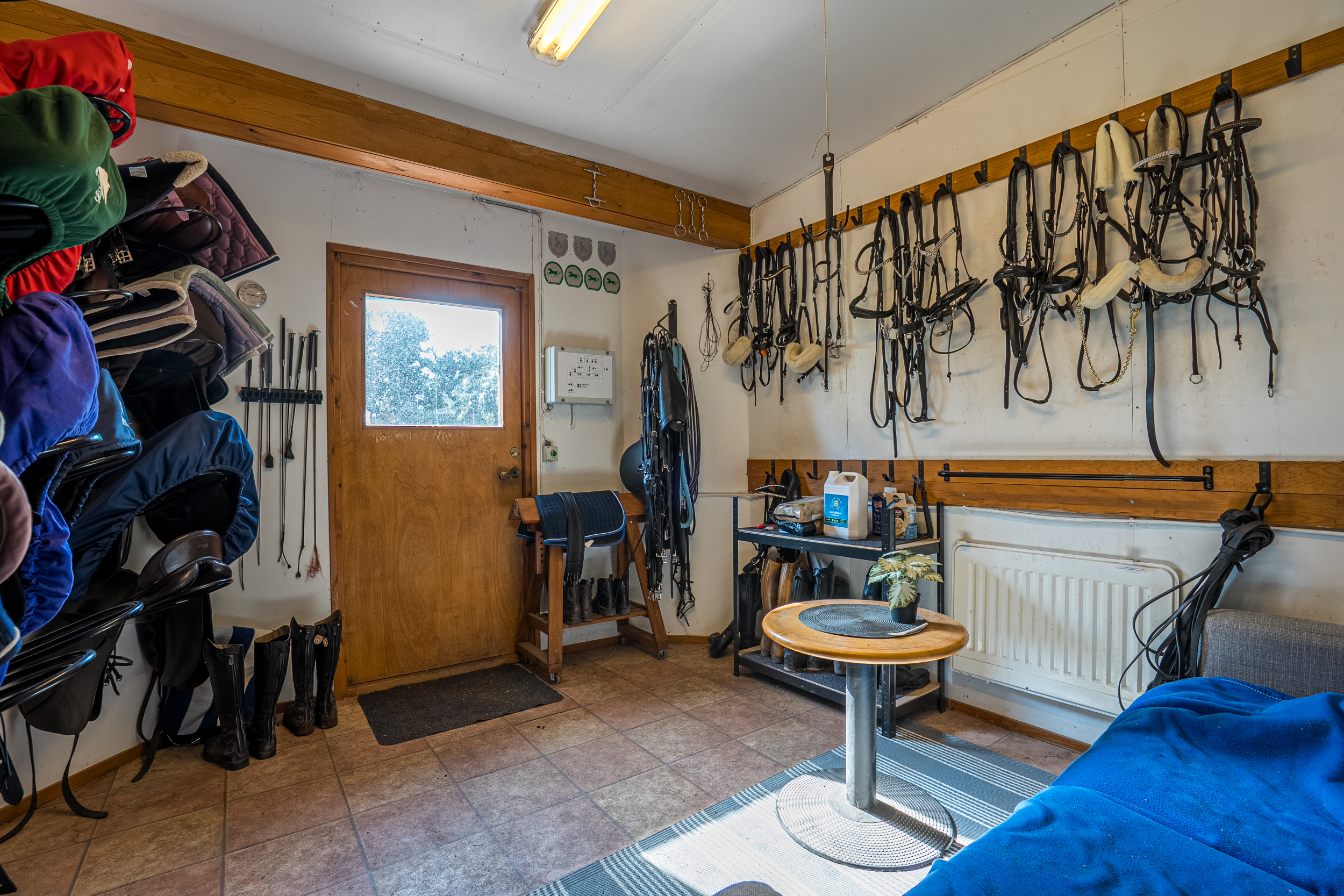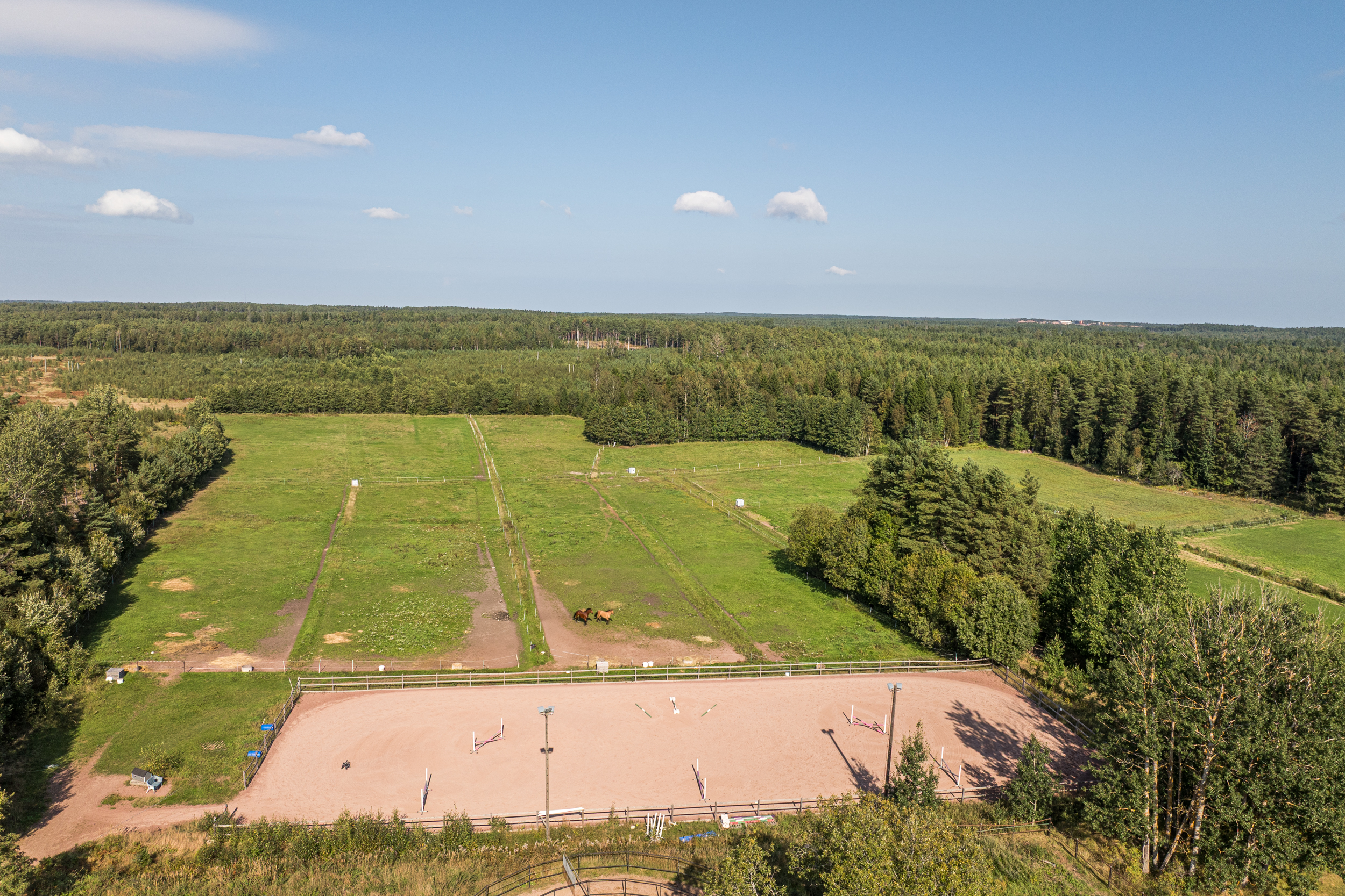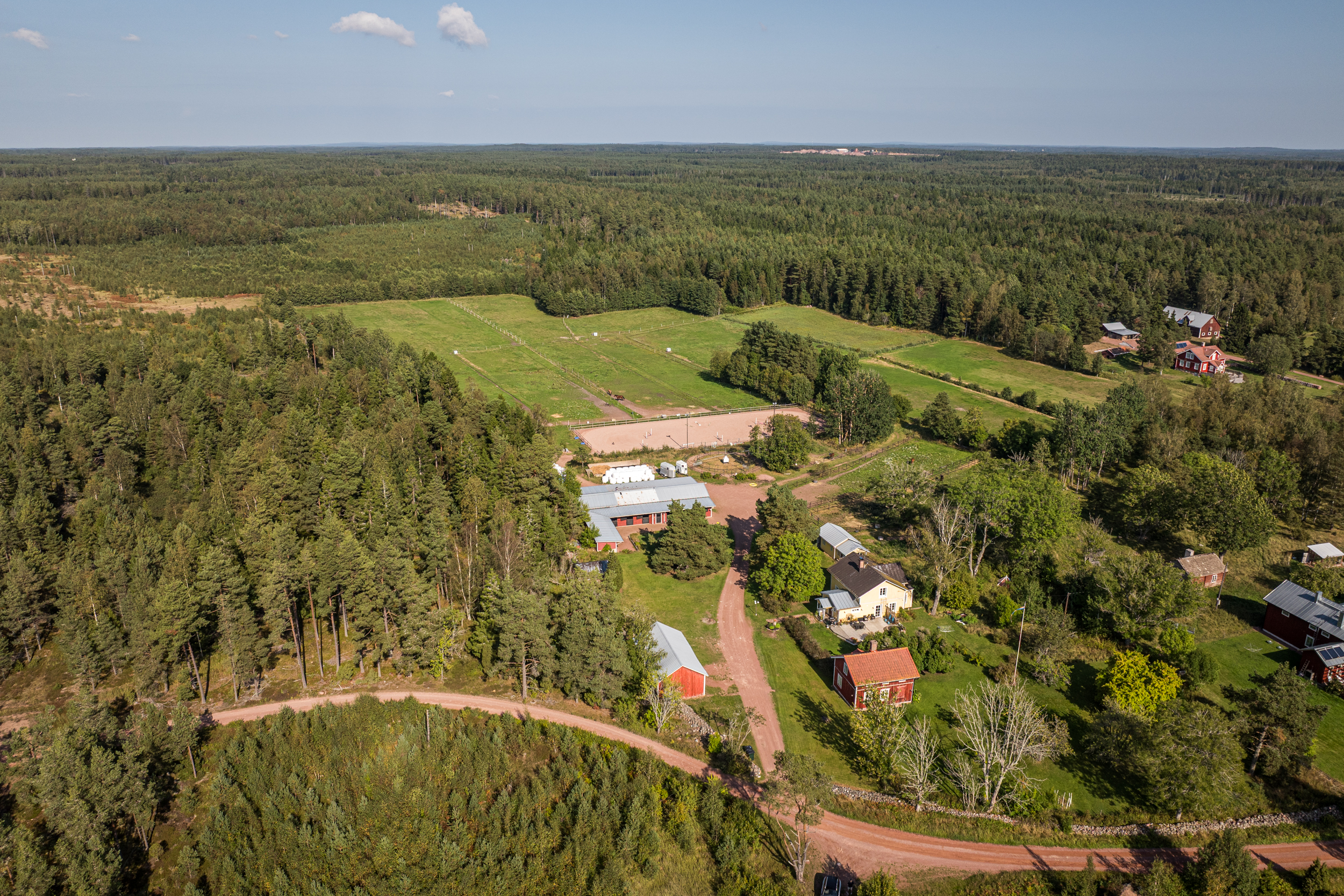 Stallbyggnaden innehåller även ett stort torkrum, två påselningsplatser under tak, ett rymligt foderförråd för smidig hantering samt en verkstad/garagedel som har en egen port in från stallplan. Utanför stallet finns en gjuten gödselplatta och ett spånförråd som rymmer ca 40 kubik. Vidare finns även en högklassig ridbana (25m x 60m) med belysning samt en skrittmaskin för fyra hästar.