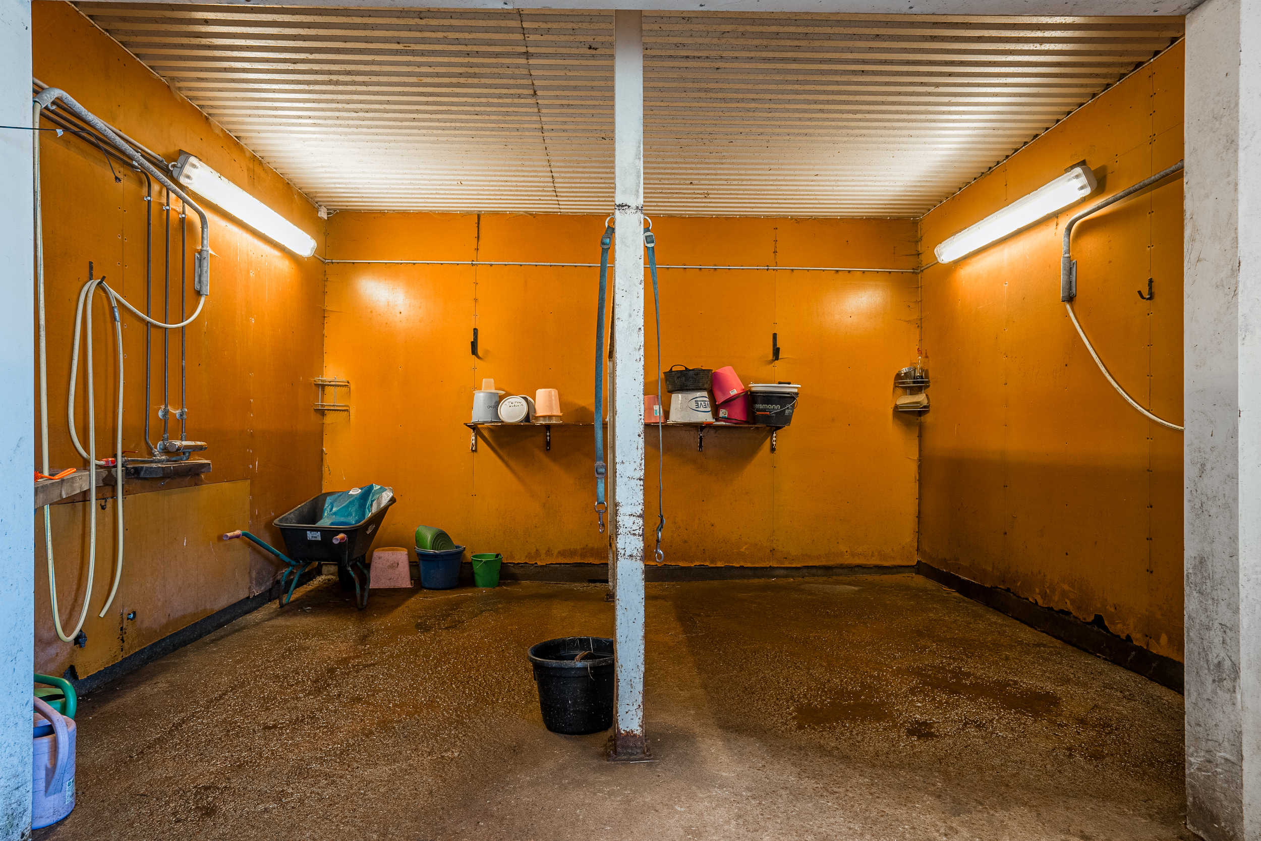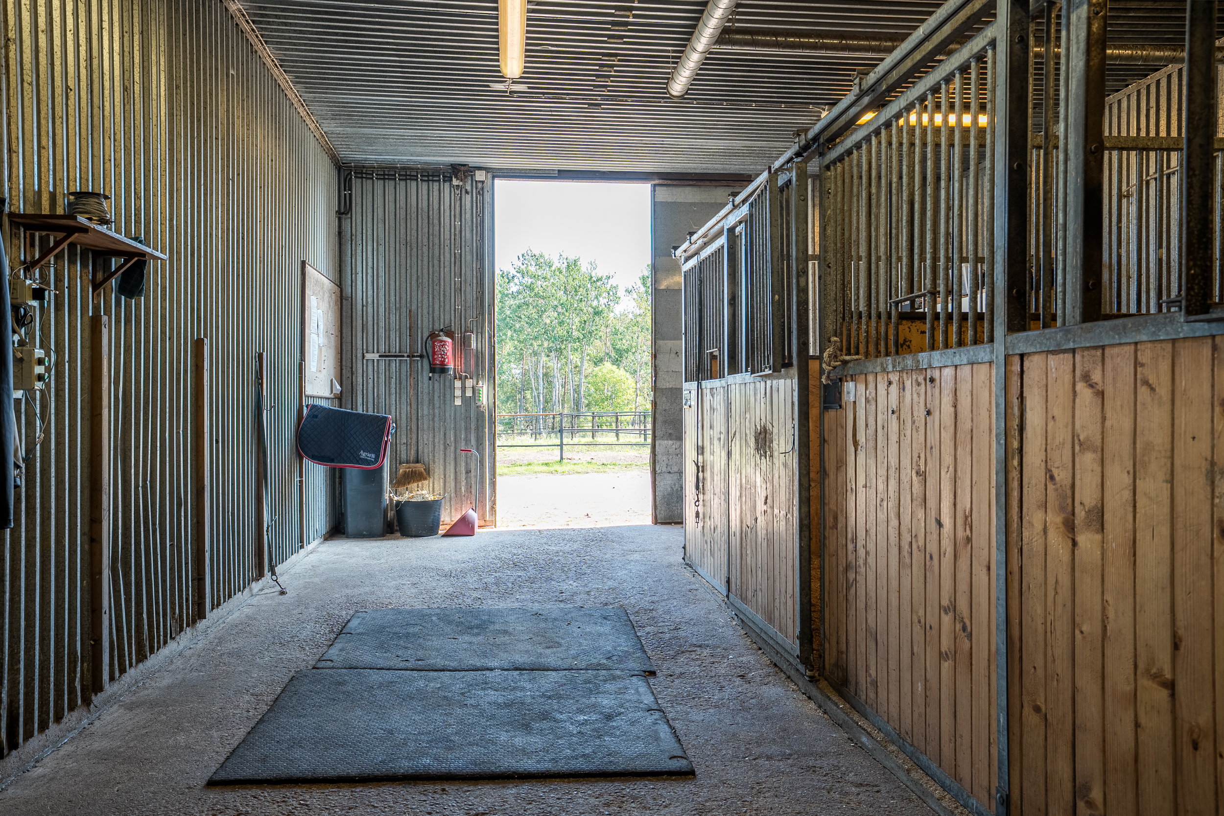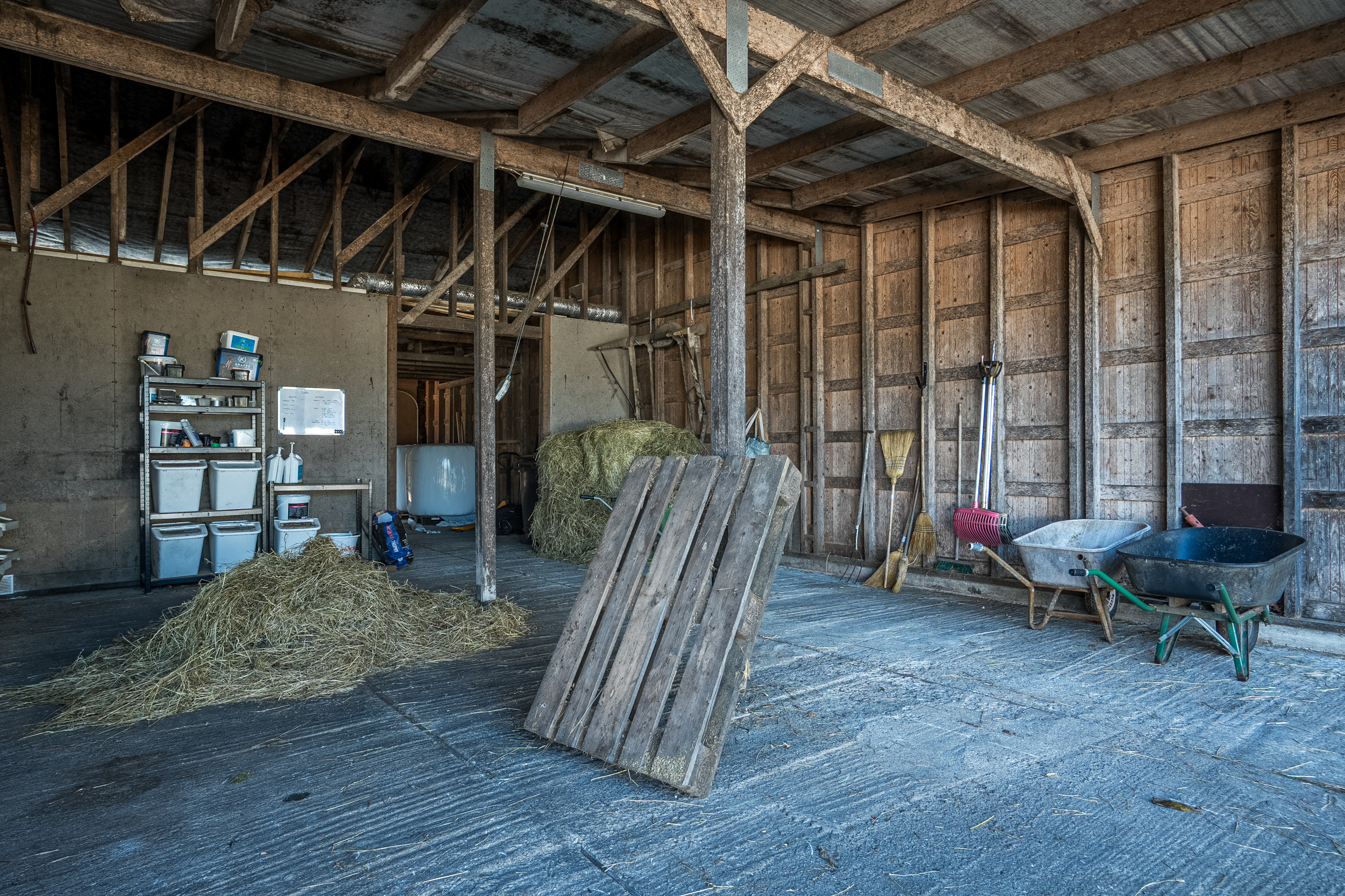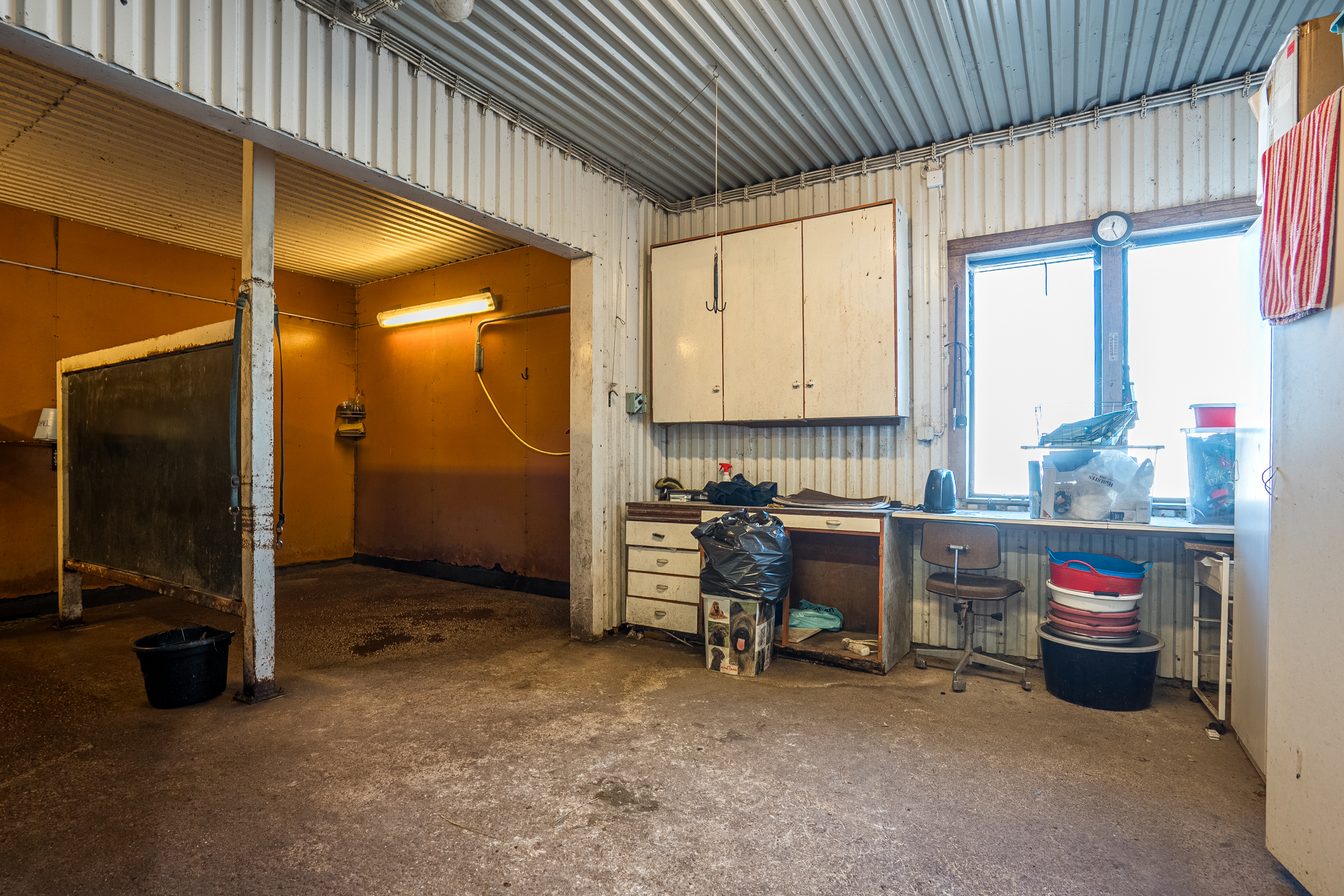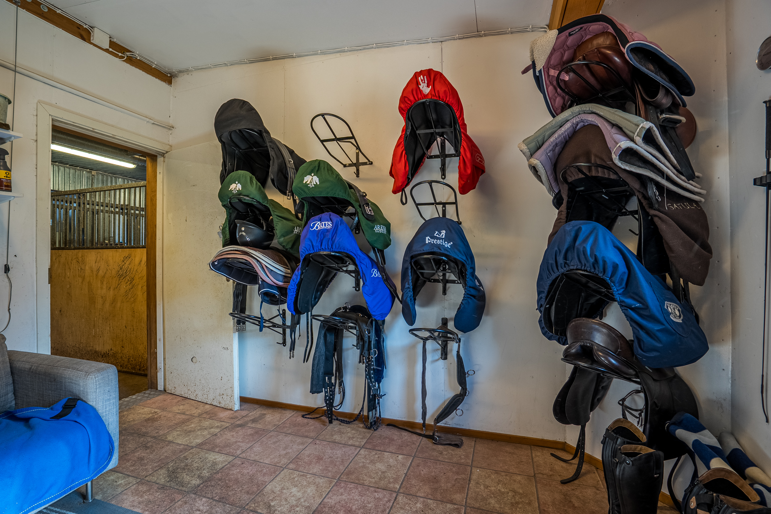 Stallbyggnaden innehåller även ett stort torkrum, två påselningsplatser under tak, ett rymligt foderförråd för smidig hantering samt en verkstad/garagedel som har en egen port in från stallplan. Utanför stallet finns en gjuten gödselplatta och ett spånförråd som rymmer ca 40 kubik. Vidare finns även en högklassig ridbana (25m x 60m) med belysning samt en skrittmaskin för fyra hästar.