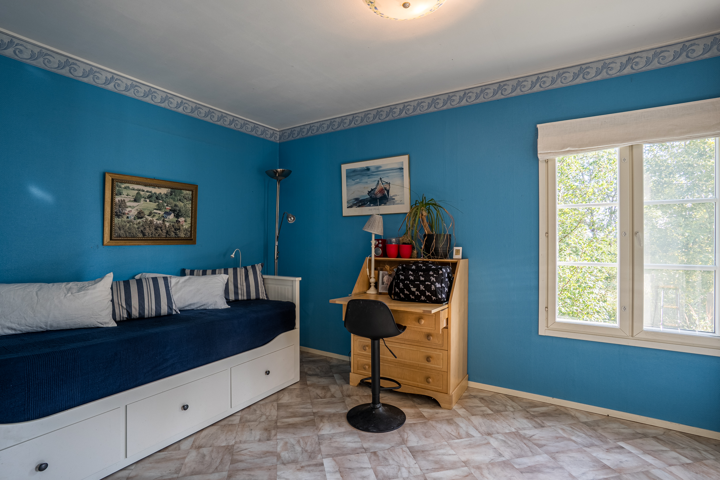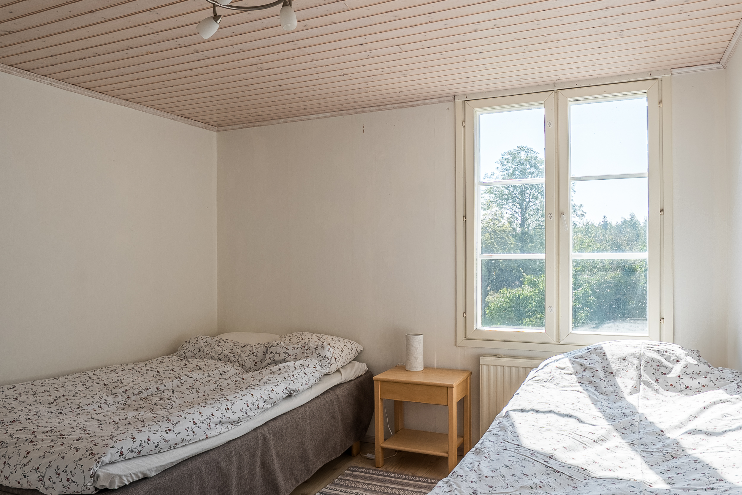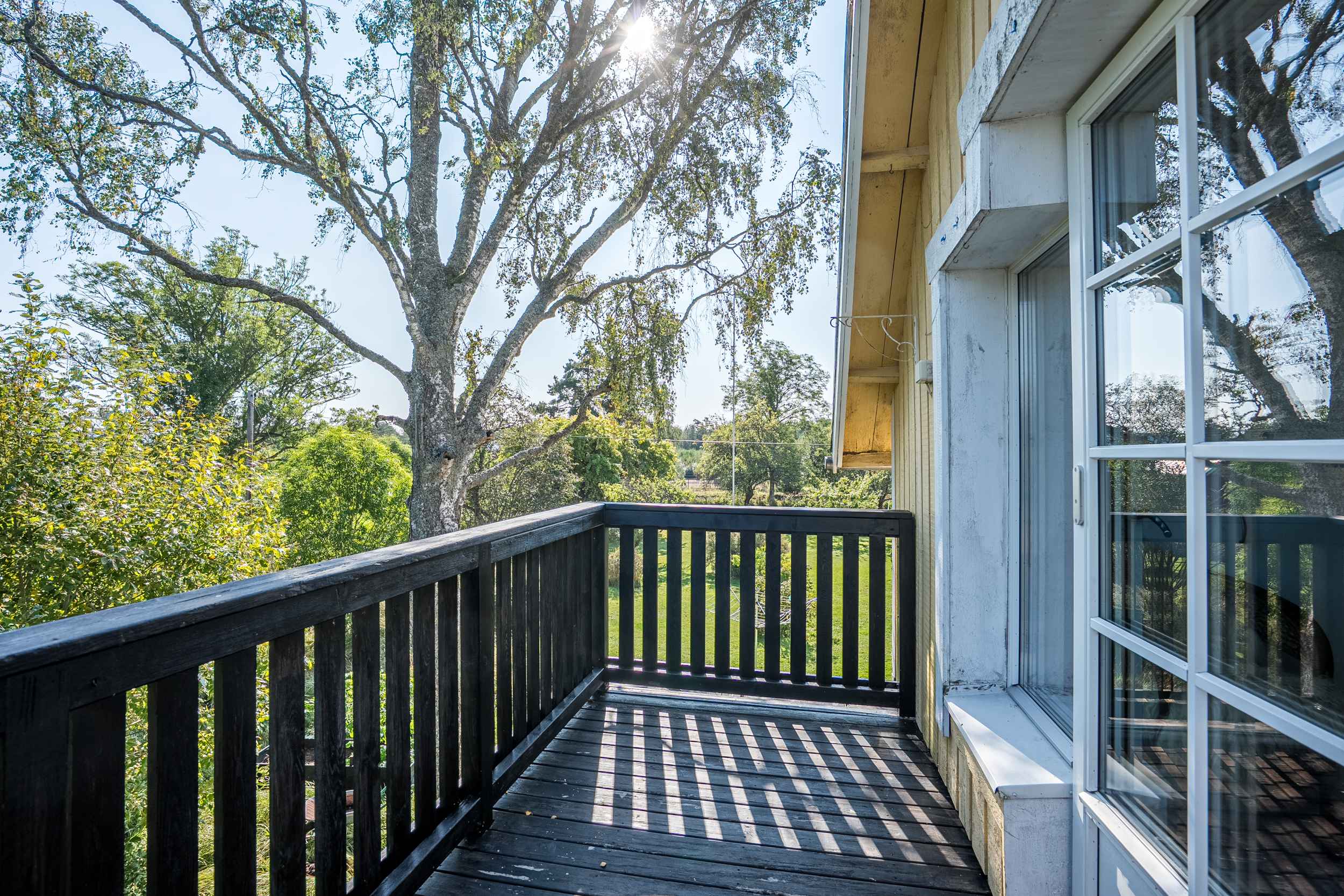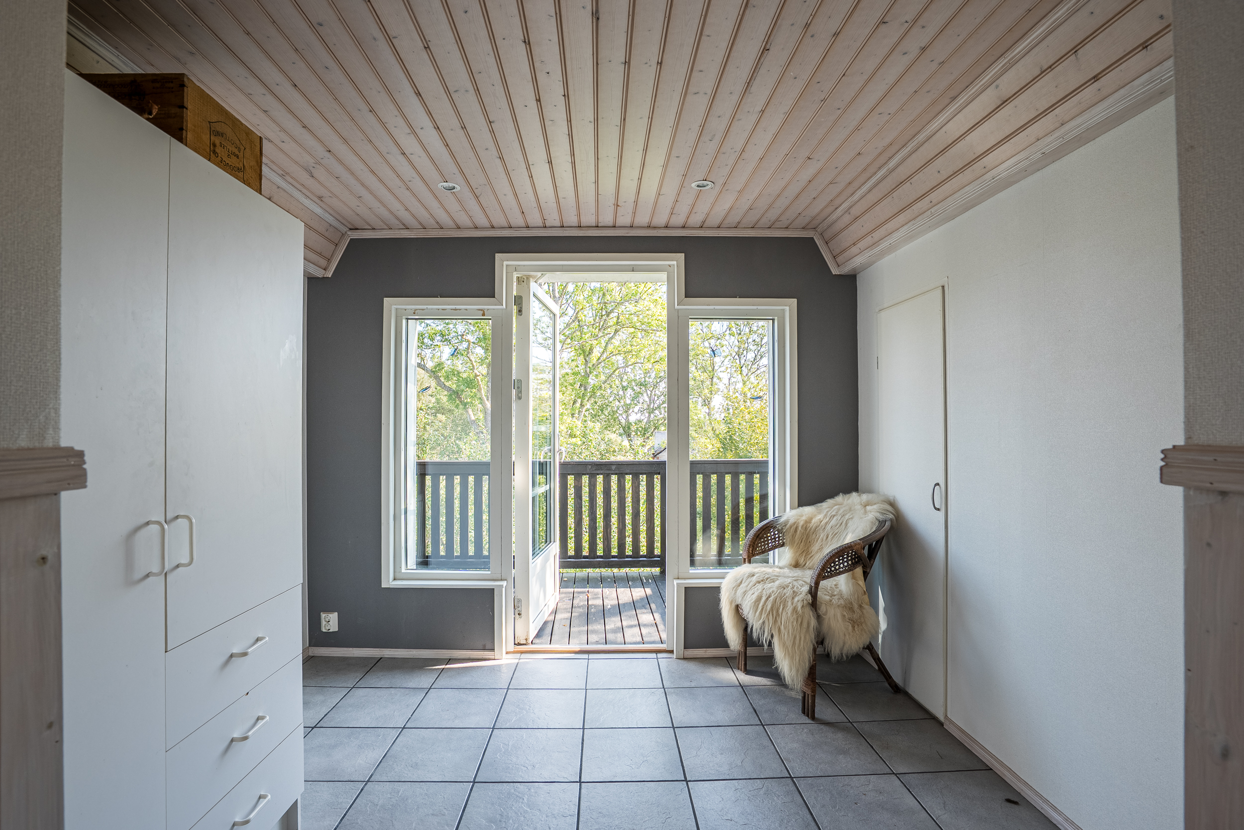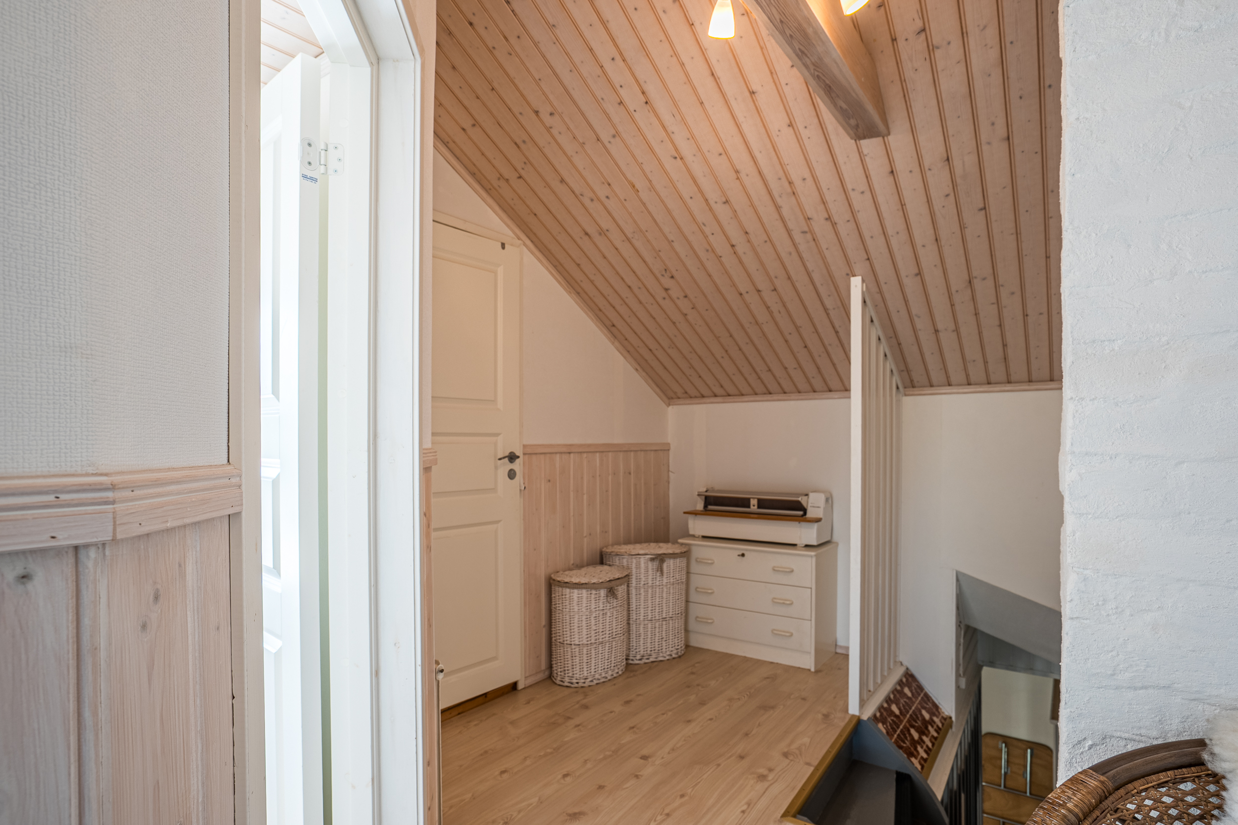 På andra våningen möts man av en ljus hall med god förvaring och dörr ut till balkongen. Förutom de två rymliga sovrummen finns det flera praktiska förråd samt ett helkaklat badrum med dusch och kommod som renoverades år 2013.
