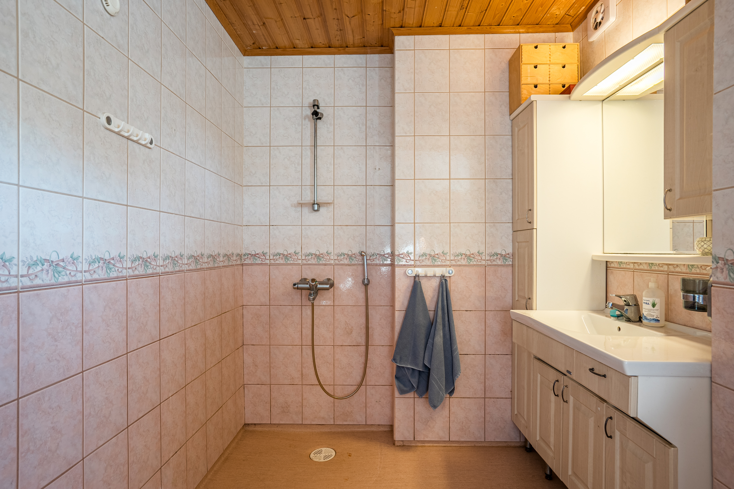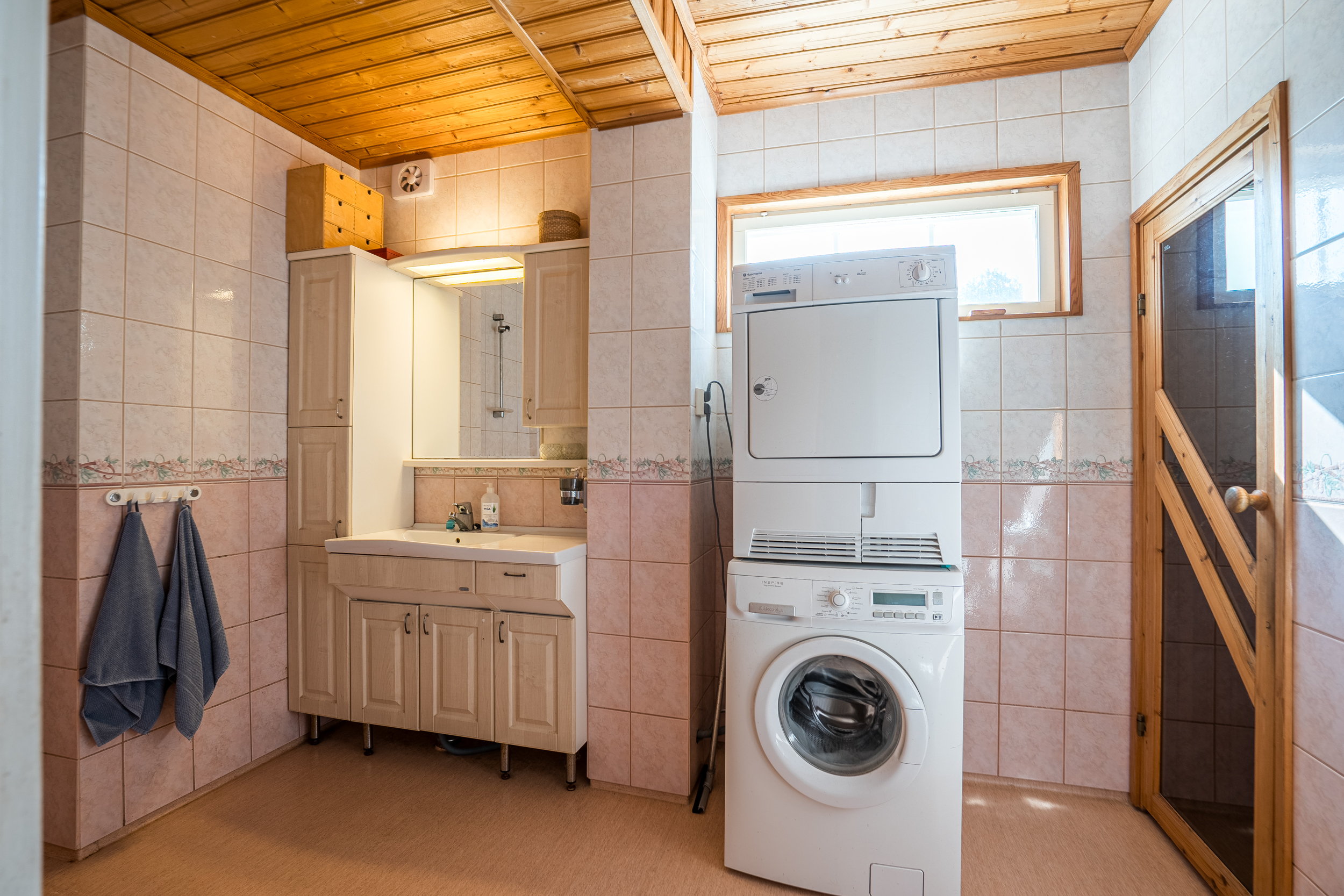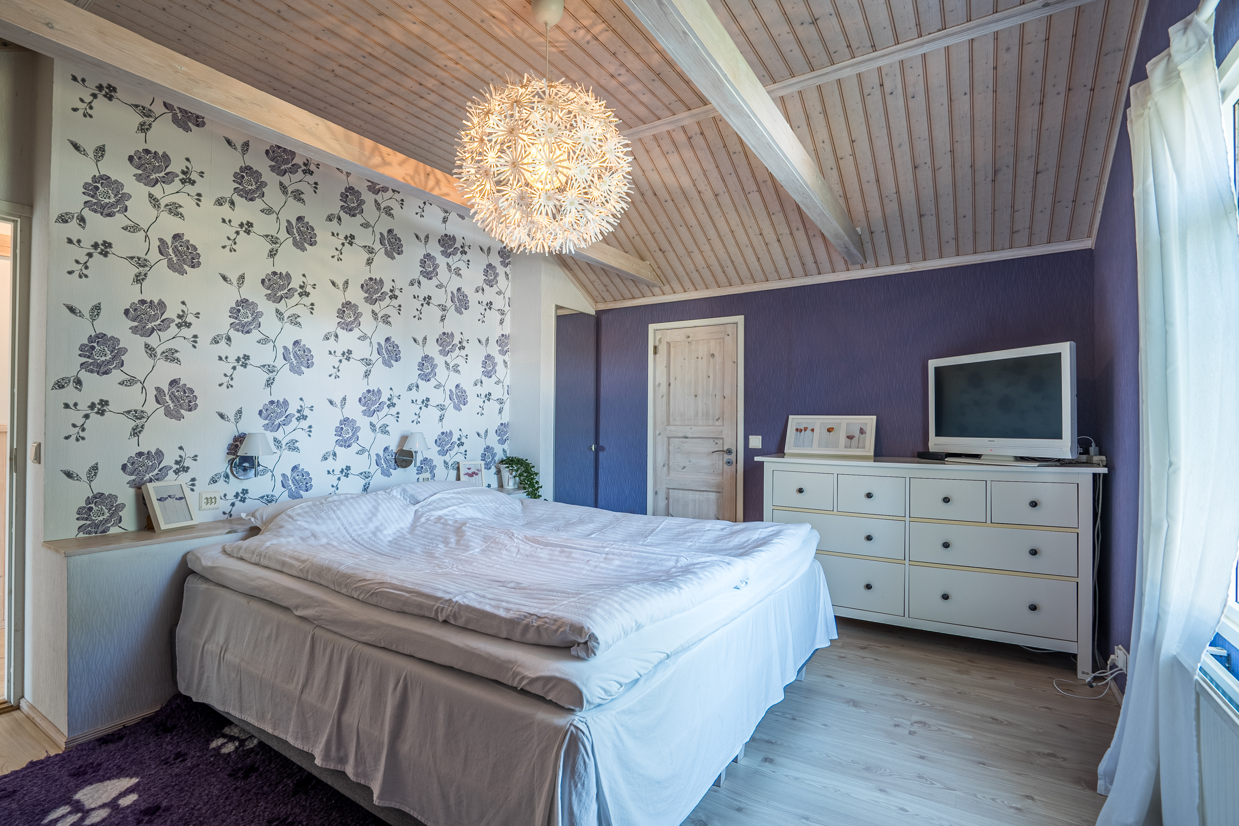Uppvärmning: Bergvärmepump, el-golvvärme i övre badrum, eldstad. (Den gamla kombipannan finns kvar men brukas ej)