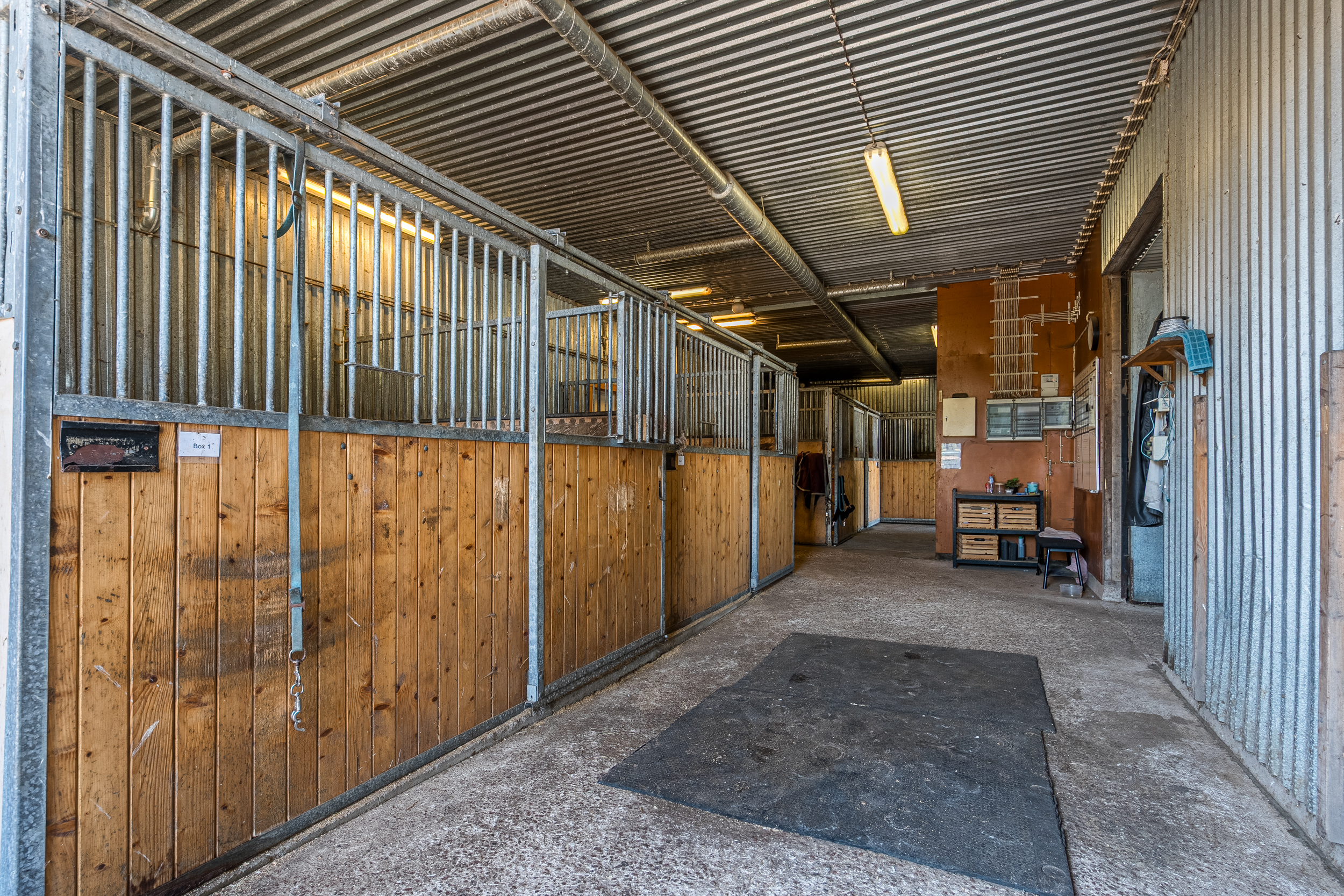 Stallbyggnaden byggdes om 2005-2006 och har innan det använts som grönskslager, är således väl isolerat med högt till tak. Det inrymmer 9 ute- och 5 inneboxar(varav 2 är i större storlek, fölboxar), totalt 14 boxar. Byggnaden har automatisk ventilation och vattenkoppar med cirkulationspump och elslinga. Intill inneboxarna finns två praktiska vattenspiltor med varm och kallvatten samt en uppvärmd sadelkammare som nås både från gården vid uteboxarna och inifrån stallet.