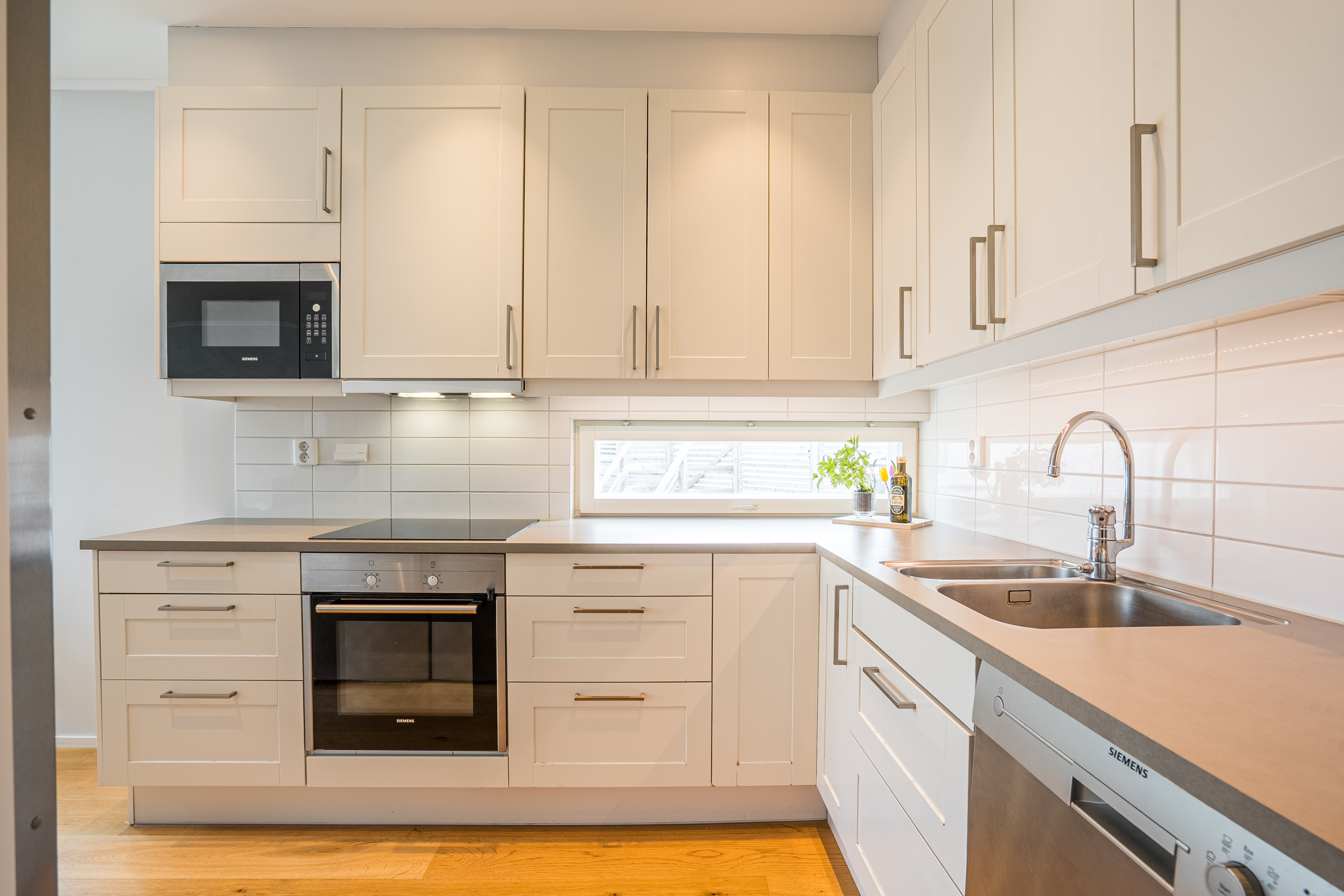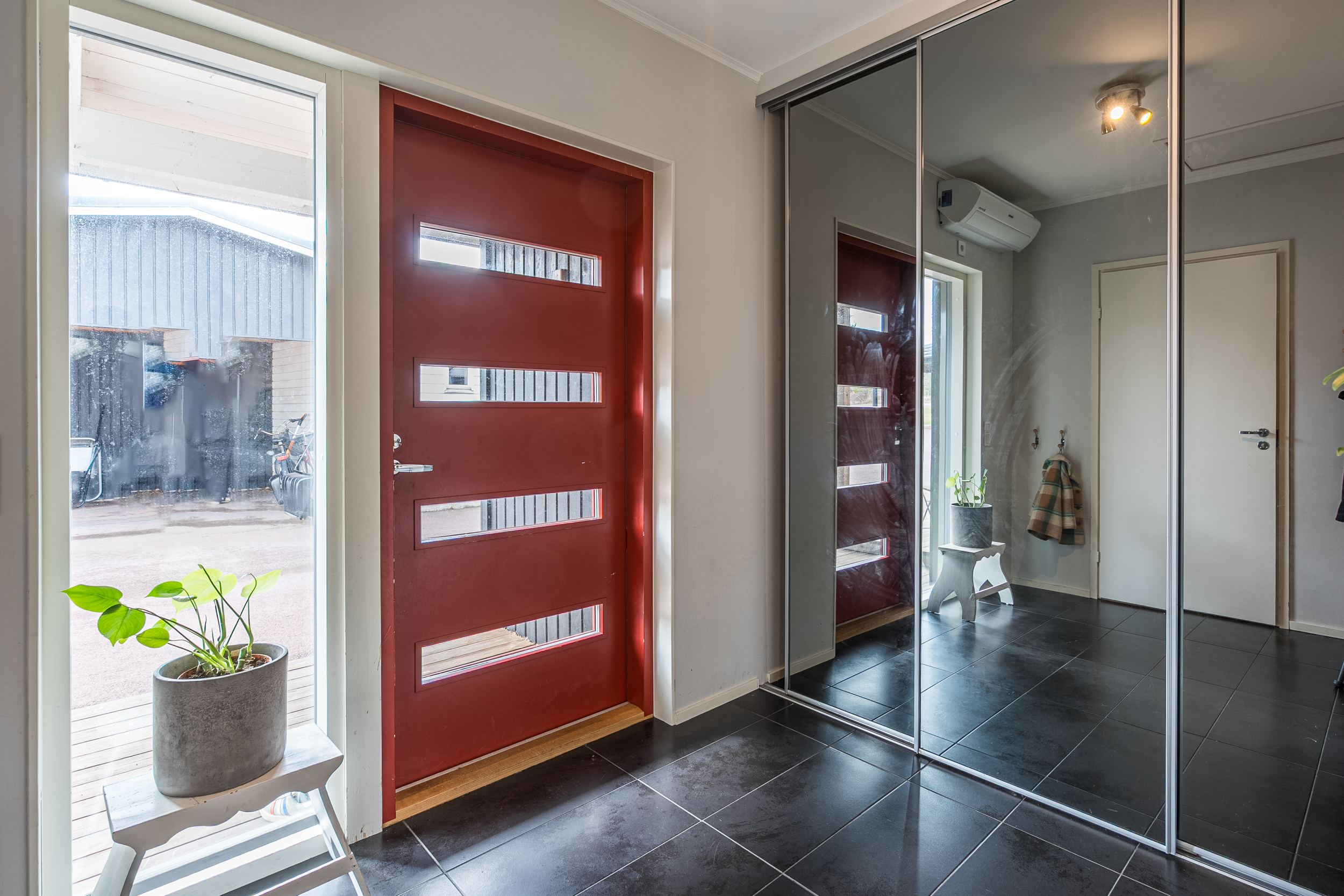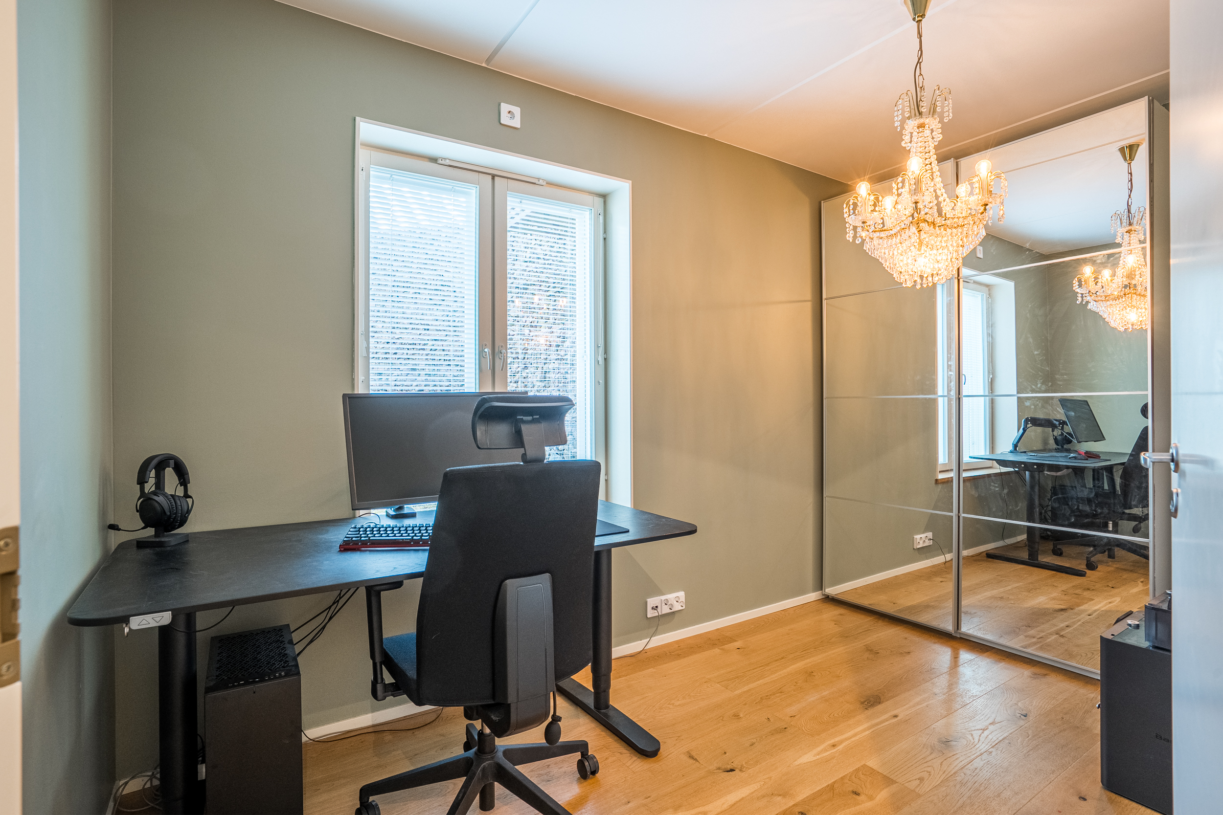 Bostaden håller genomgående en modern och enhetlig standard med slitstarka materialval och väl avvägda ytskikt. De stora fönsterpartierna bidrar till ett genomgående gott ljusinsläpp, och samtliga större fönster är försedda med persienner.