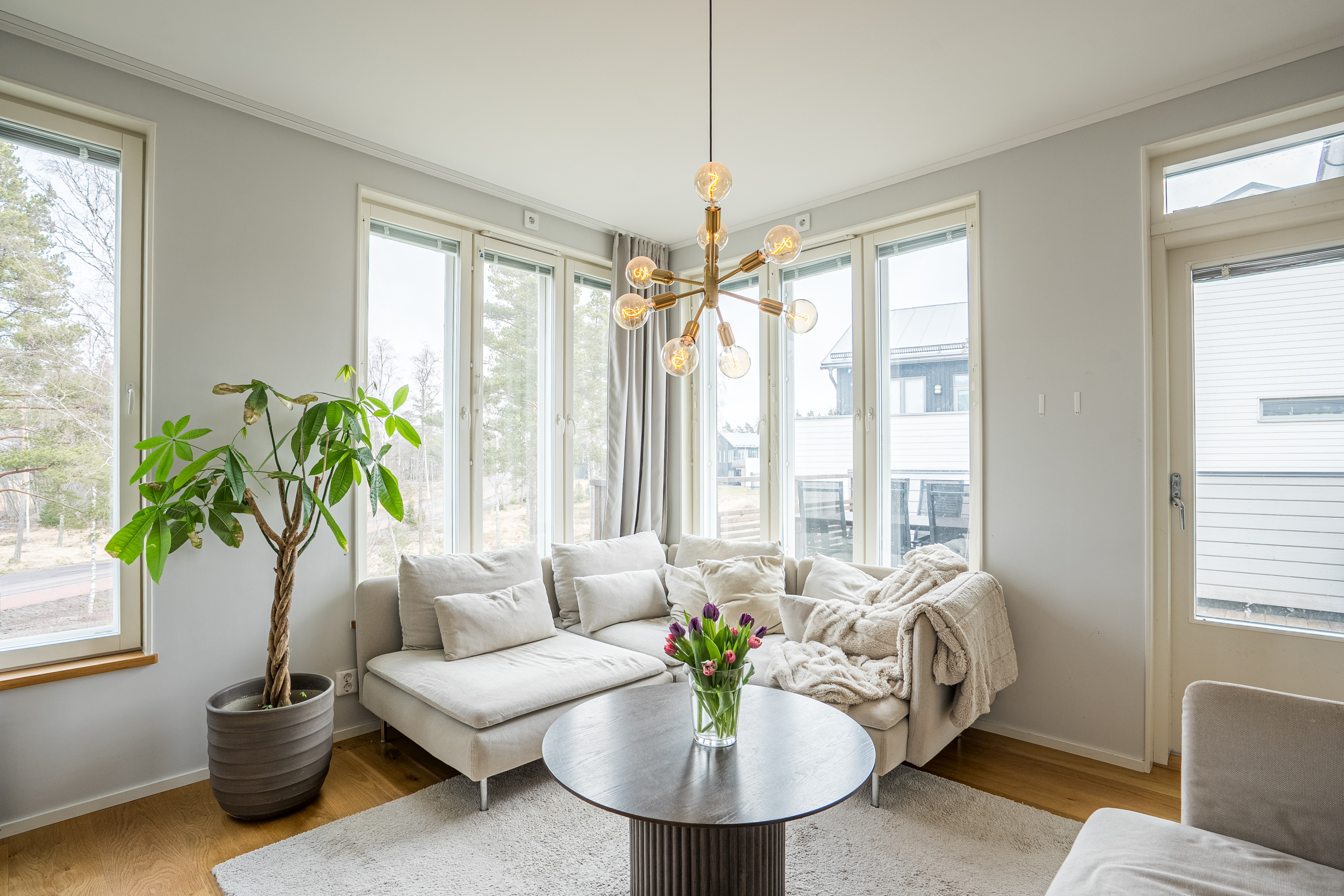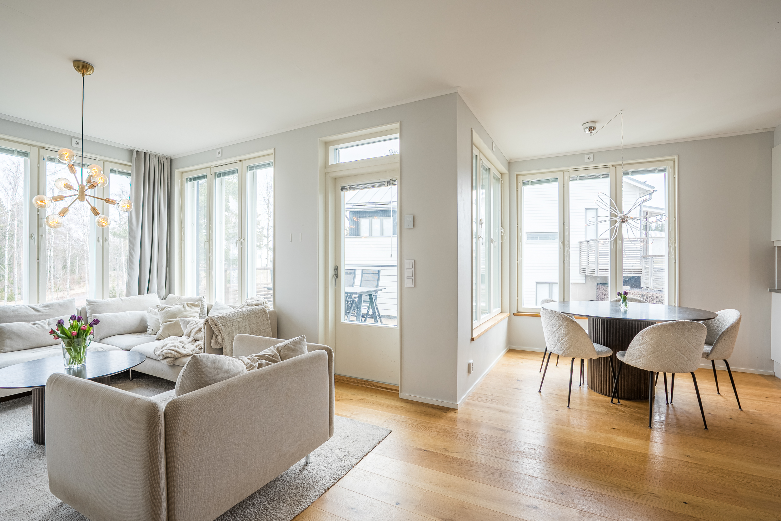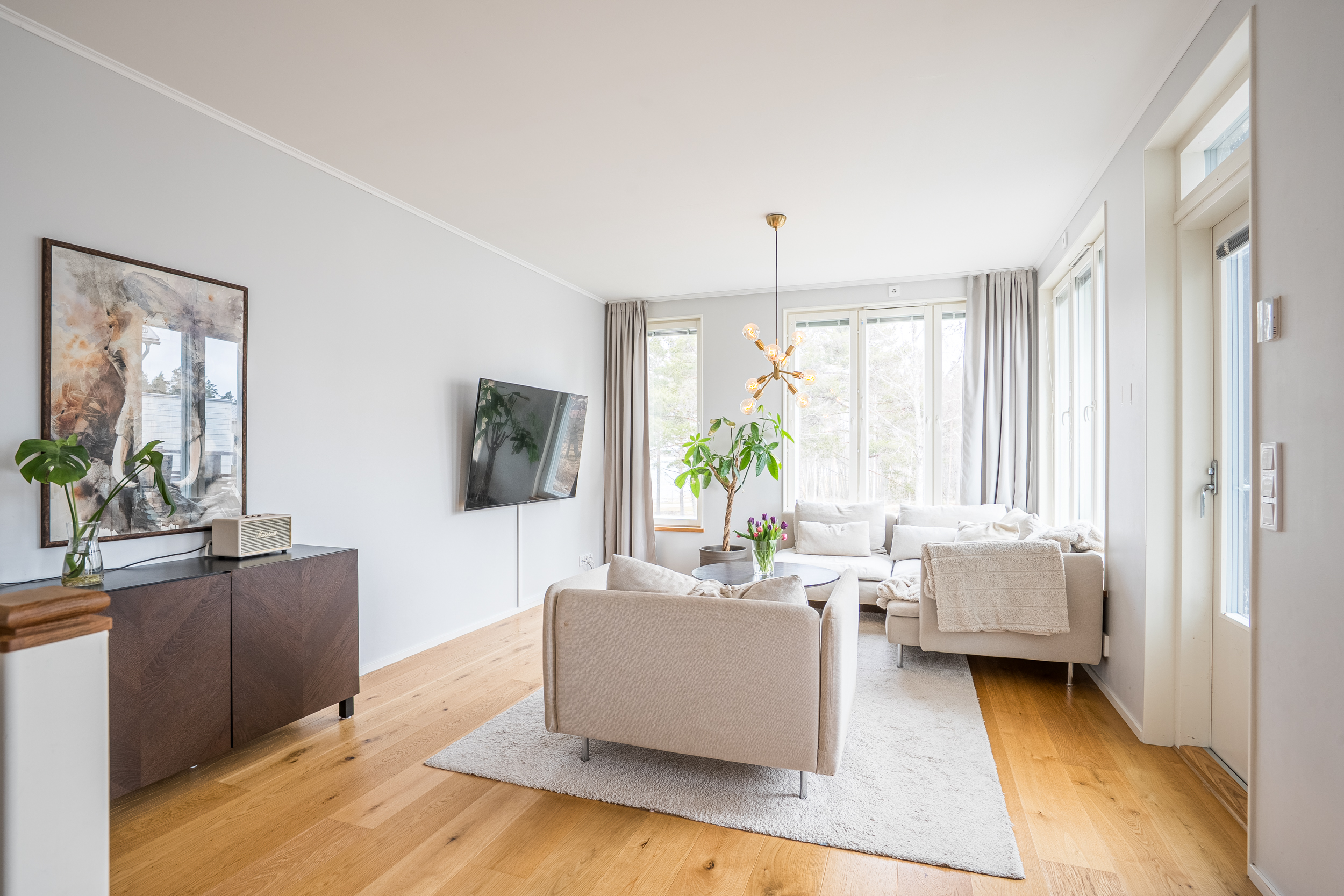 Bostadens övre plan präglas av generösa sociala utrymmen där vardagsrummet utgör en naturlig samlingspunkt. Stora fönsterpartier ger ett rikligt ljusinsläpp och erbjuder en tilltalande utblick mot angränsande grönområde och kommunens badstrand. Härifrån nås även en rymlig balkong som på ett naturligt sätt förlänger bostadens sociala ytor under årets varmare månader.