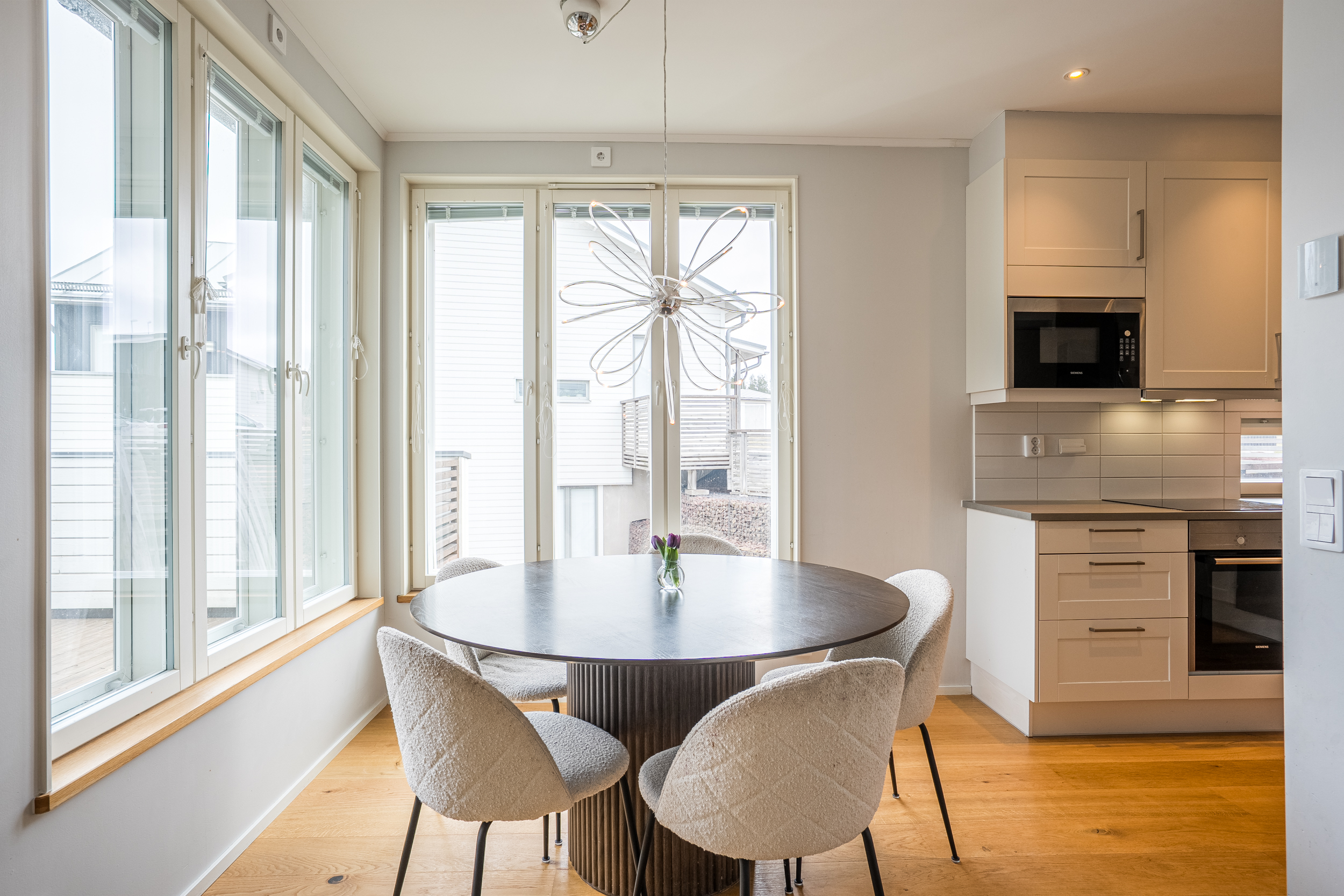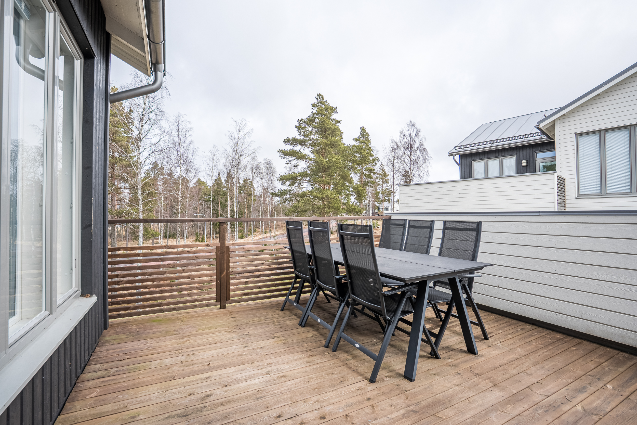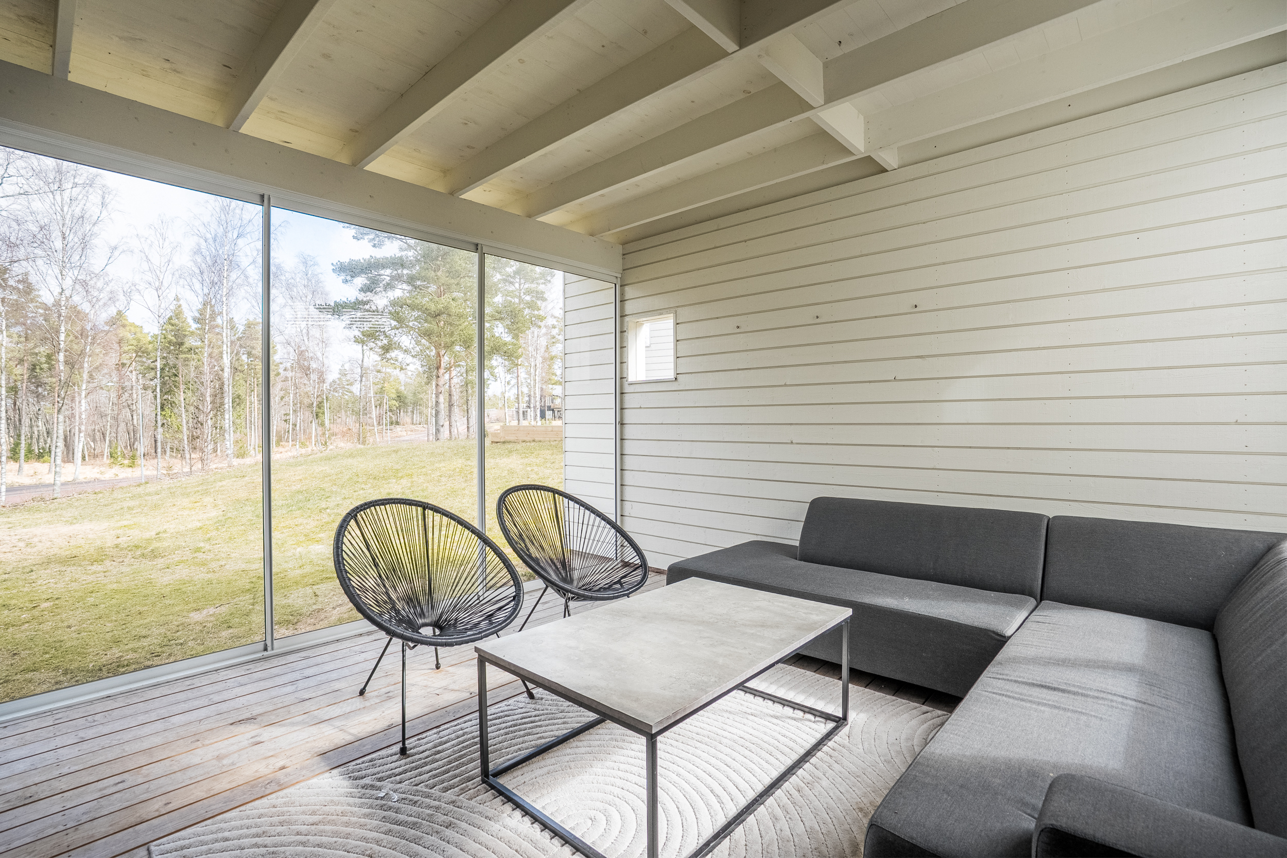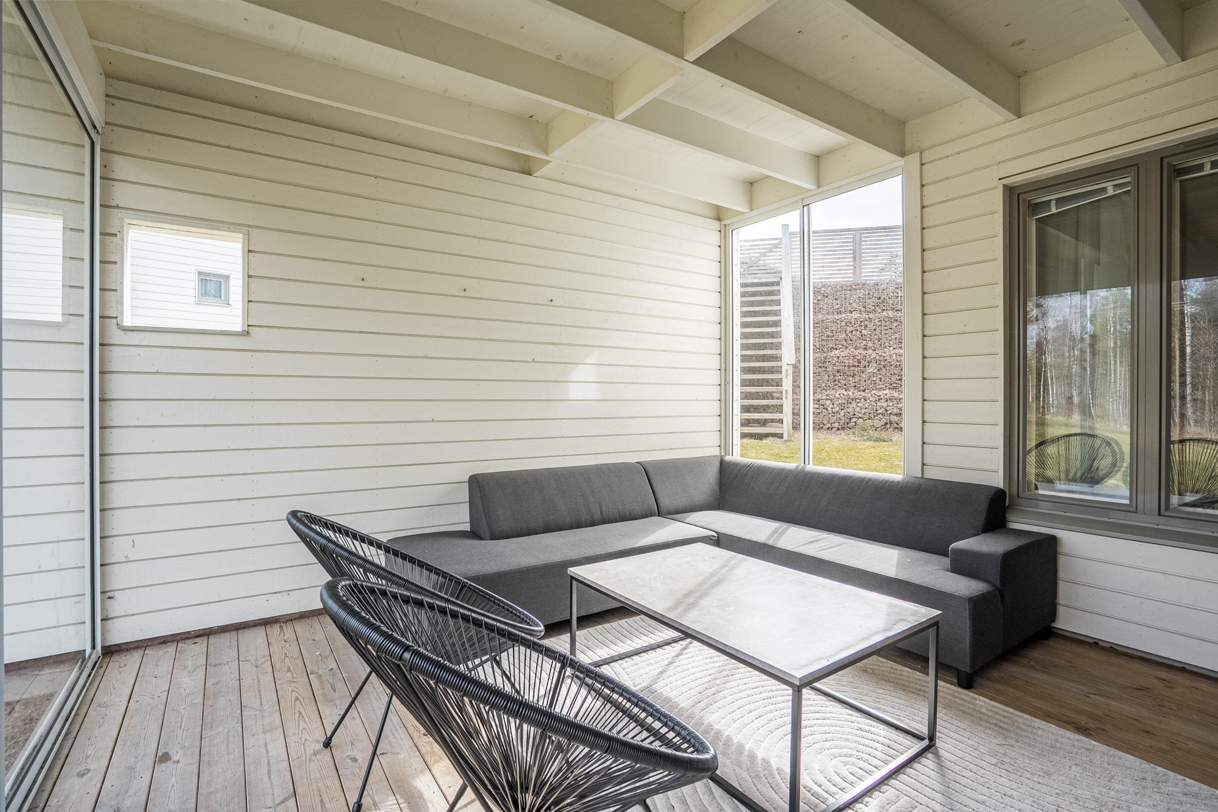 Bostadens övre plan präglas av generösa sociala utrymmen där vardagsrummet utgör en naturlig samlingspunkt. Stora fönsterpartier ger ett rikligt ljusinsläpp och erbjuder en tilltalande utblick mot angränsande grönområde och kommunens badstrand. Härifrån nås även en rymlig balkong som på ett naturligt sätt förlänger bostadens sociala ytor under årets varmare månader.