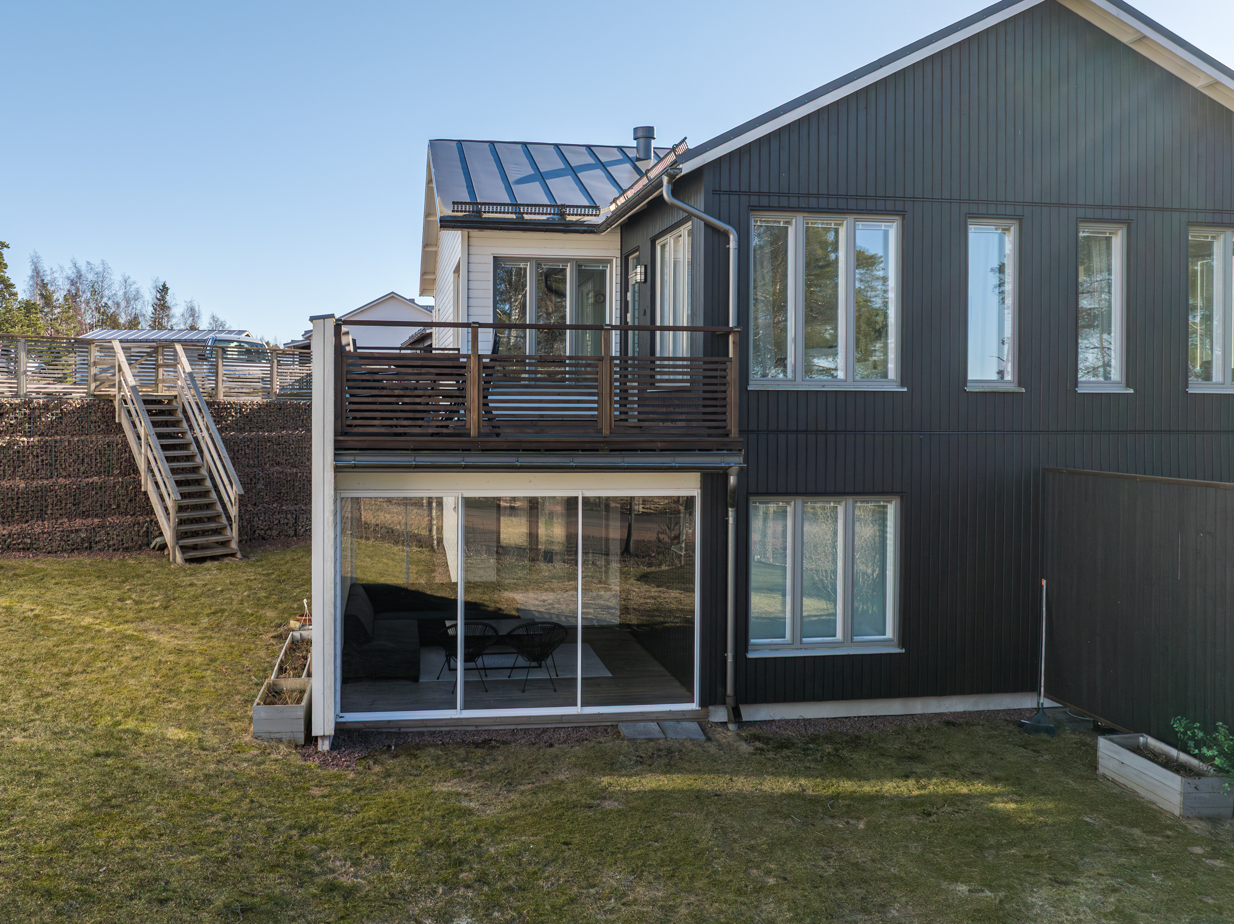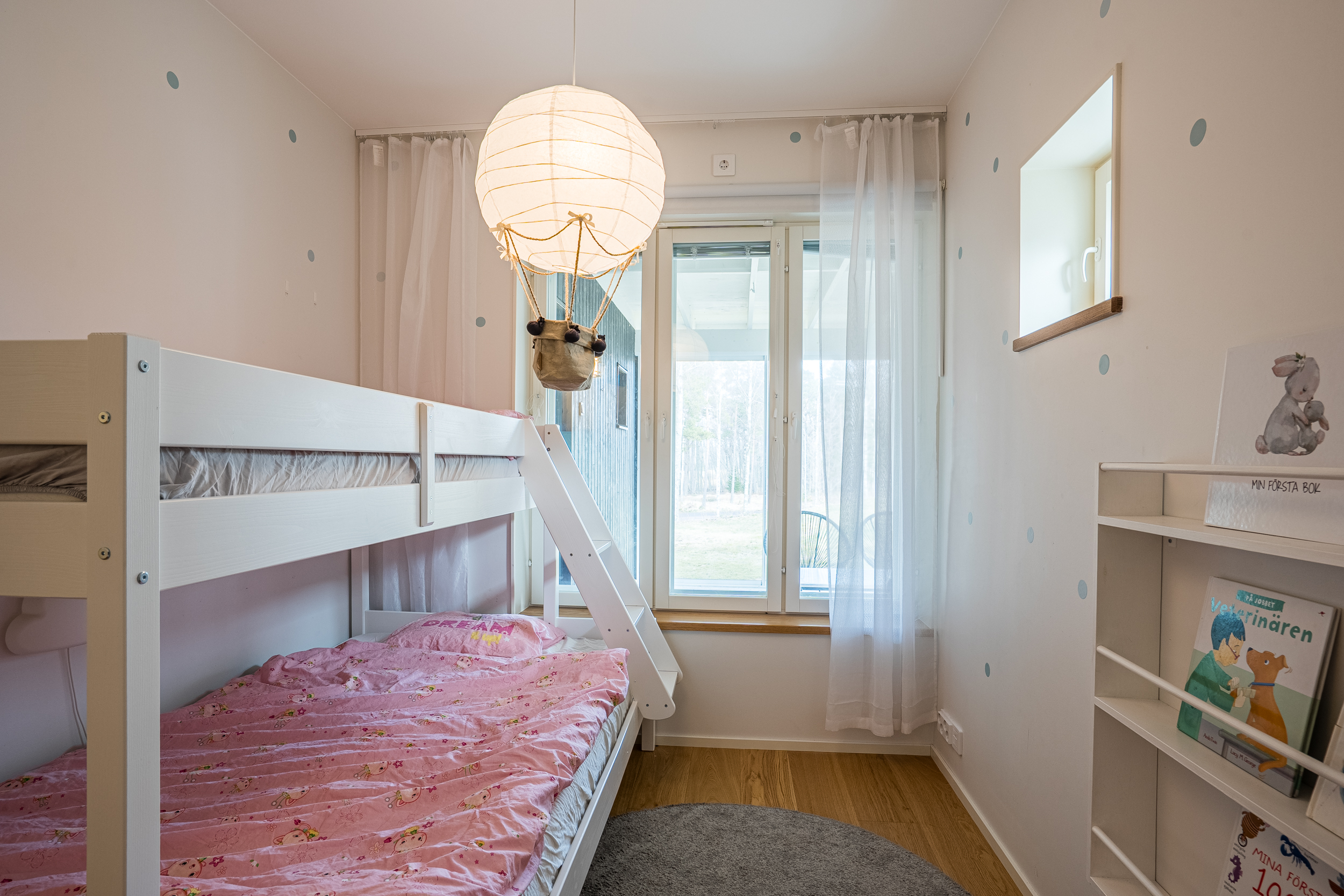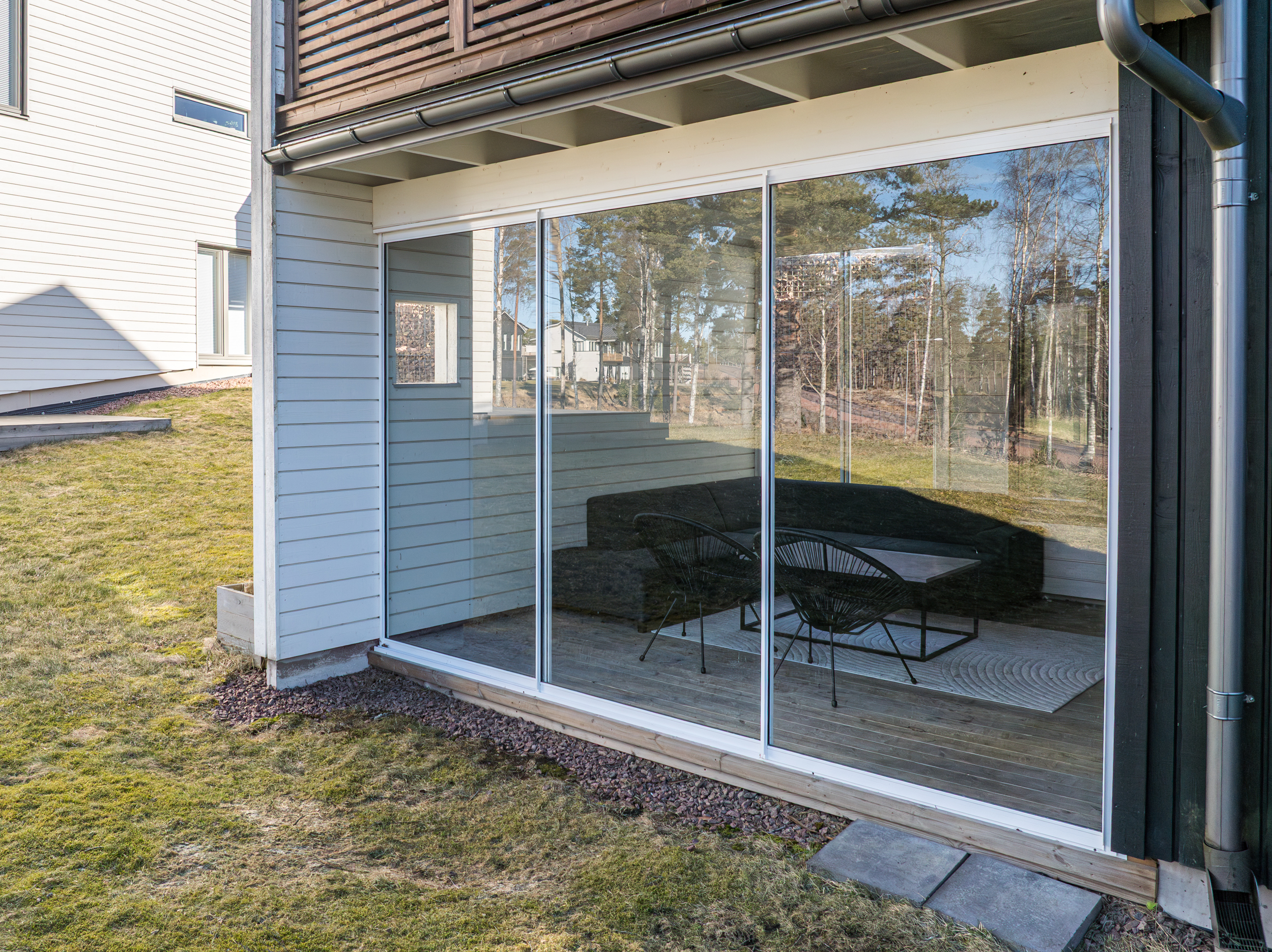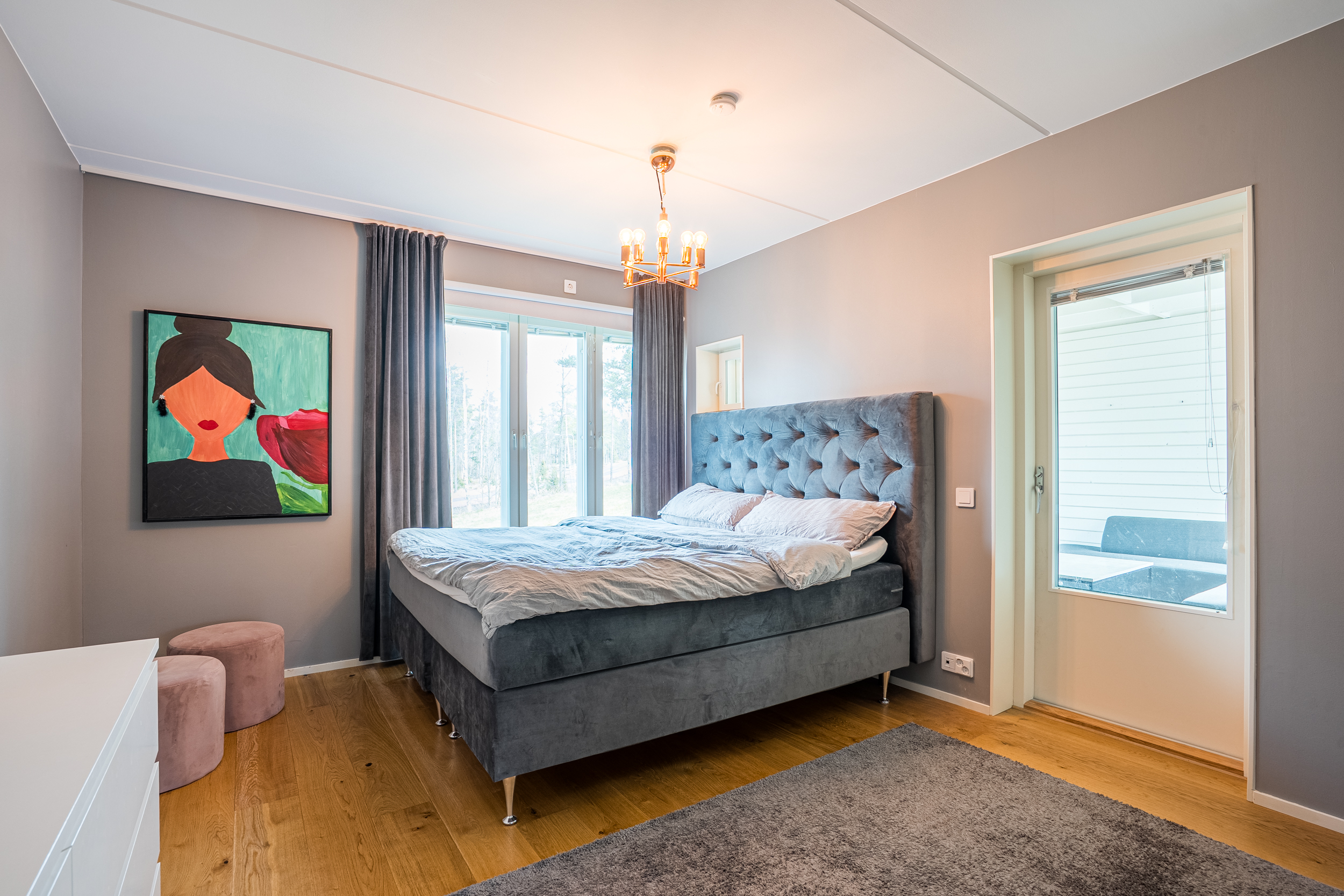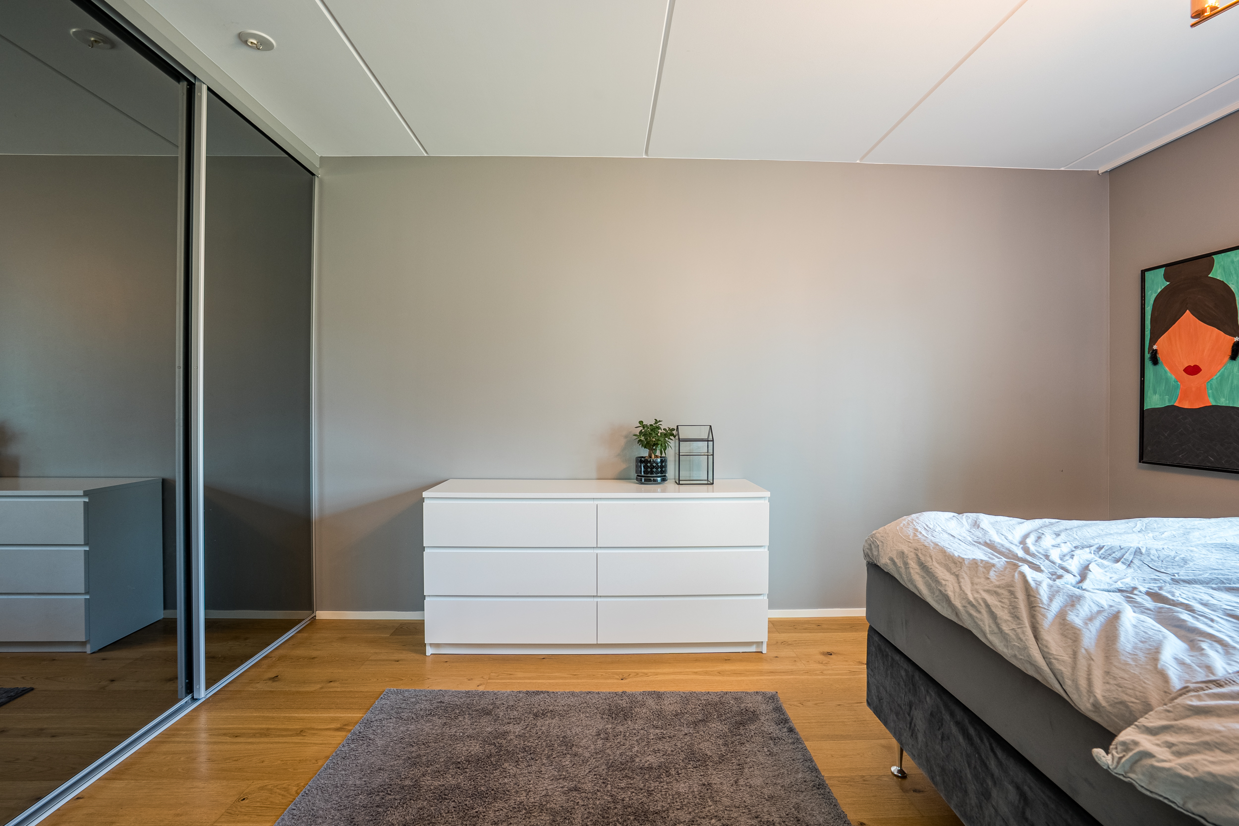 Det nedre planet utgör bostadens mer privata del och inrymmer tre sovrum. Det större sovrummet har direkt utgång till en egen uteplats under tak med anslutande gräsyta, vilket skapar en avskild och skyddad utemiljö i nära anslutning till bostaden. Här erbjuds ett lugnt och privat läge med tydlig koppling mellan inne och ute.