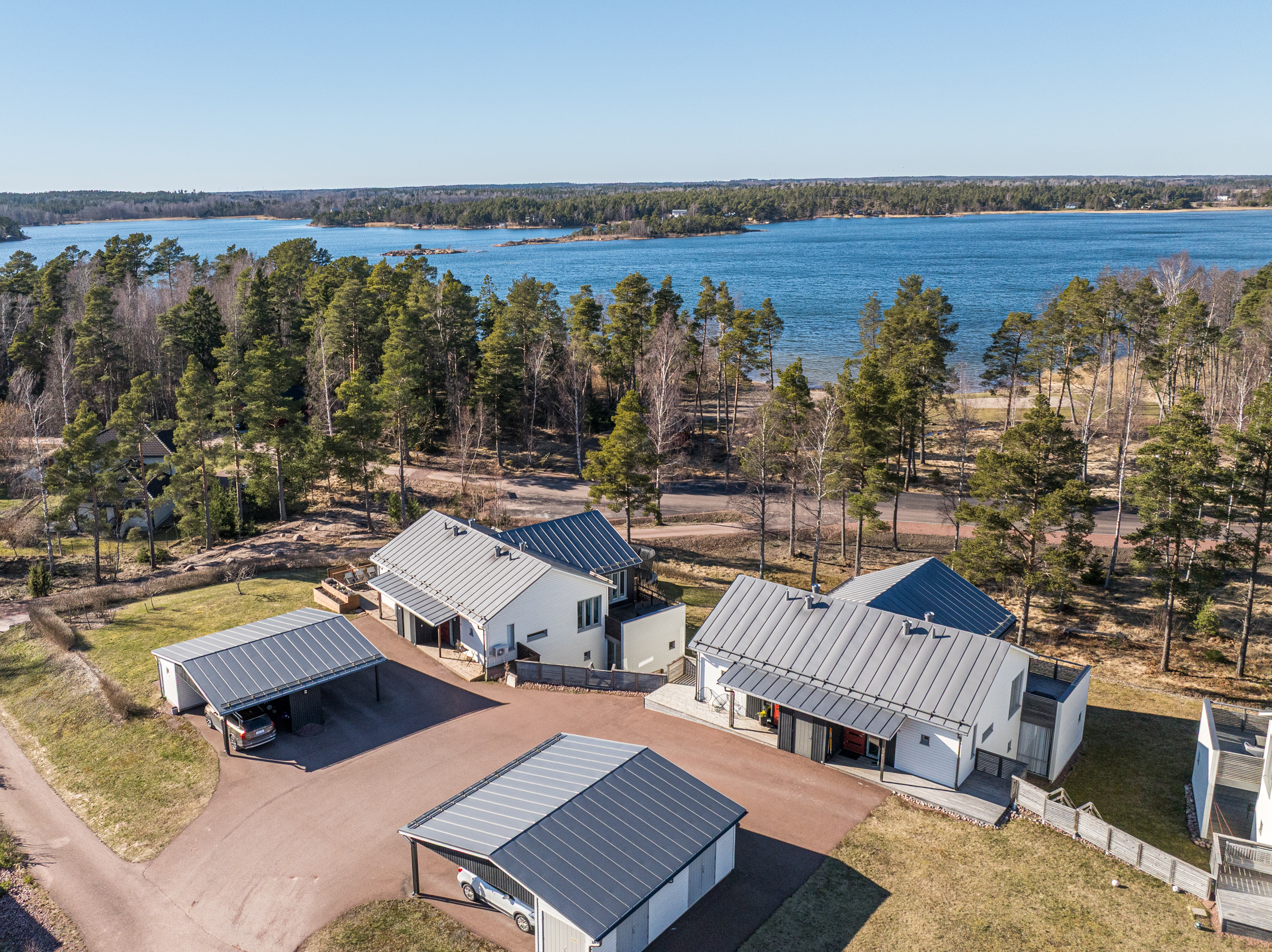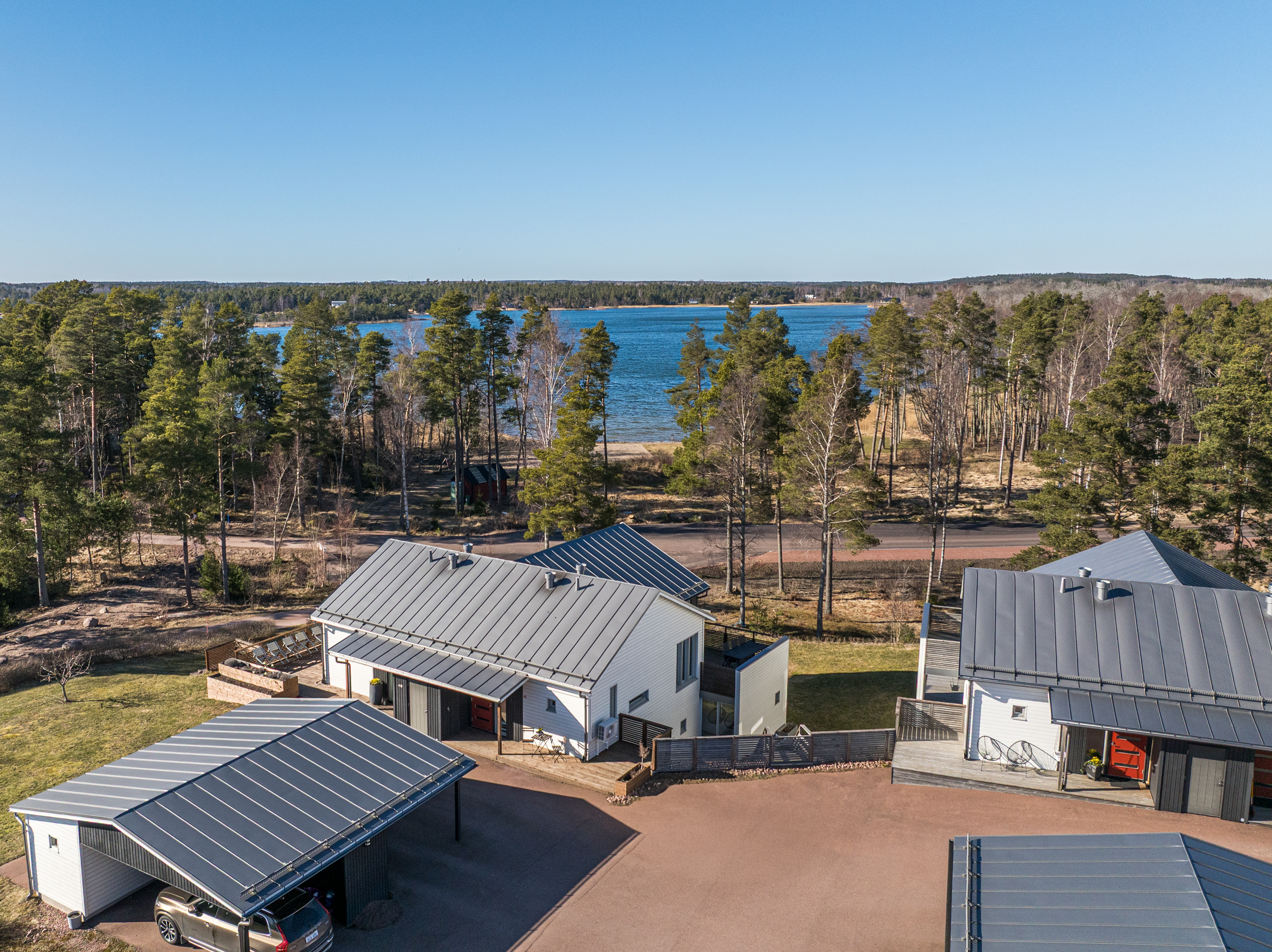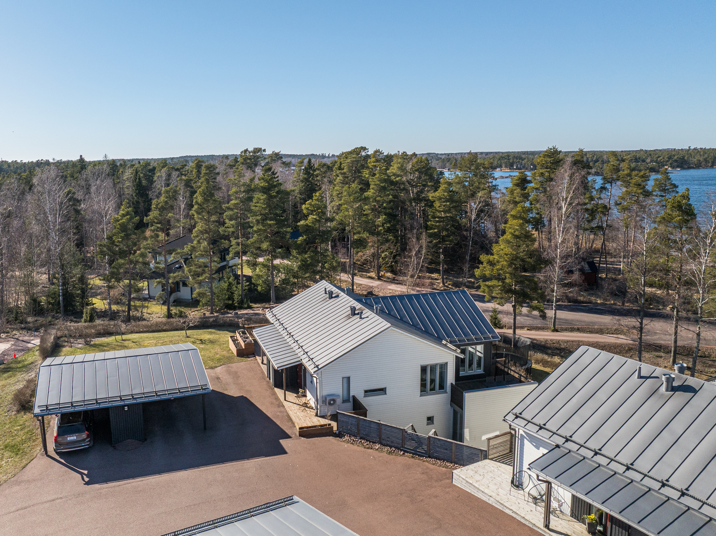 Till bostaden hör en carport med tillhörande kallförråd samt motorvärmaruttag. Parkeringsytorna är asfalterade och i direkt anslutning till bostadens nedre plan disponeras även egen gräsyta, vilket ytterligare förstärker känslan av ett privat och funktionellt boende.