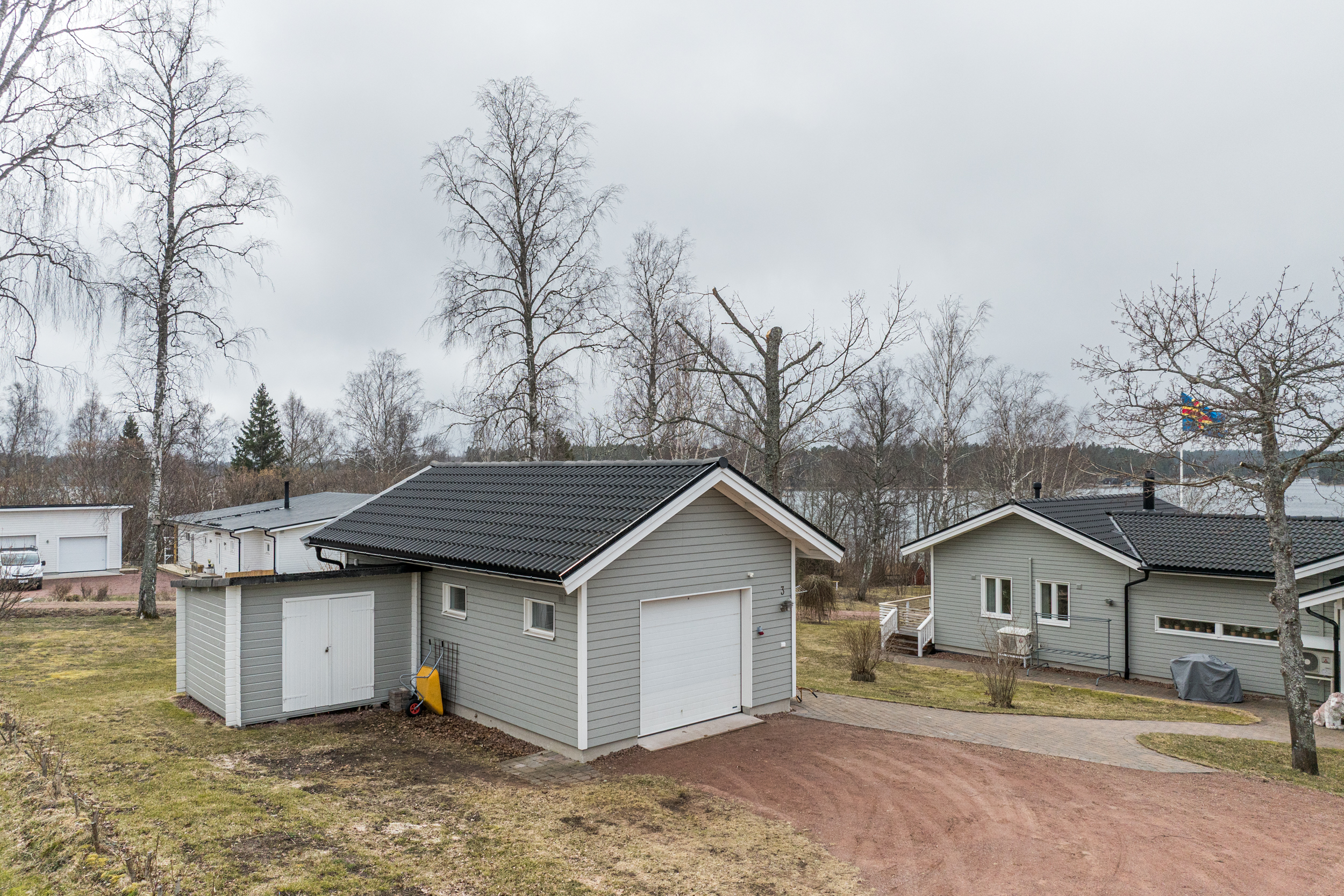 På fastigheten finns ett fristående isolerat garage om cirka 20 m² med tillhörande förråd och vedskjul. Garaget är utrustat med fjärrstyrd port samt indraget vatten och el. Det finns möjlighet att få elbils-laddare installerad efter överenskommelse med säljare. Det finns även en robotgräsklippare som kan ingå vid rätt pris.