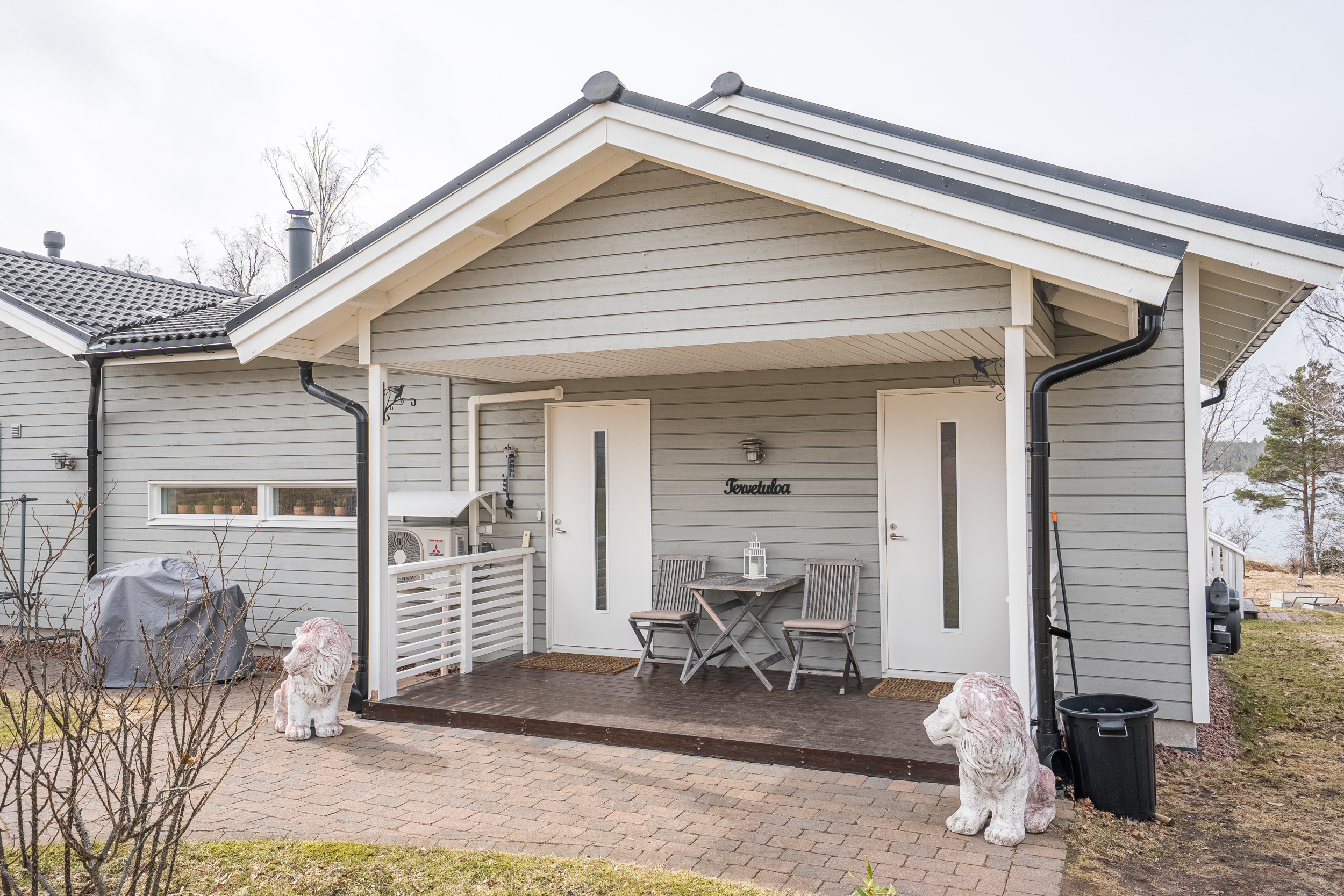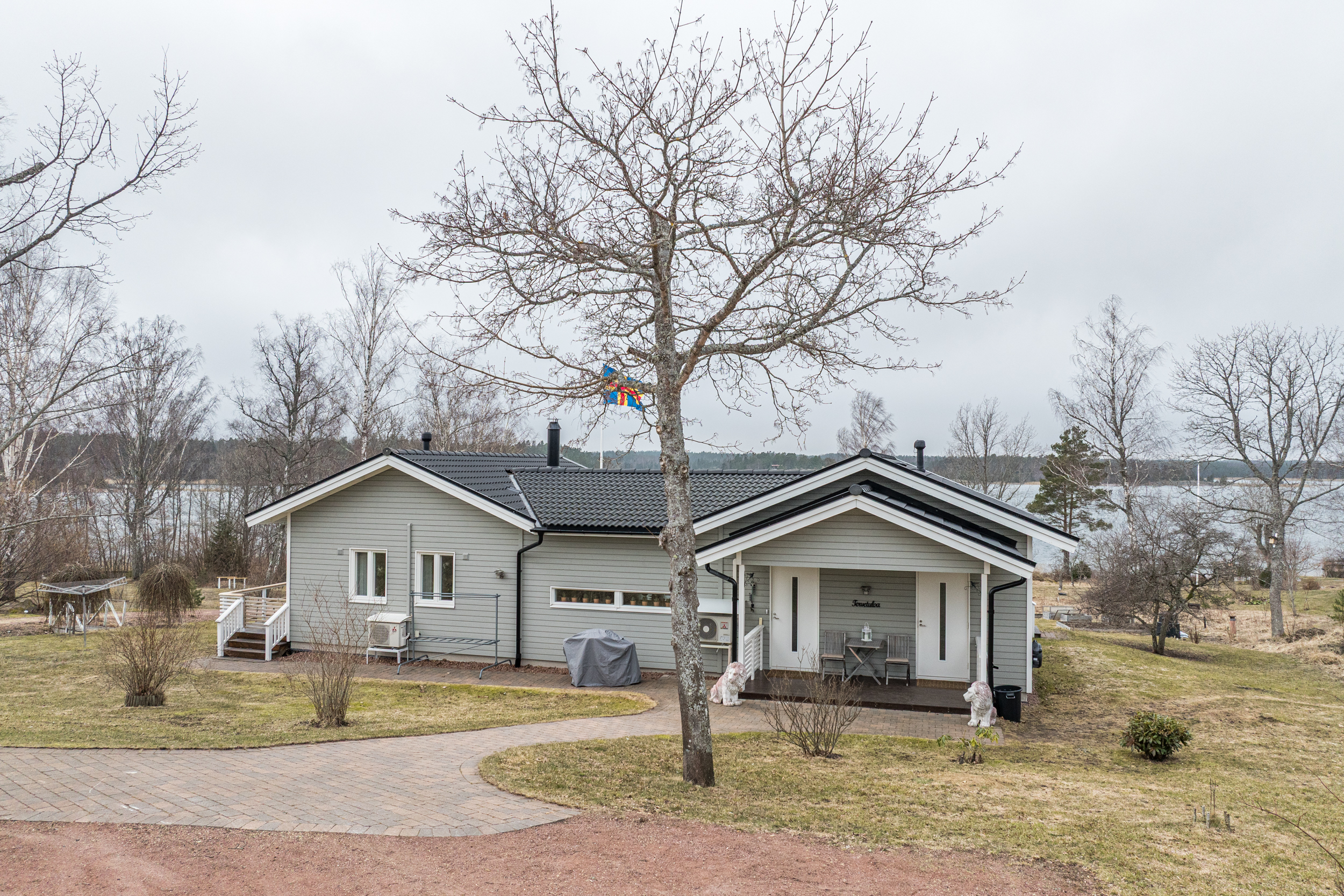 Tomten är omsorgsfullt anlagd med stenlagd entré, grusad uppfart, gräsmatta och inslag av träd, buskar och planteringar. Marken sluttar svagt ner mot det gemensamma strandområdet i väster, vilket förstärker läget och utsikten.
