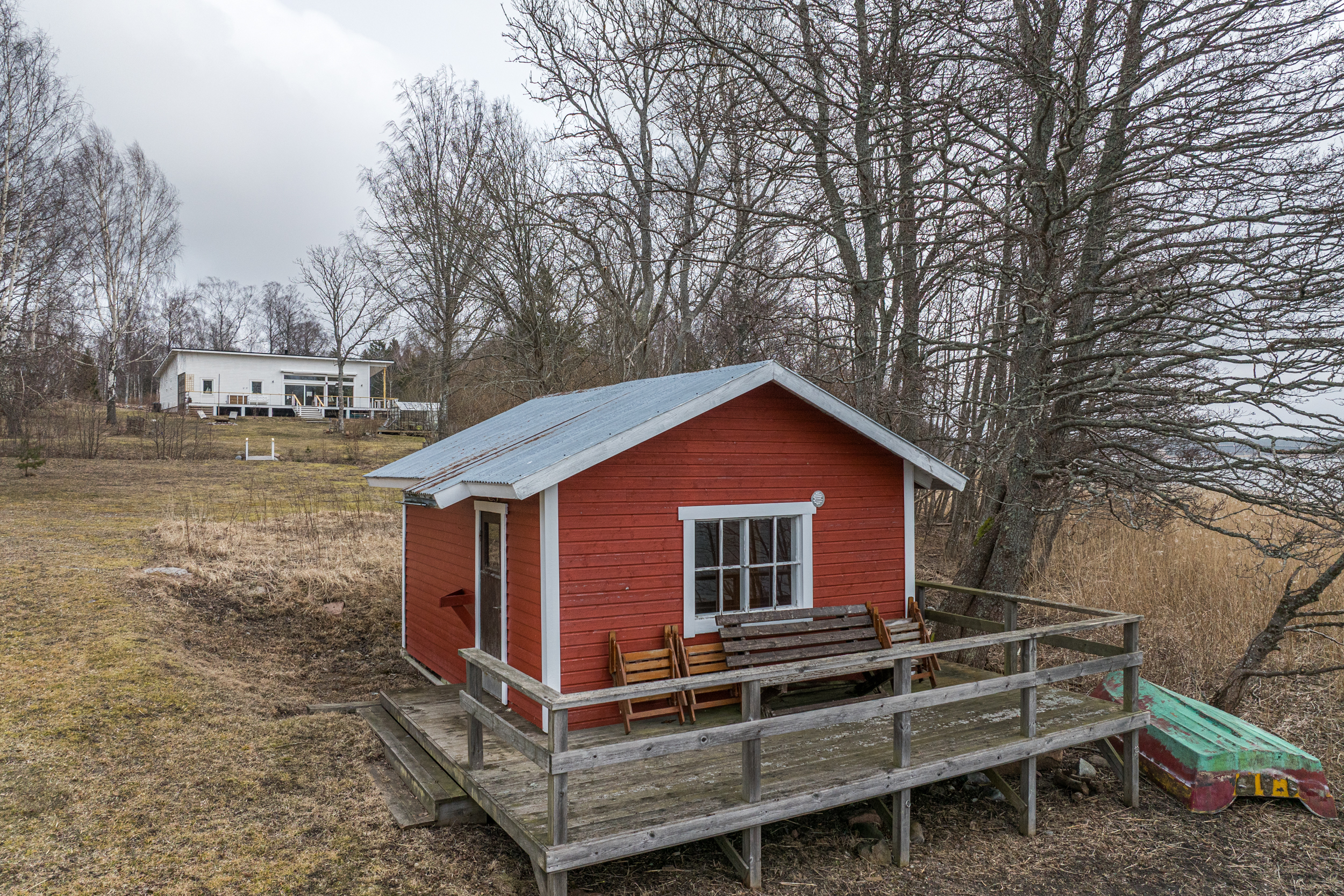 Vid strandlinjen finns ett gemensamt parkområde med badbrygga och badstrand att nyttja. Till fastigheten hör även eget förrådsutrymme i en av sjöbodarna.