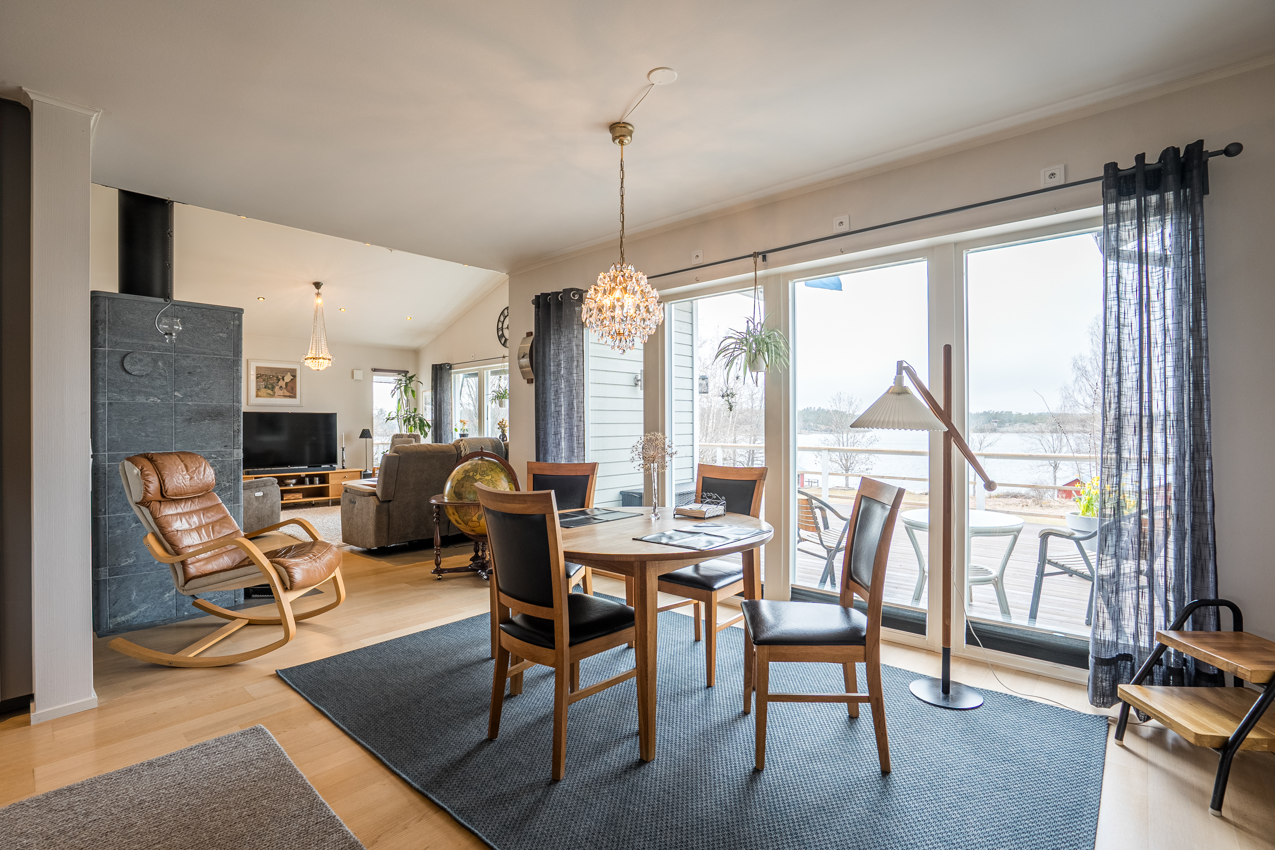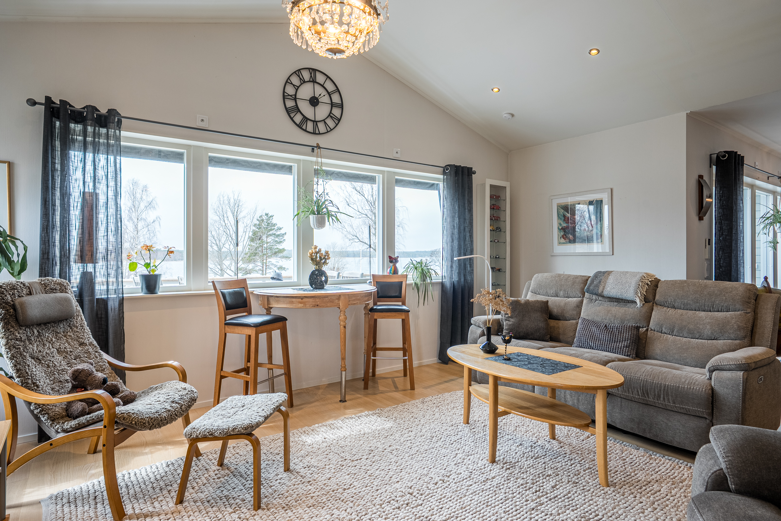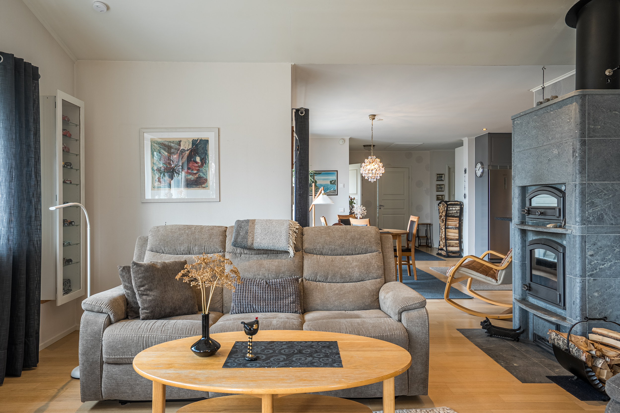 Vardagsrummet är rymligt och ljust med stora fönster mot väster. Den gedigna Tulikivi-täljstensspisen utgör en central punkt i rummet och bidrar både till atmosfär och funktion.