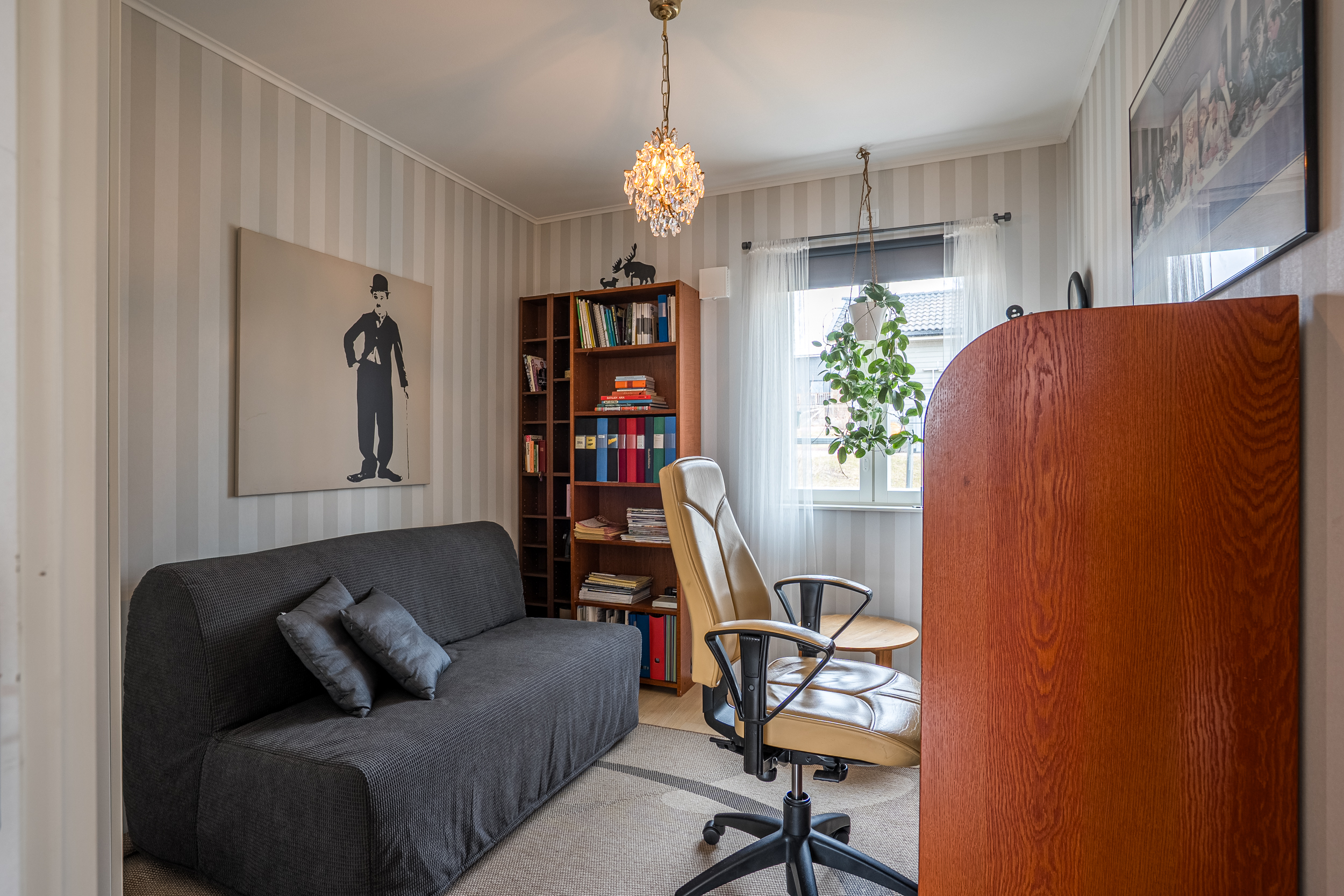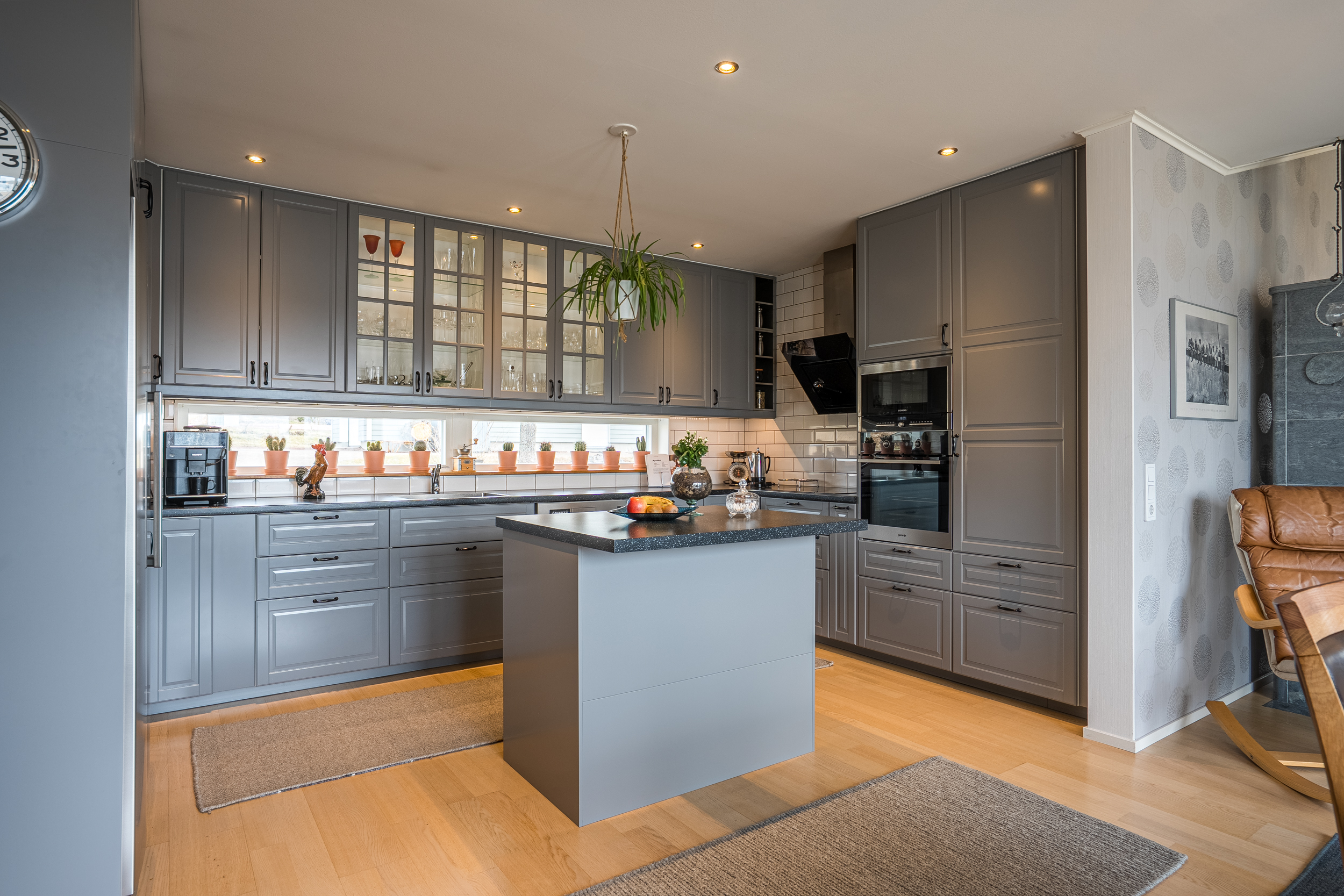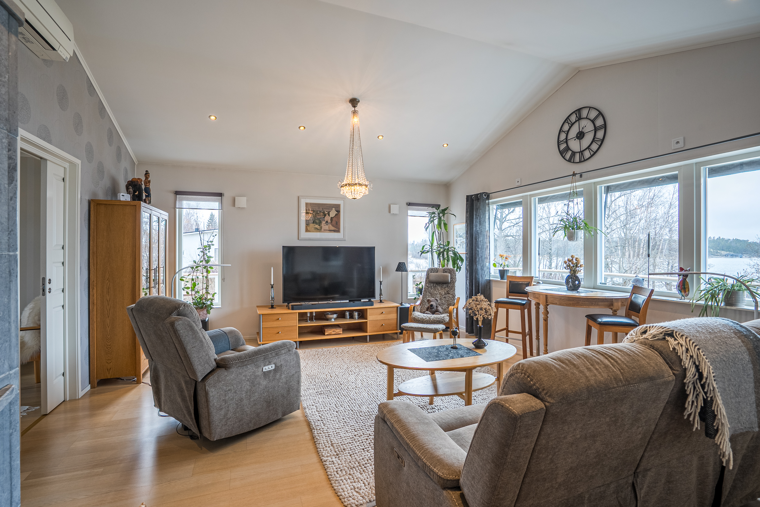 Vardagsrummet är rymligt och ljust med stora fönster mot väster. Den gedigna Tulikivi-täljstensspisen utgör en central punkt i rummet och bidrar både till atmosfär och funktion.
