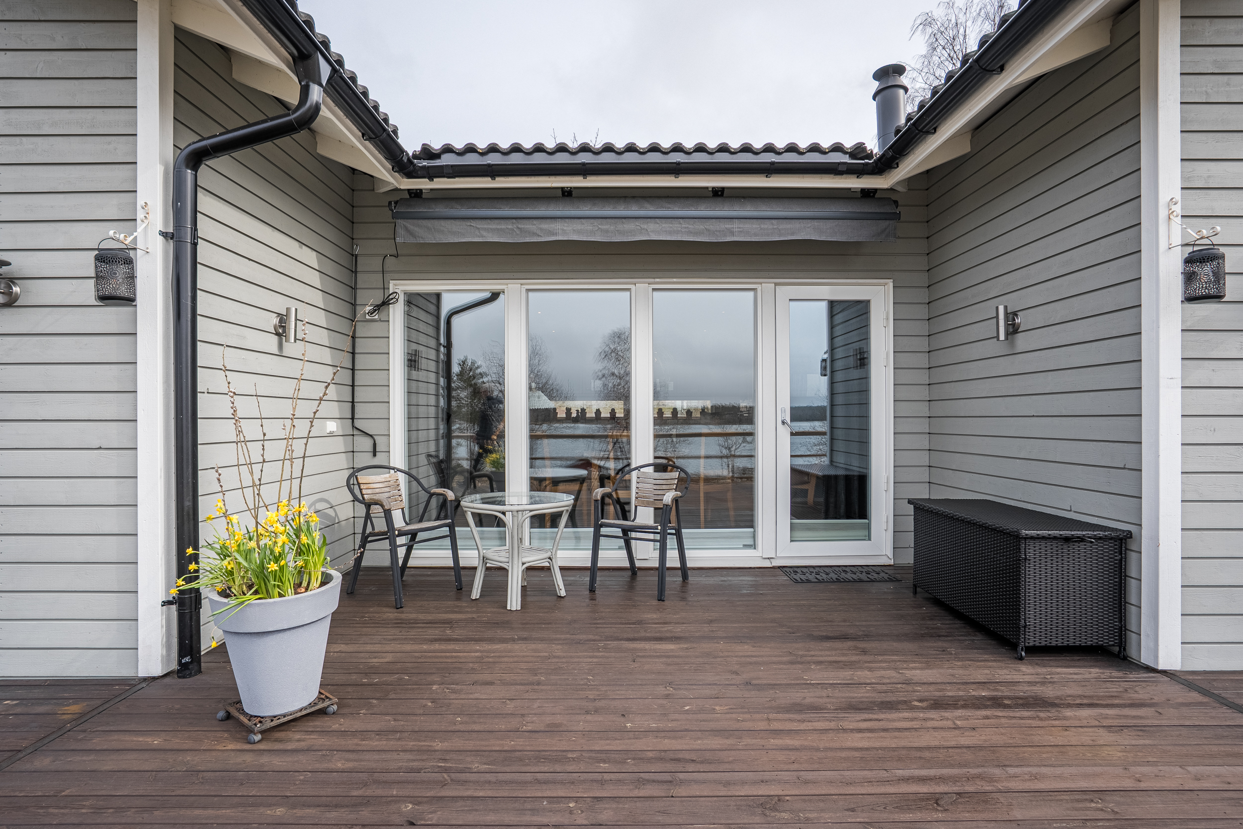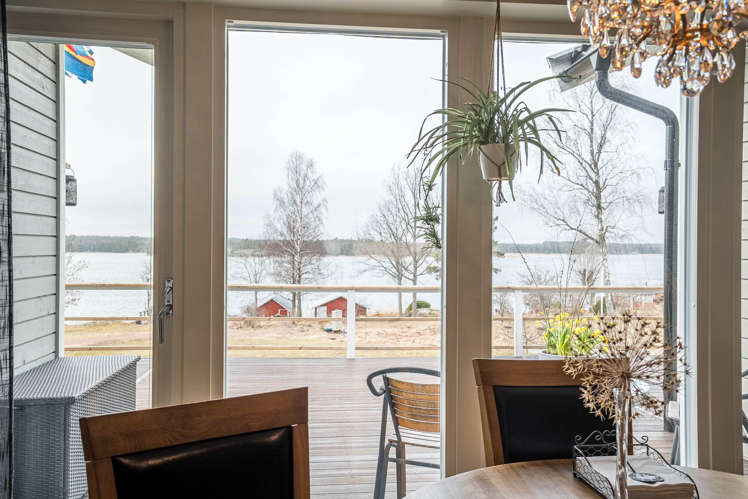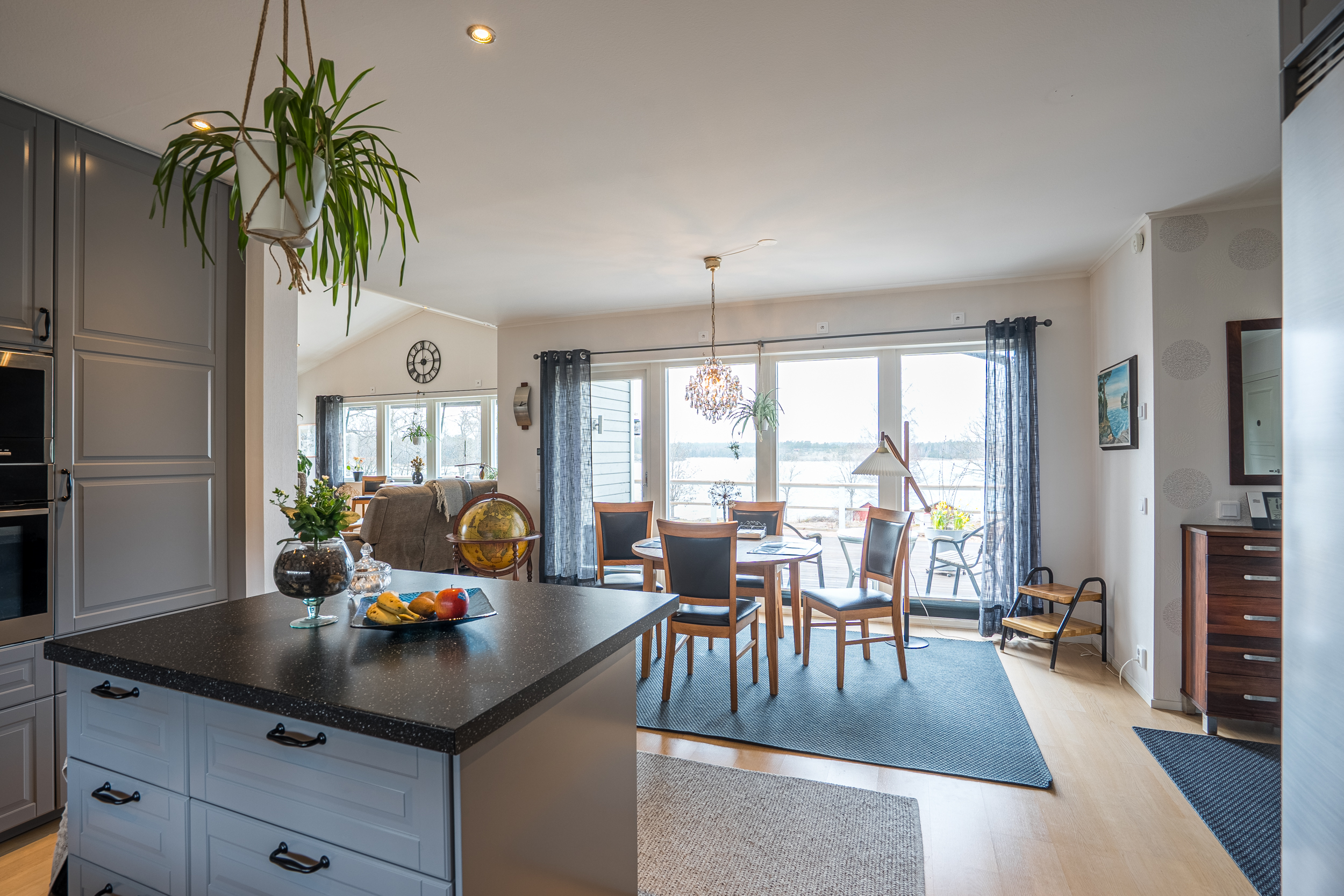Matplatsen är placerad i direkt anslutning till ett större fönsterparti med utblick mot vattnet, vilket skapar en ljus och trivsam miljö. Härifrån nås även terrassen i västerläge, en naturlig förlängning av bostadens sällskapsytor.