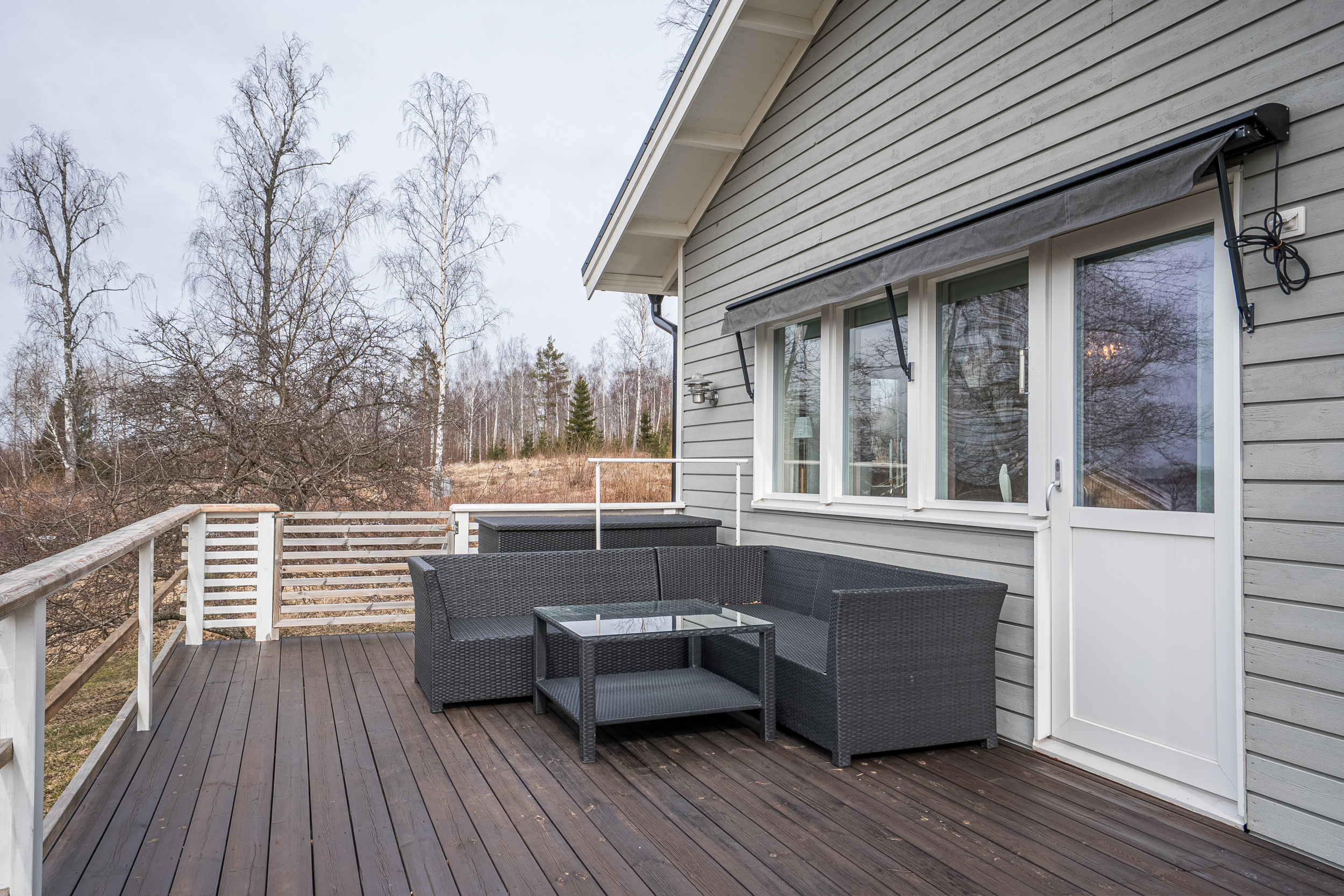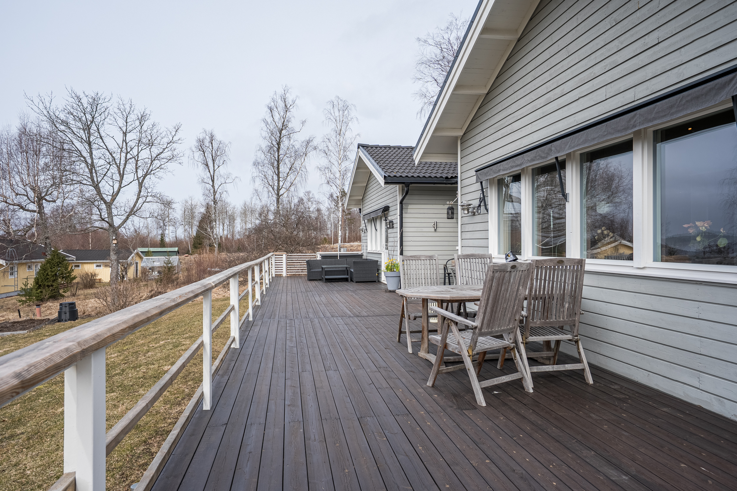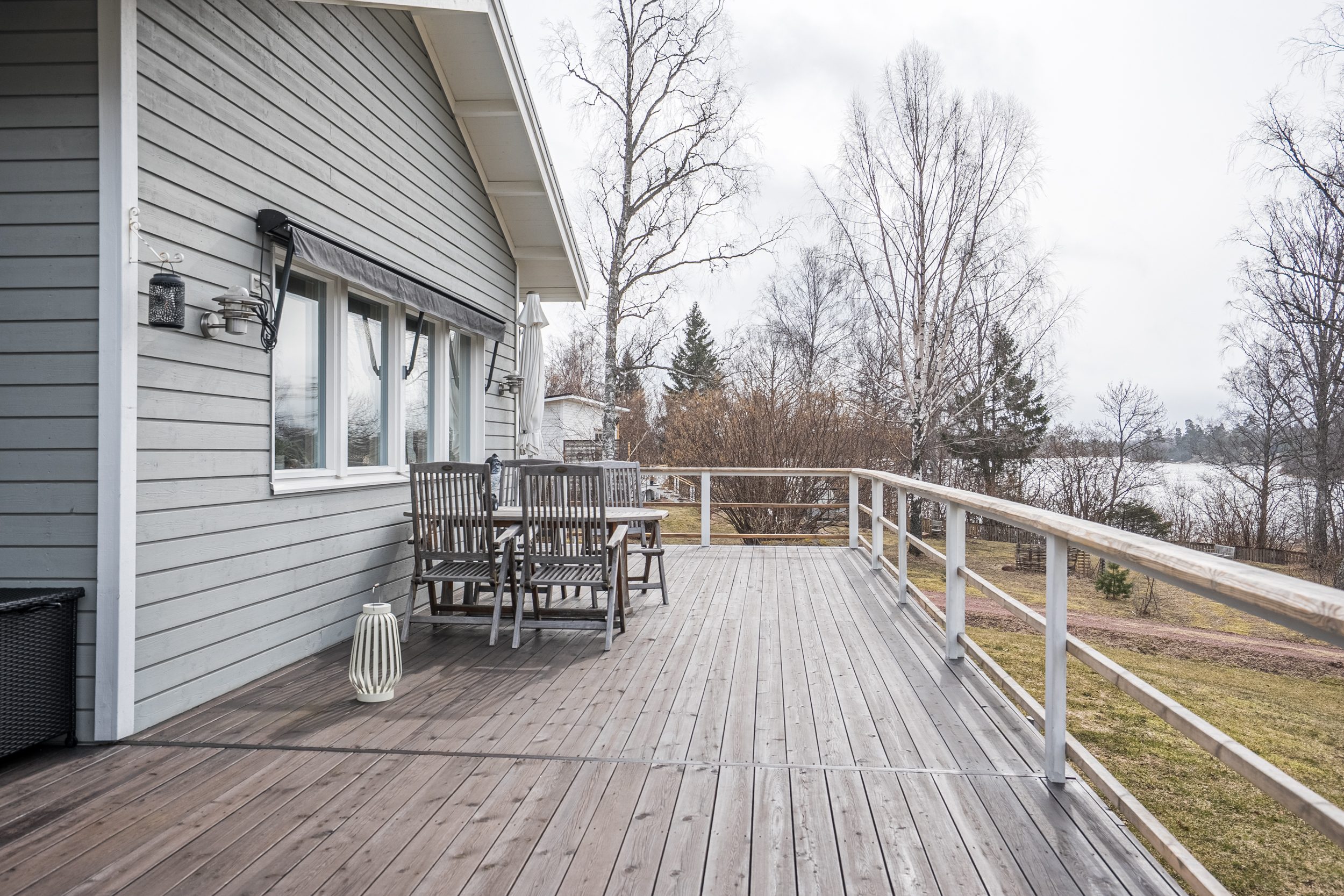 Matplatsen är placerad i direkt anslutning till ett större fönsterparti med utblick mot vattnet, vilket skapar en ljus och trivsam miljö. Härifrån nås även terrassen i västerläge, en naturlig förlängning av bostadens sällskapsytor.
