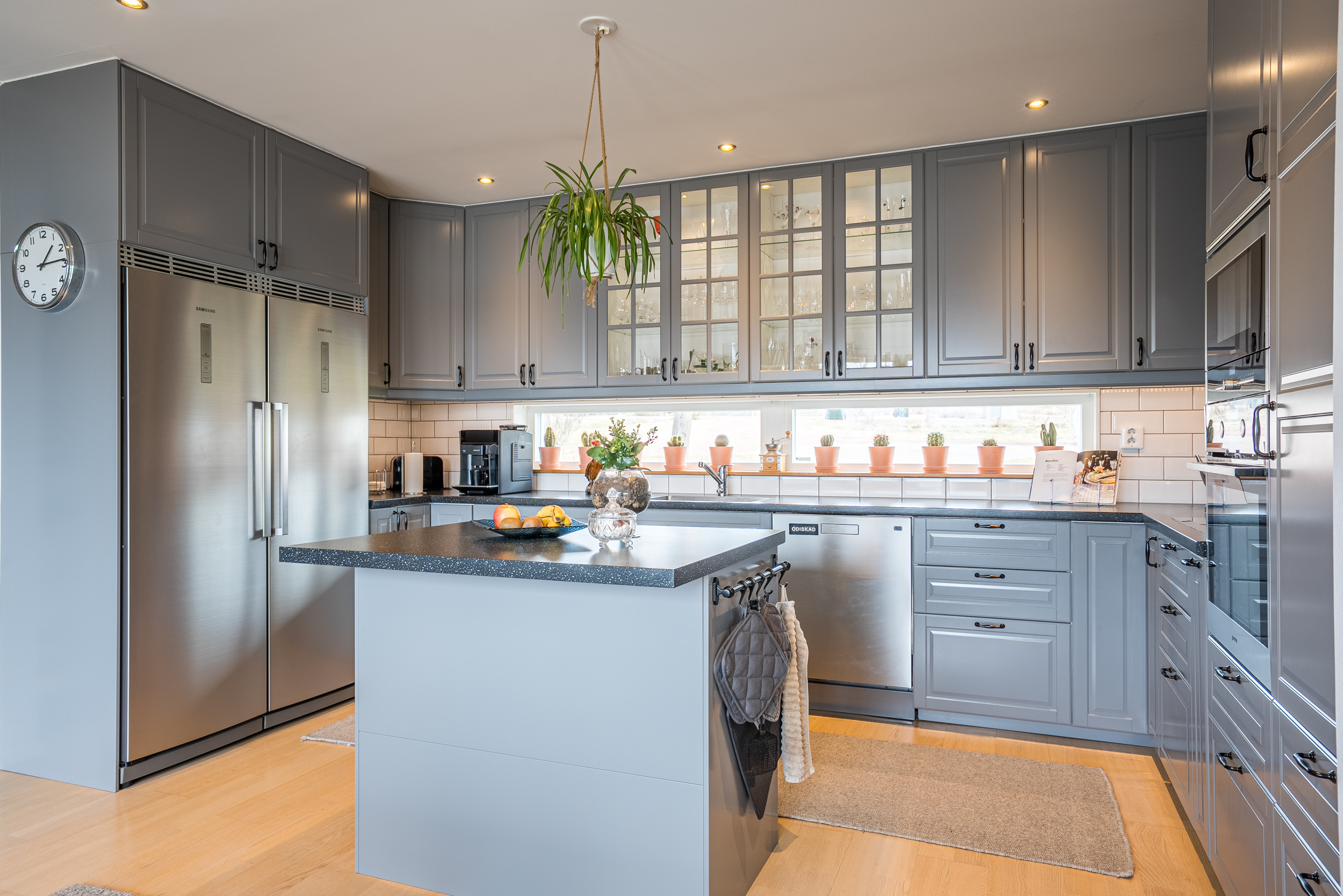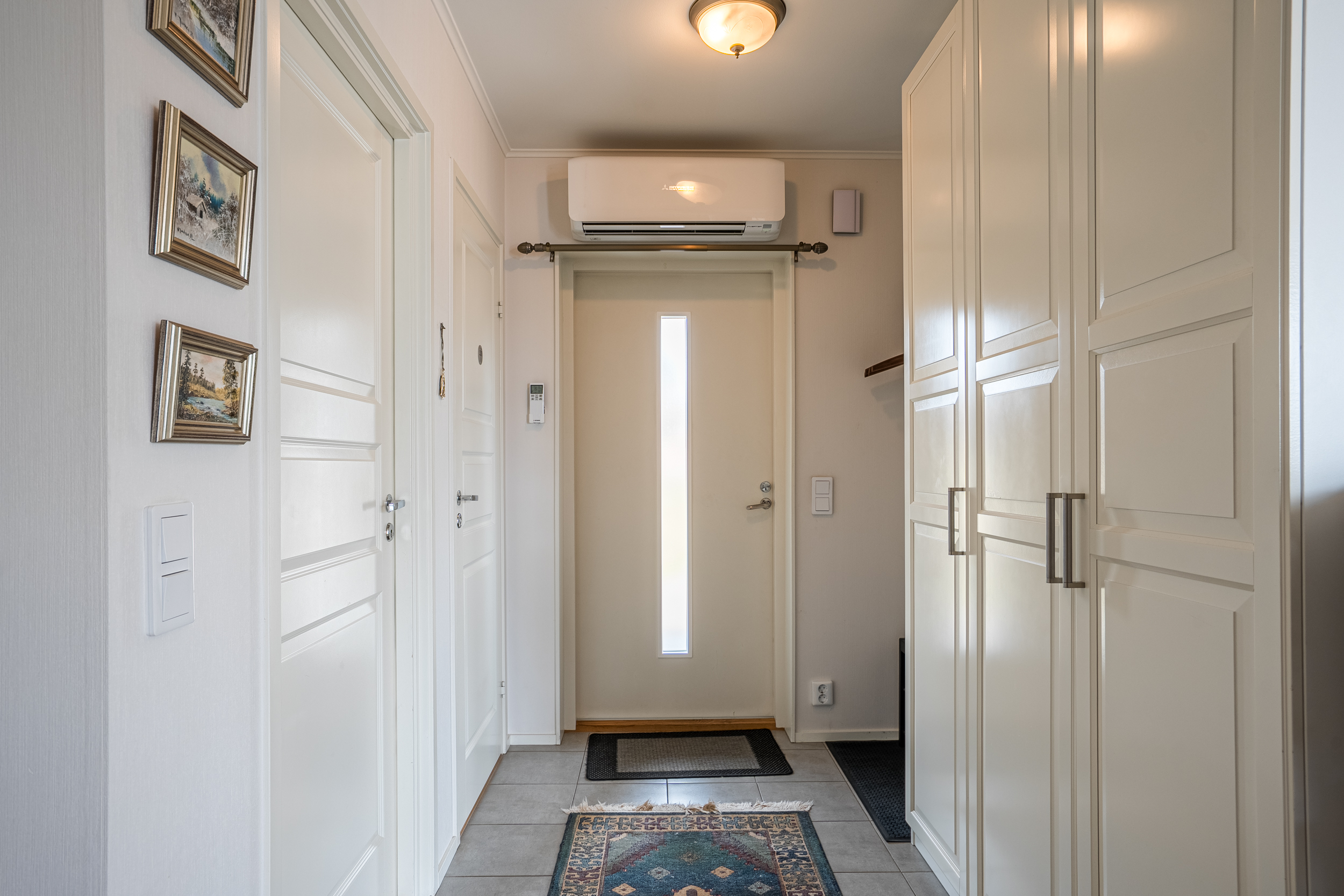 Entrén öppnar upp till en ljus och välkomnande hall med klinkergolv och goda förvaringsmöjligheter. Vidare in i bostaden möts man av de sociala ytorna där kök och vardagsrum bildar en naturlig samlingspunkt. Köket är genomtänkt utformat med köksö, goda arbetsytor och full maskinell utrustning, inklusive induktionshäll, ugn och mikrovågsugn i arbetshöjd, diskmaskin samt hel kyl och frys. Materialvalen är tidlösa och funktionella, med kaklat stänkskydd som ger ett stilrent uttryck.