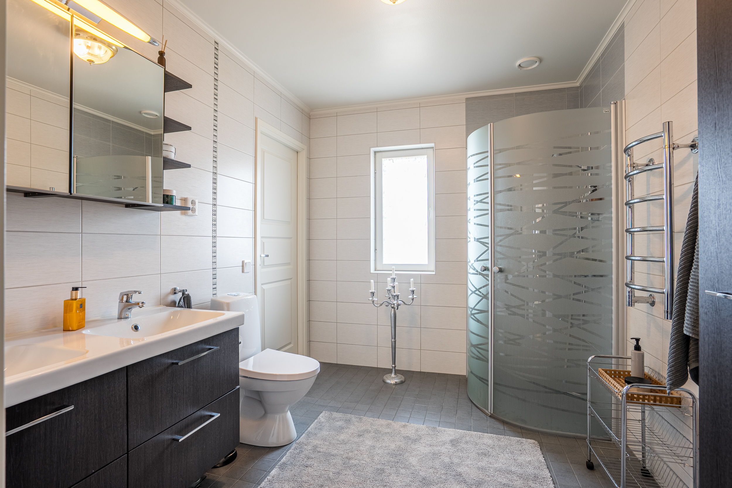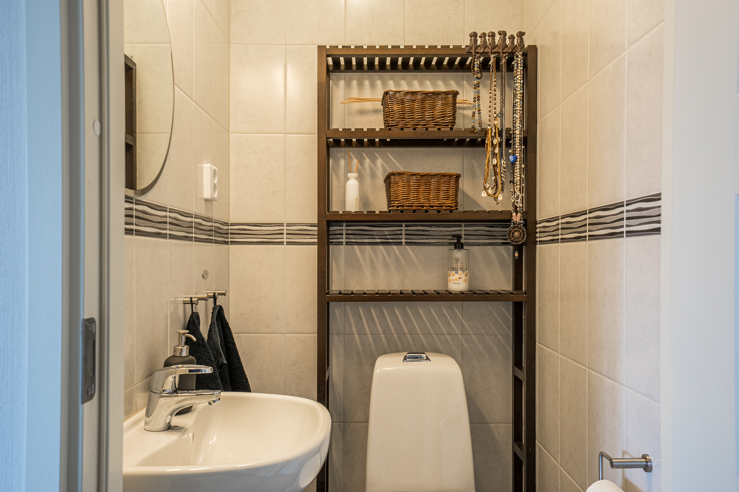 I anslutning till entrén finns badrum, grovkök samt separat gäst-wc. Badrummet totalrenoverades 2021 och är rymligt och helkaklat med dubbla handfat i kommod, spegelskåp, dusch bakom frostade glaspartier, wc samt handdukstork. Rummet nås både från hallen och från master bedroom, vilket skapar en praktisk och genomtänkt funktion.