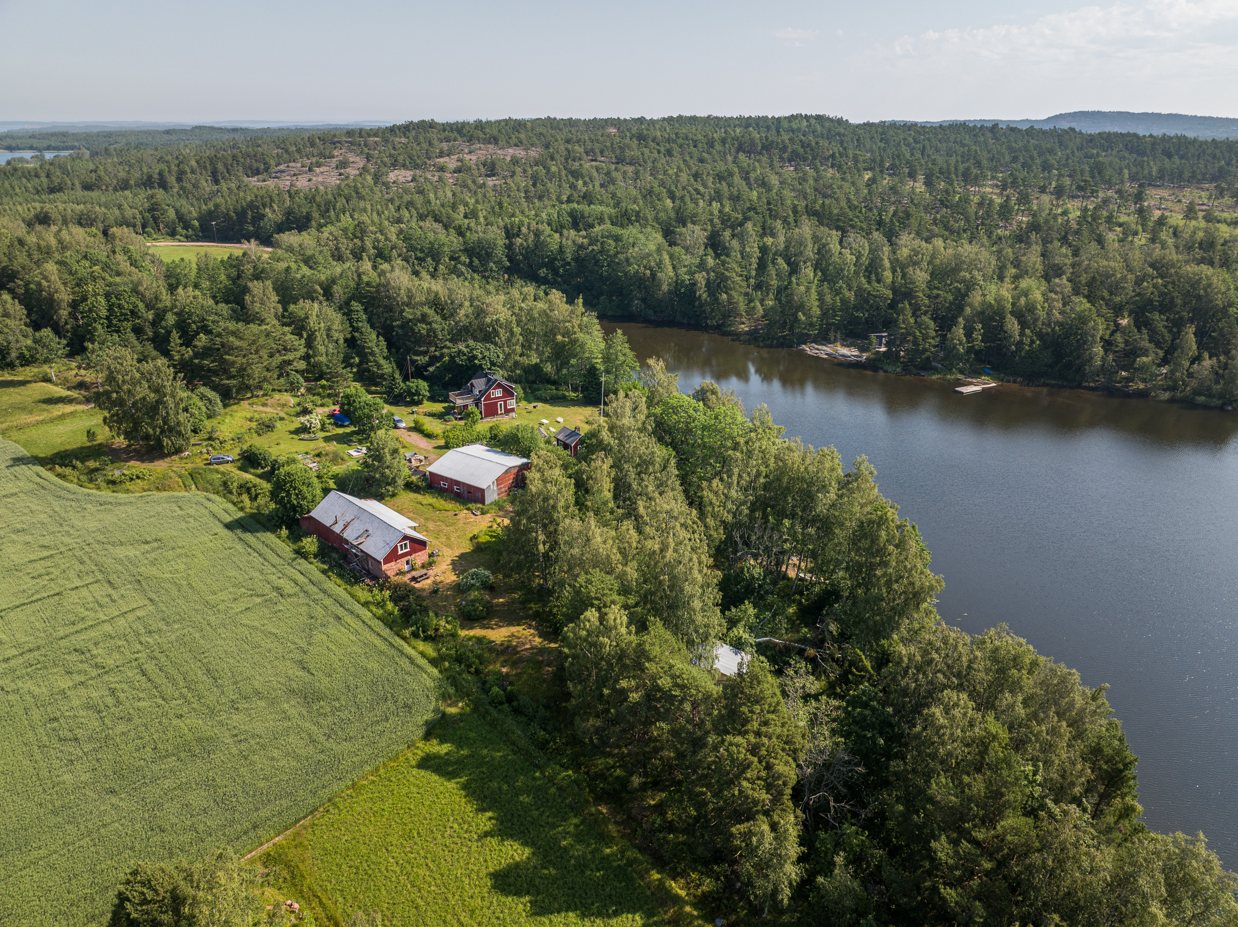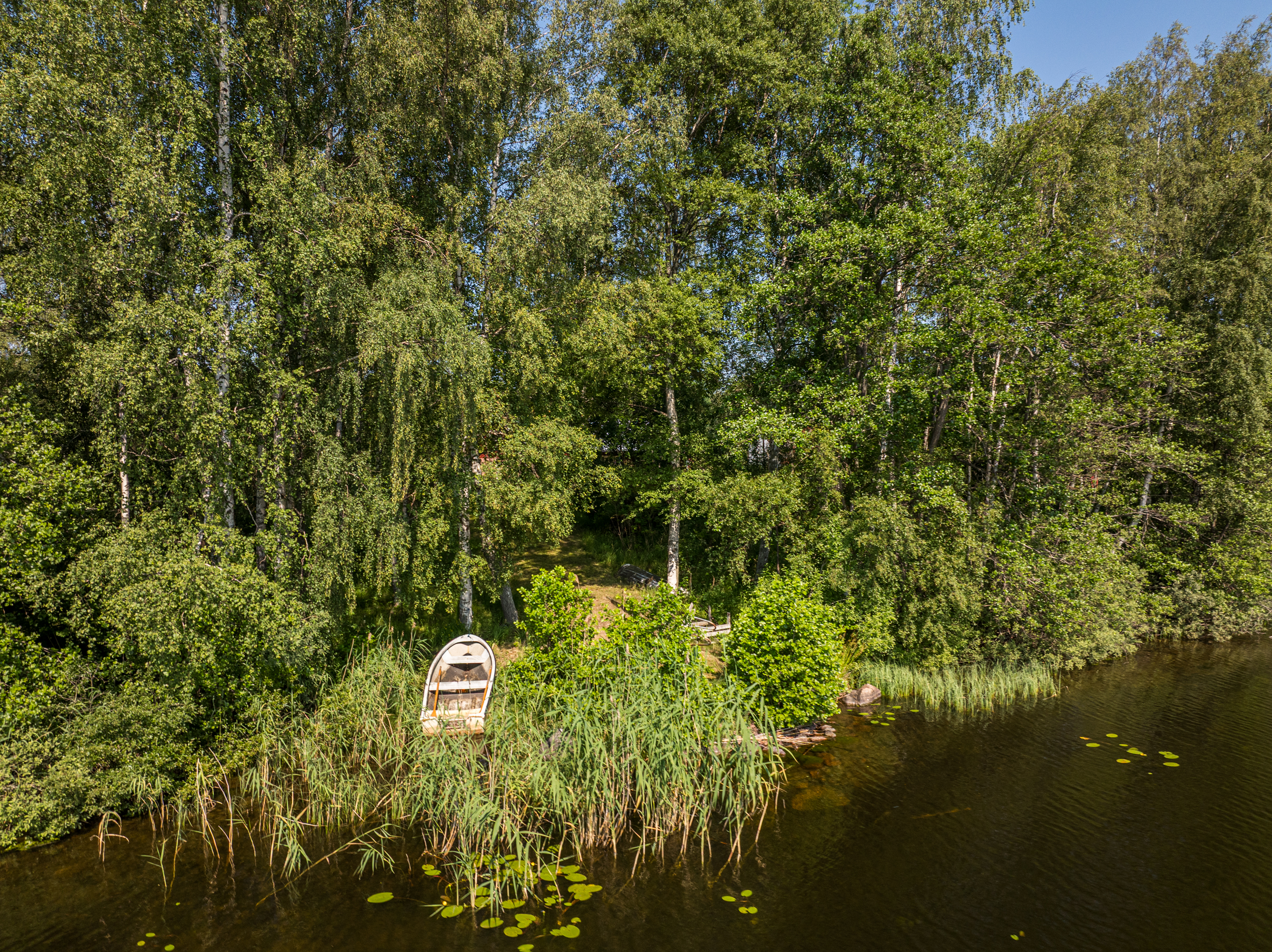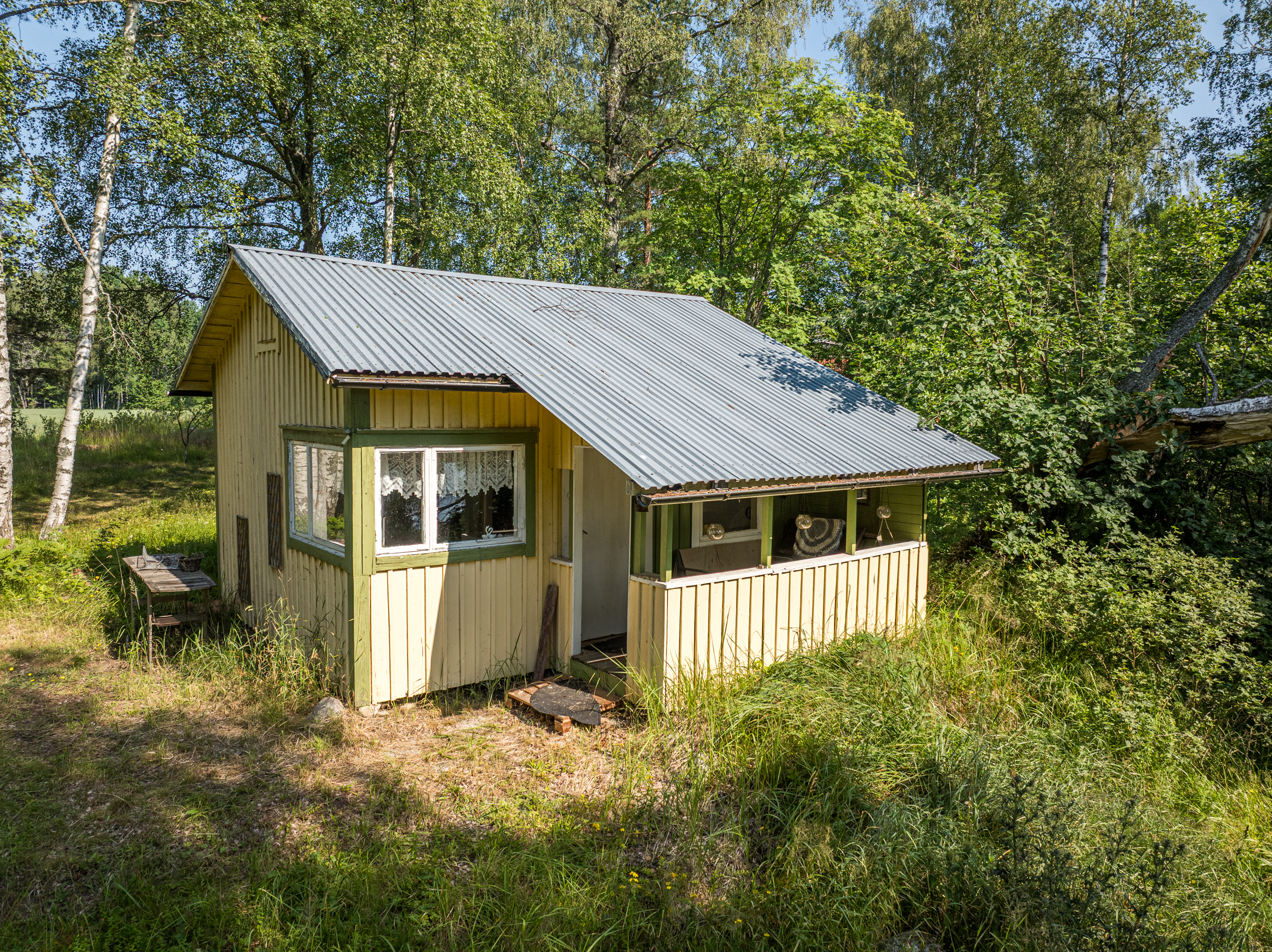 Precis vid strandkanten finner du en enklare gäststuga, idealisk för övernattande gäster eller som en charmig sommarstuga med direkt närhet till vattnet. Tomten är till största del grästäckt och sluttar mjukt ner mot den spegelblanka insjön.
