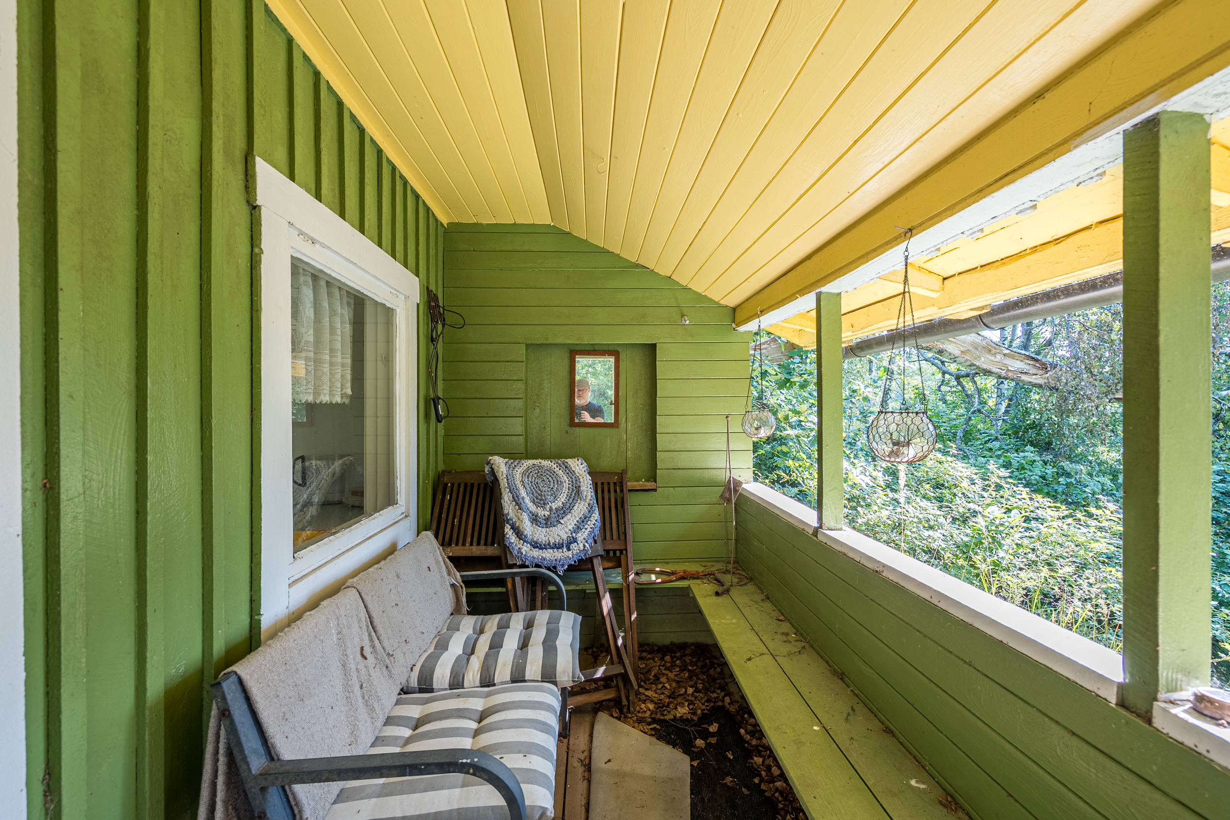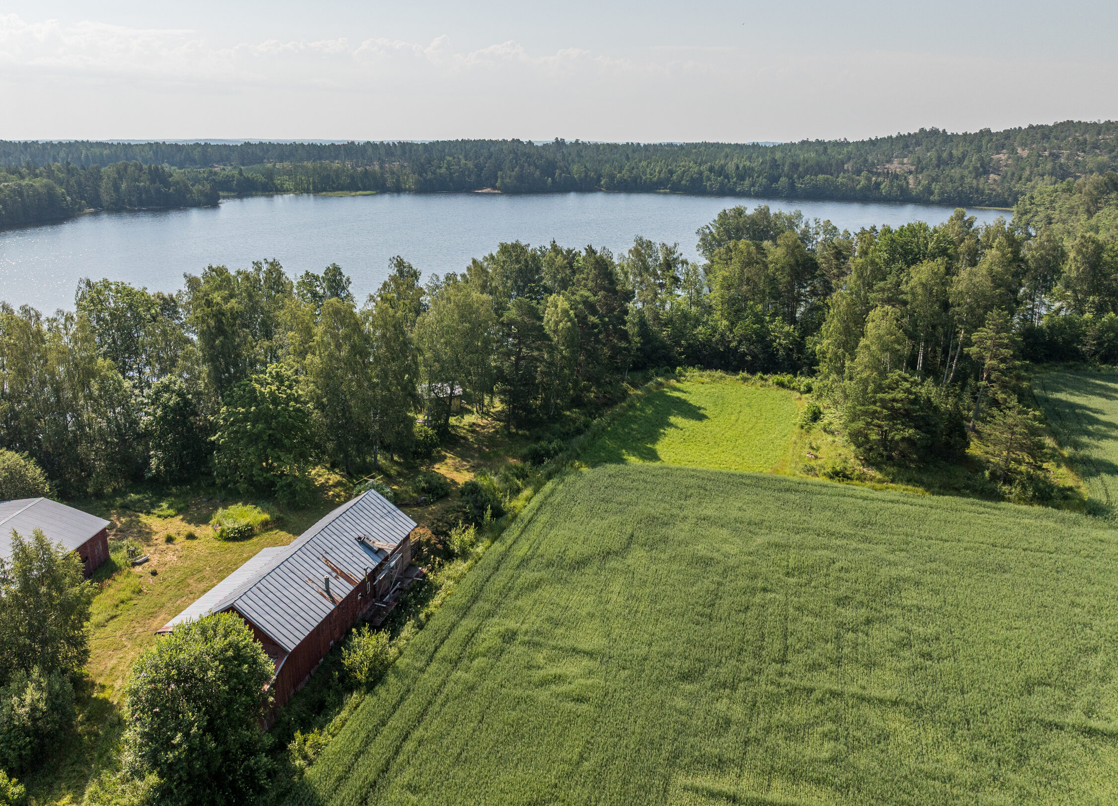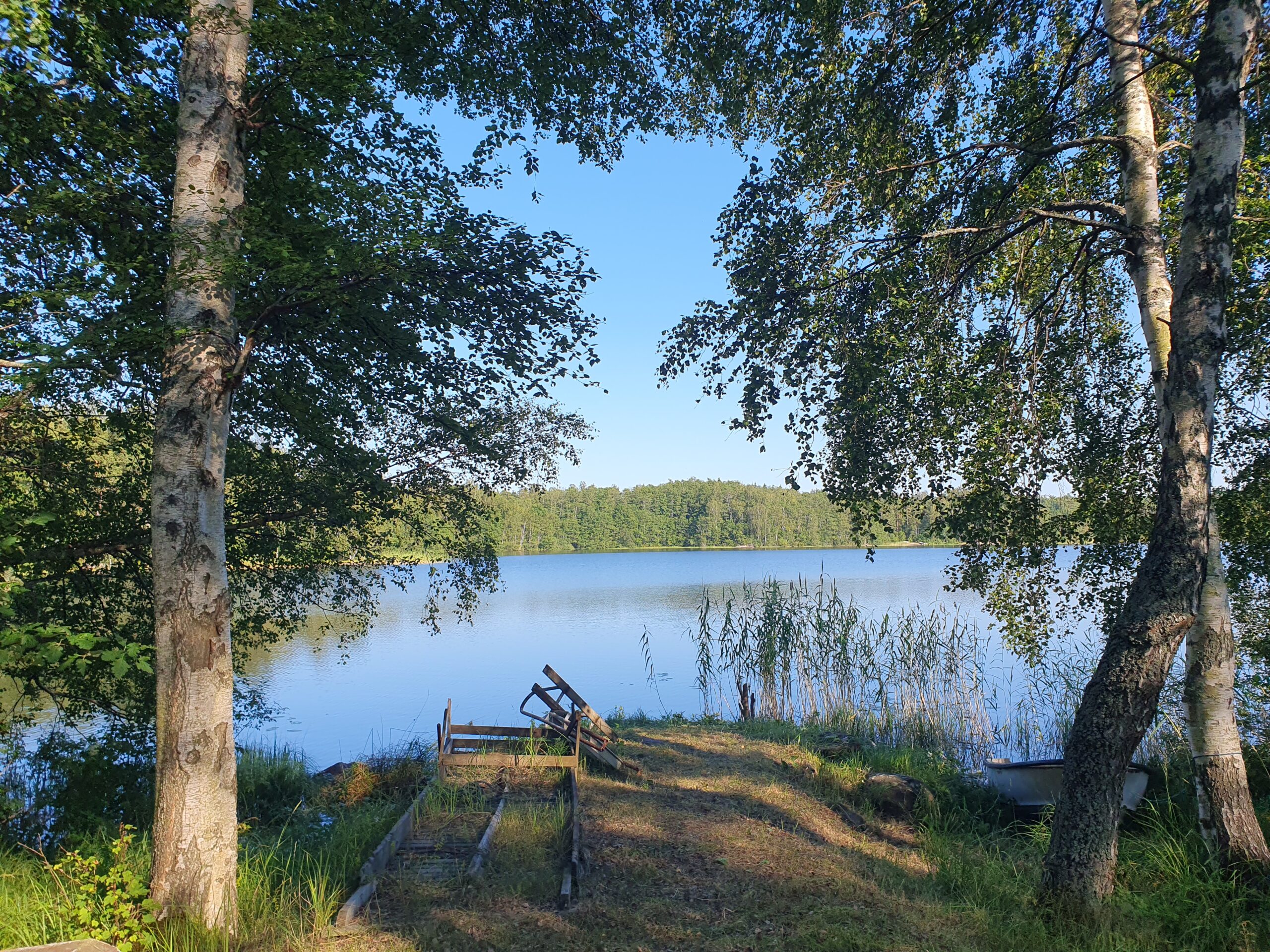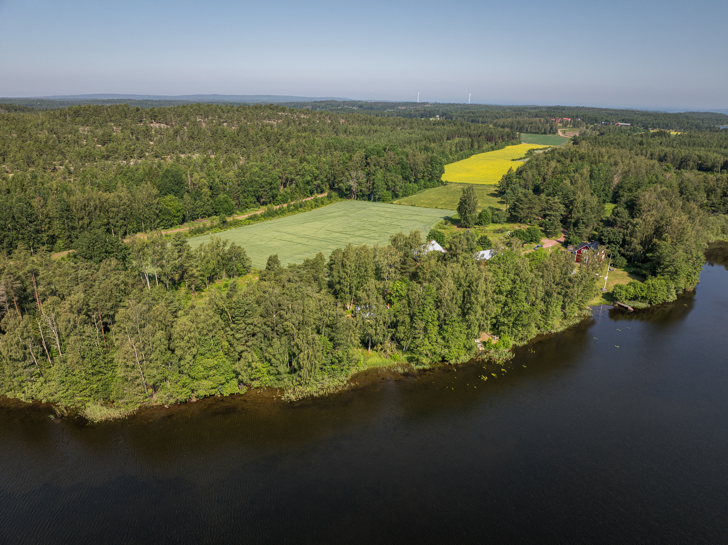 Precis vid strandkanten finner du en enklare gäststuga, idealisk för övernattande gäster eller som en charmig sommarstuga med direkt närhet till vattnet. Tomten är till största del grästäckt och sluttar mjukt ner mot den spegelblanka insjön.