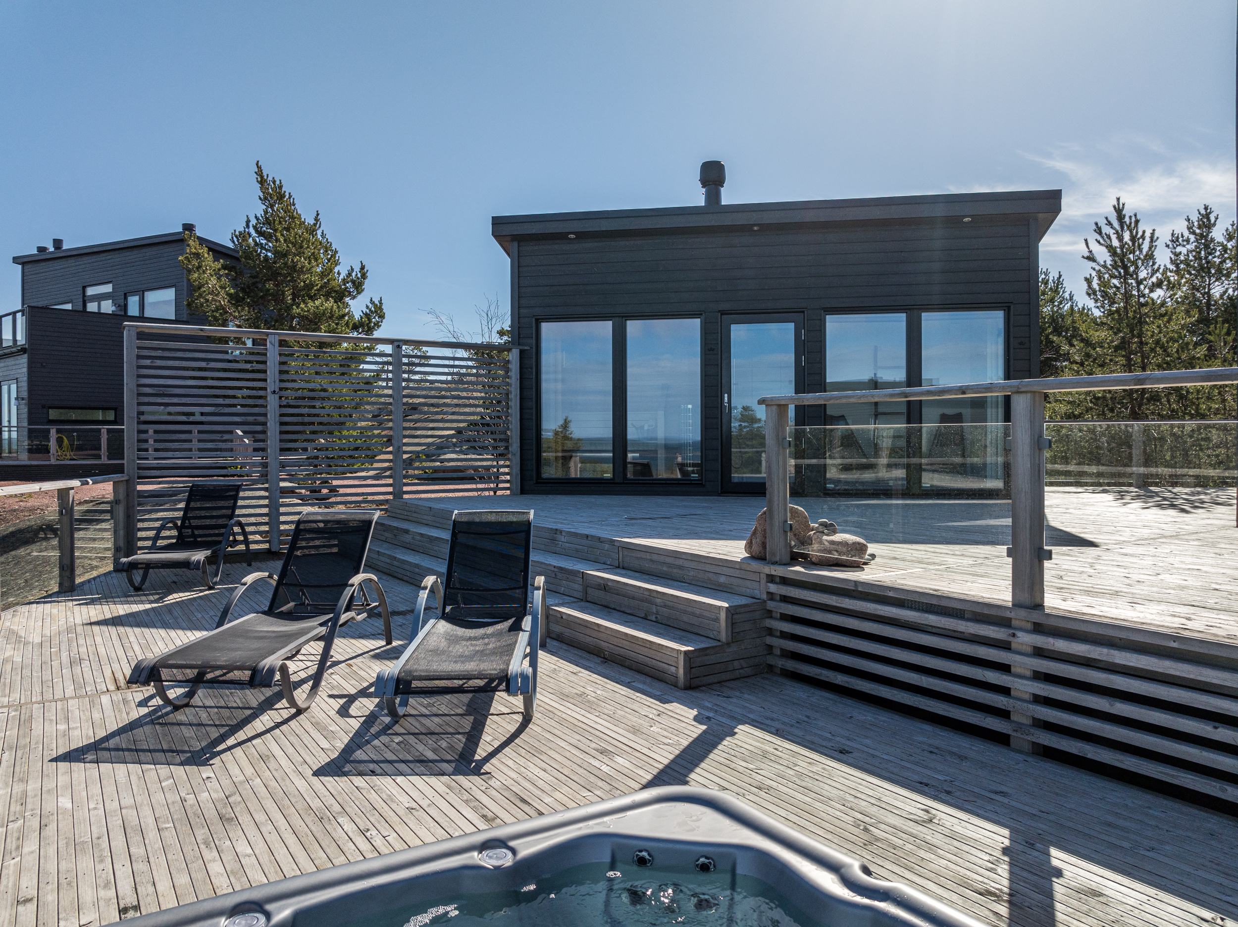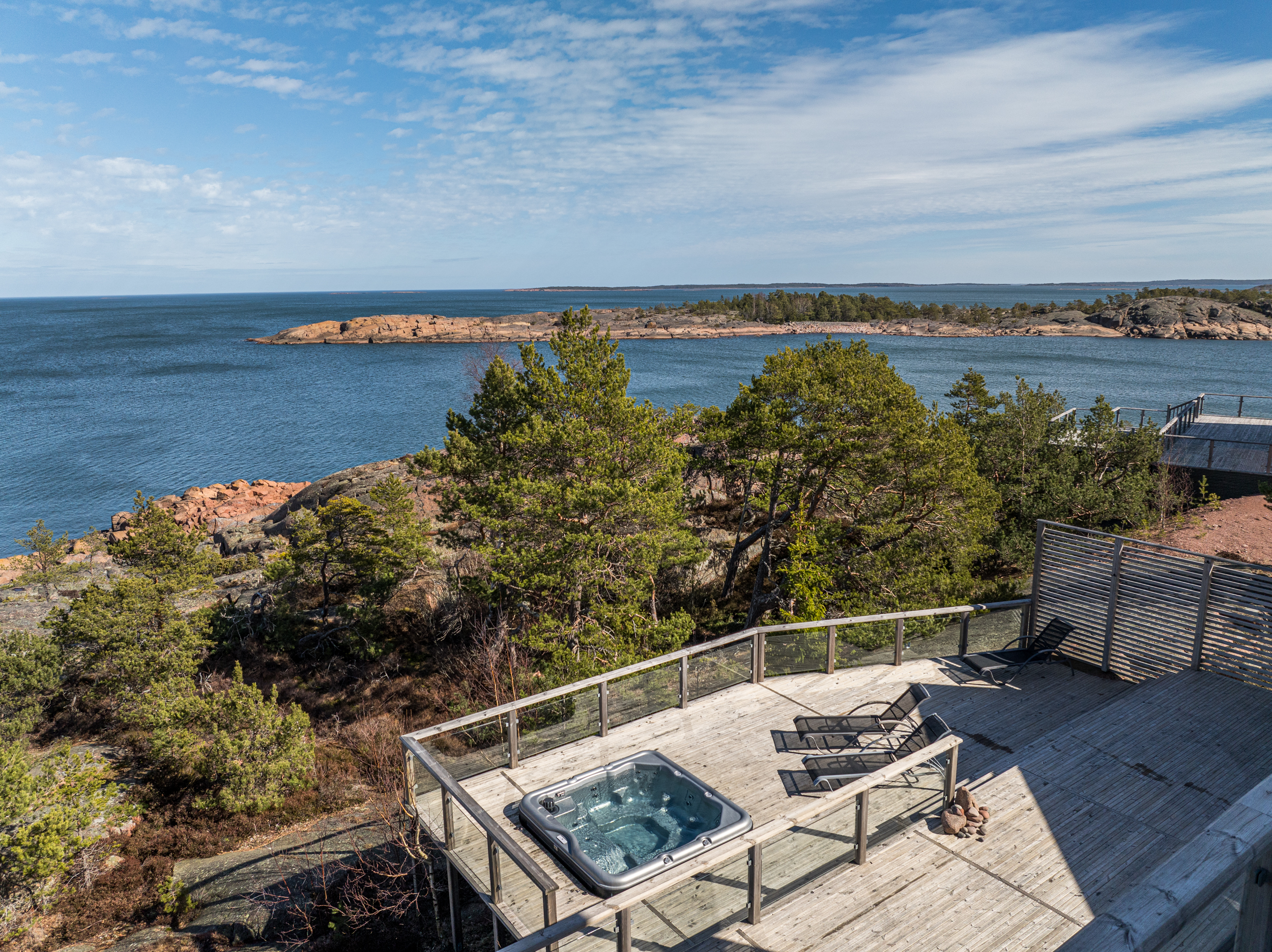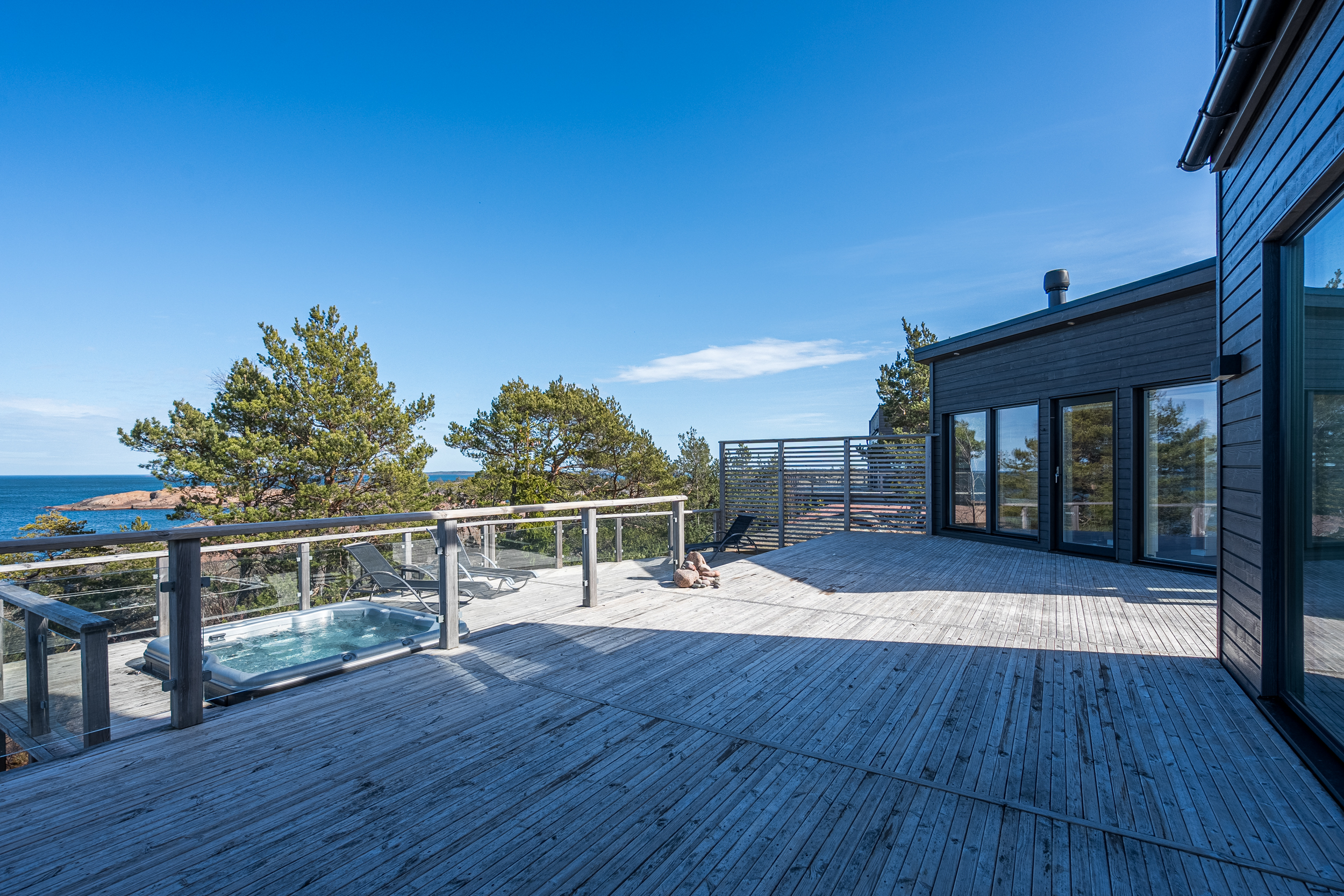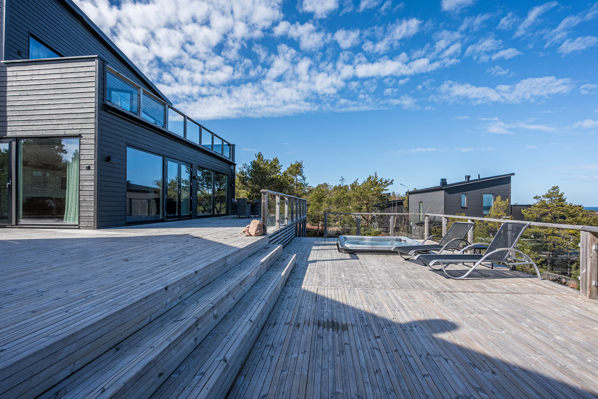 En omfattande altan på cirka 200 kvm omger huset och integreras harmoniskt med den omgivande naturen. På altanens nedre plan finns en ny jacuzzi för upp till sex personer, och intill altanen står en separat bastubyggnad från 2017 med dusch och relaxavdelning i direkt anslutning till och från altanen med utsikt över havet.