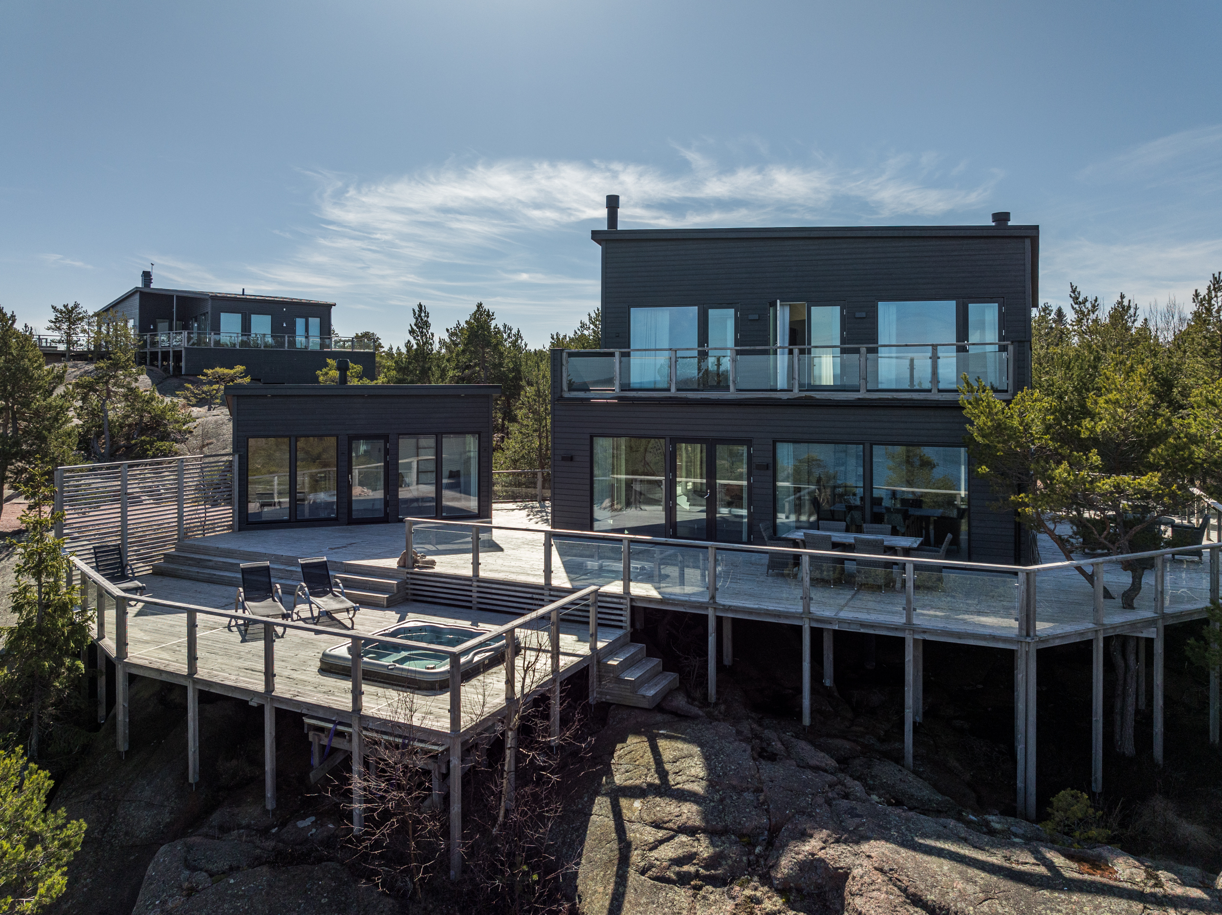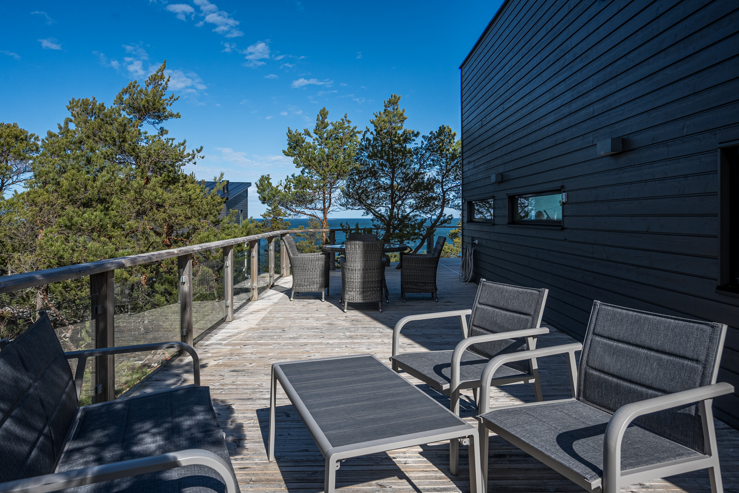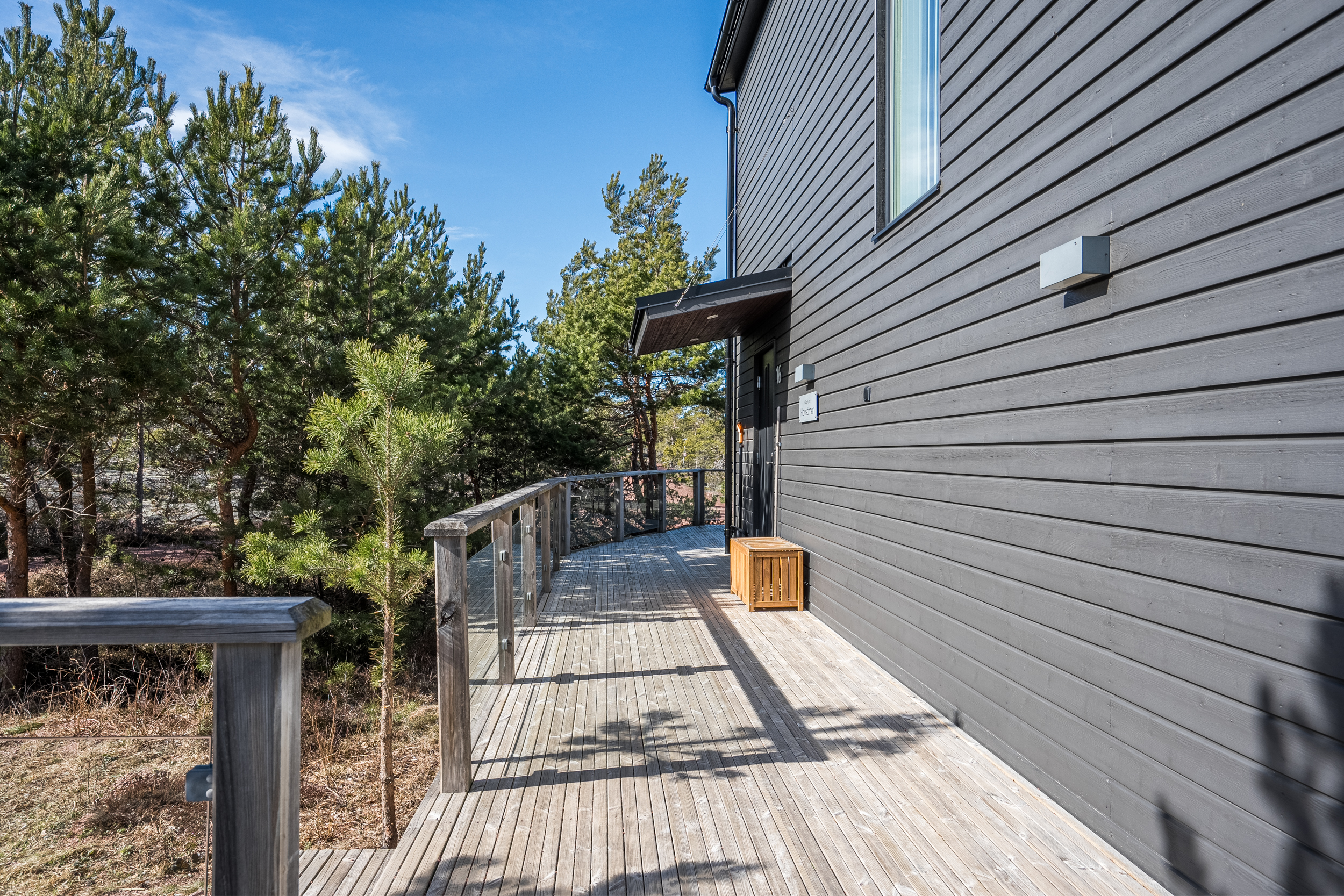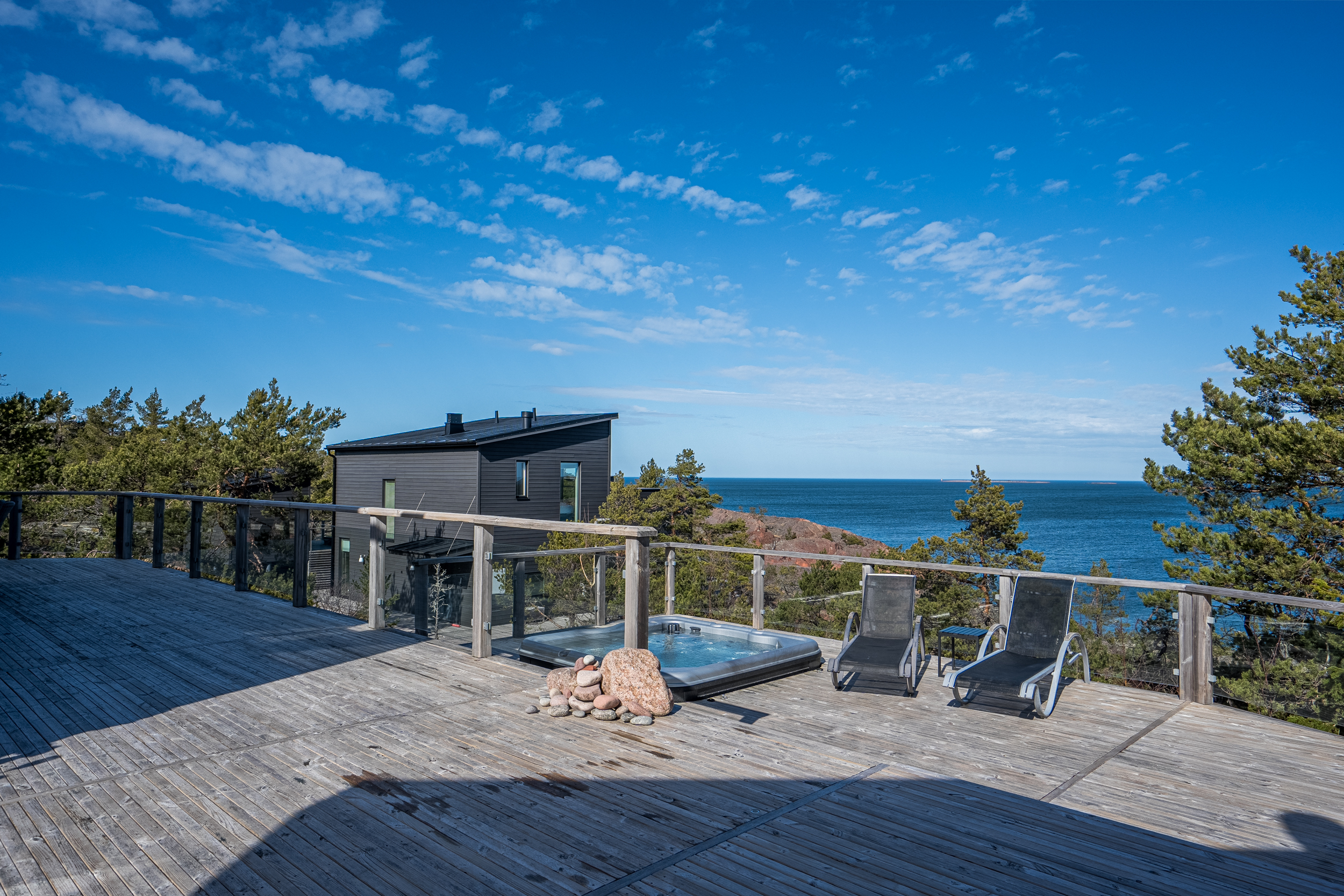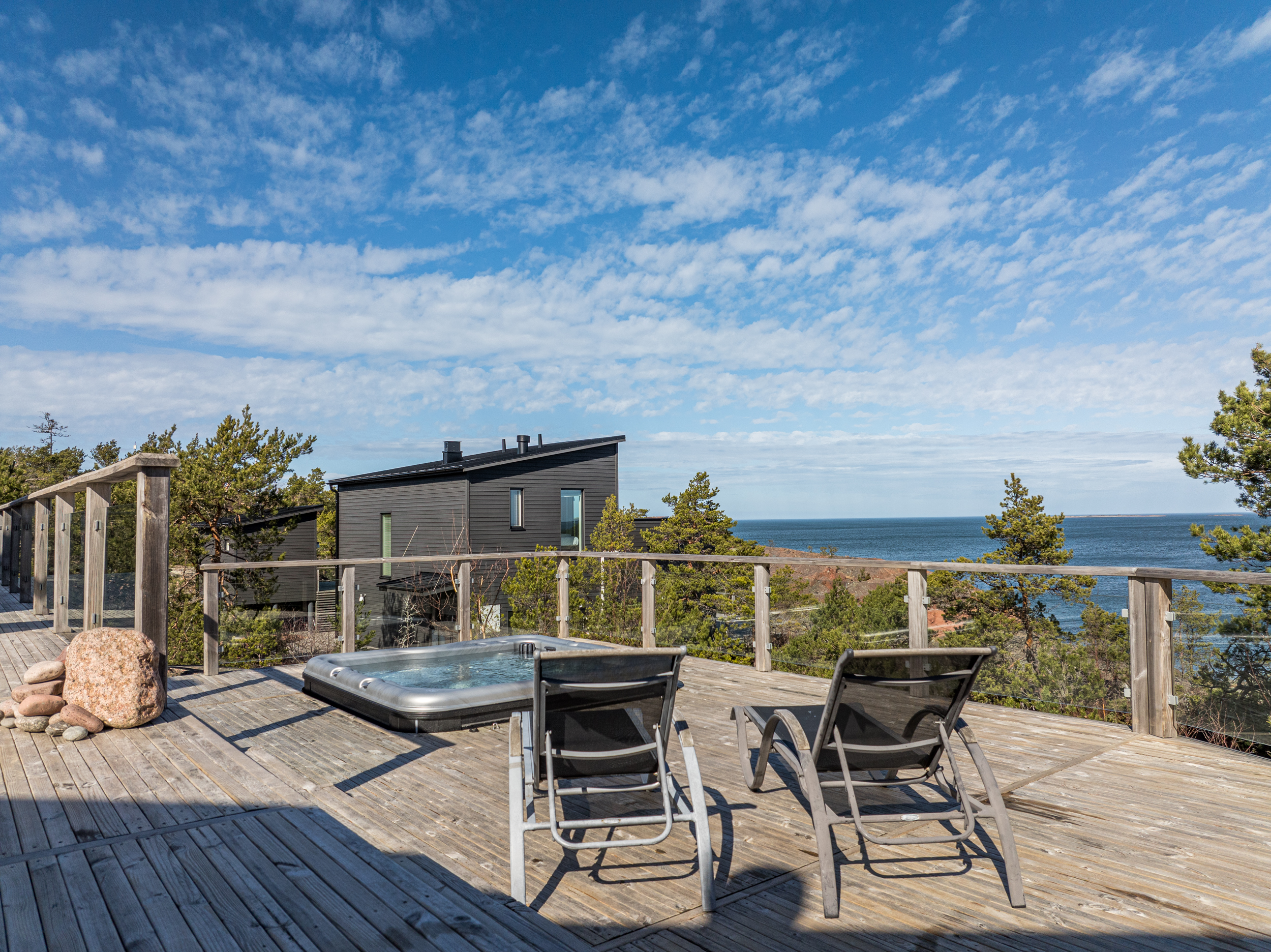 En omfattande altan på cirka 200 kvm omger huset och integreras harmoniskt med den omgivande naturen. På altanens nedre plan finns en ny jacuzzi för upp till sex personer, och intill altanen står en separat bastubyggnad från 2017 med dusch och relaxavdelning i direkt anslutning till och från altanen med utsikt över havet.