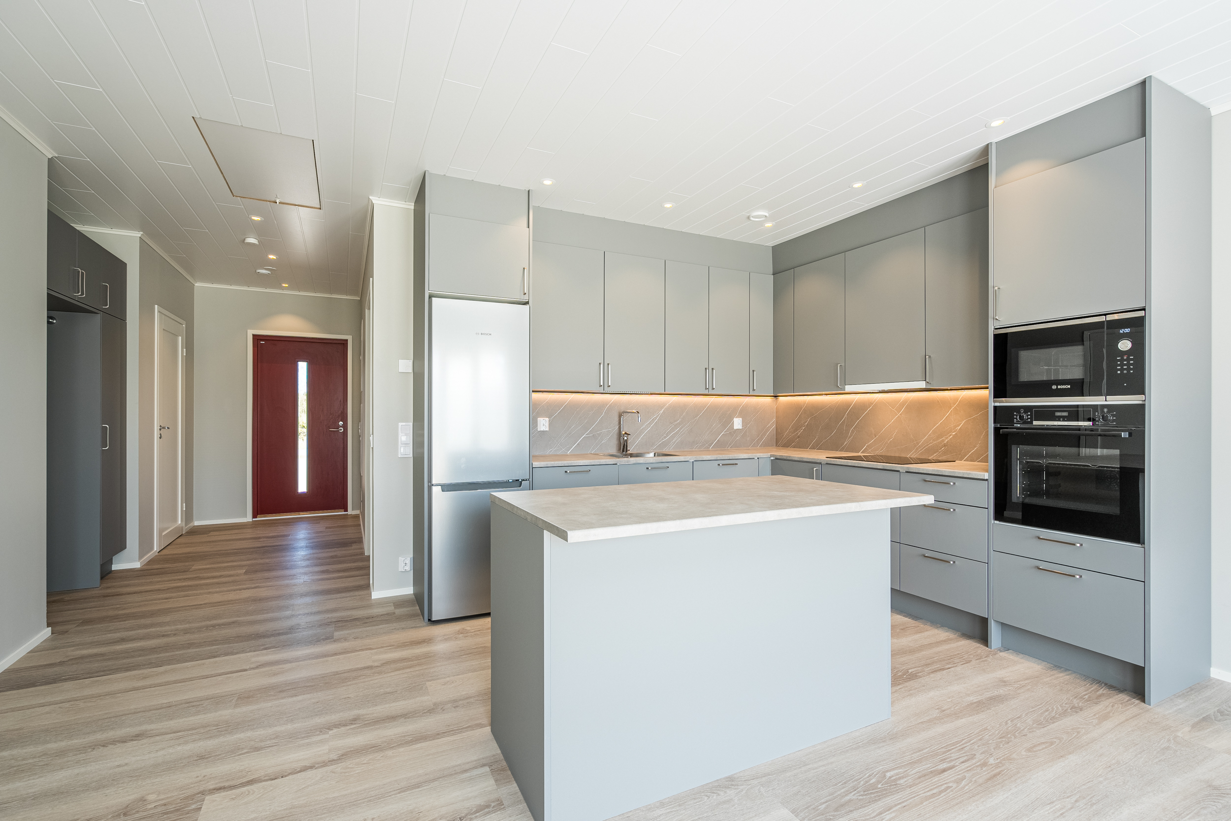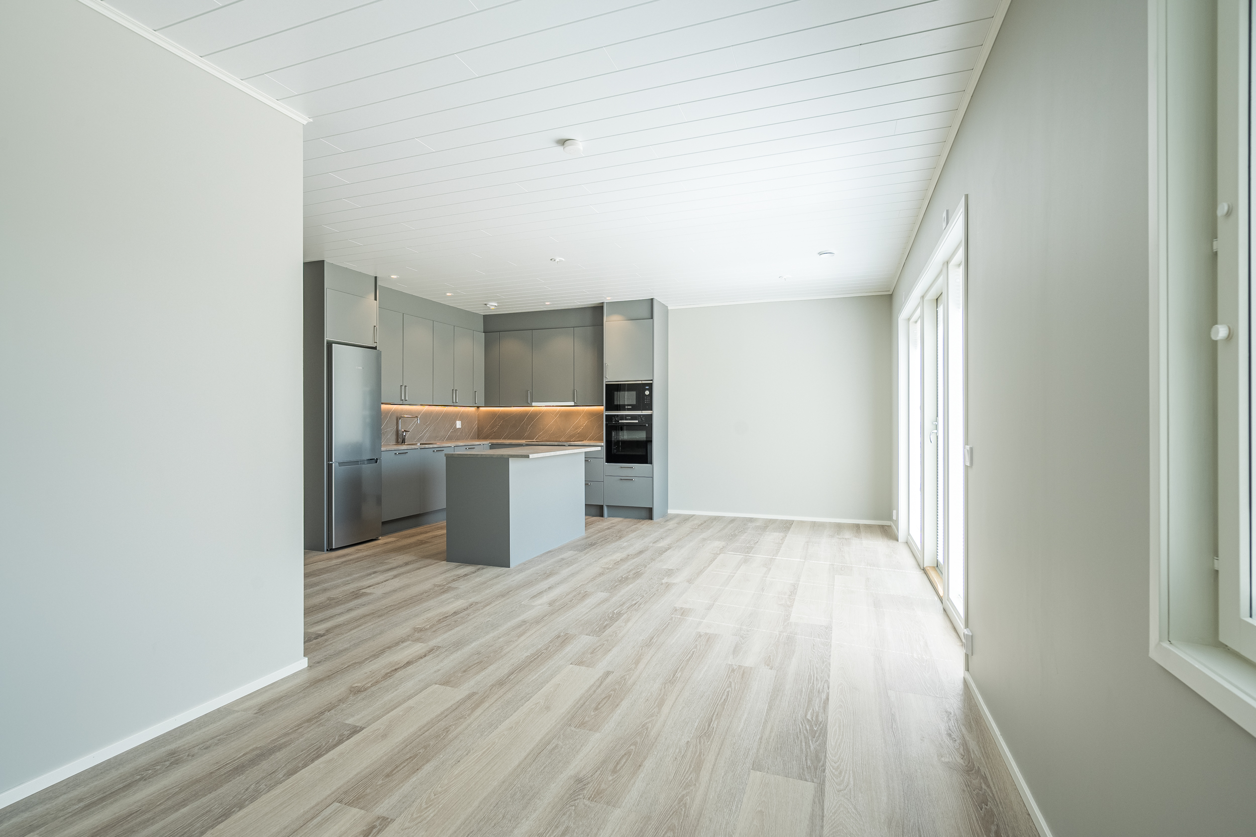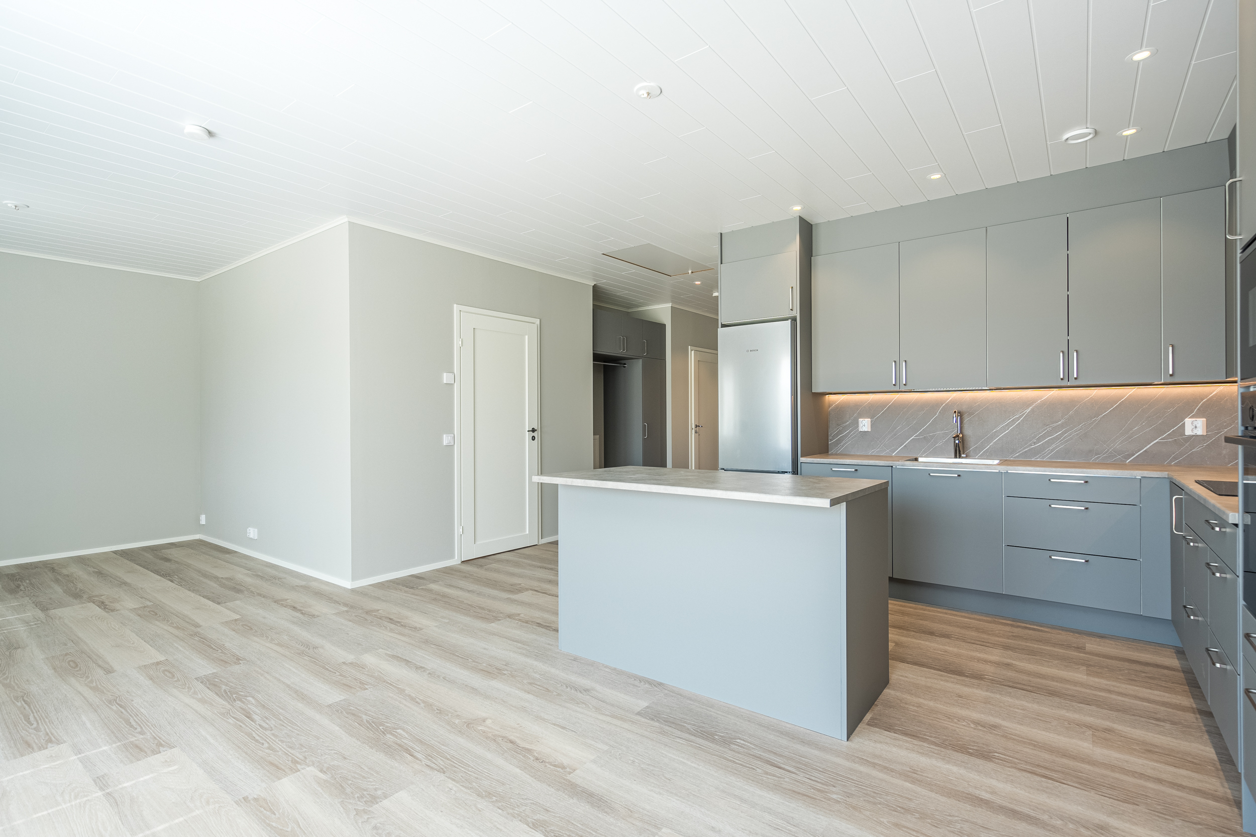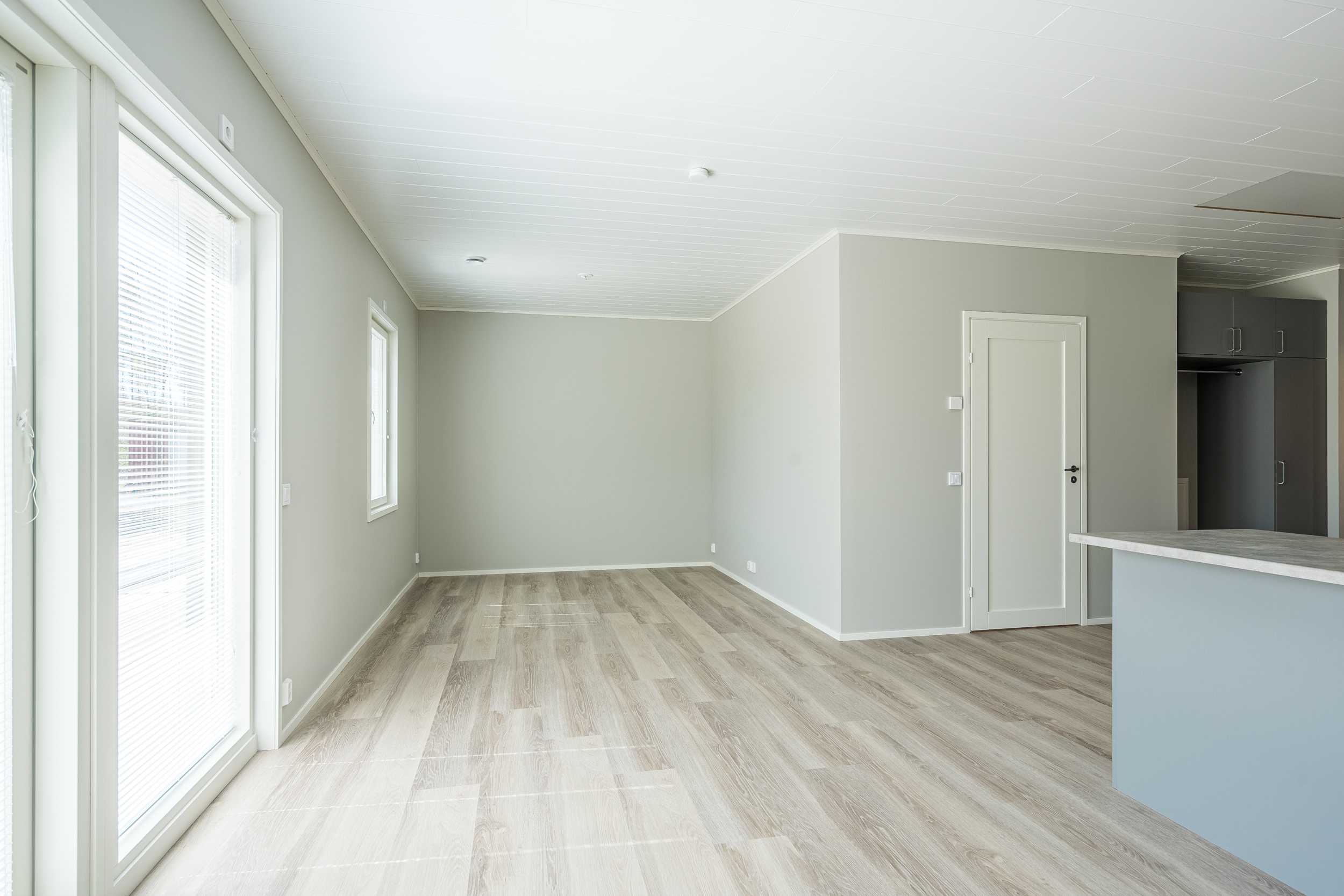Gavellägenheten är modernt och stilfullt inrett i ljusa toner med kök och inredning från finska Stark-kök. Lägenheten inrymmer kök och vardagsrum i öppen planlösning med utgång till egen terrass i fantastisk syd/väst läge samt två sovrum. Möjligheten till en tredje sovrum finns. Den helkaklade badrummet inrymmer hörndusch med glasdörrar, handfat med spegelskåp och är planerad för tvätt logistiken med bänk yta och förvaringsskåp. Huset är uppfört i element på gjuten platta med tegeltak. Uppvärmning genom Thermia luft-vatten värmepump, vattenburet till golvvärme. Lägenheten har tillgång till privat terrass och gräsmatta.