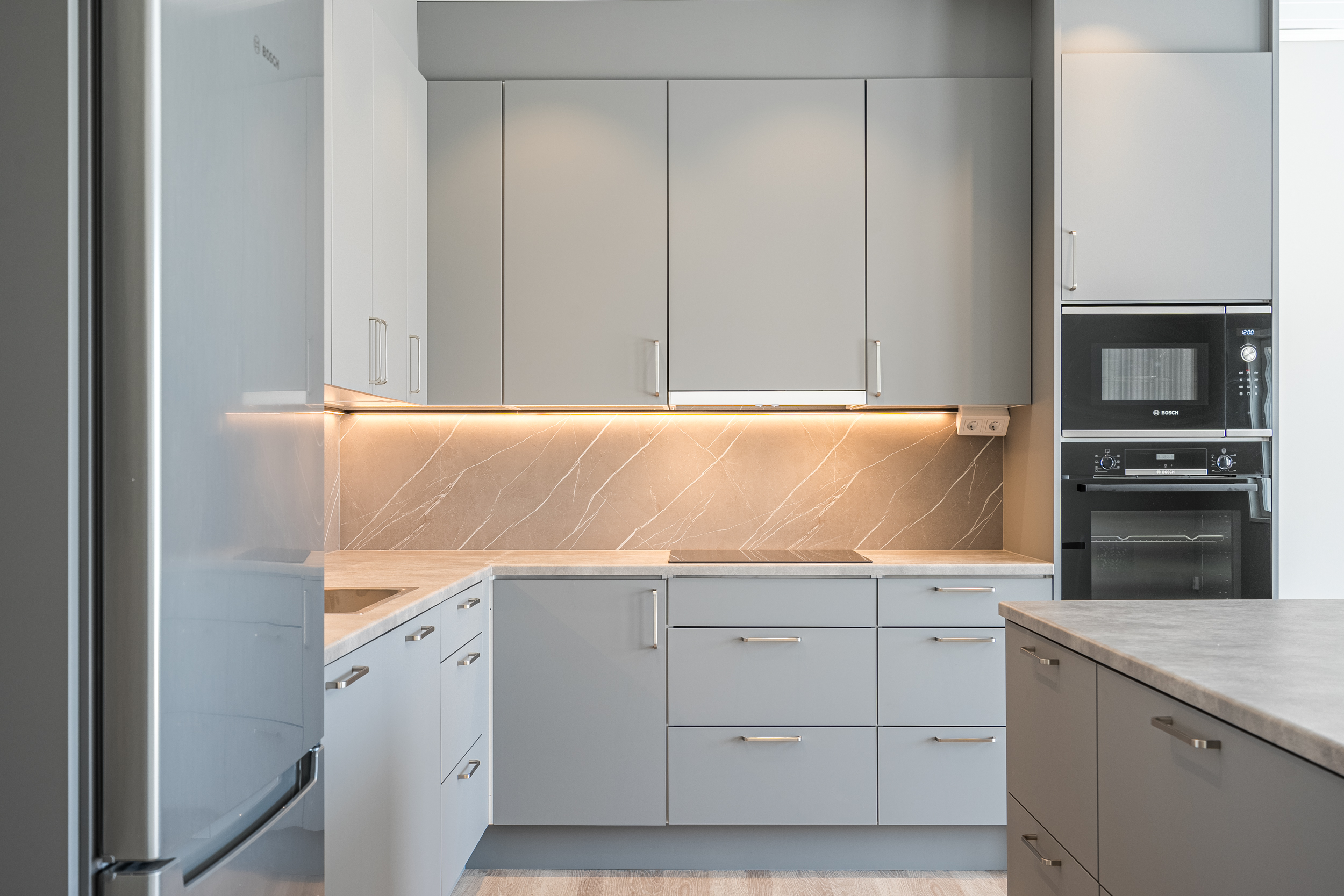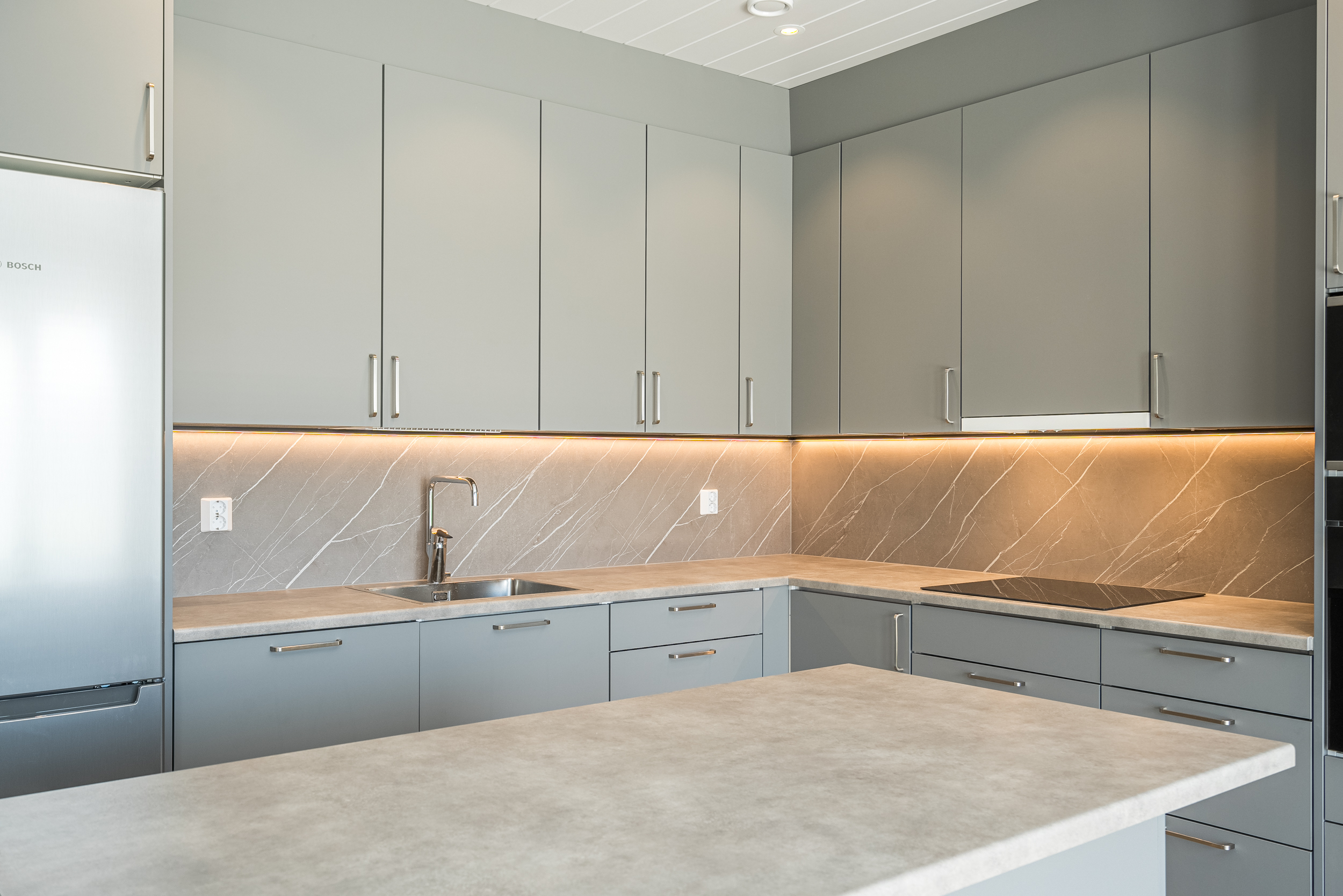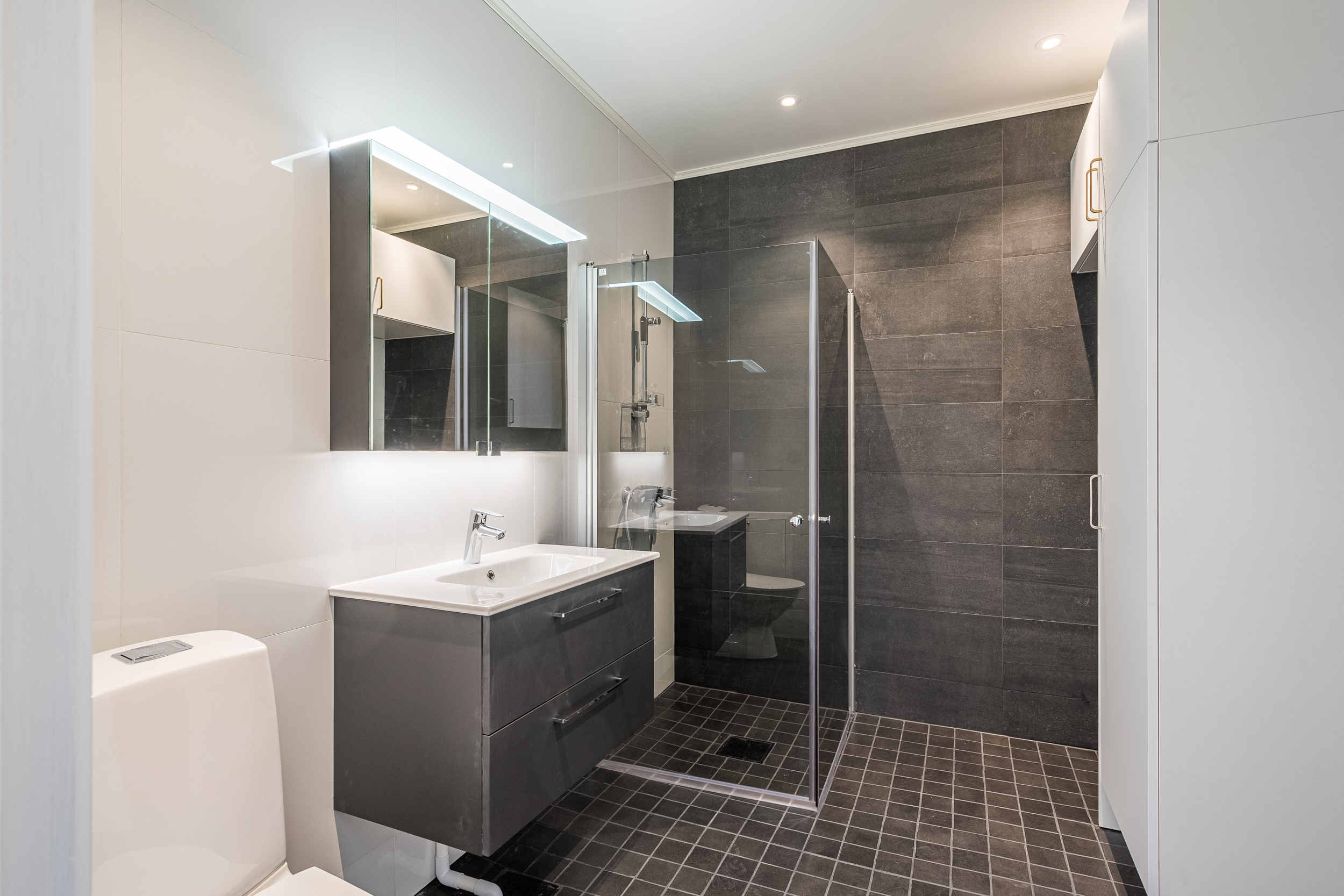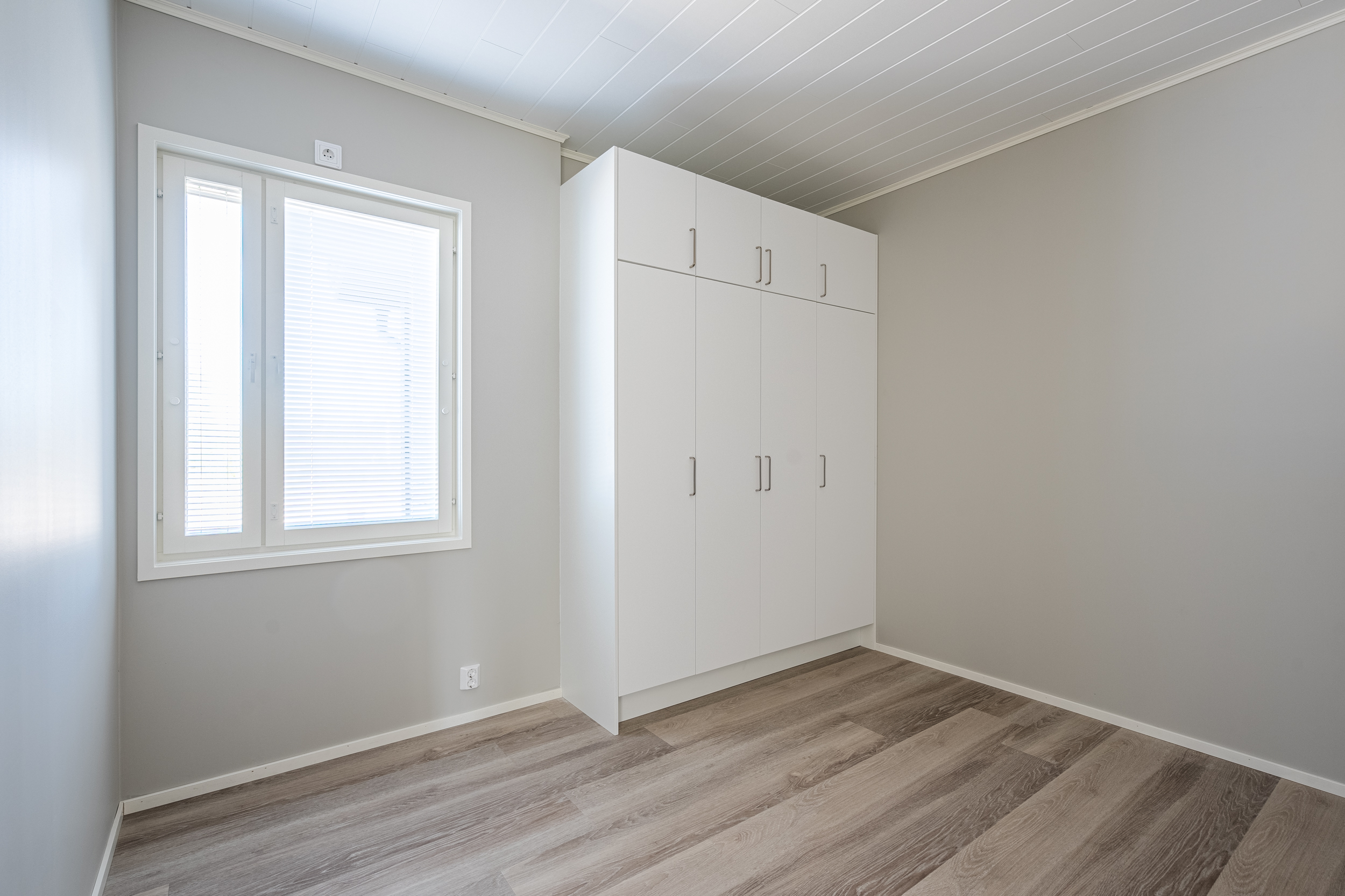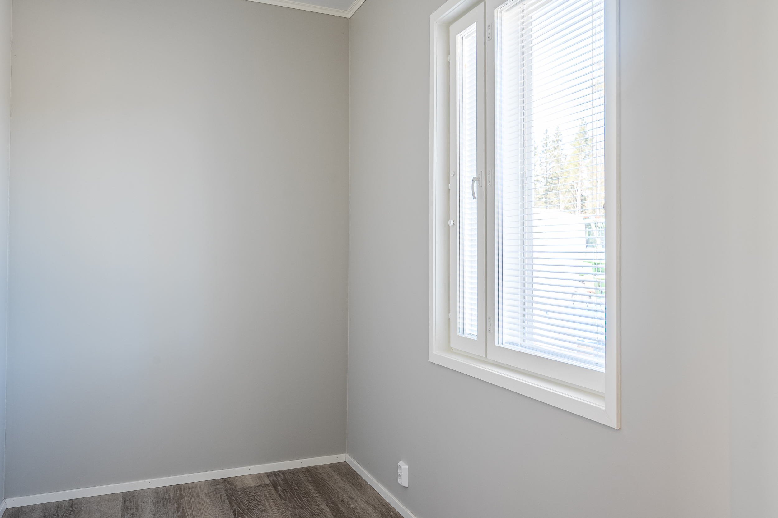 Gavellägenheten är modernt och stilfullt inrett i ljusa toner med kök och inredning från finska Stark-kök. Lägenheten inrymmer kök och vardagsrum i öppen planlösning med utgång till egen terrass i fantastisk syd/väst läge samt två sovrum. Möjligheten till en tredje sovrum finns. Den helkaklade badrummet inrymmer hörndusch med glasdörrar, handfat med spegelskåp och är planerad för tvätt logistiken med bänk yta och förvaringsskåp. Huset är uppfört i element på gjuten platta med tegeltak. Uppvärmning genom Thermia luft-vatten värmepump, vattenburet till golvvärme. Lägenheten har tillgång till privat terrass och gräsmatta.