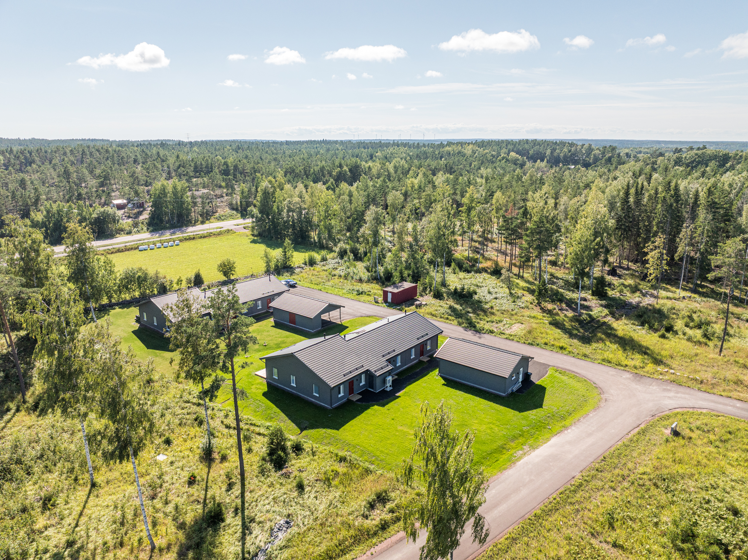 Utemiljö: Lägenheten har egen plats i carport med eget förråd. Gården planeras med asfalterad infart och gräsmatta. Radhuset är belägen i närhet till lanthandel med post, bank och busshållsplats som tar dig in till Mariehamn samt till Berghamn och Eckerölinjens färjeterminal.