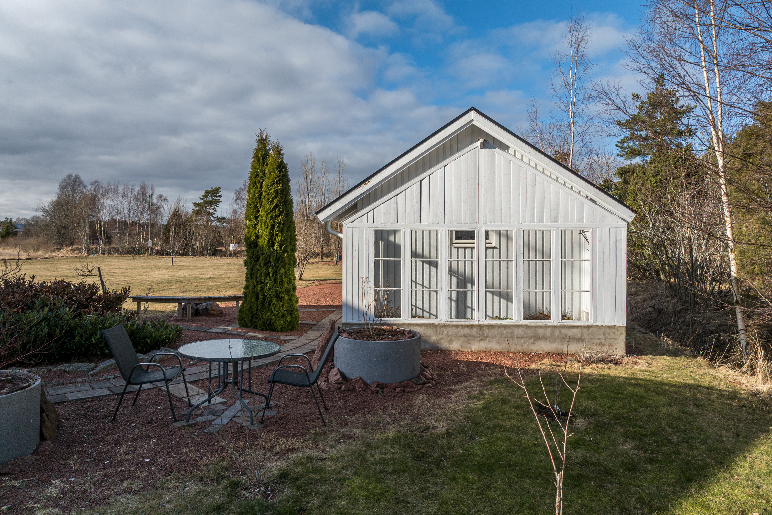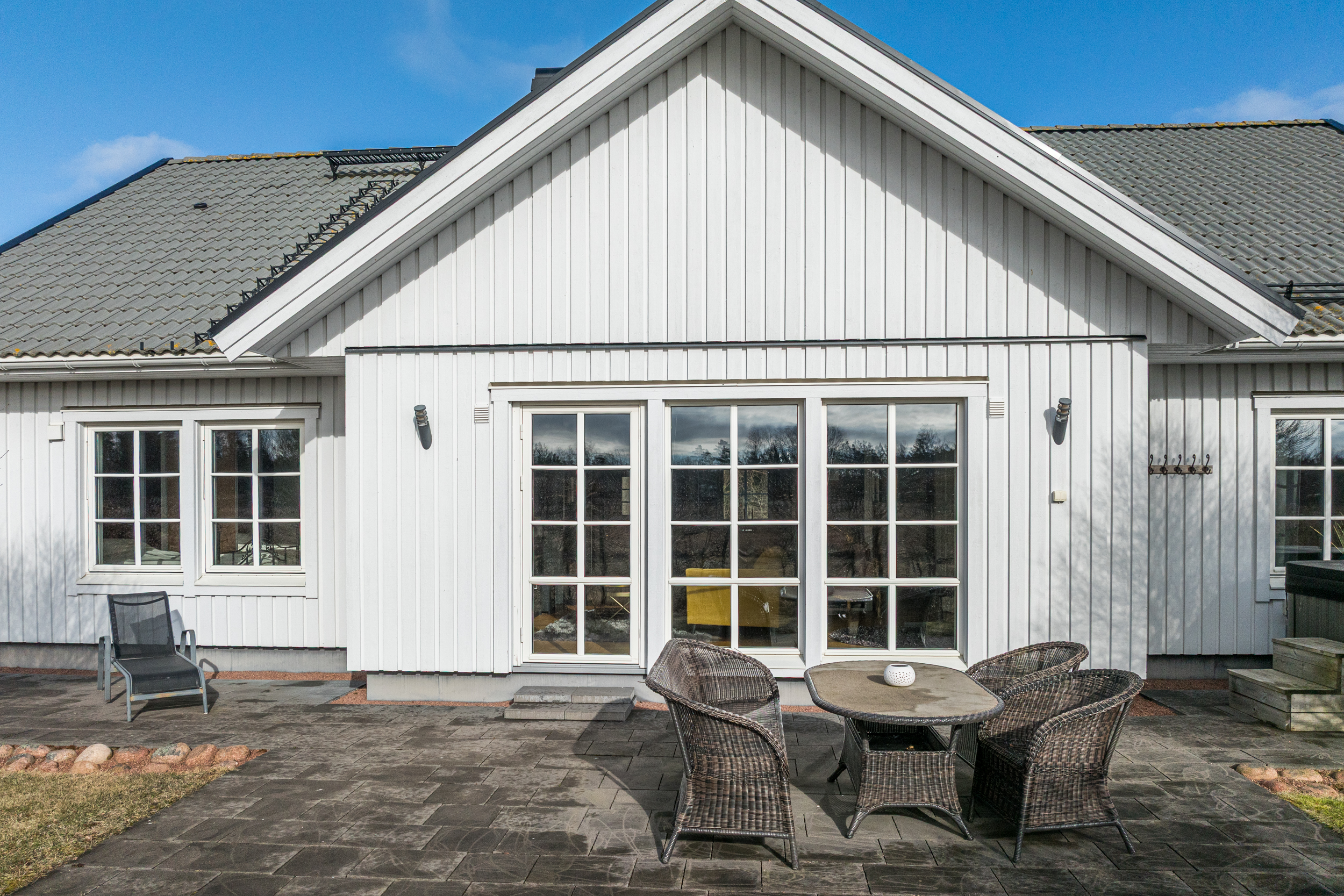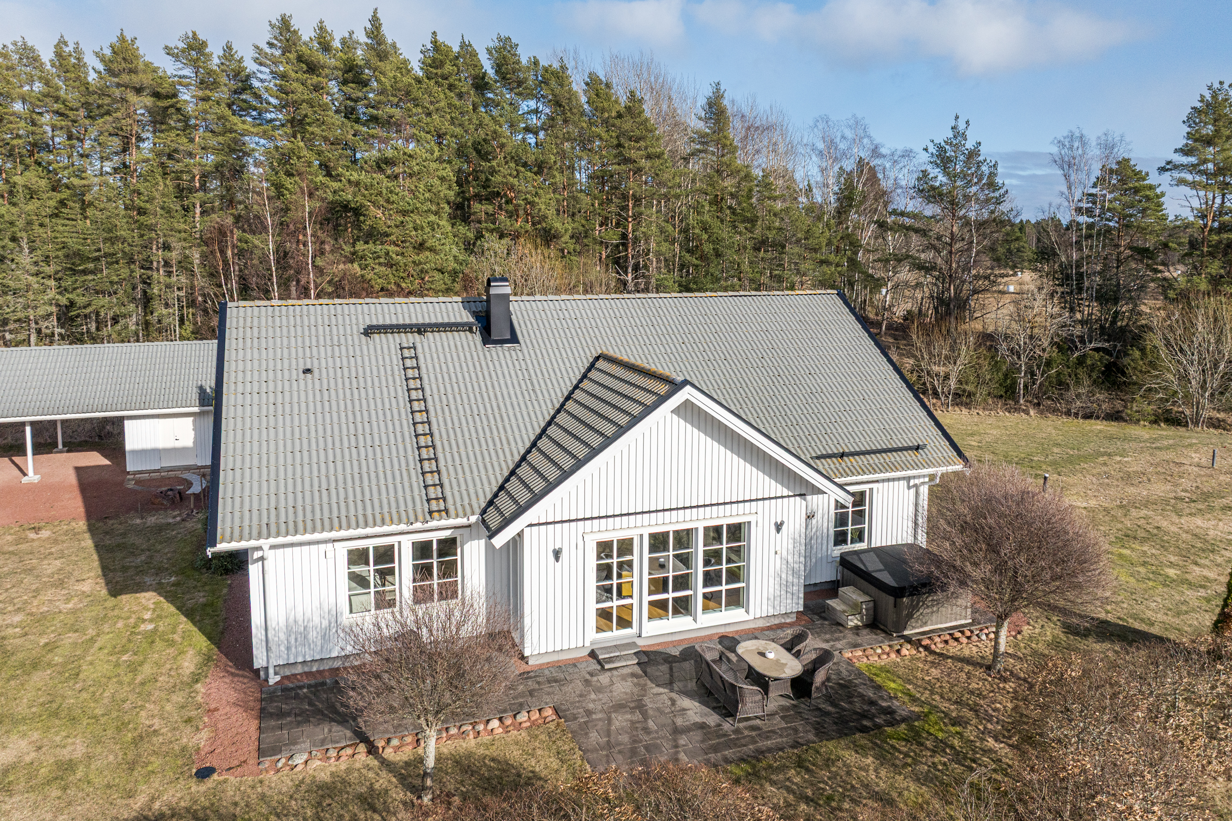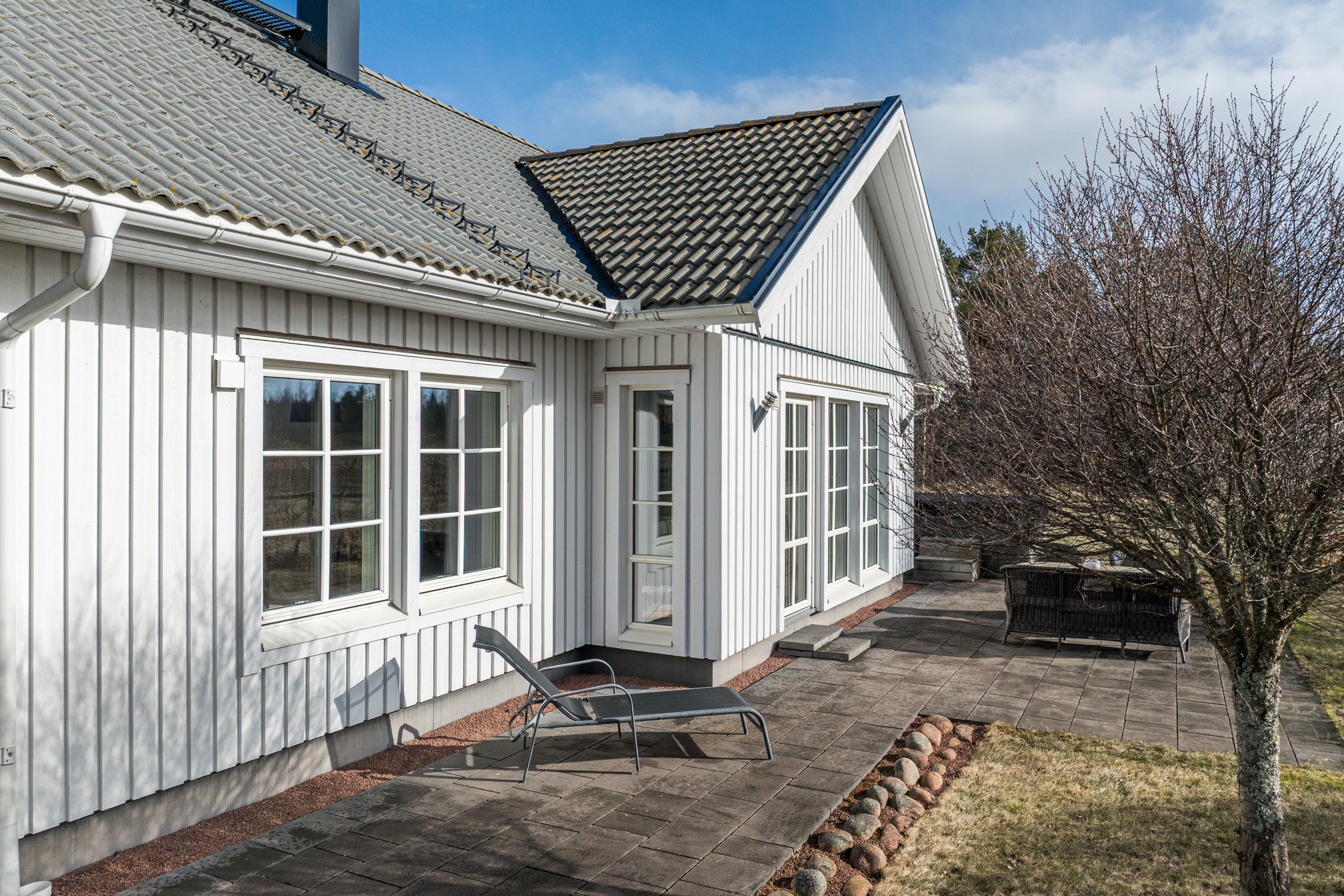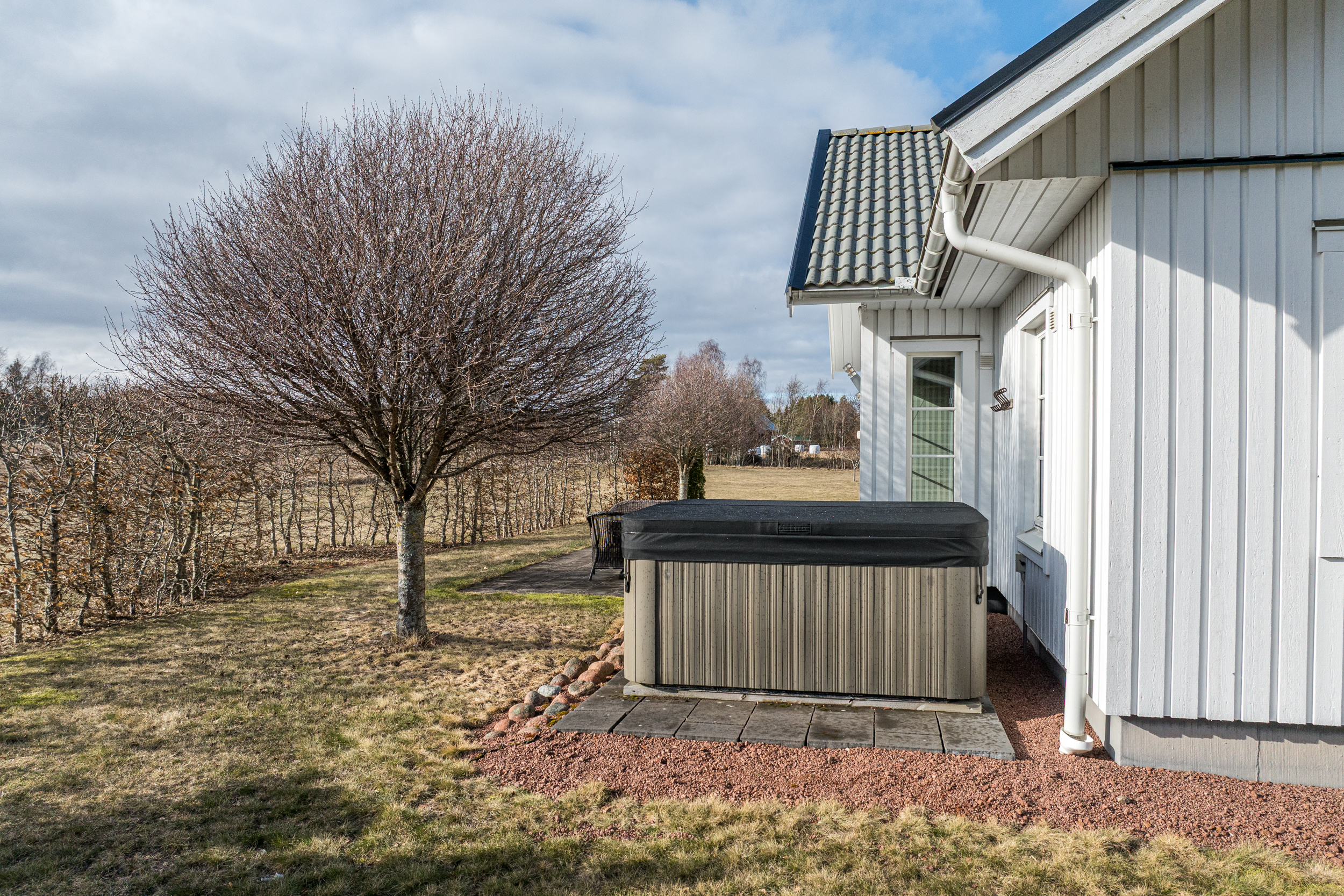 Från bostaden nås uteplats i västerläge där en jacuzzi installerats – en kvalitetsfaktor som förlänger användningen av utemiljön och skapar en naturlig plats för avkoppling under stora delar av året.