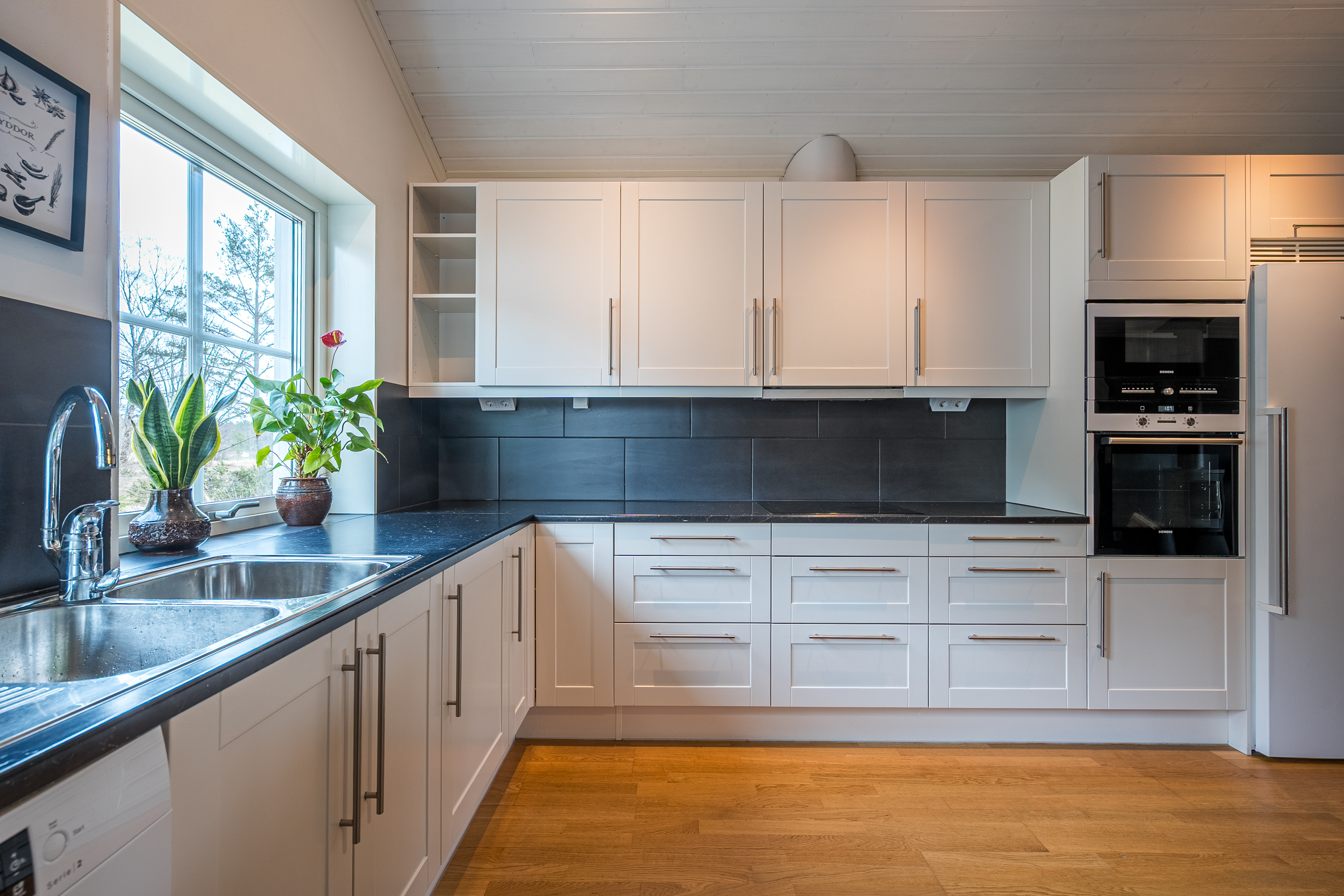 Materialvalen är enhetliga och tidlösa. Parkettgolv återfinns i bostadsdelarna medan hall och våtutrymmen är försedda med klinker. Köket är utformat med fokus på funktion och arbetsflöde, med goda arbetsytor och förvaring.