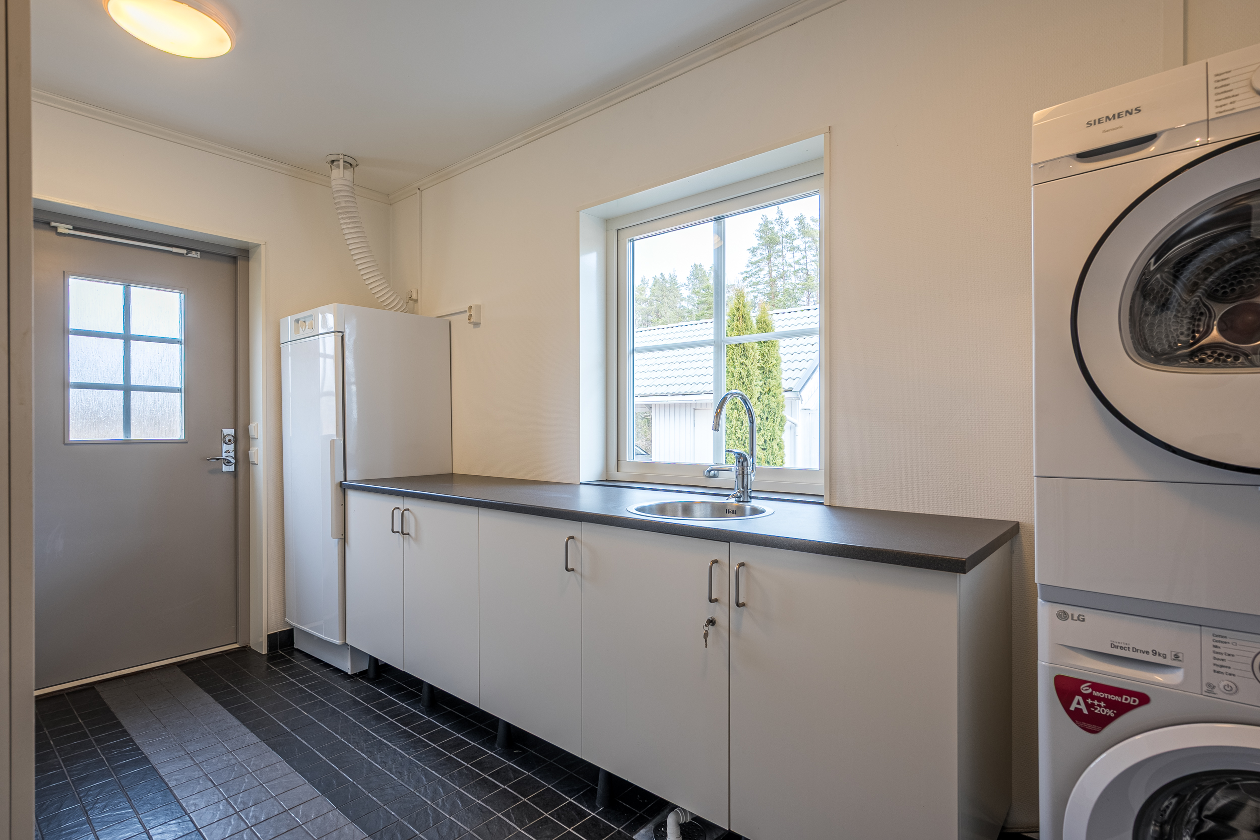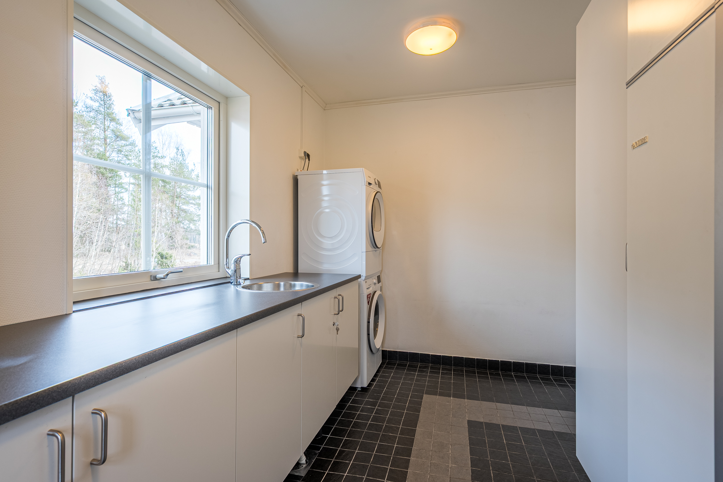Bostaden inrymmer tre sovrum, med möjlighet att nyttja arbetsrummet som ett fjärde sovrum vid behov, vilket ger en flexibel helhet över tid. Därtill finns två helkaklade badrum, varav ett med badkar, samt ett funktionellt klädvårdsrum som underlättar vardagens logistik.