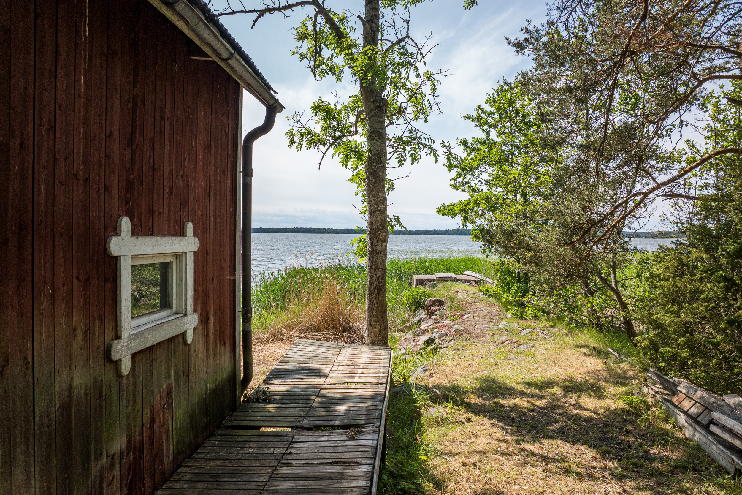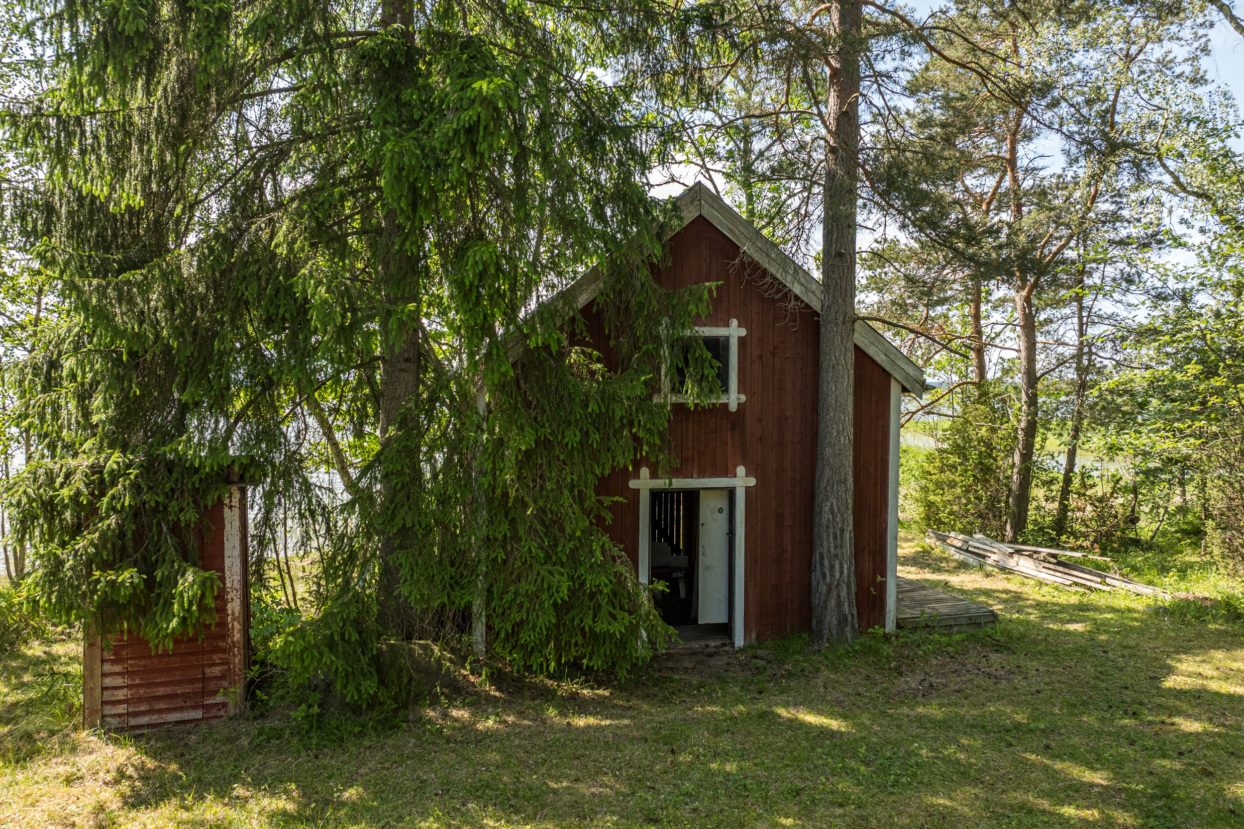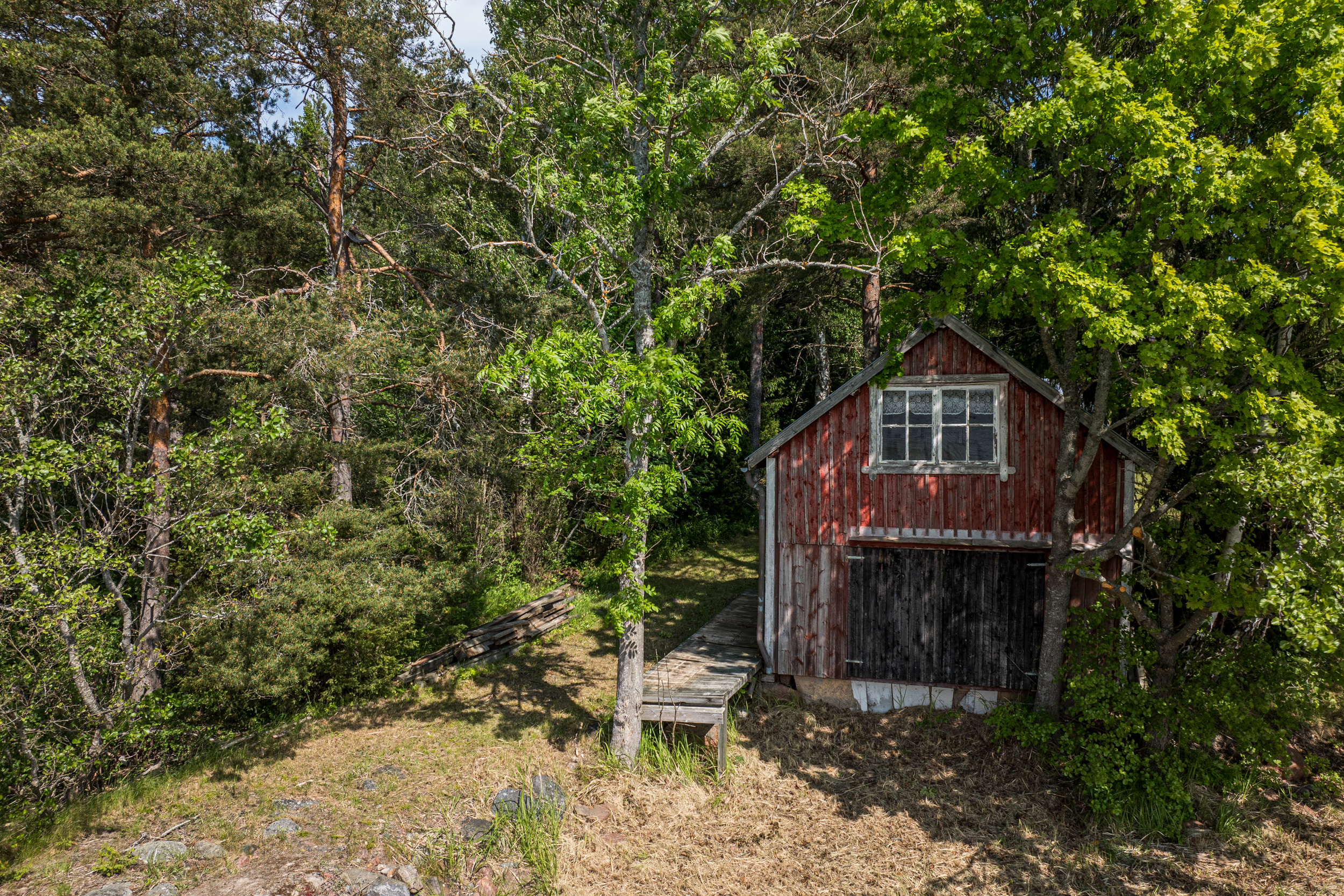 Båthus som står torrt uppe på land. Båthuset inrymmer även ett inrett loft som använts som gästrum tidigare.