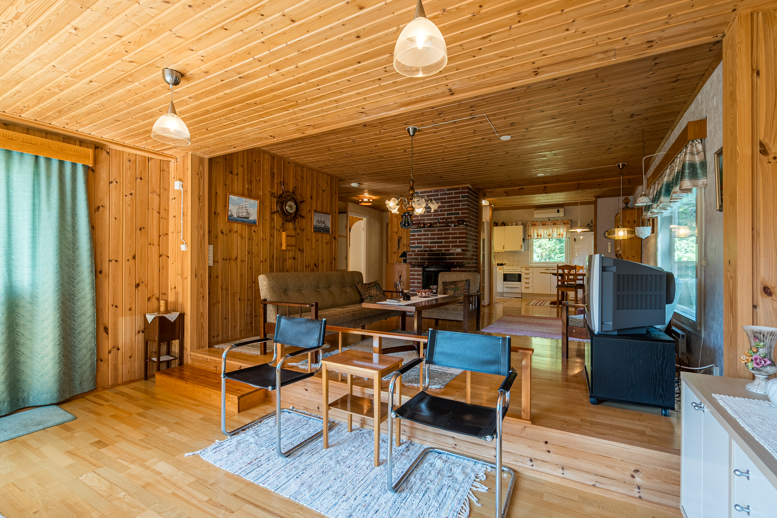 Vardagsrum i etage där man från nedre etage har utgång till terrass. I det övre etaget kan man njuta en brasa i den öppna spisen med insats. Öppen planlösning till kök med vit skåpinredning samt kaklad vägg ovan arbetsbänk. Köket är utrustat med rostfri diskbänk, spis/ugn, köksfläkt, kyl & frys samt diskmaskin. I köket sitter även luftvärmepumpen.