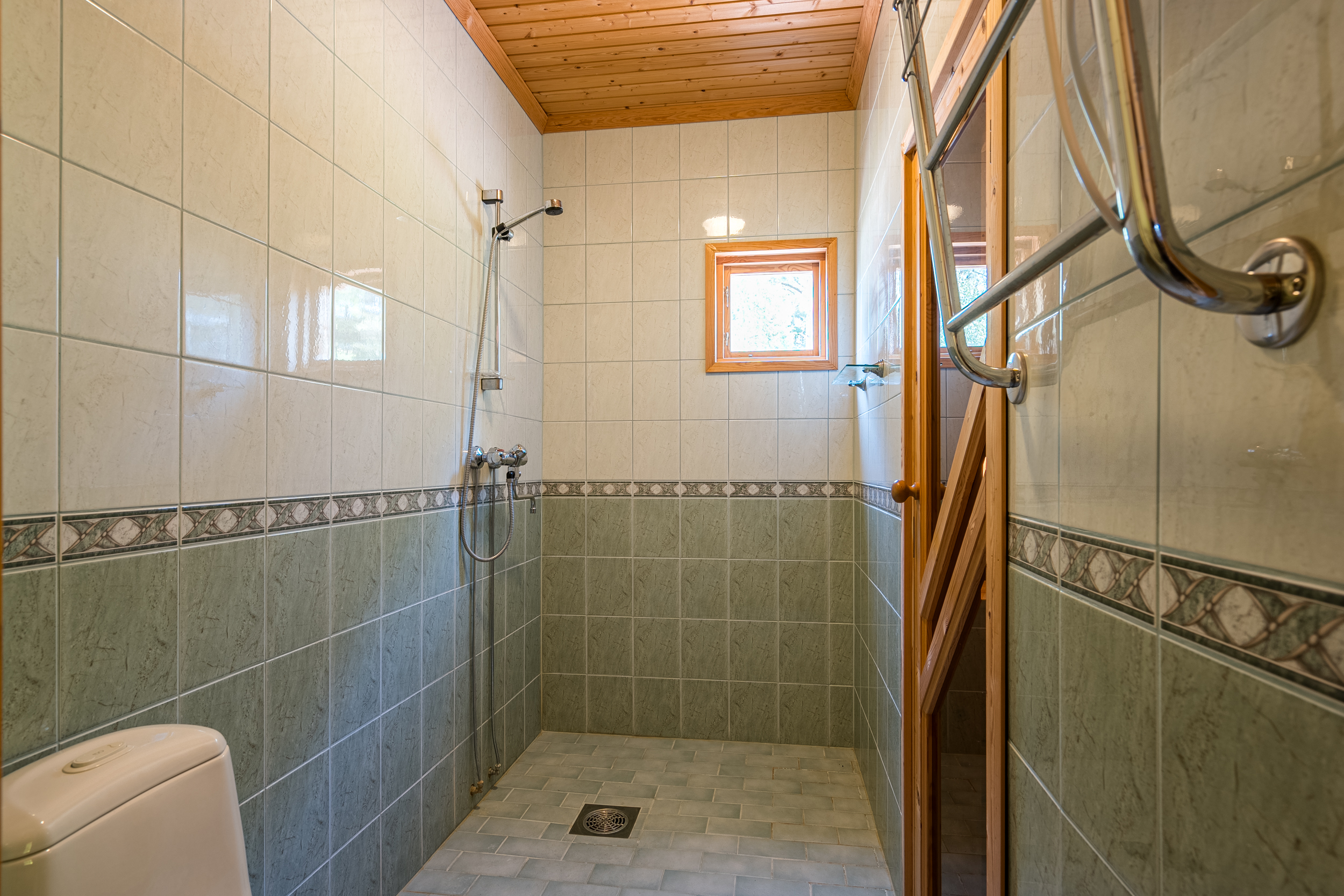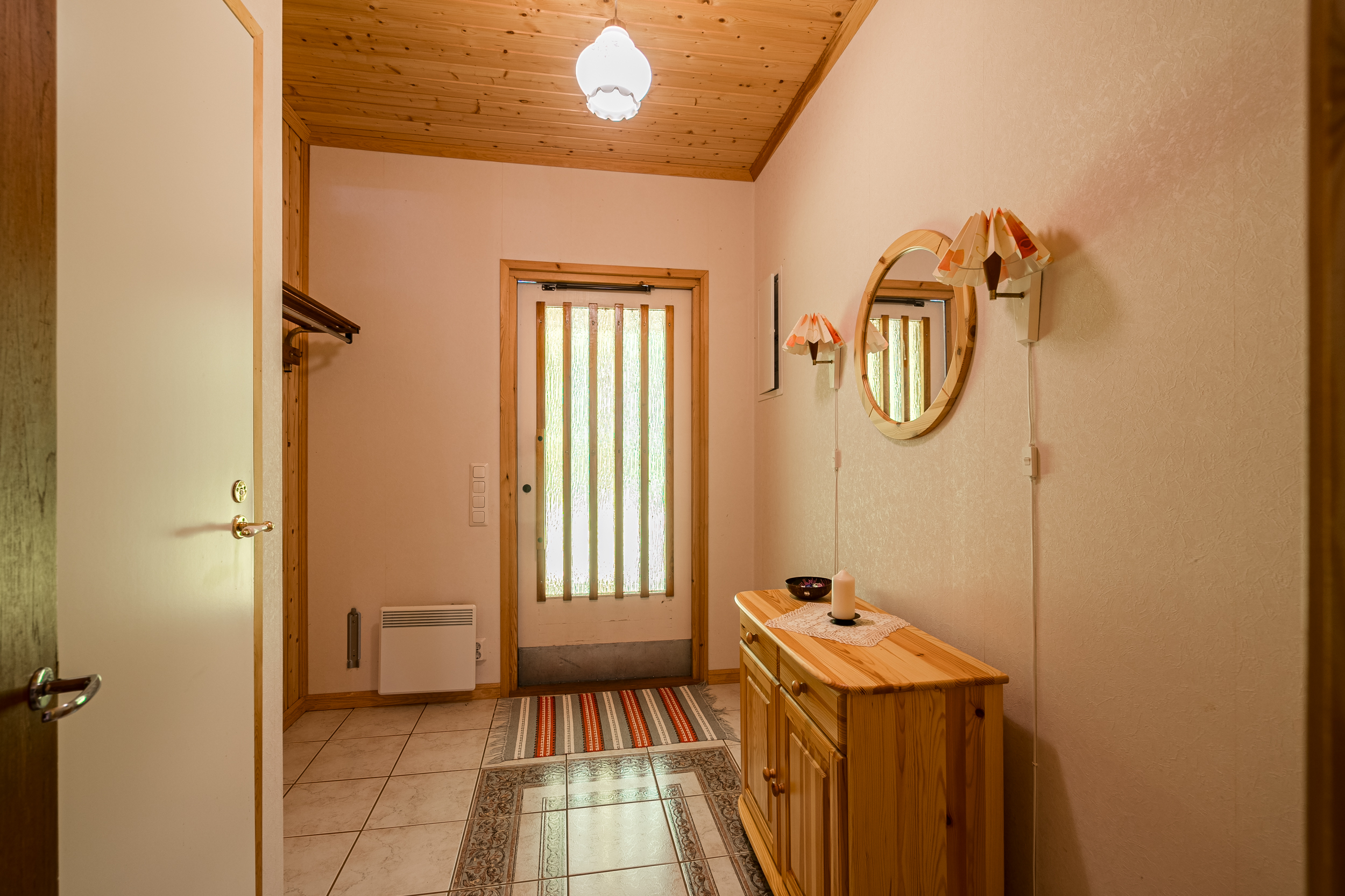 Två möjliga sovrum med garderober. Helkaklat badrum som inrymmer dusch, toalett samt anslutande bastu med el-aggregat. Separat toalett finns mellan sovrummen. Hall med klinkergolv och plats för avhängning av ytterkläder.