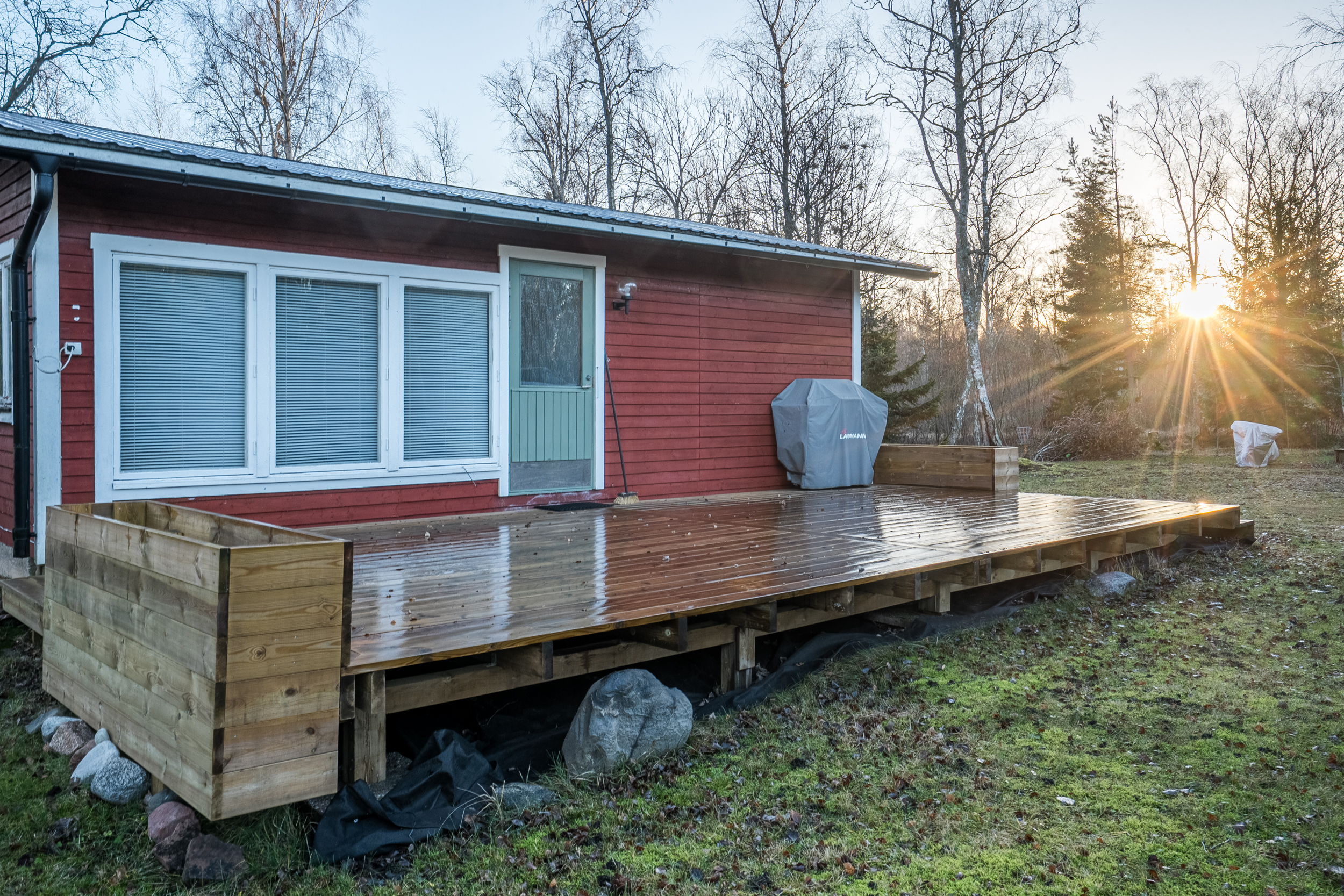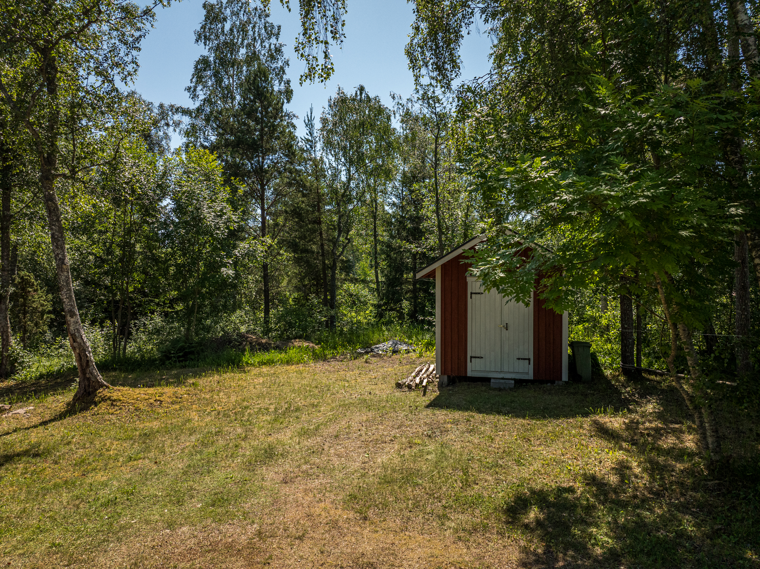 Den välskötta tomten om 4 050 m² bjuder på gott om utrymme för både lek och trädgårdsliv, samtidigt som den omgivande naturen skapar en avkopplande inramning.