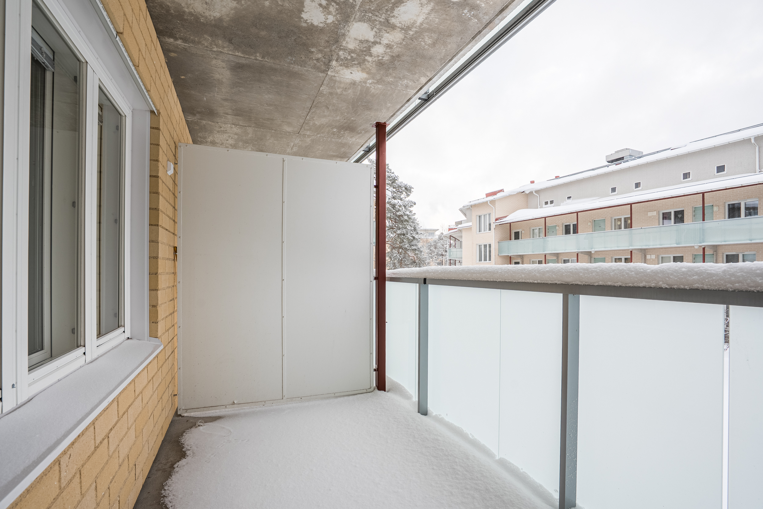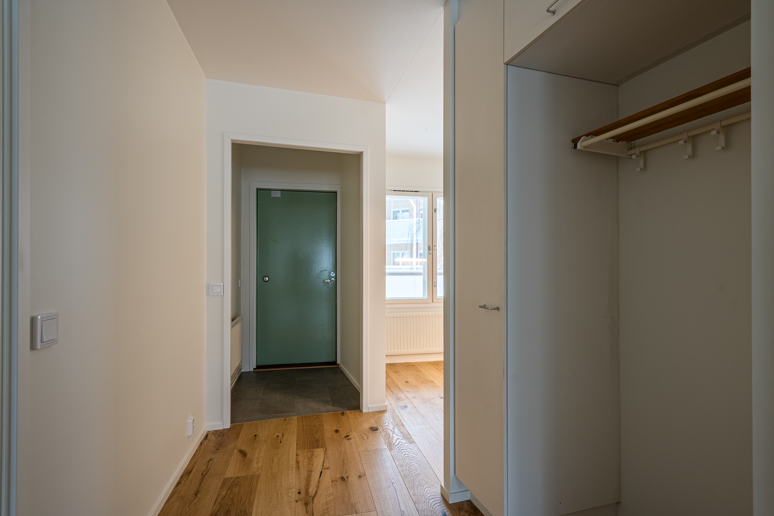 Aktielägenheten inrymmer entréhall med klädavhängning och garderober. Rejält badrum med helkaklade väggar och klinker samt plats för tvättmaskin, kommod med lådor och spegelskåp. Sovrummet är stort och luftigt med helvägg med garderober. Köket har nymålade skåp, kakel, bänkskivor och vitvaror inklusive diskmaskin. Lättmöblerat och öppet vardagsrum med utgång till rymlig balkong med söderläge.