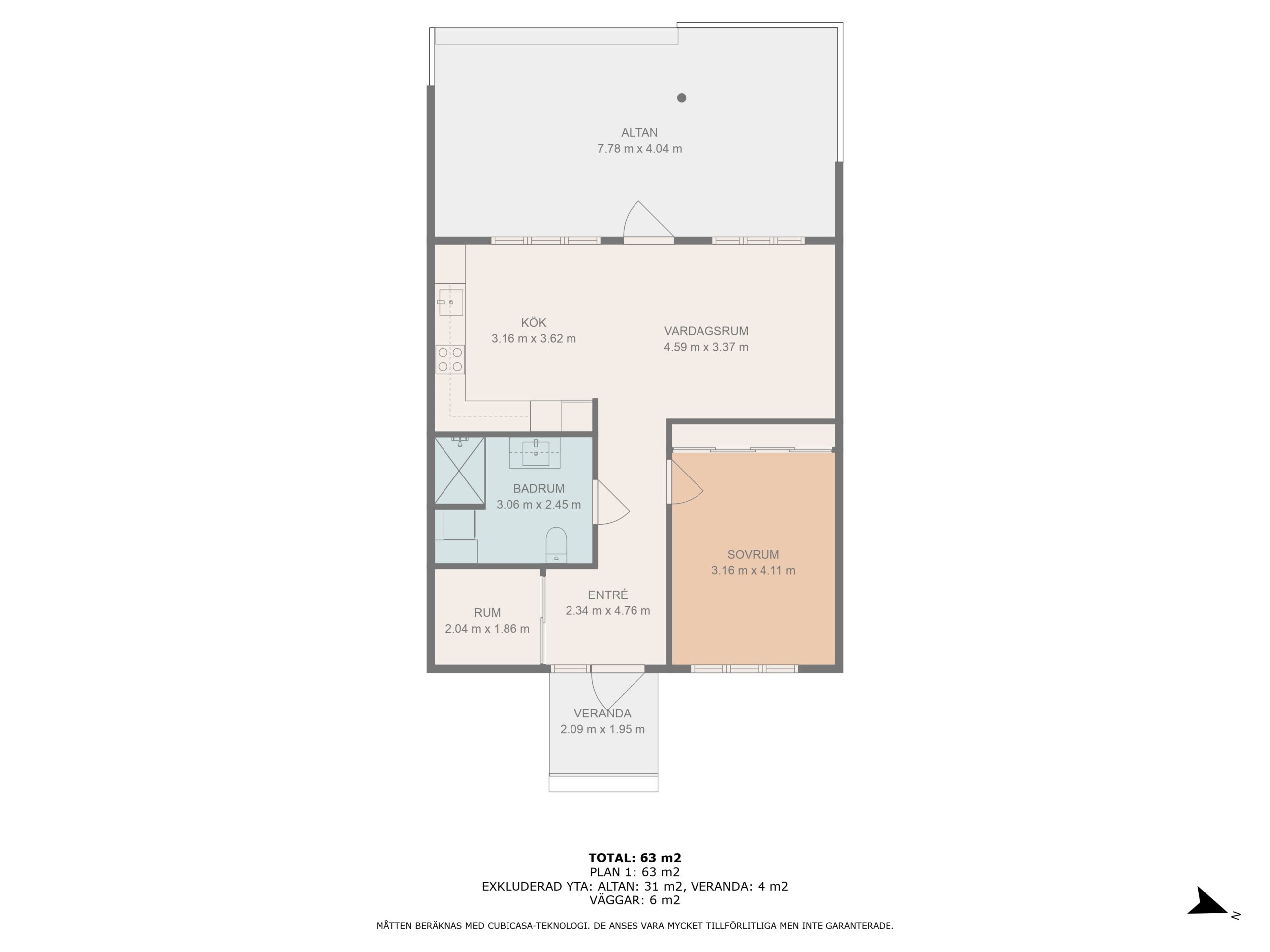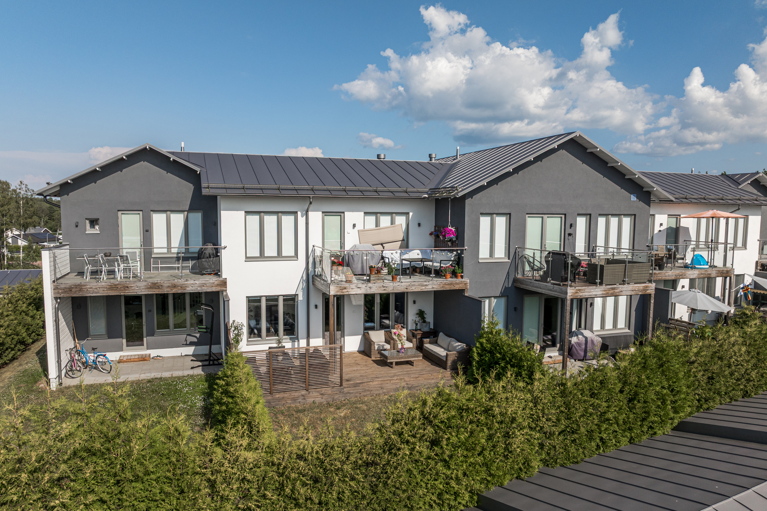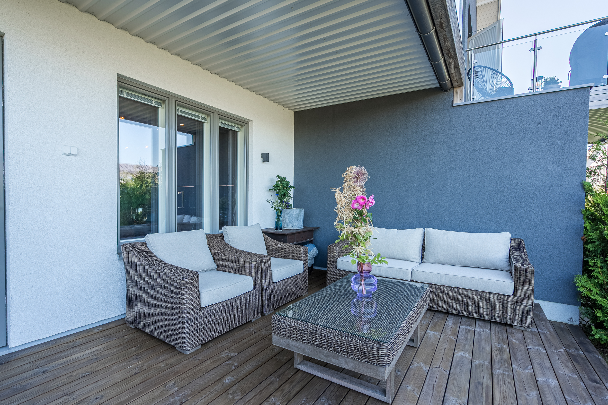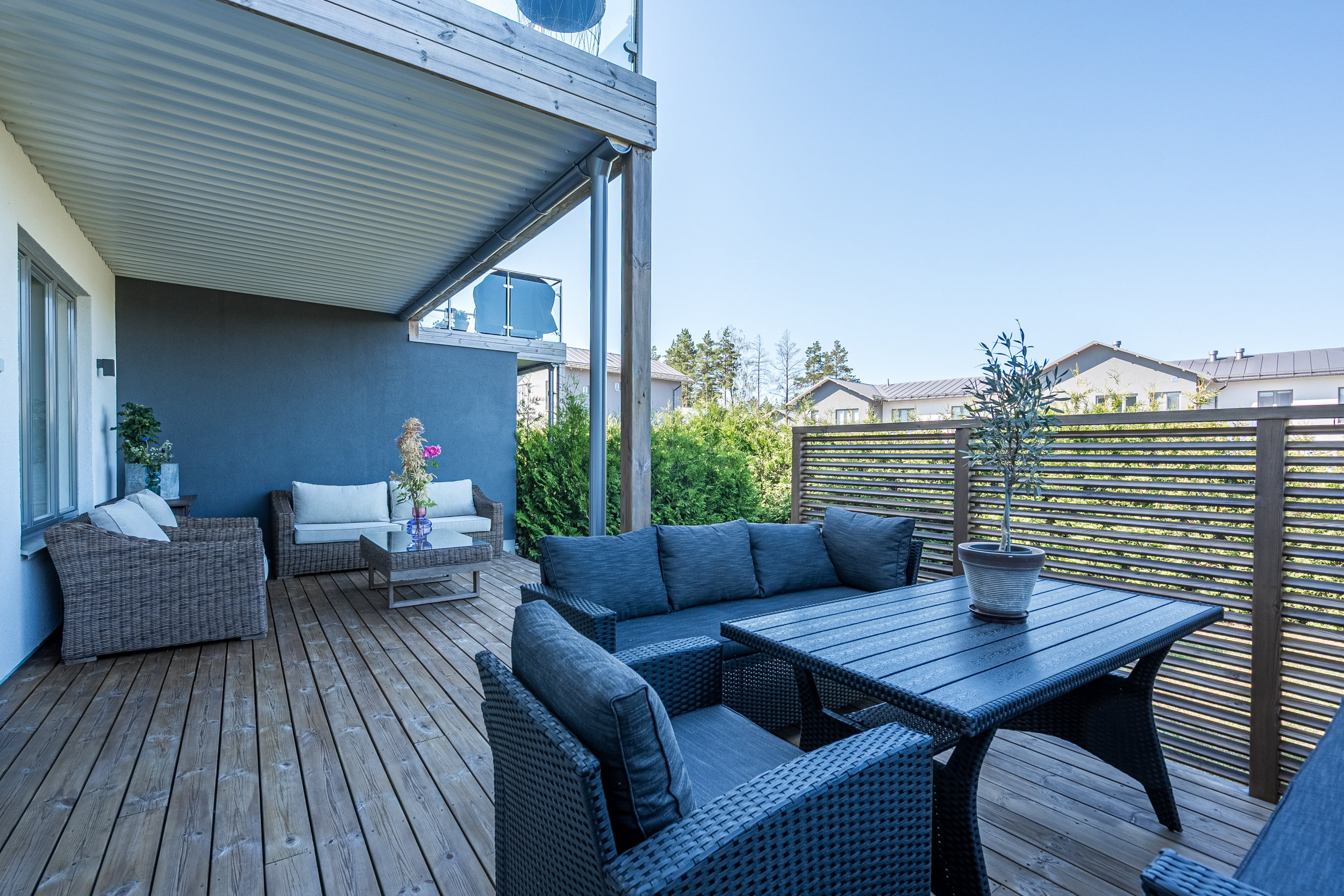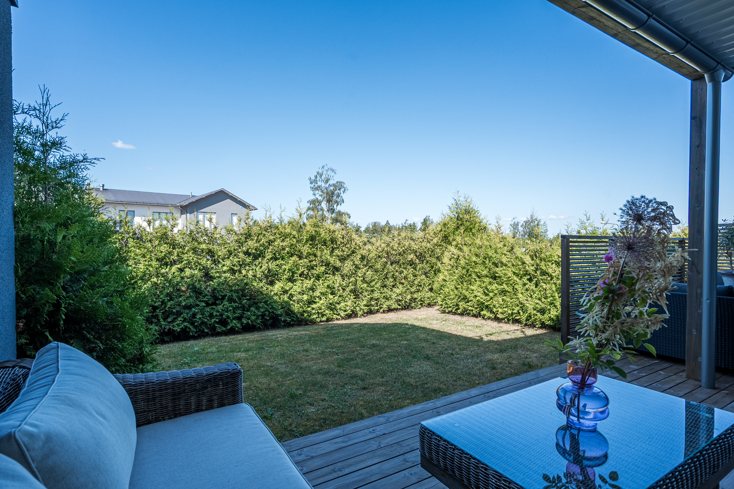 Vardagsrum och kök har en öppen planlösning med stora fönster som ger fint ljusinsläpp. Köket är bra disponerat med matplats, fullt utrustat med moderna vitvaror och gott om arbetsyta och förvaring. Från vardagsrummet har du direkt utgång till en altan i solsäkert västerläge, med delvis spaljé, gräsmatta i anslutning och en tujahäck som skapar en avskild och insynsskyddad uteplats. Här finns utrymme för både matplats, grill och soffgrupp.