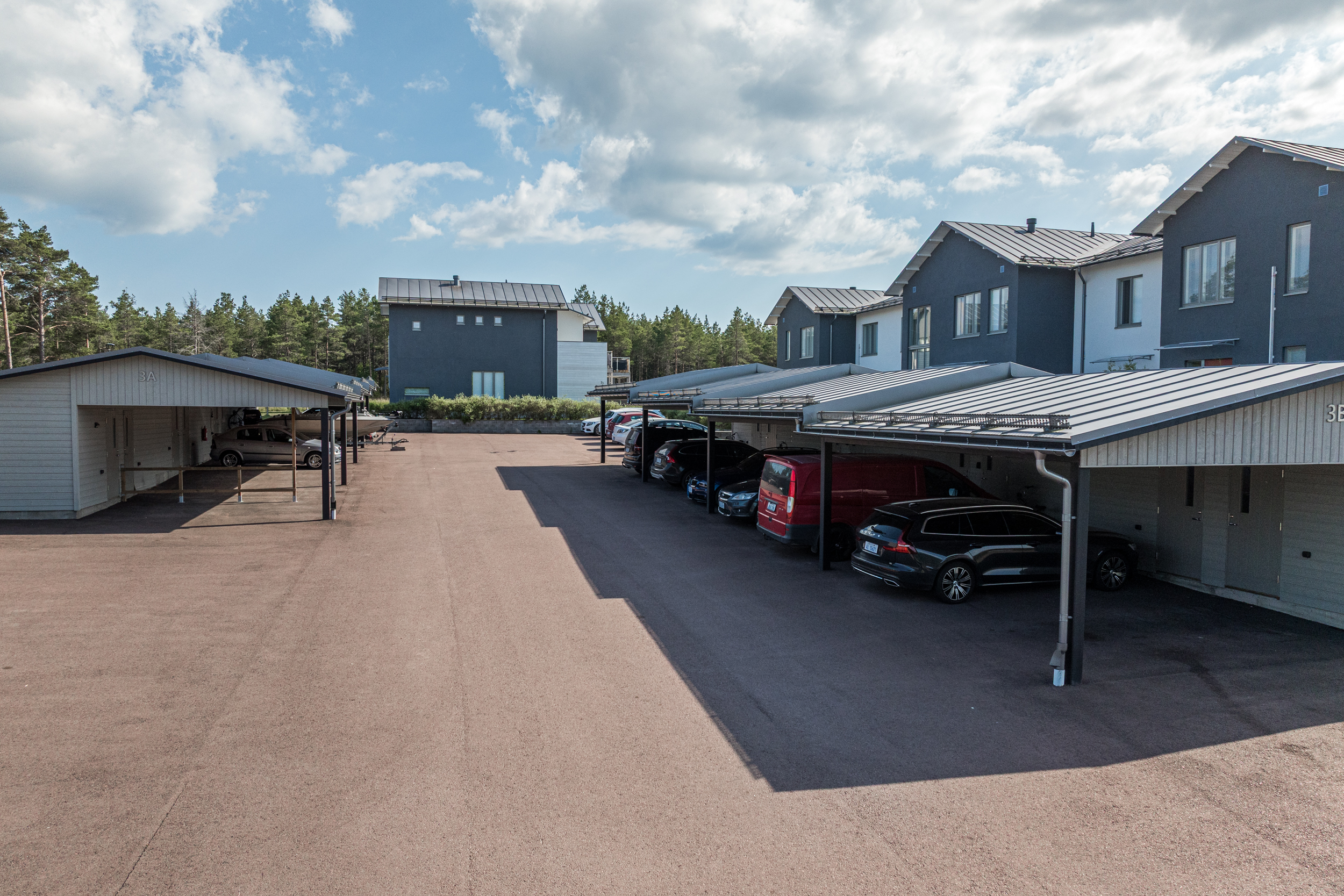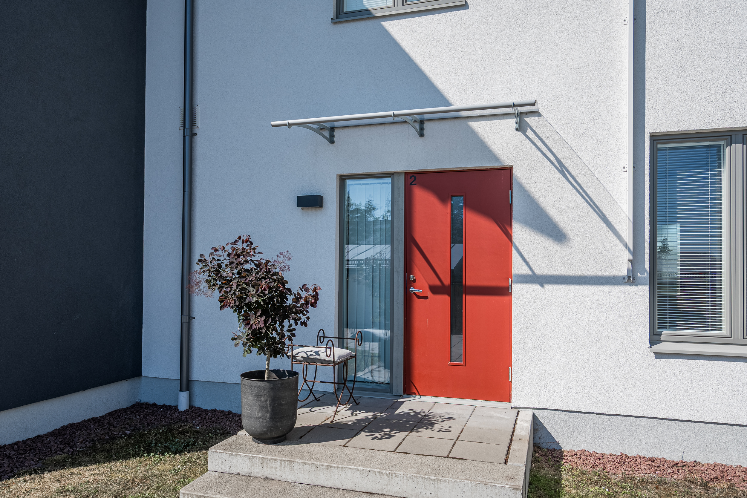 Lägenheten är belägen i markplan med en egen, välkomnande entré och en rymlig uteplats i västerläge. Till lägenheten hör ett förråd och en plats under carport – där förrådet är praktiskt inrett med hyllor som ger goda förvaringsmöjligheter. Invändigt har bostaden genomgående ljusa, målade väggar och ekparkett i 2-stav utförande, medan hallen har ett slitstarkt klinkergolv.
