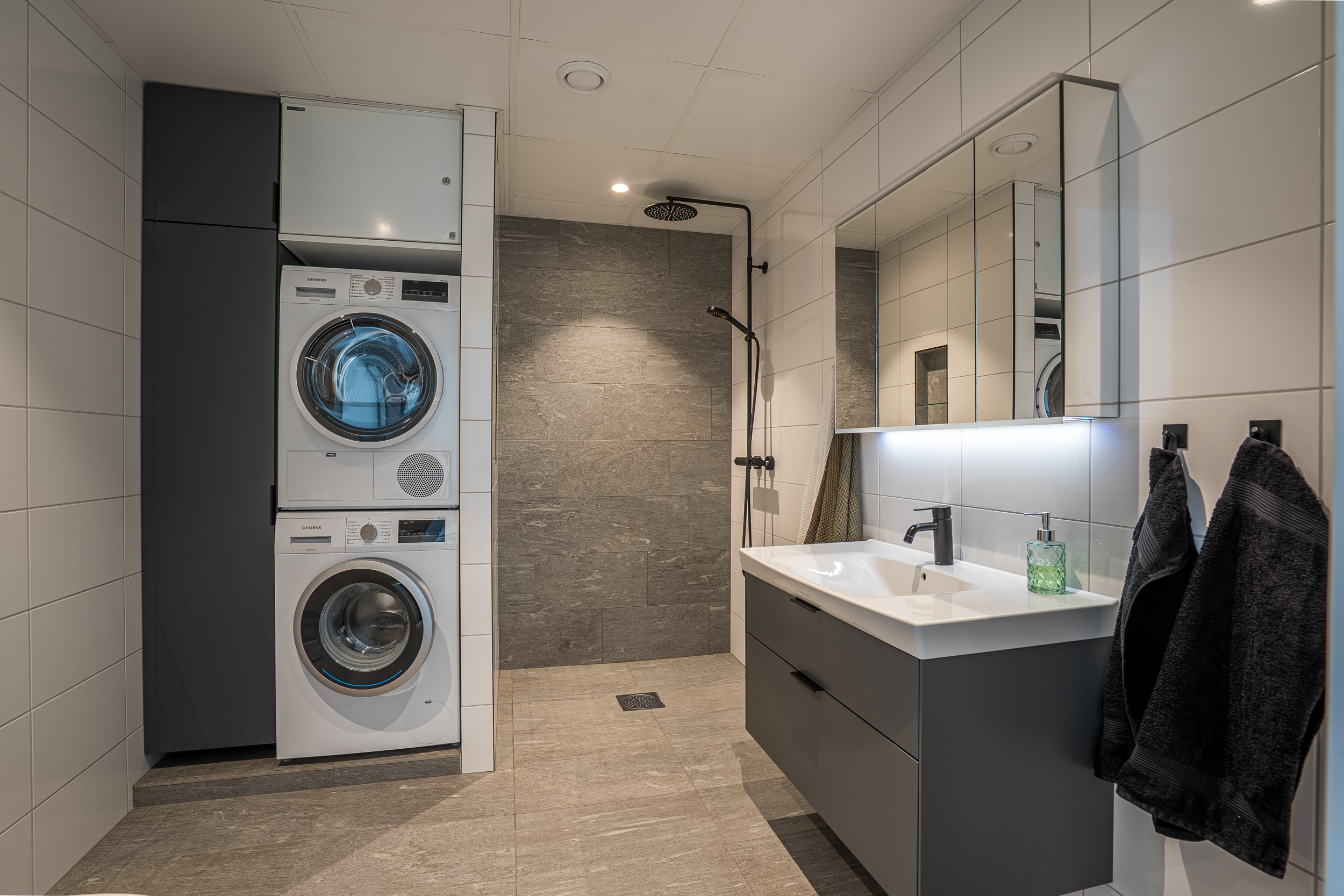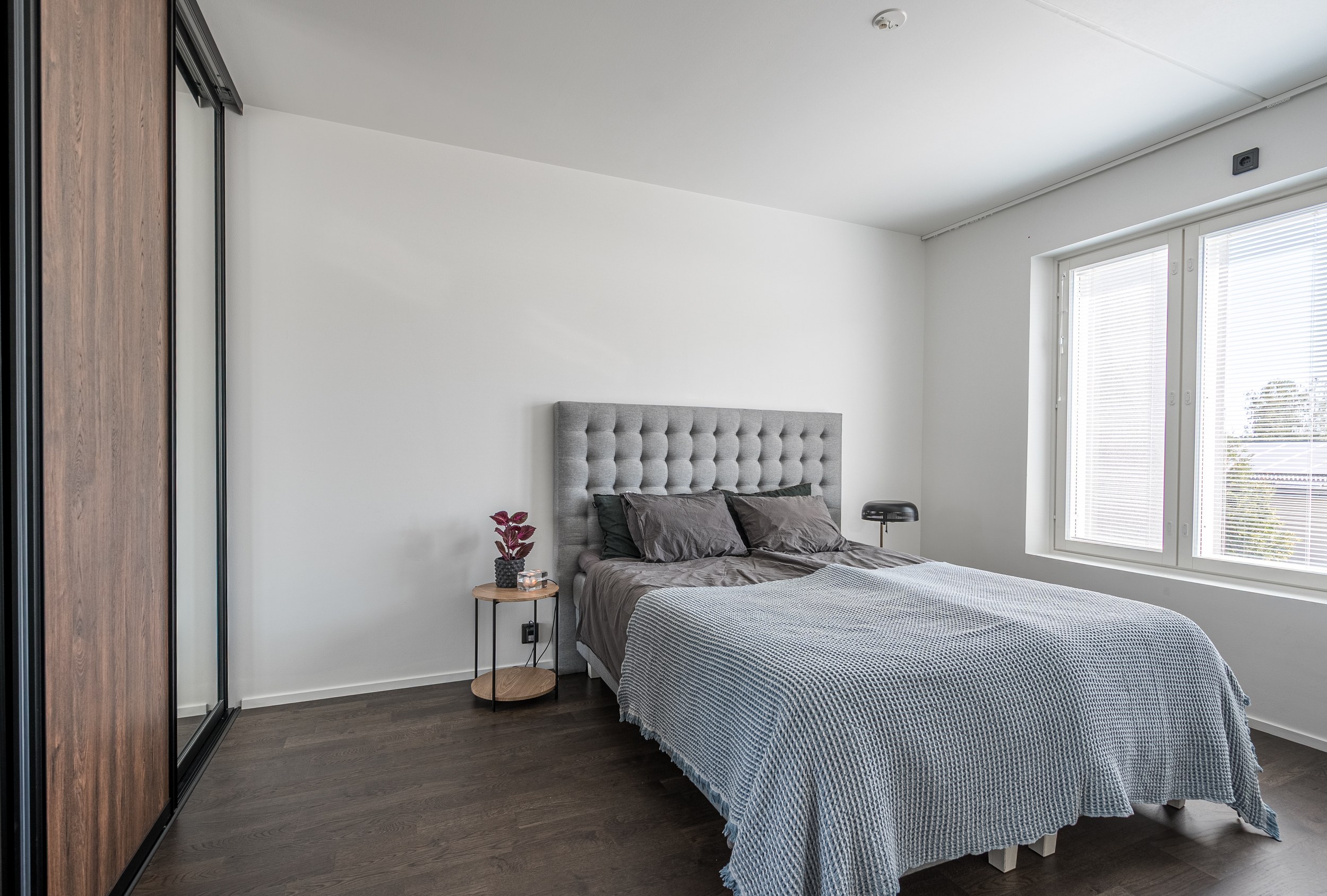 Sovrummet har plats för dubbelsäng och väl tilltagen klädförvaring bakom skjutdörrar. Det rymliga badrummet är helkaklat och inrett med takdusch, handfat med kommod, överskåp med spegelglas, garderob och plats för tvättmaskin och torktumlare.